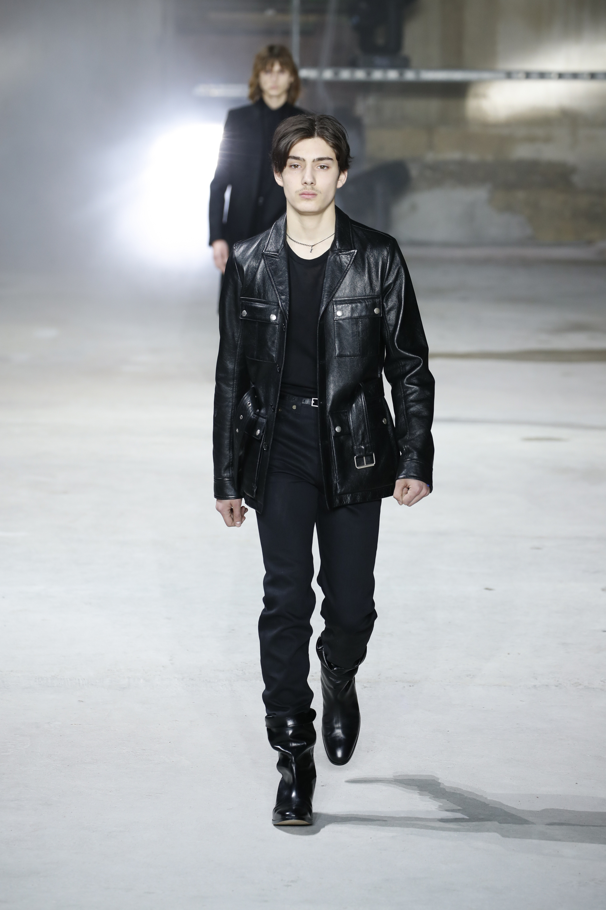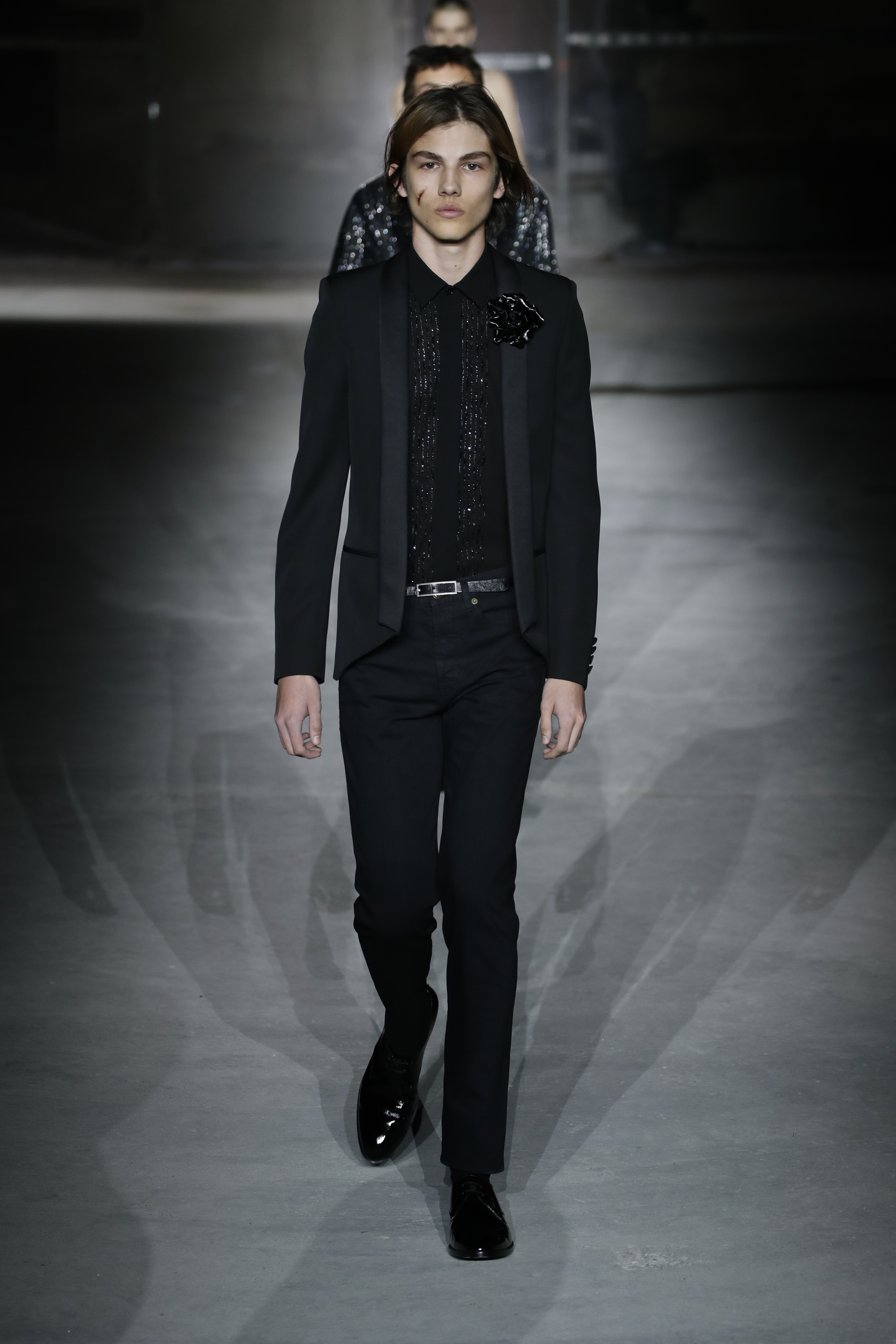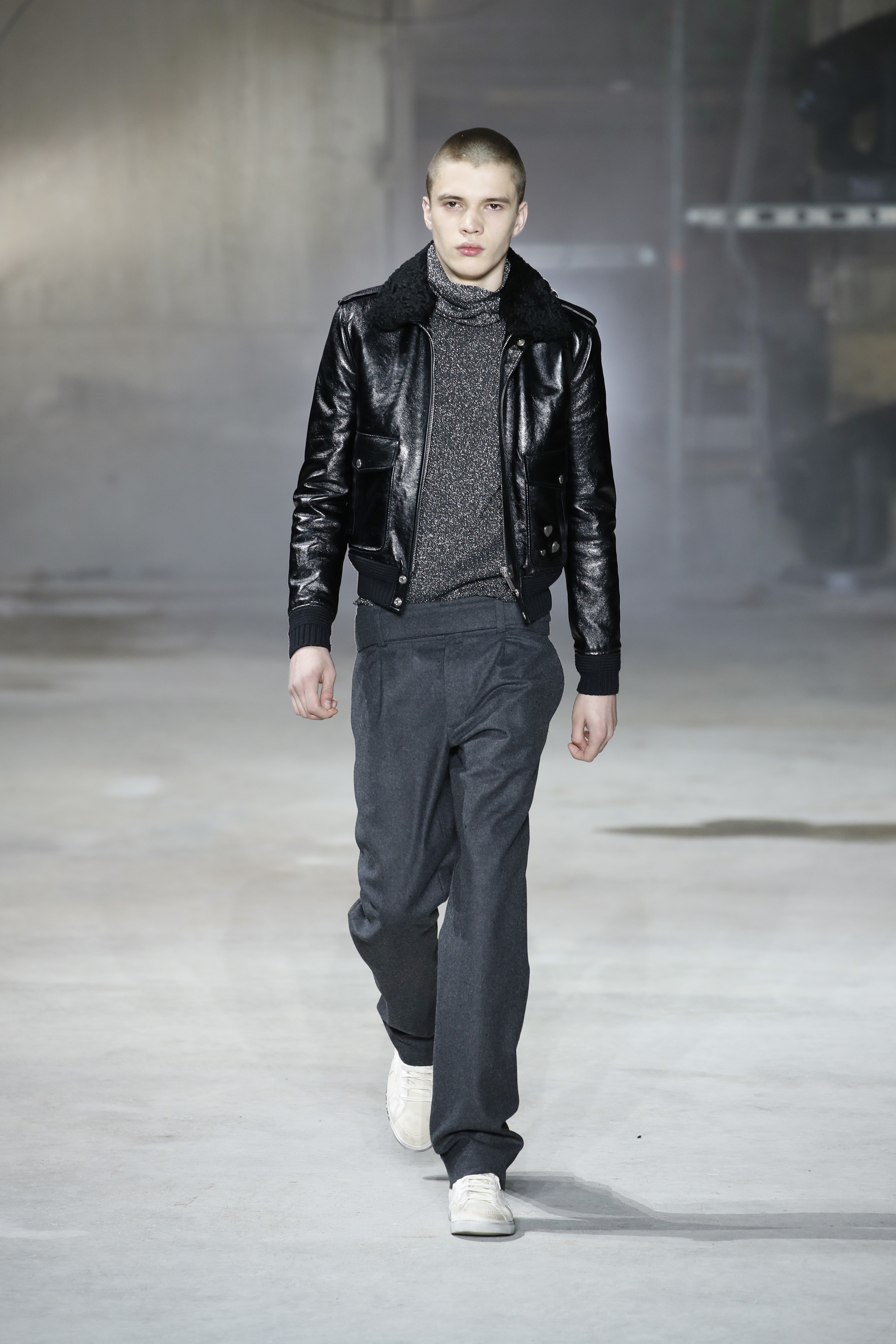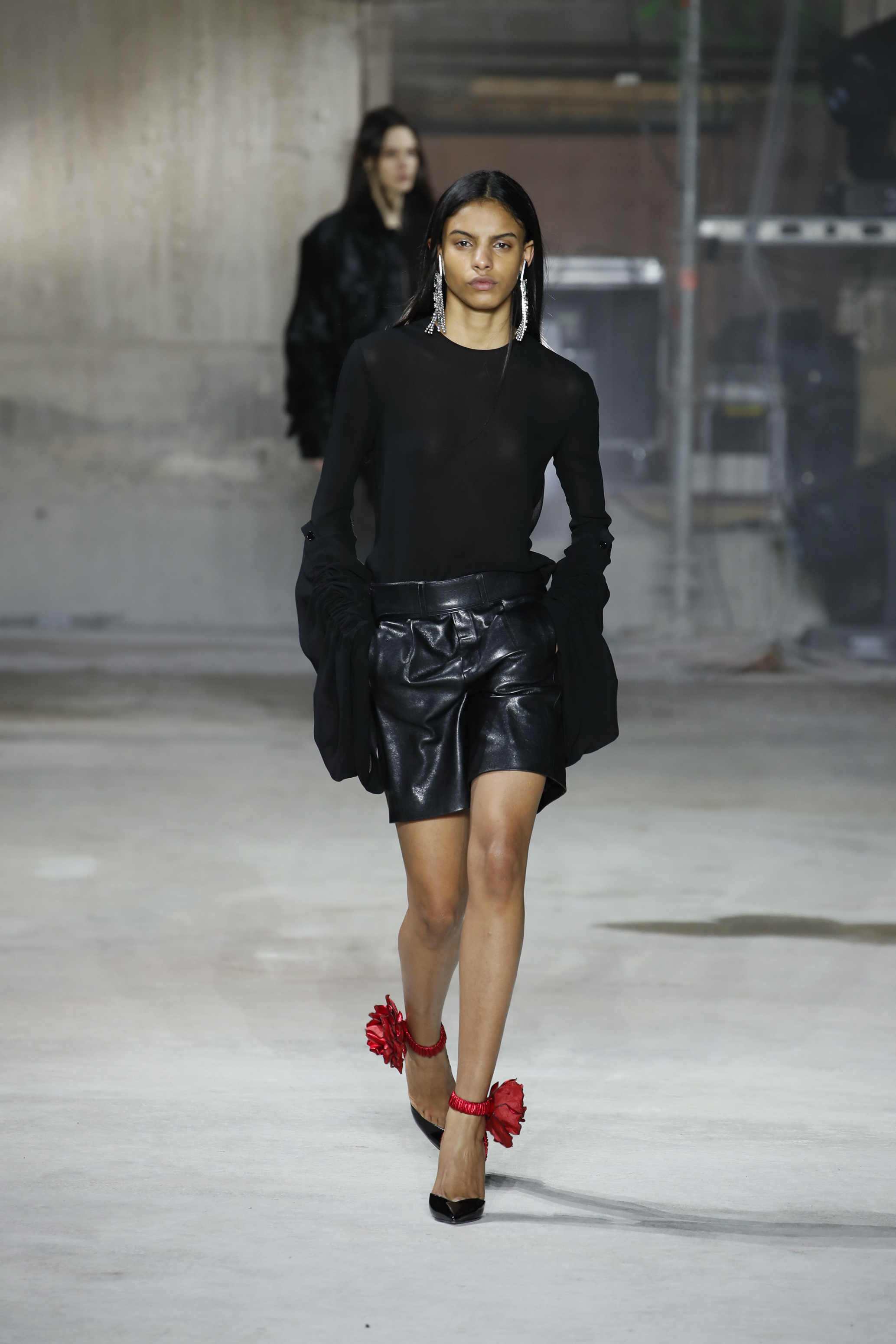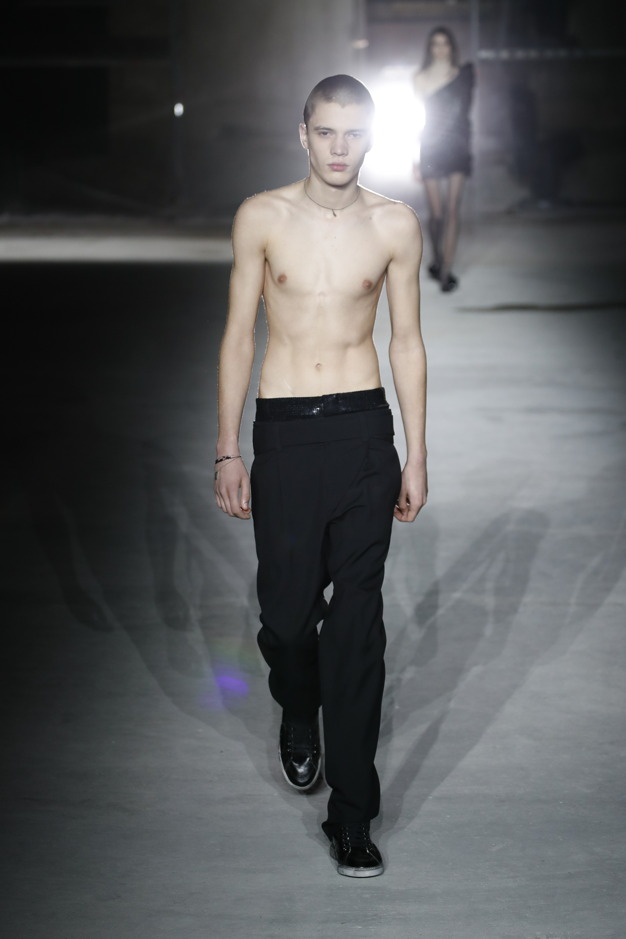 Anthony Vaccarello révèle le couturier à travers cette collection Automne/Hiver dans une atmosphère chic et festive : chemisiers transparents, drapés, tenues de soirée asymétriques, pièces de cuir, bottes froncées… La collection dévoile des silhouettes féminines, masculines et androgynes dans un décor brut.