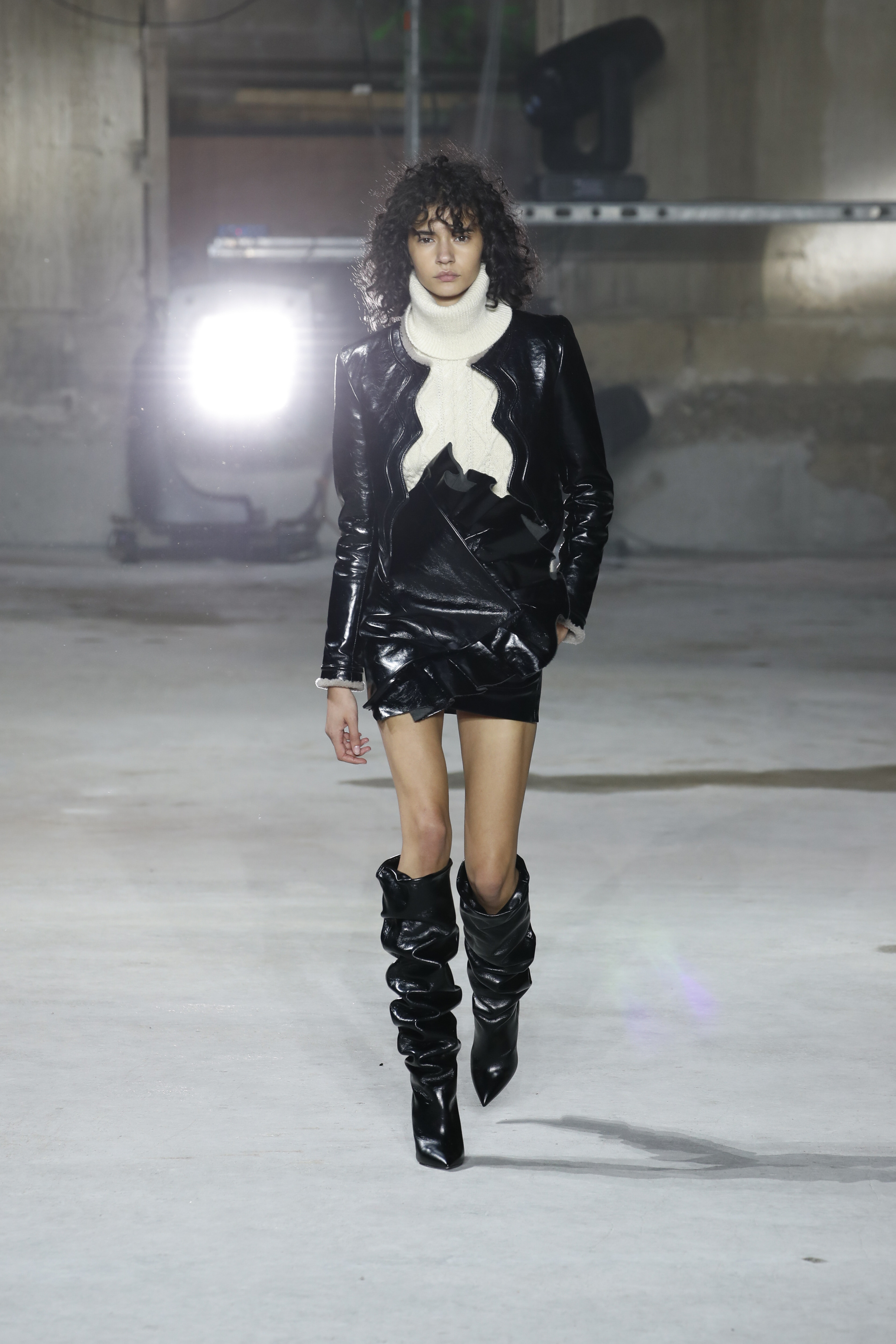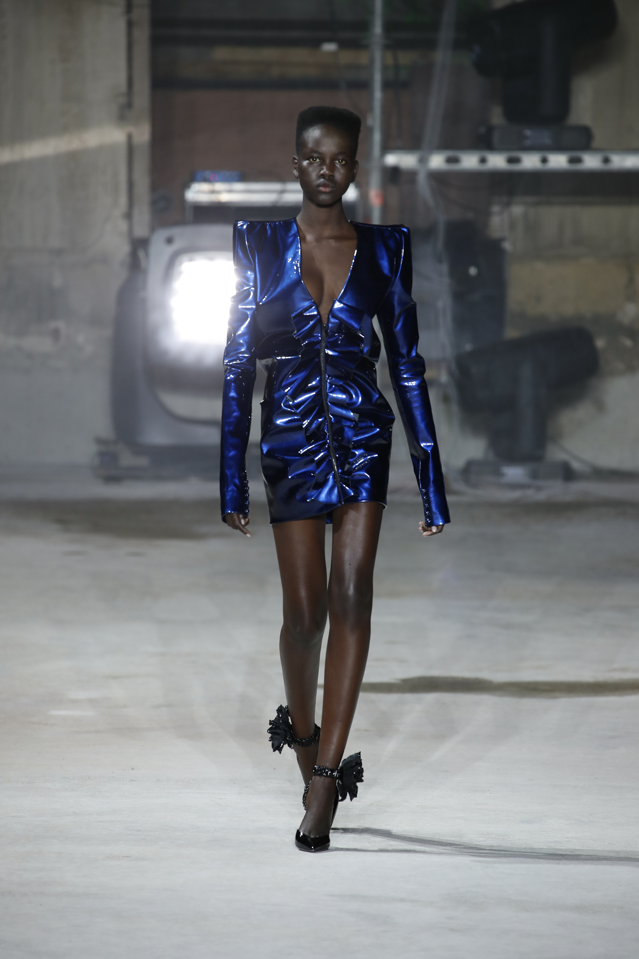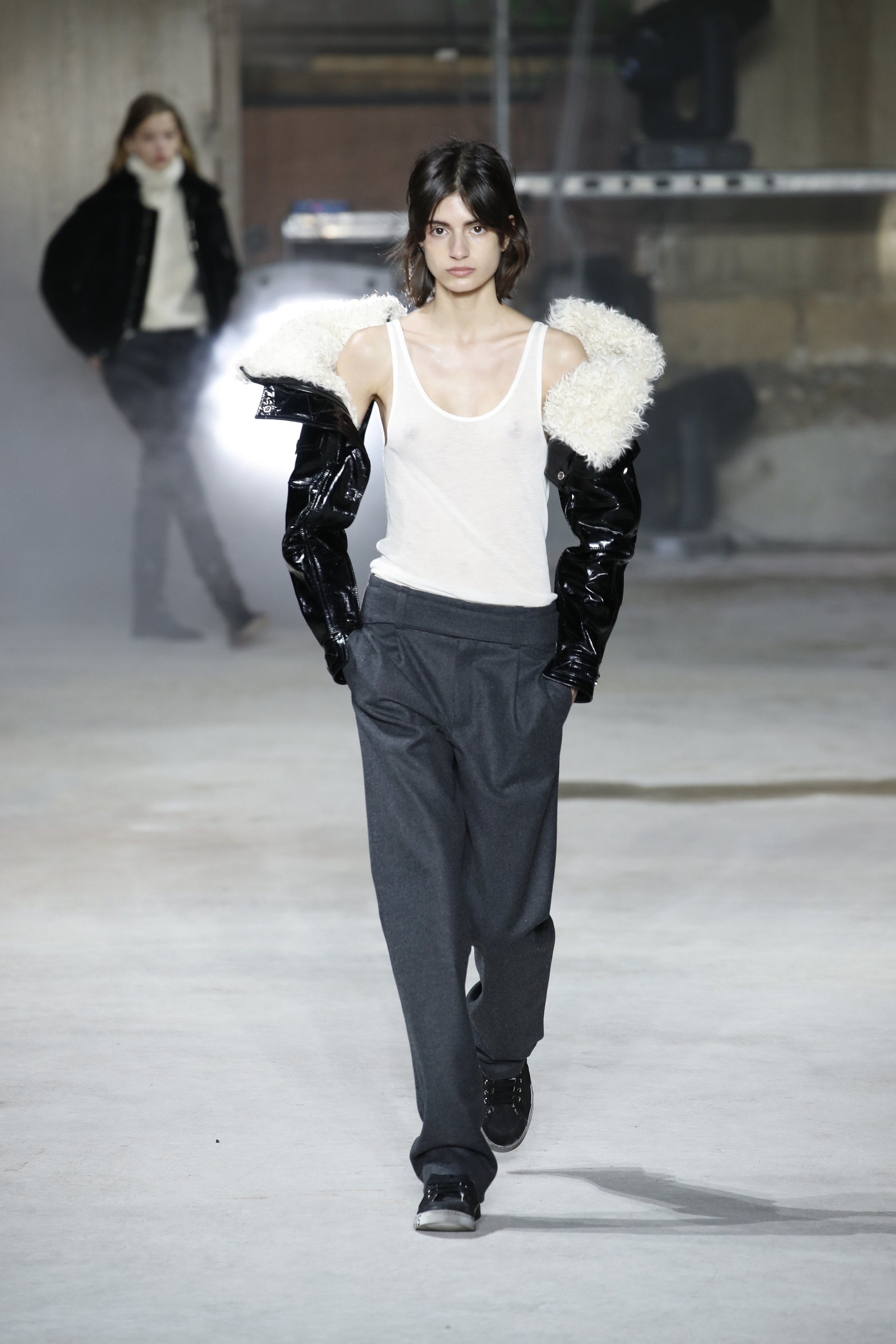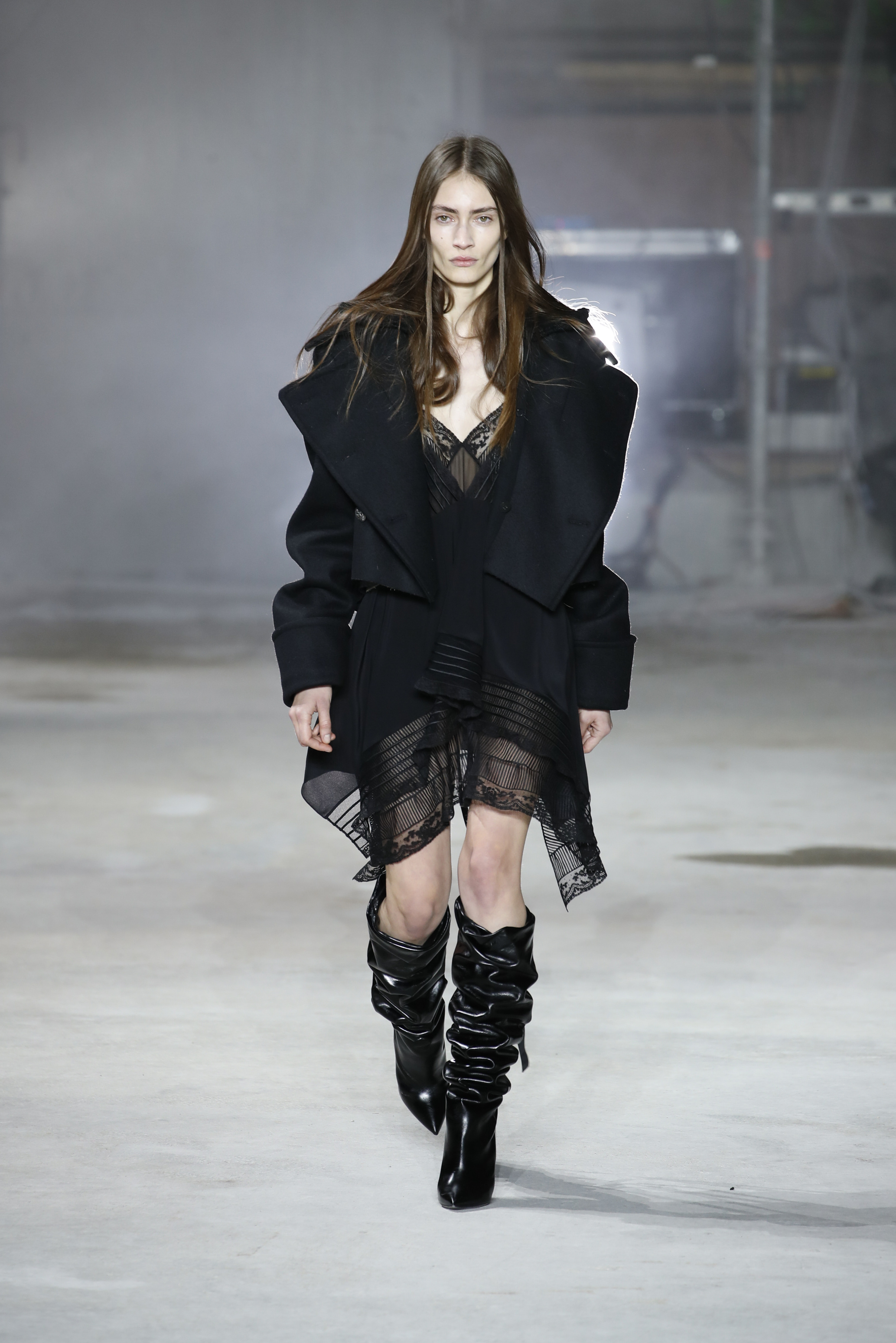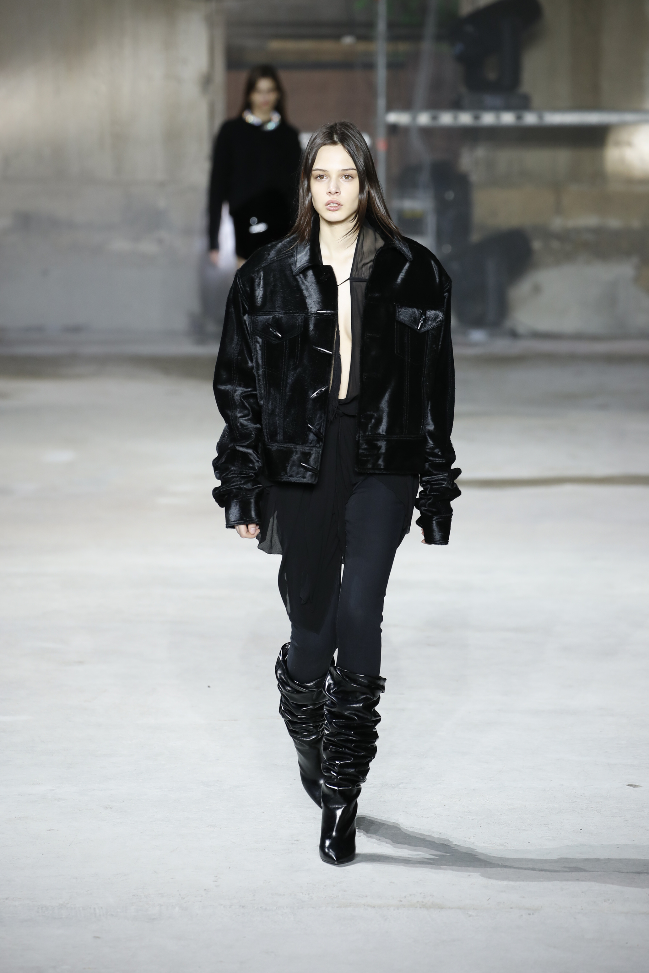 Anthony Vaccarello révèle le couturier à travers cette collection Automne/Hiver dans une atmosphère chic et festive : chemisiers transparents, drapés, tenues de soirée asymétriques, pièces de cuir, bottes froncées… La collection dévoile des silhouettes féminines, masculines et androgynes dans un décor brut.