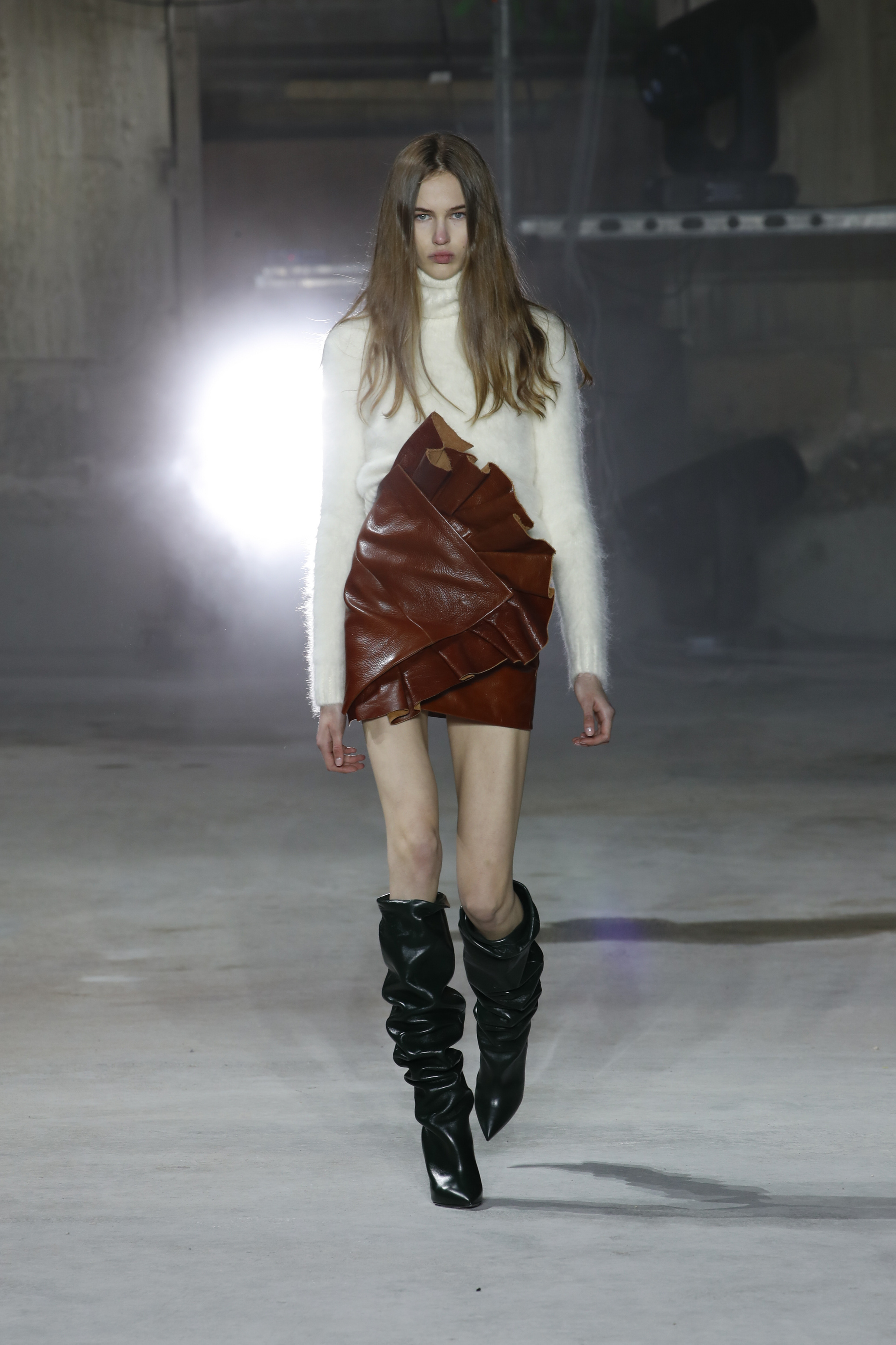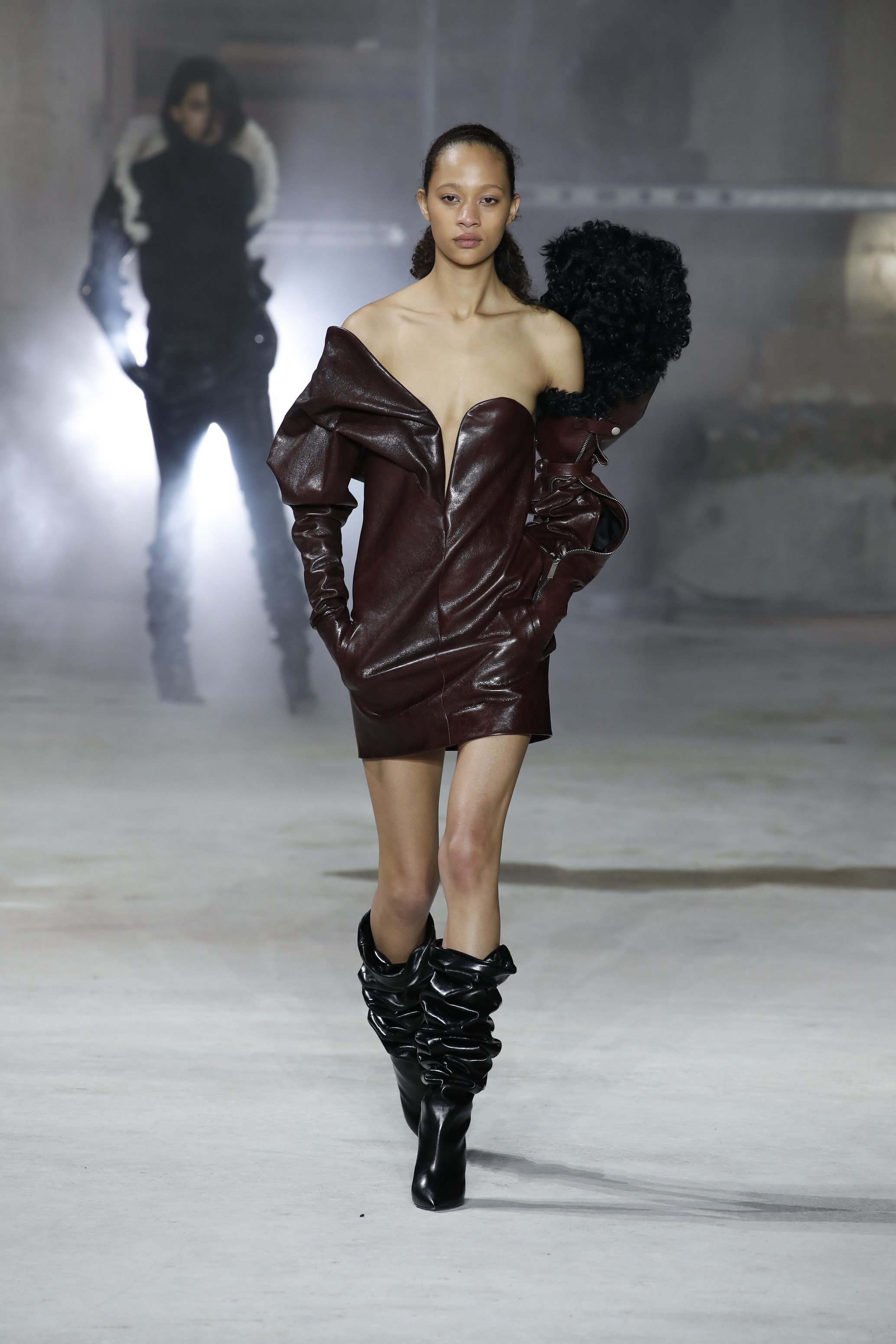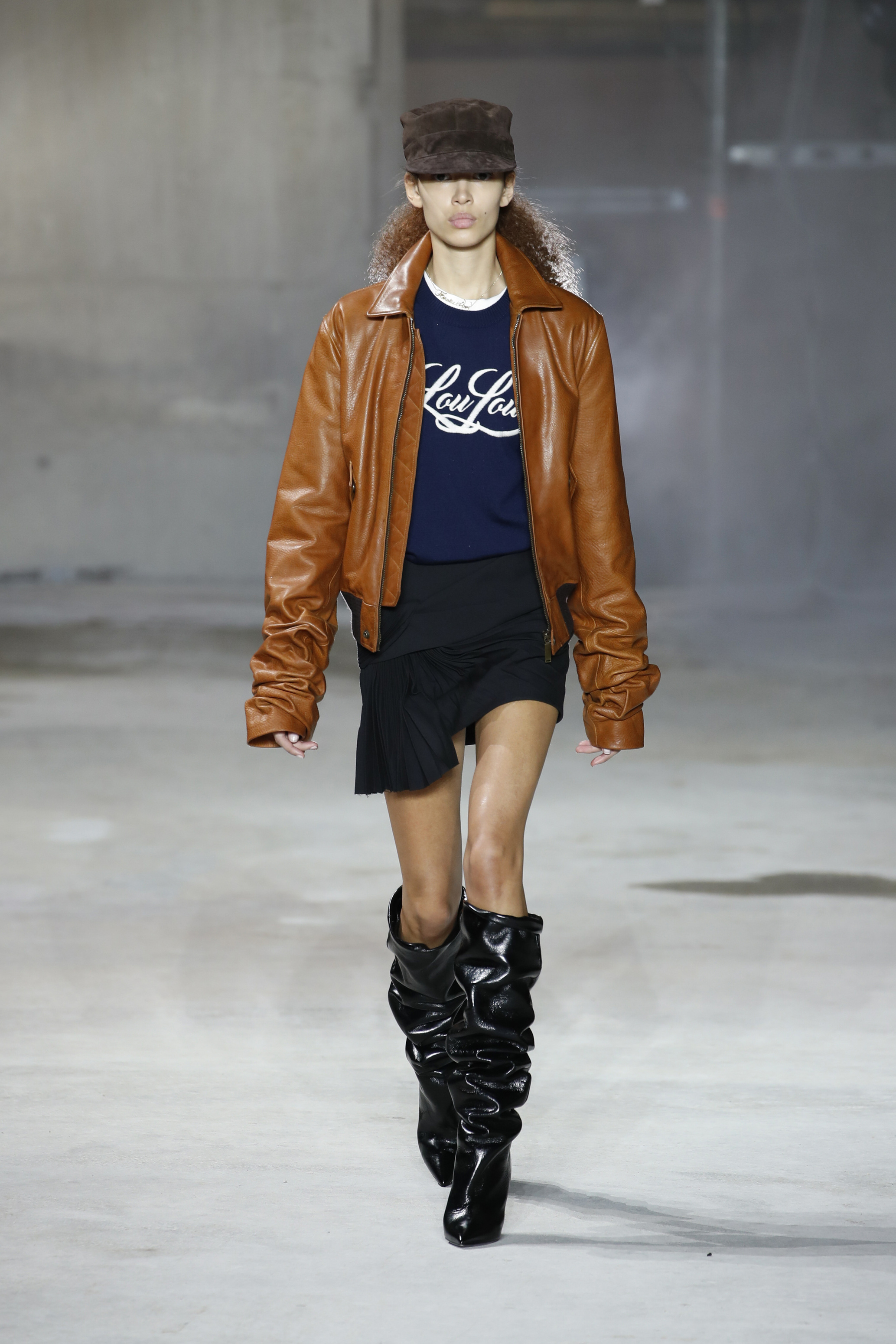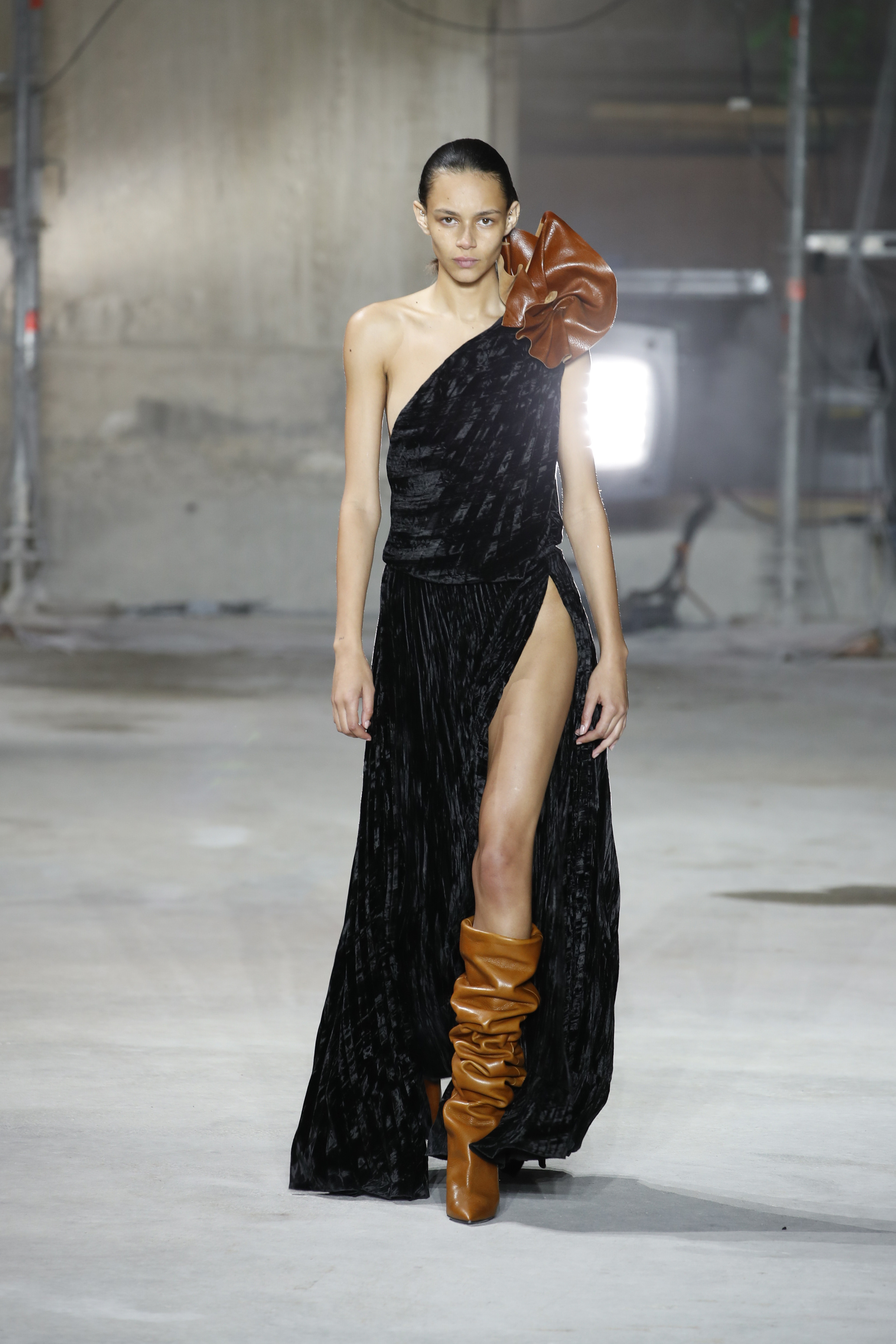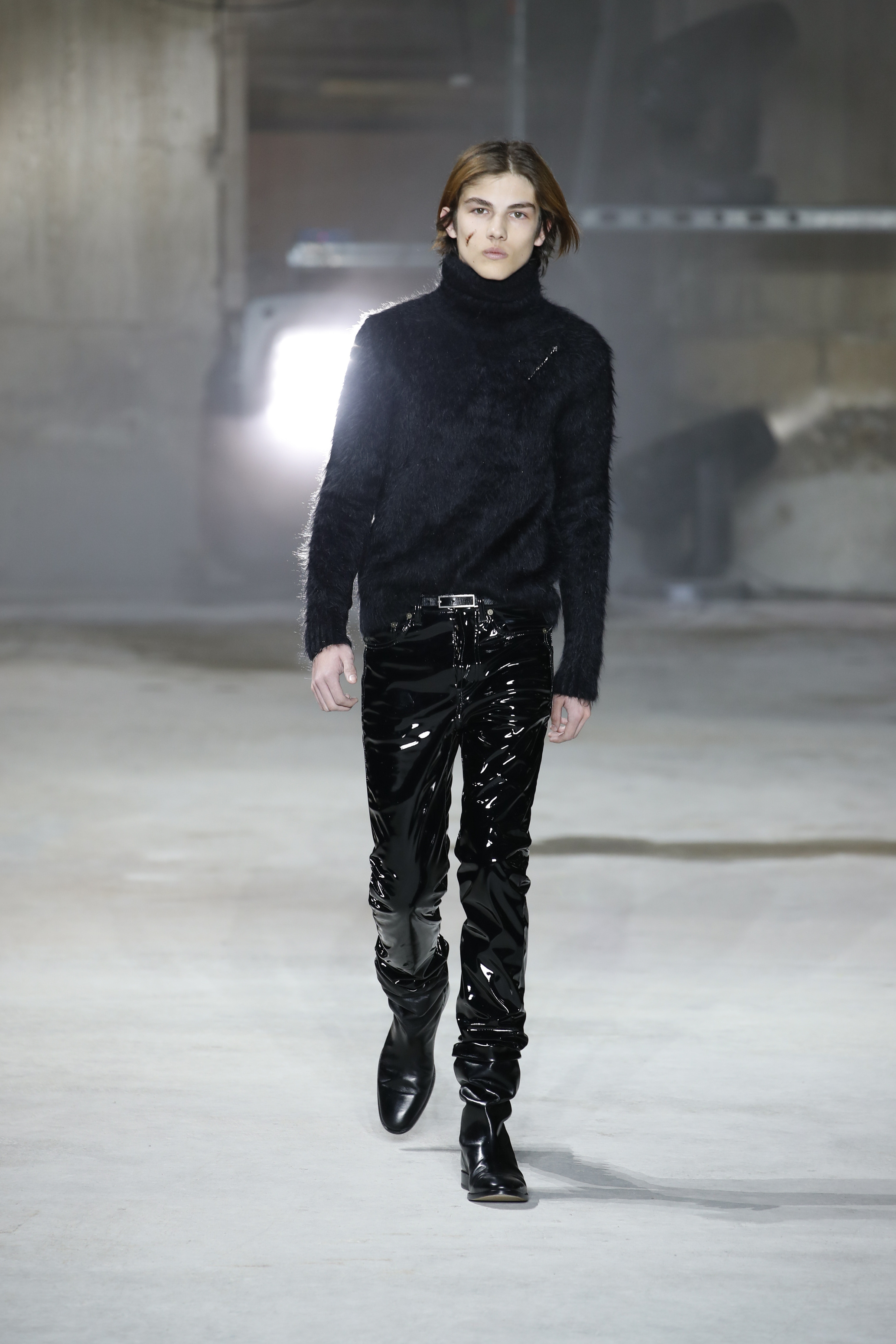 Anthony Vaccarello révèle le couturier à travers cette collection Automne/Hiver dans une atmosphère chic et festive : chemisiers transparents, drapés, tenues de soirée asymétriques, pièces de cuir, bottes froncées… La collection dévoile des silhouettes féminines, masculines et androgynes dans un décor brut.