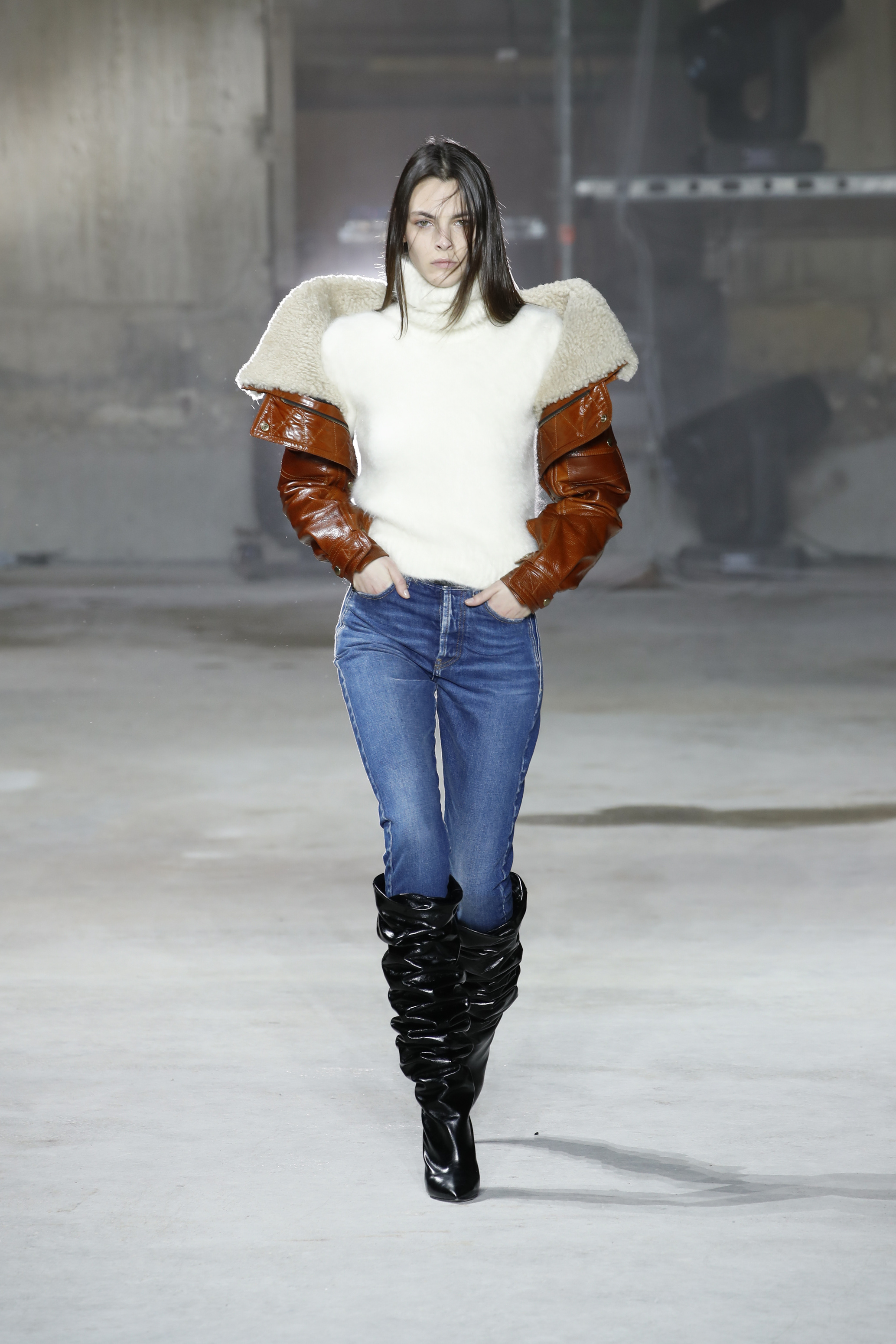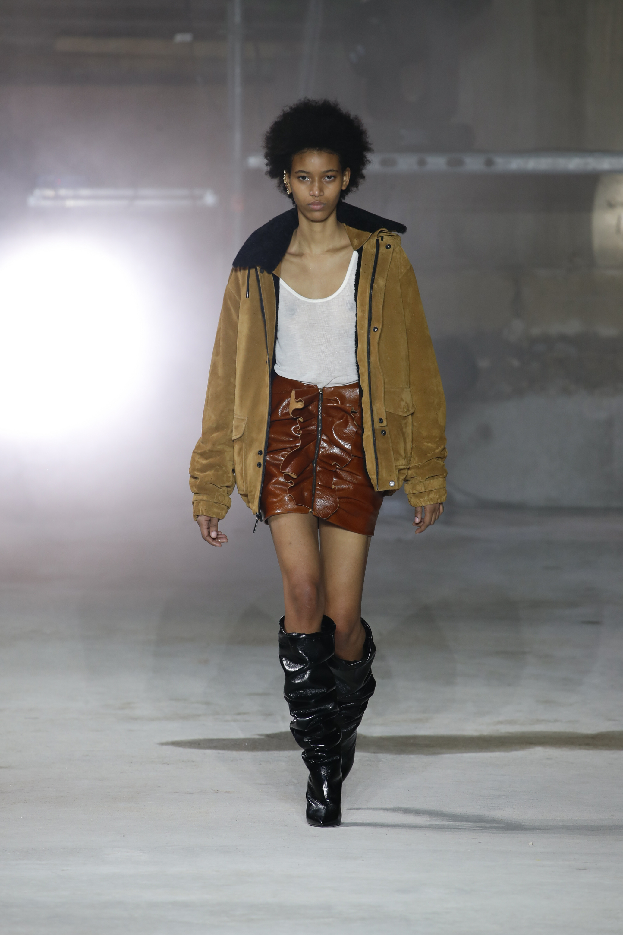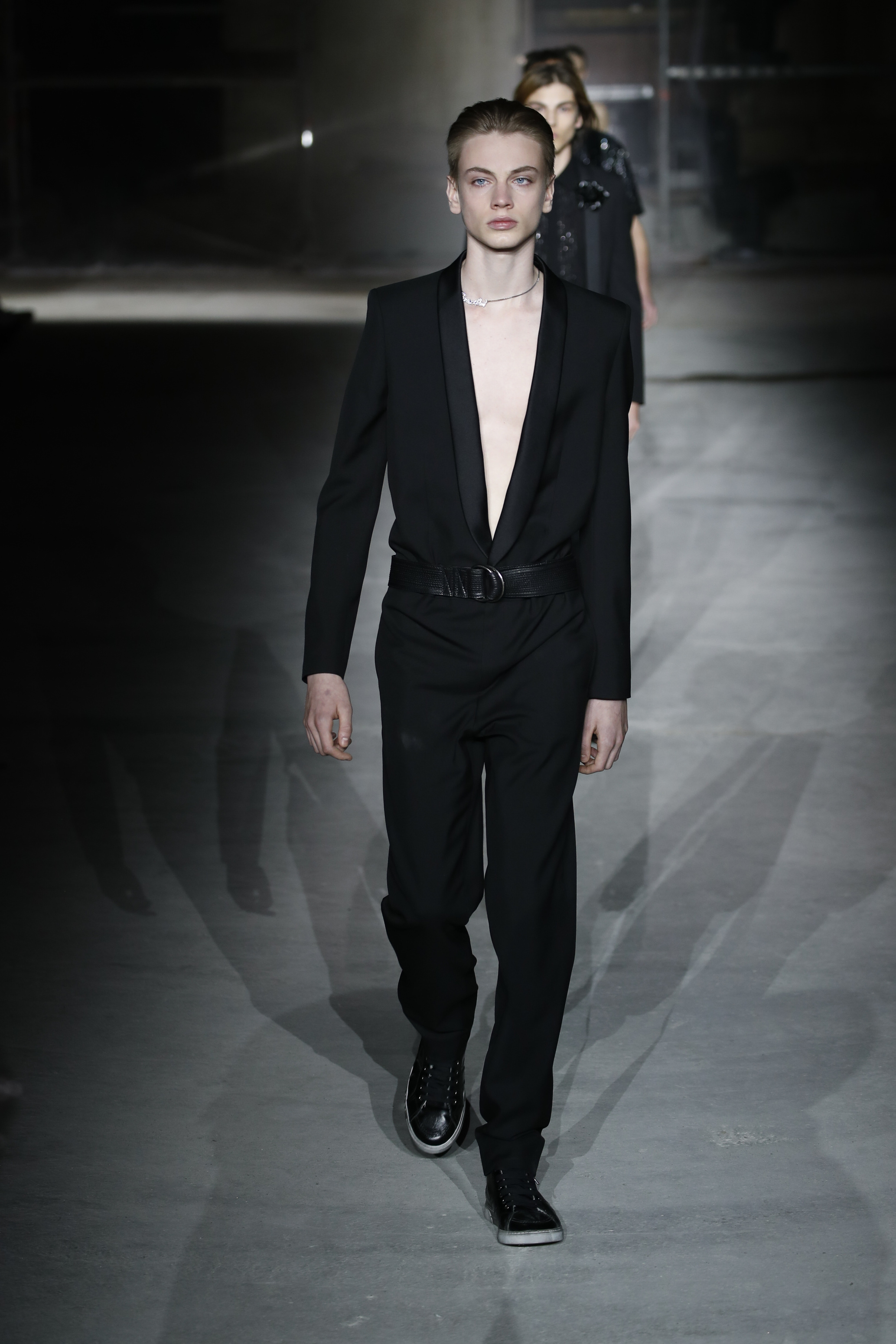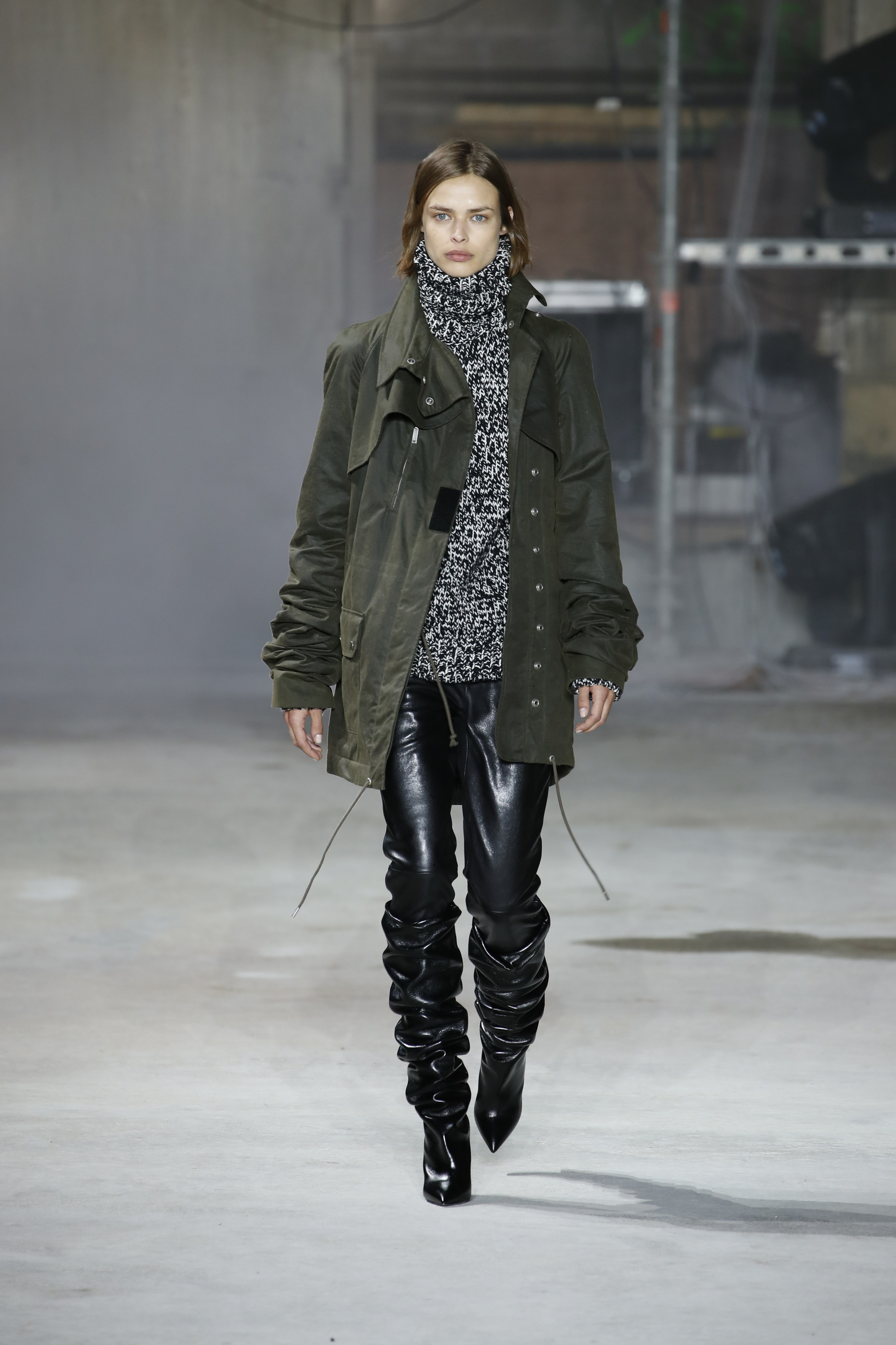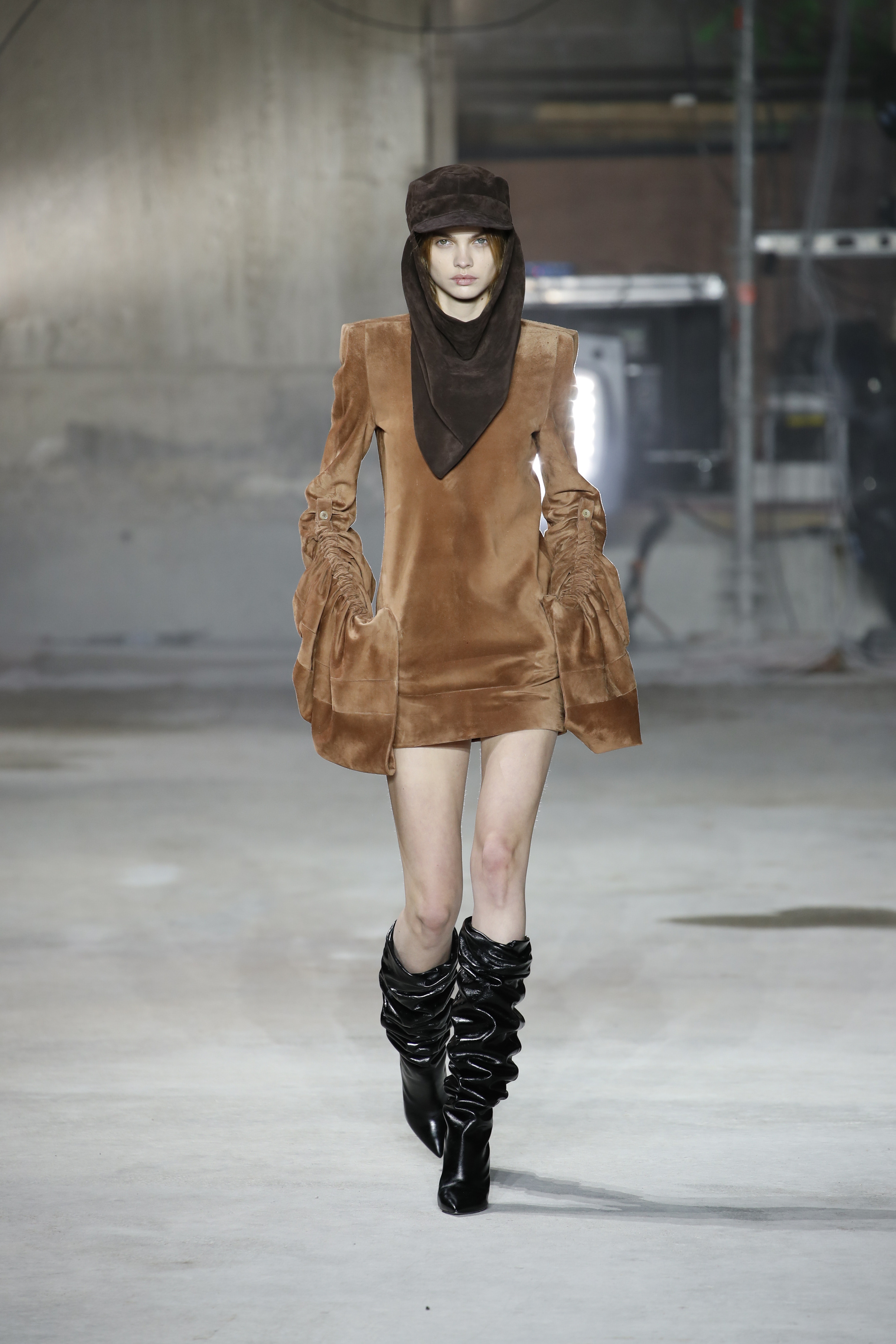 Anthony Vaccarello révèle le couturier à travers cette collection Automne/Hiver dans une atmosphère chic et festive : chemisiers transparents, drapés, tenues de soirée asymétriques, pièces de cuir, bottes froncées… La collection dévoile des silhouettes féminines, masculines et androgynes dans un décor brut.