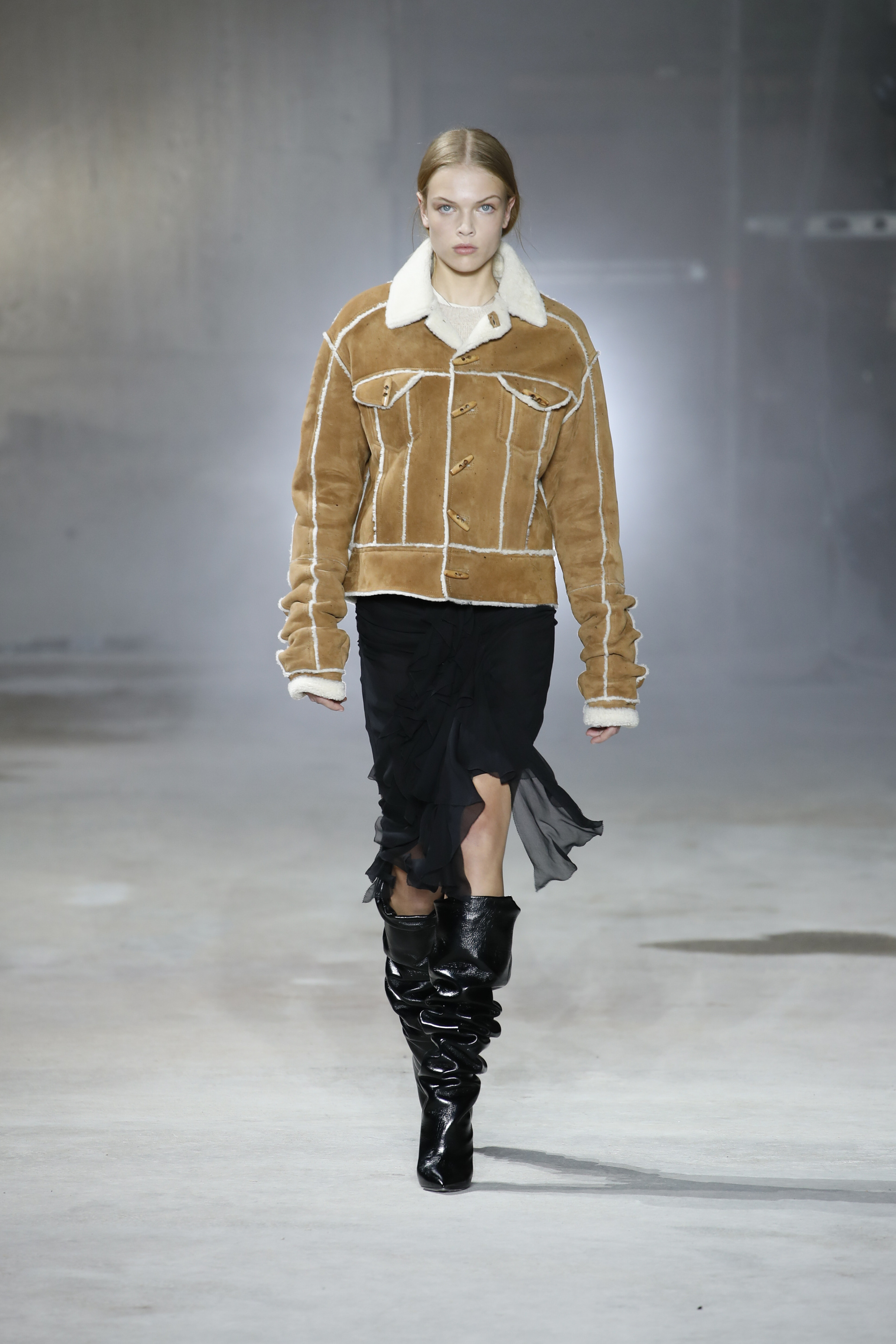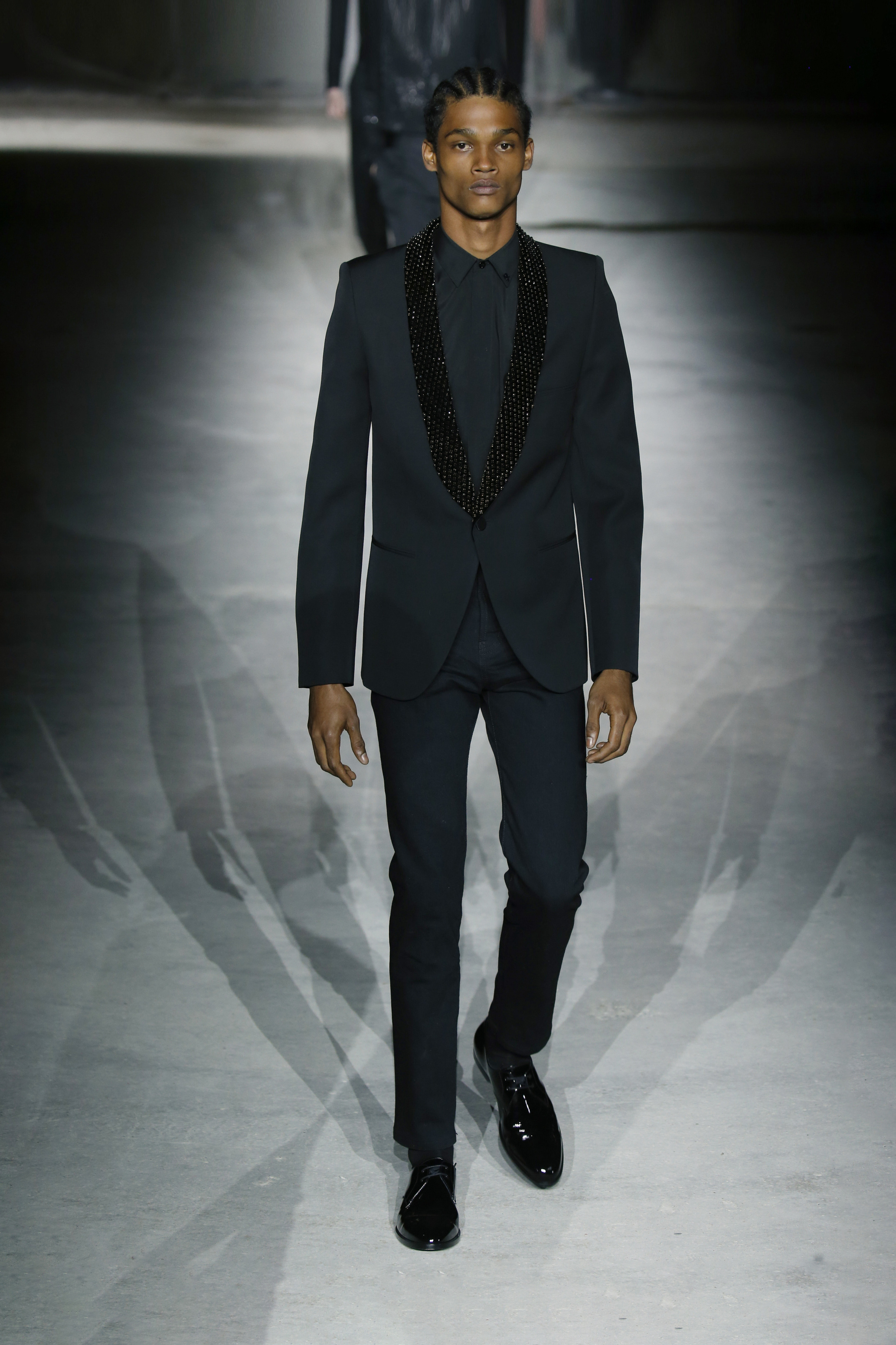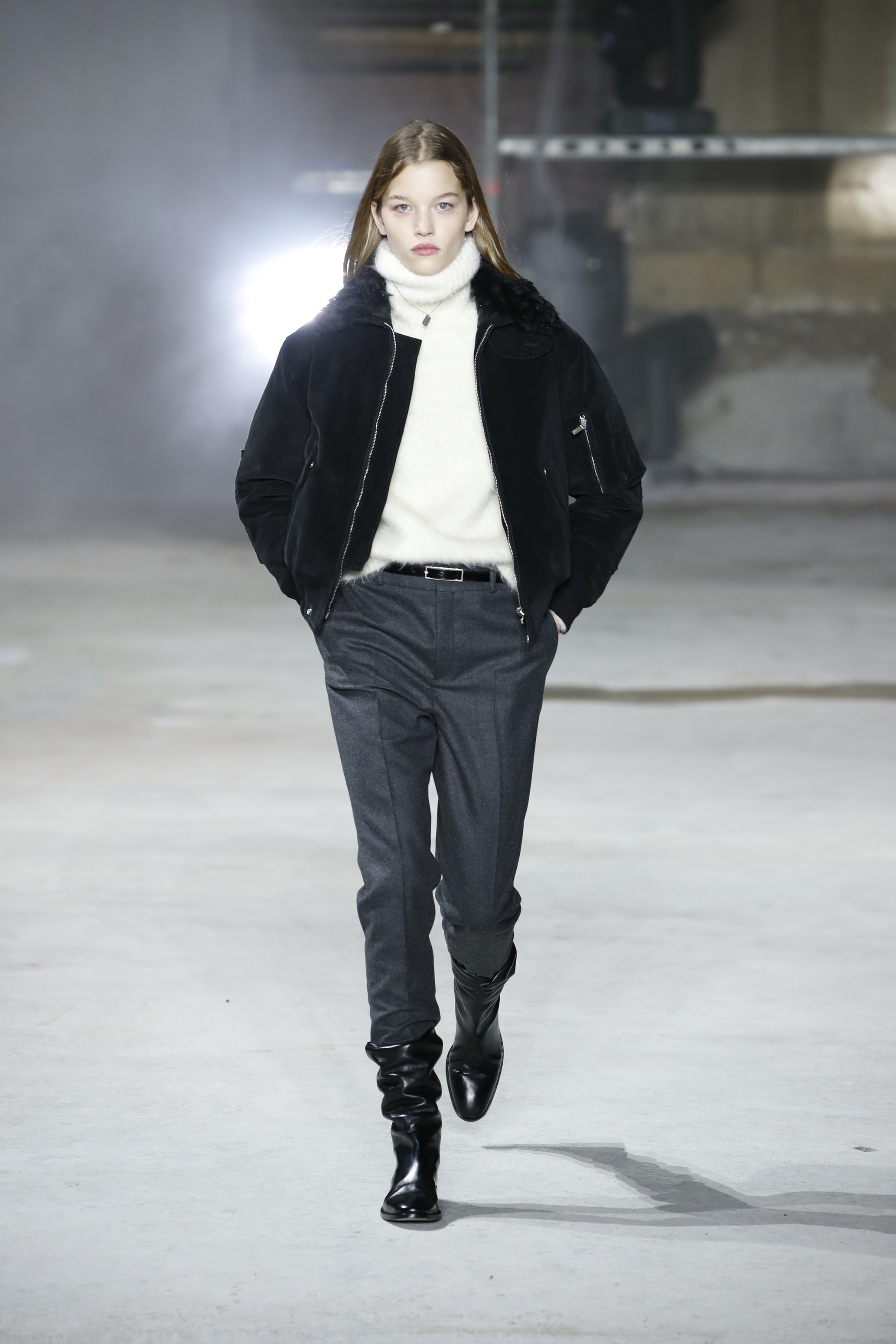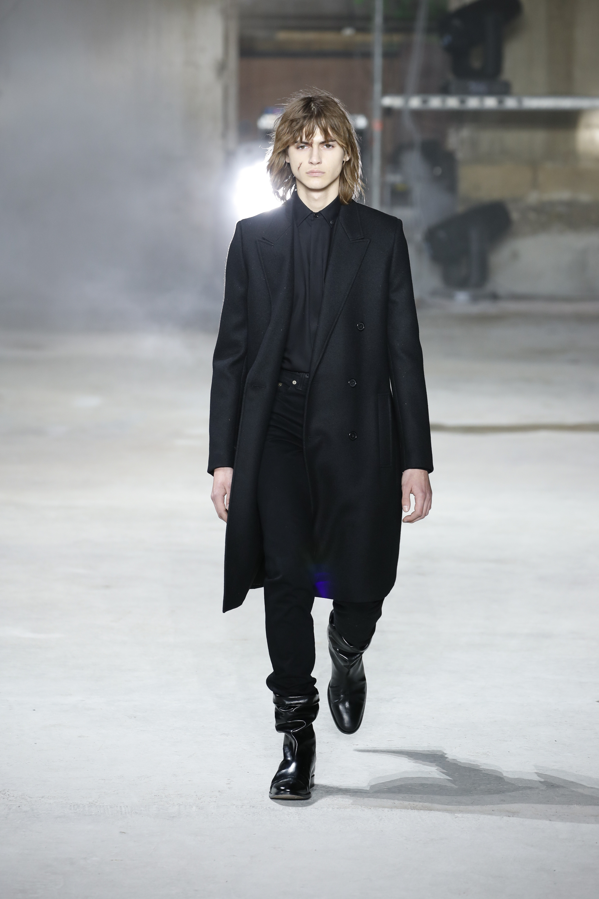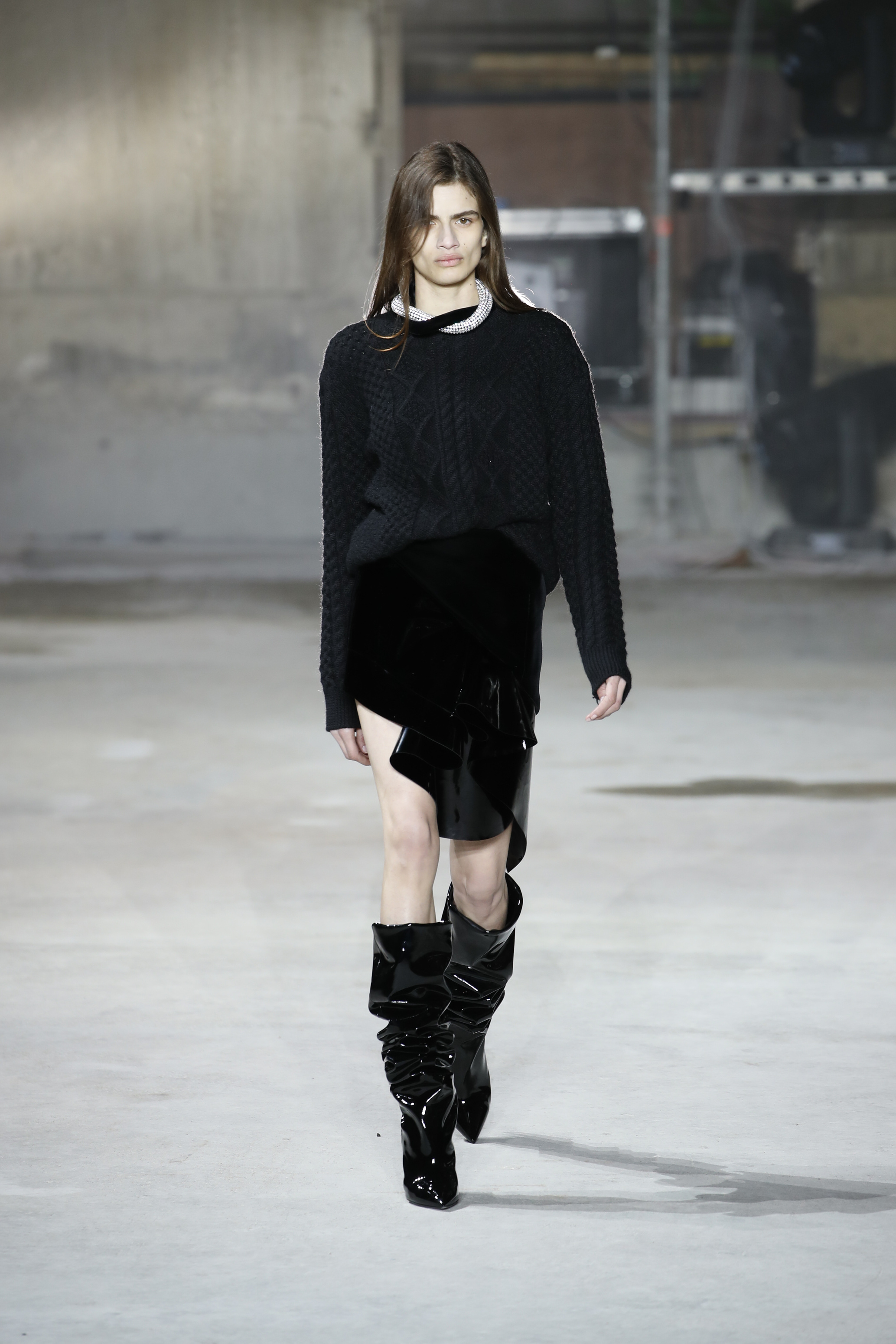 Anthony Vaccarello révèle le couturier à travers cette collection Automne/Hiver dans une atmosphère chic et festive : chemisiers transparents, drapés, tenues de soirée asymétriques, pièces de cuir, bottes froncées… La collection dévoile des silhouettes féminines, masculines et androgynes dans un décor brut.