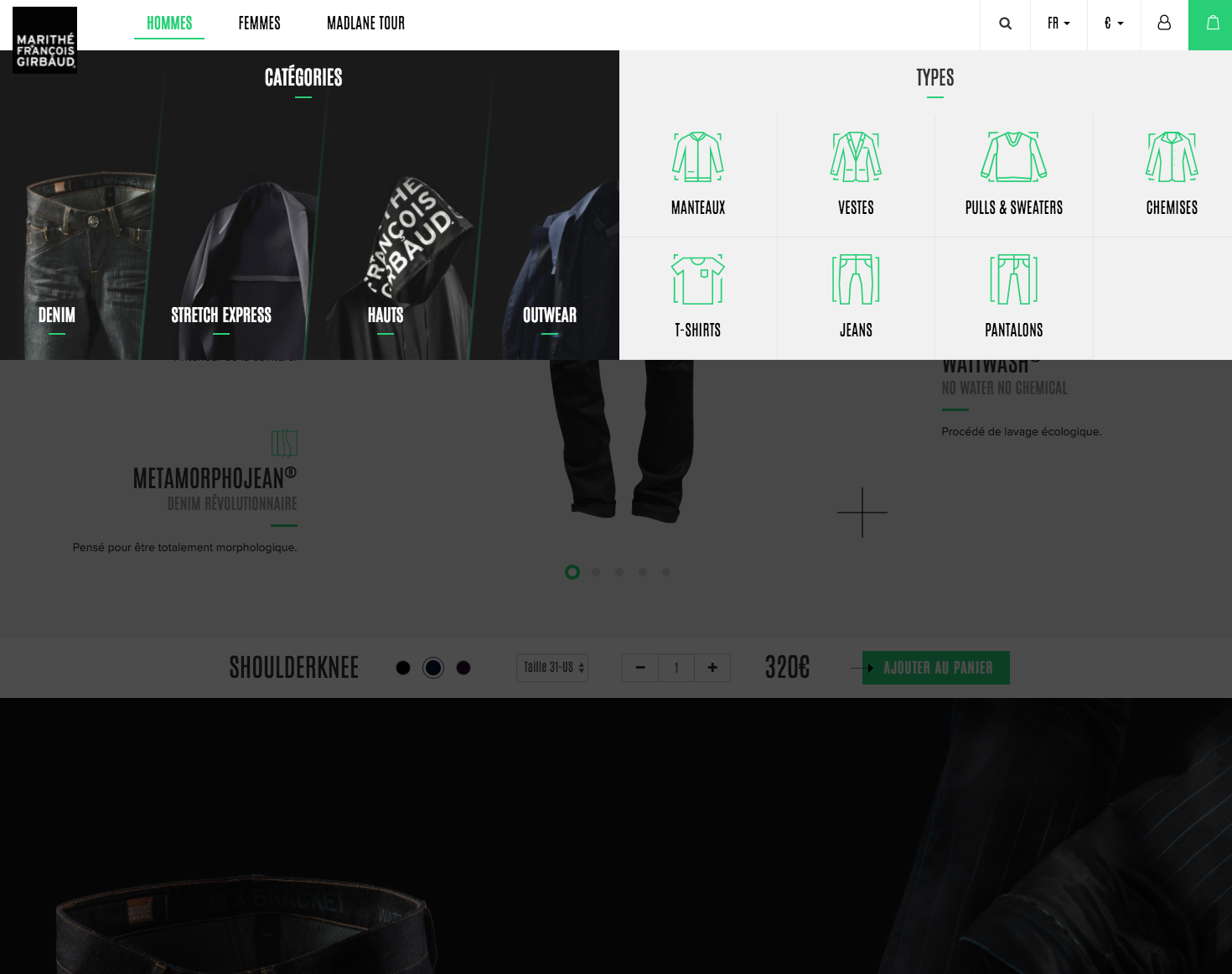 Une navigation originale qui surprend le visiteur en lui proposant un choix des produits par la matière ou par le type de vêtement