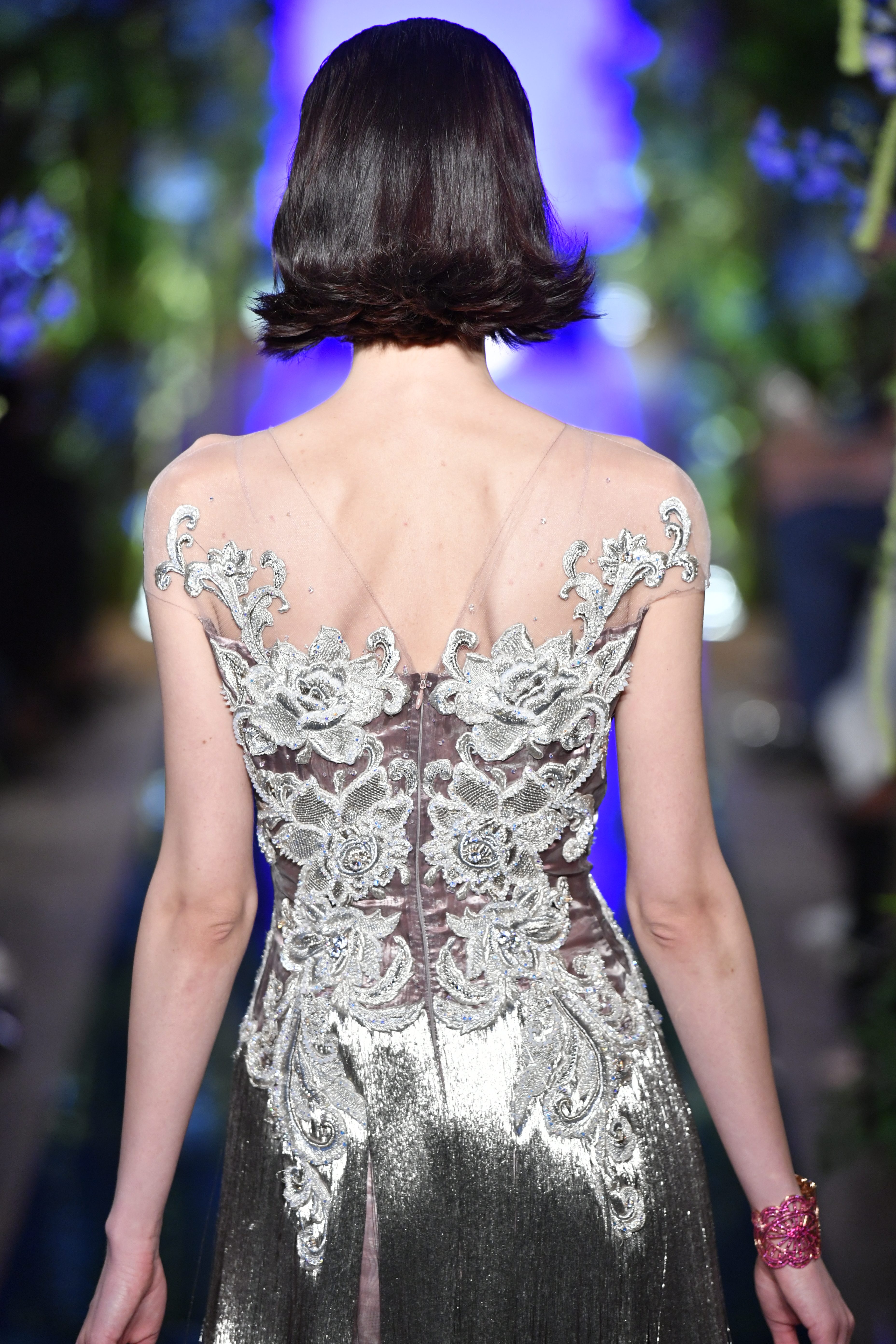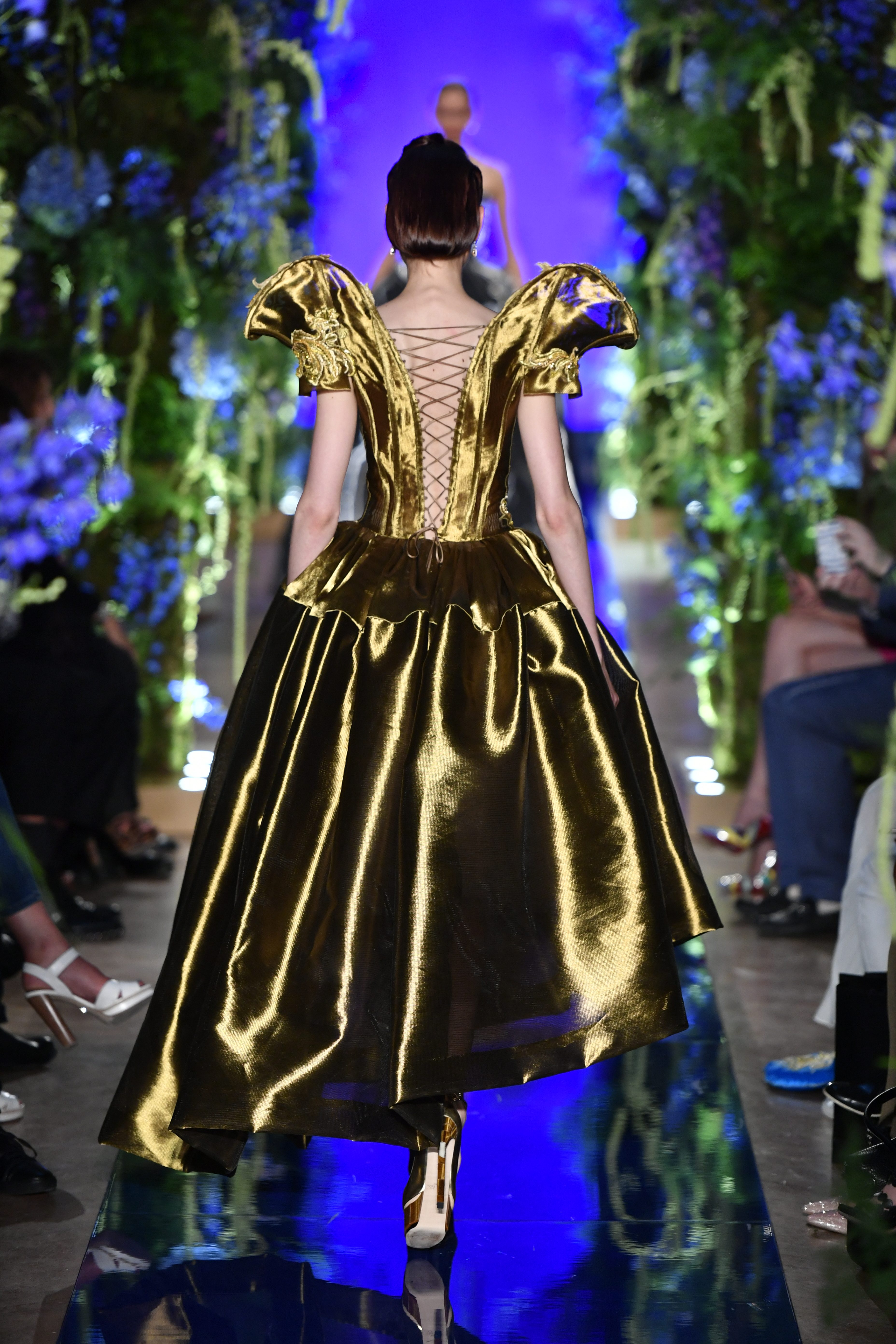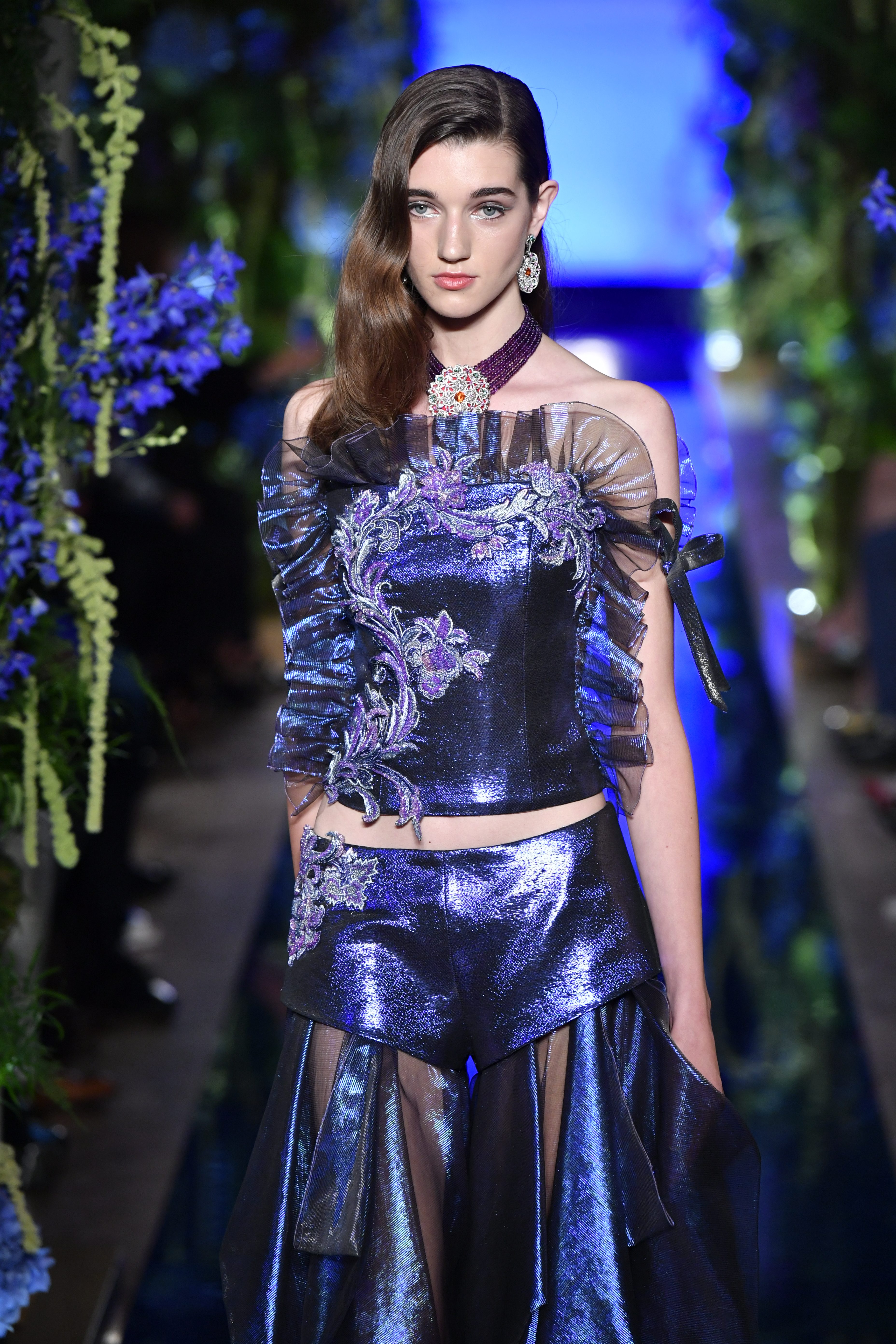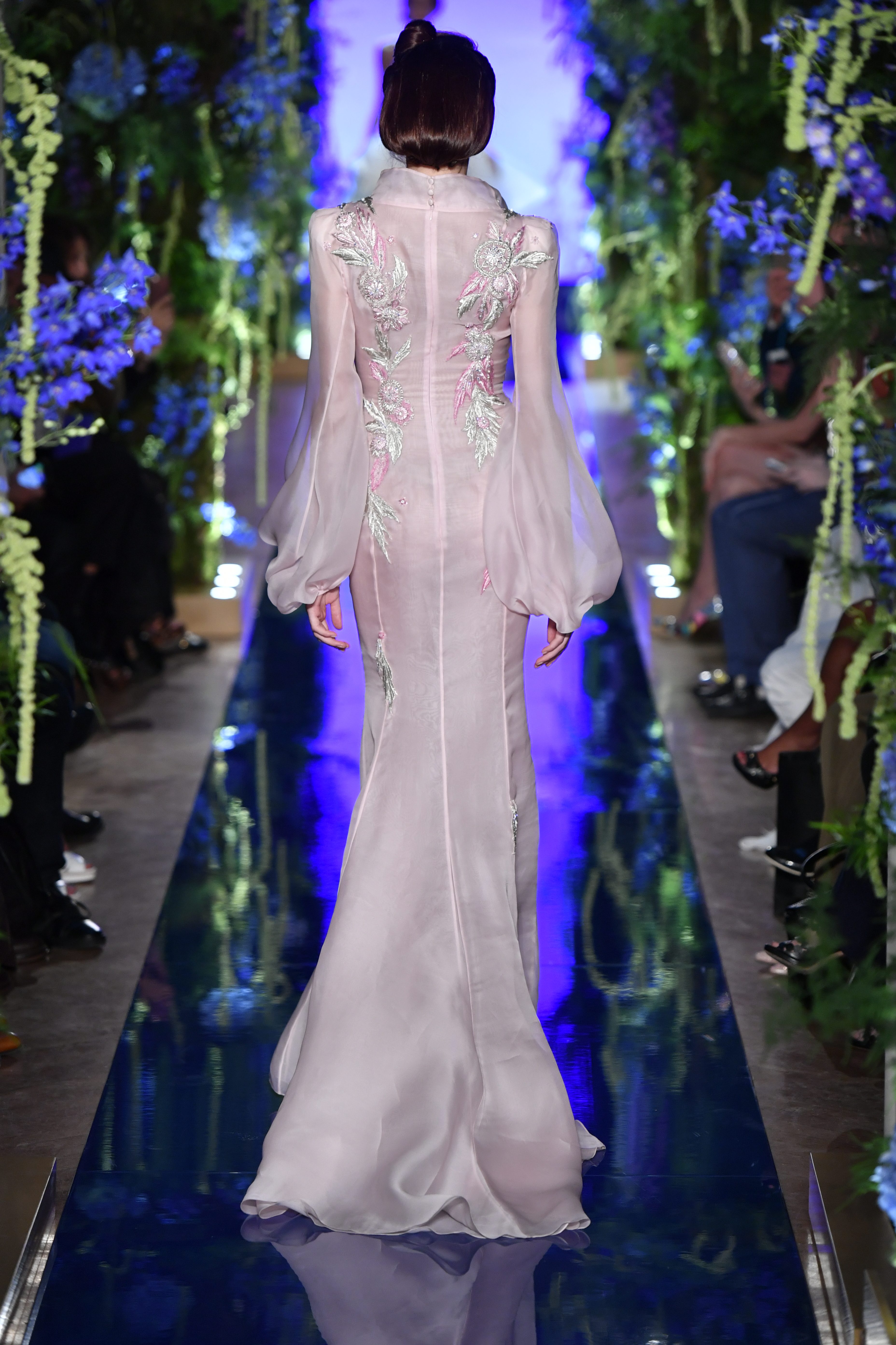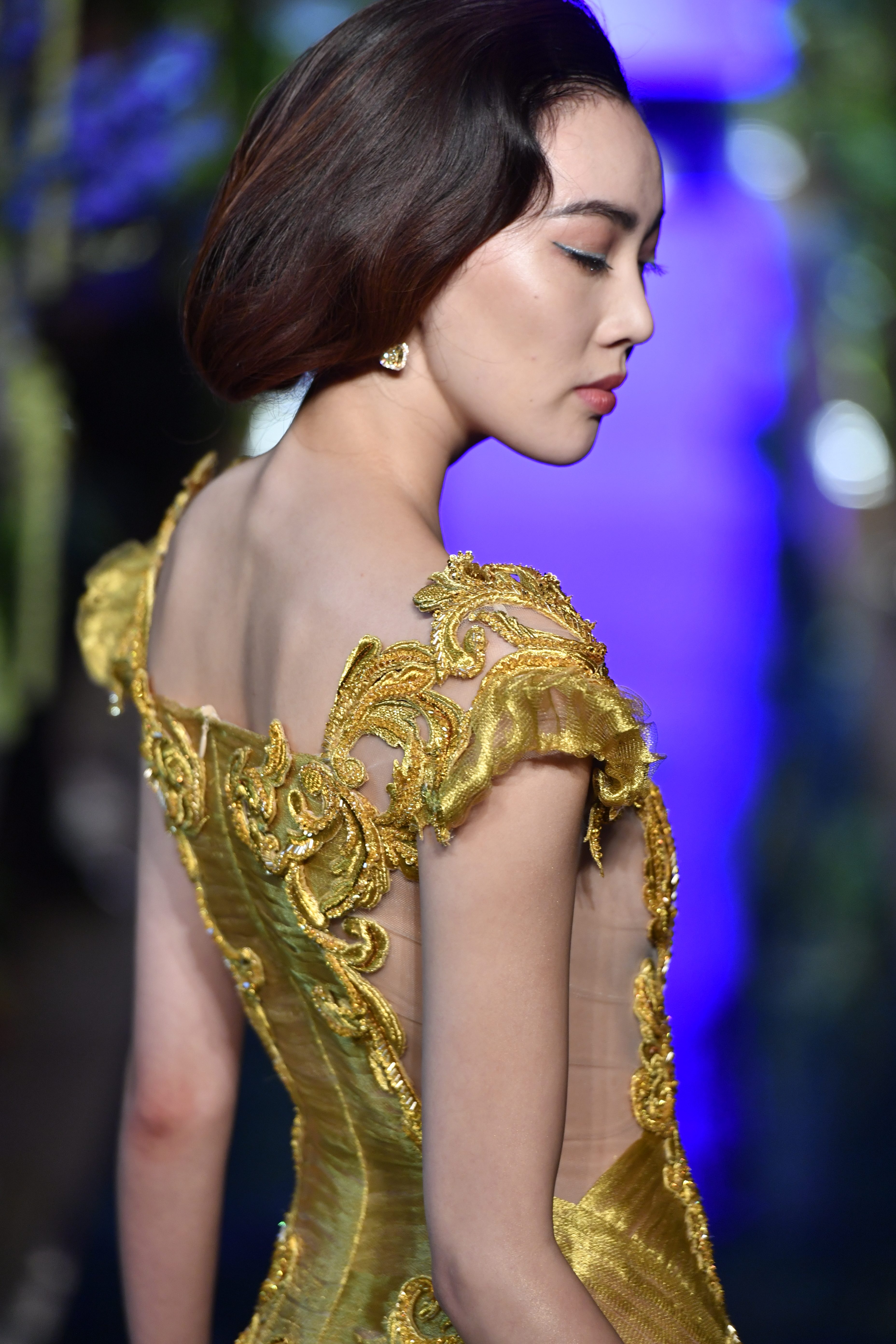 Guo Pei a sélectionné les matières les plus tendance et privilégié des lignes classiques aux tissus délicats pour sublimer la silhouette féminine. Brillance métallique texturée et couleurs moirées enrichissent l’esthétique de la collection. Cette saison, constructions complexes et superpositions donnent une impression d’illusion tout en mettant en valeur la fraîcheur des silhouettes.