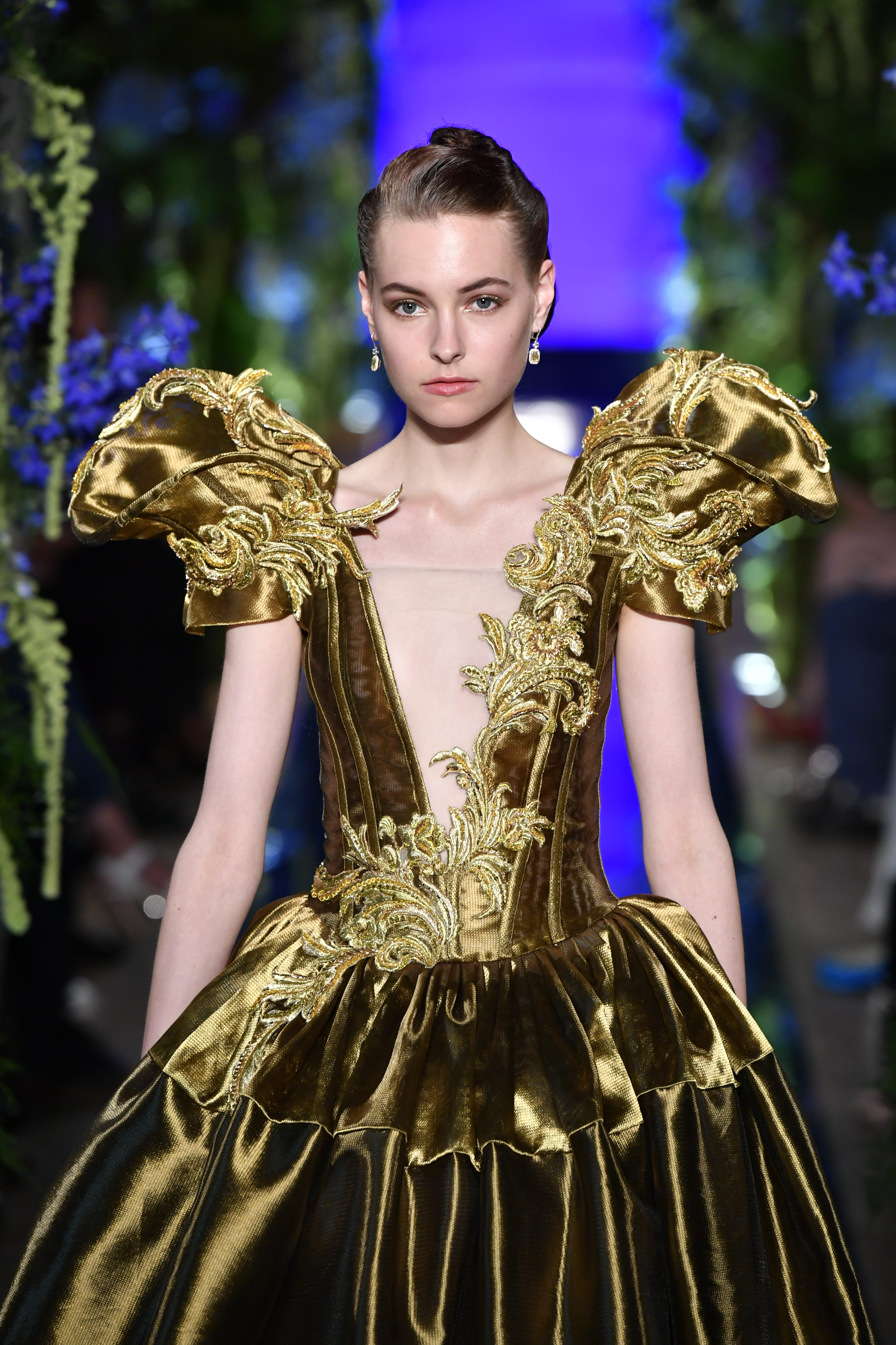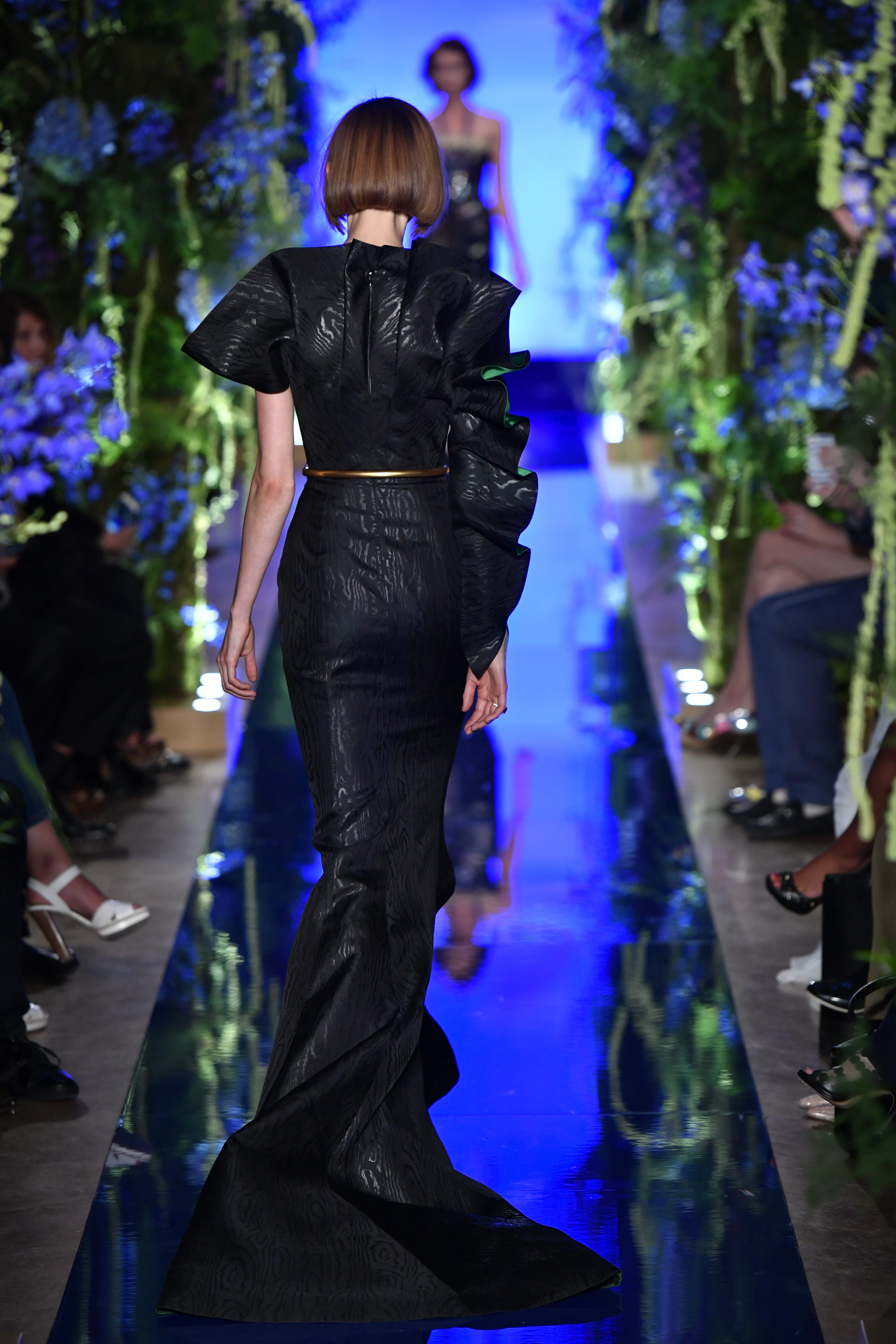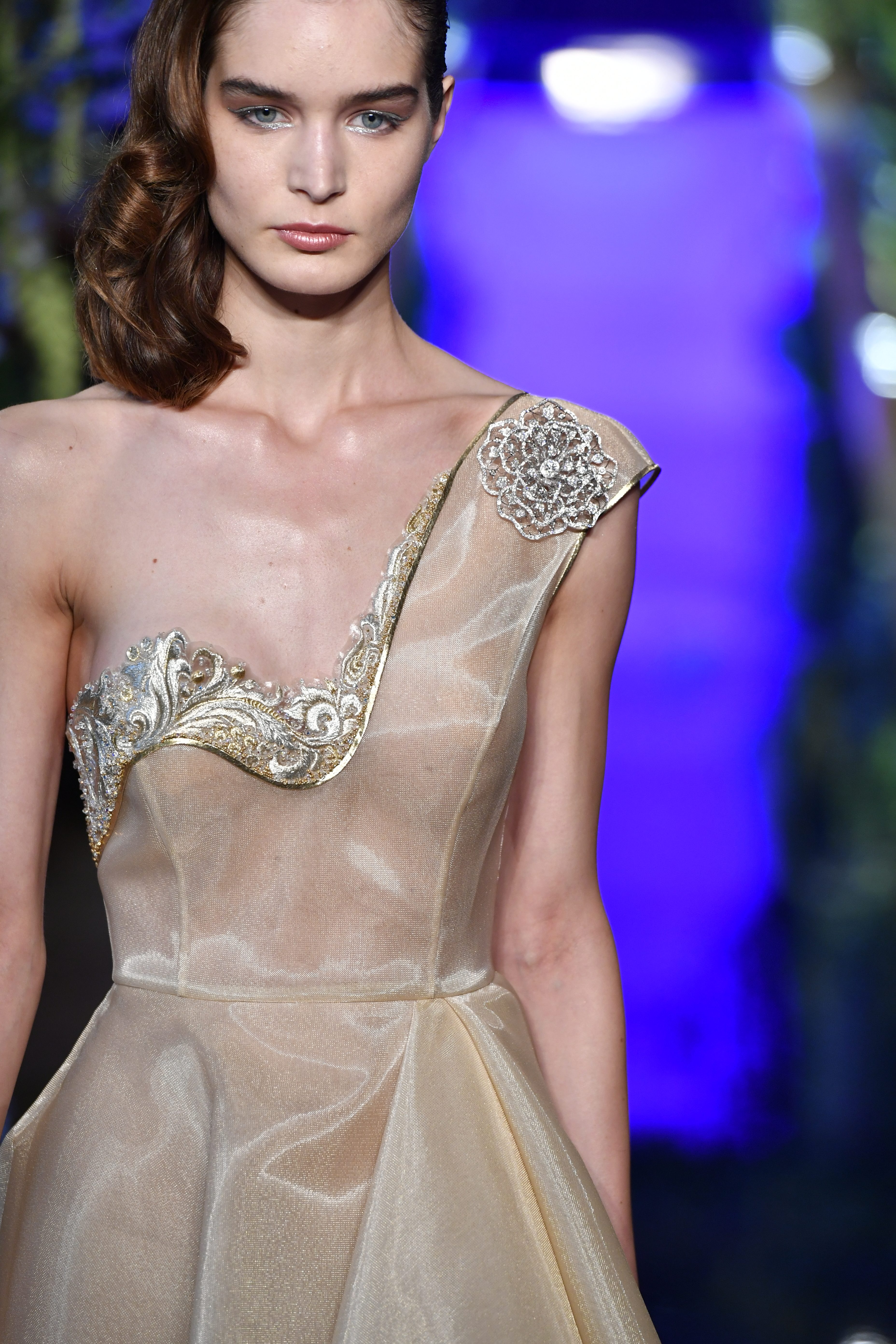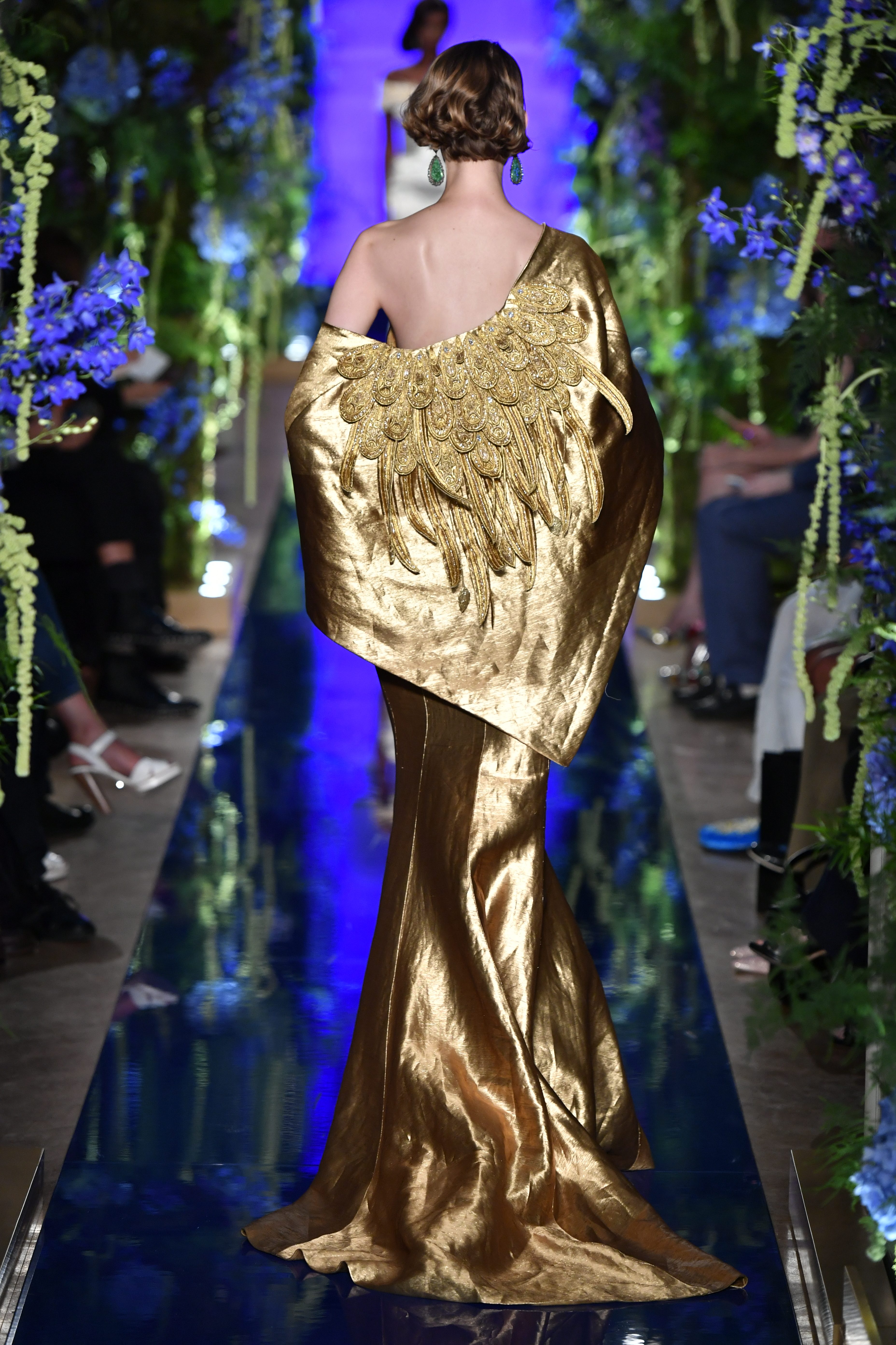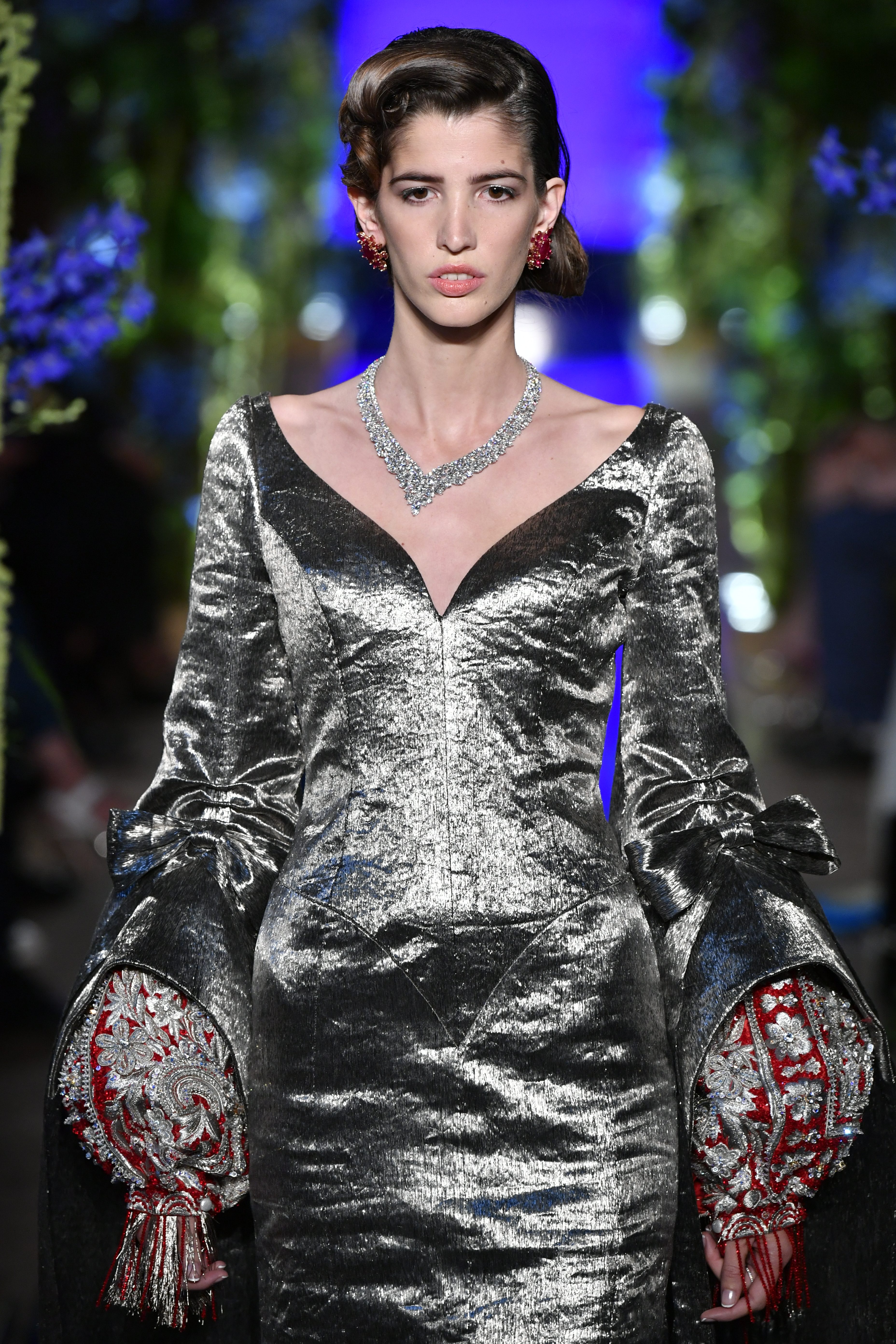 Guo Pei a sélectionné les matières les plus tendance et privilégié des lignes classiques aux tissus délicats pour sublimer la silhouette féminine. Brillance métallique texturée et couleurs moirées enrichissent l’esthétique de la collection. Cette saison, constructions complexes et superpositions donnent une impression d’illusion tout en mettant en valeur la fraîcheur des silhouettes.