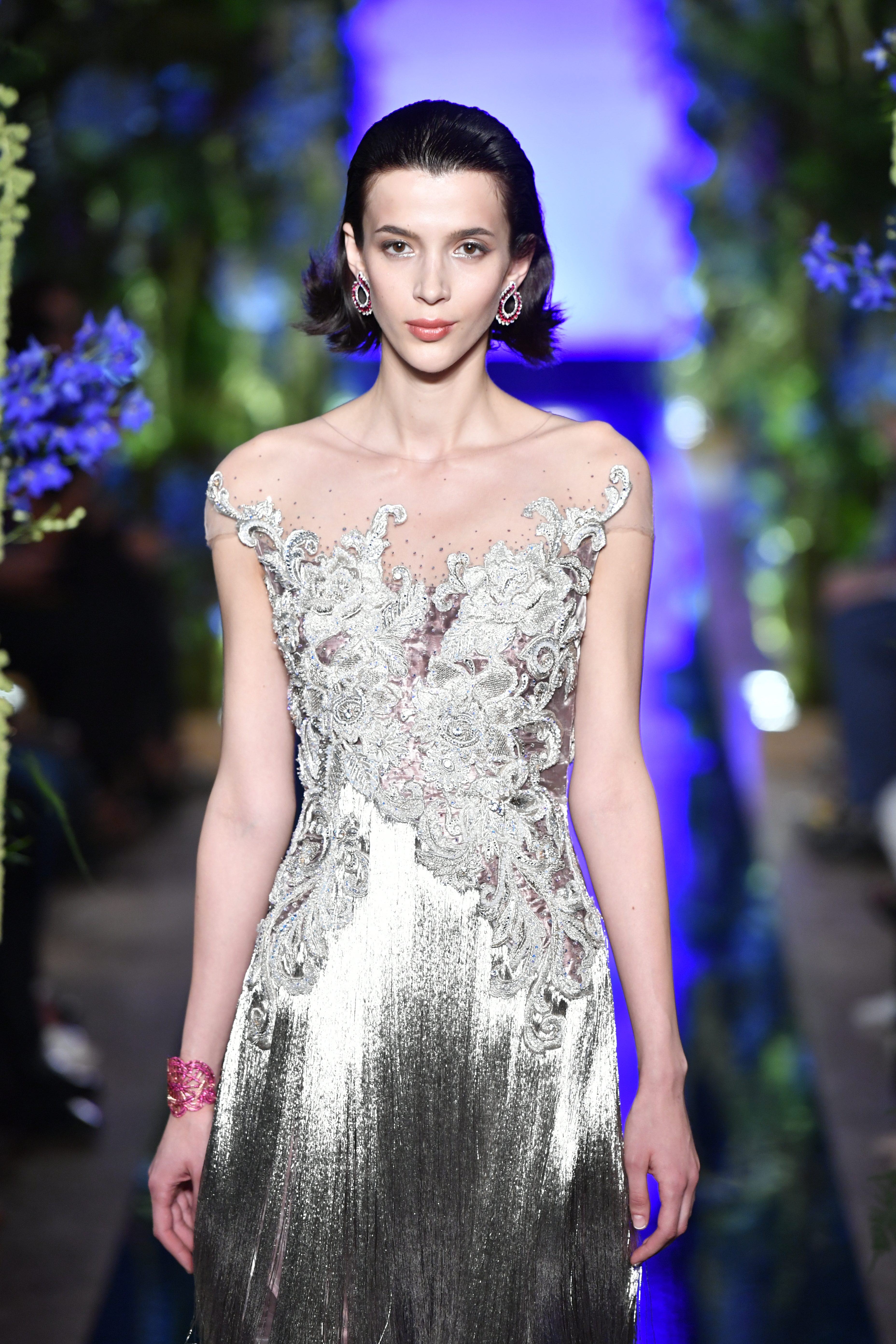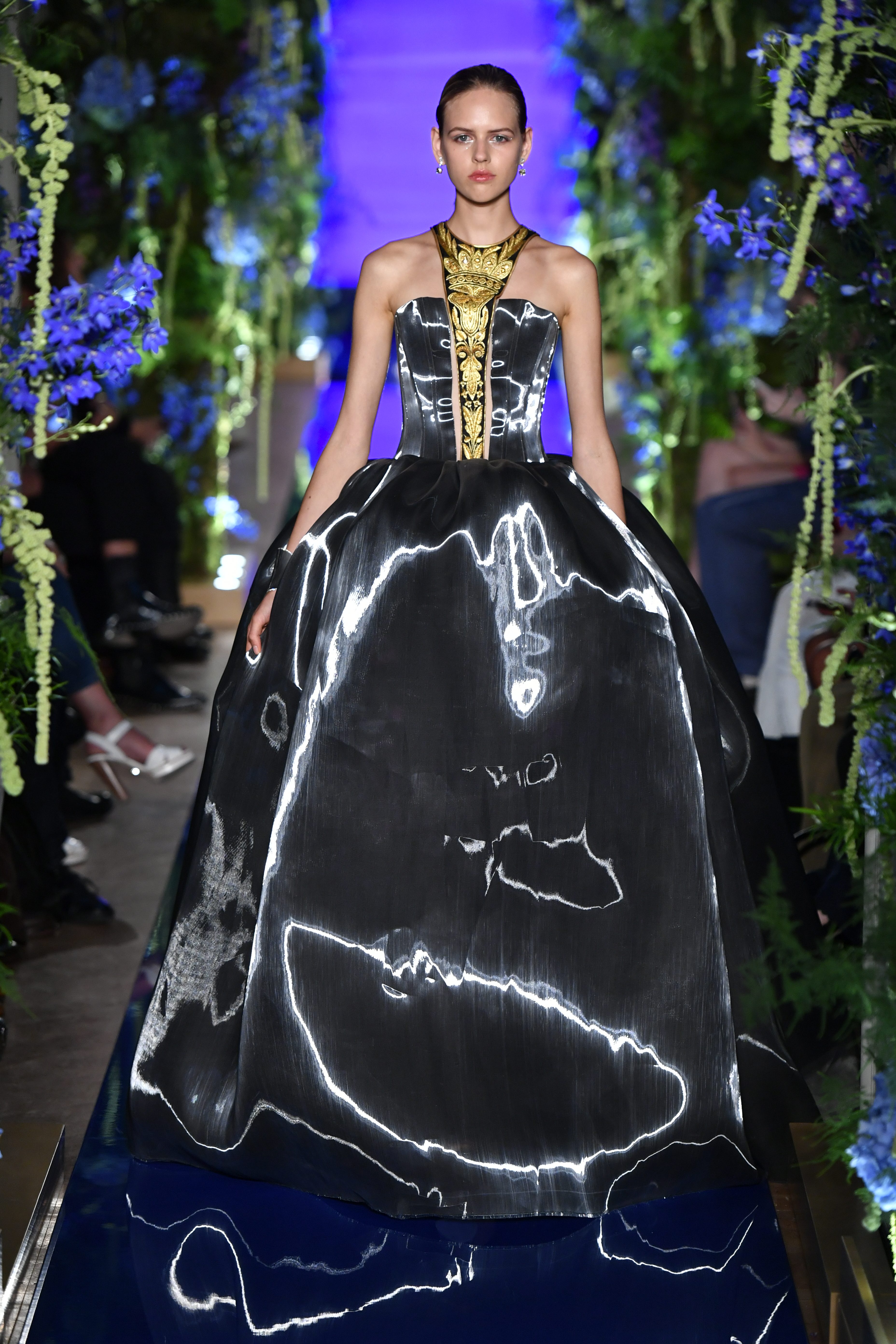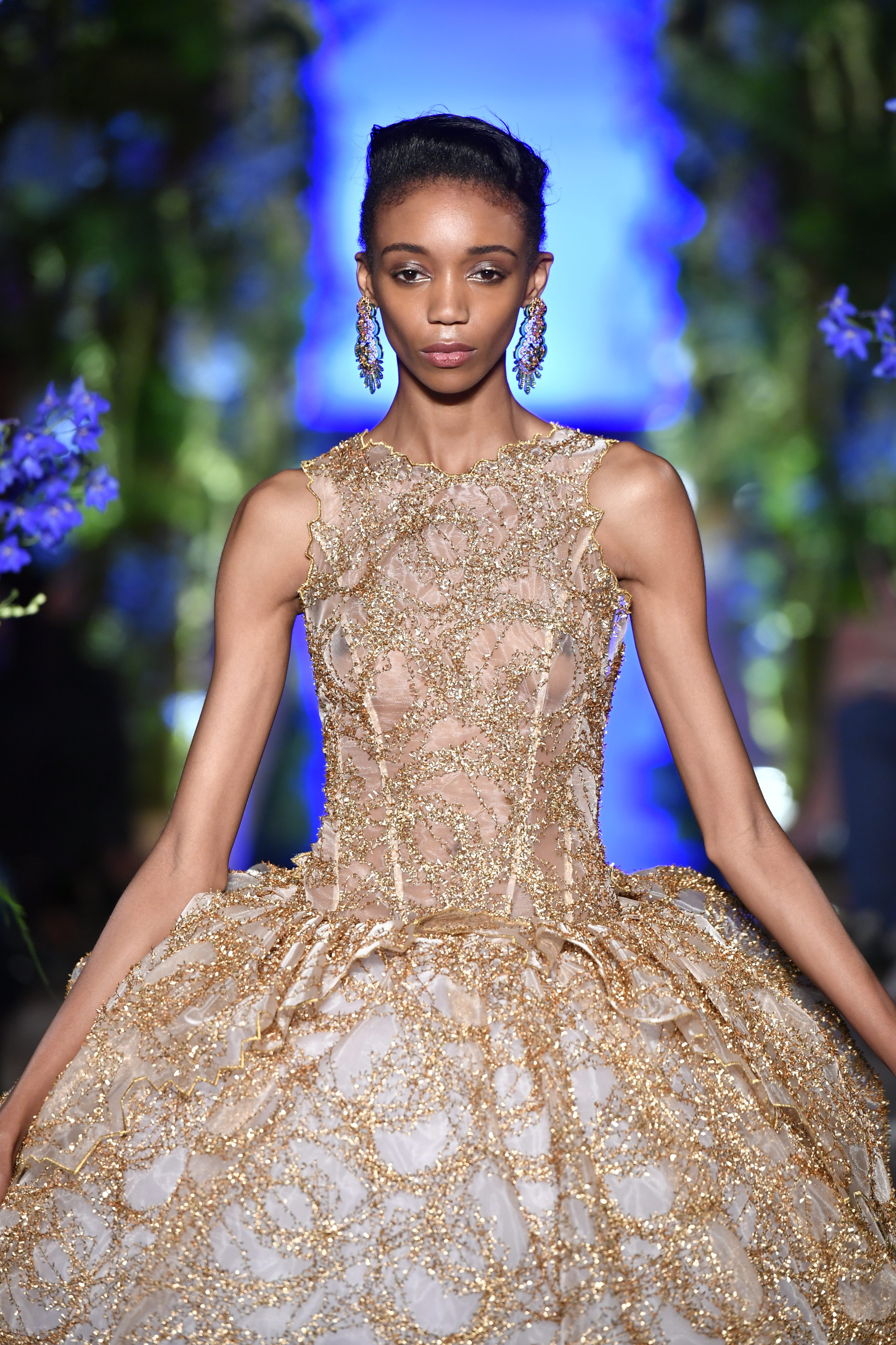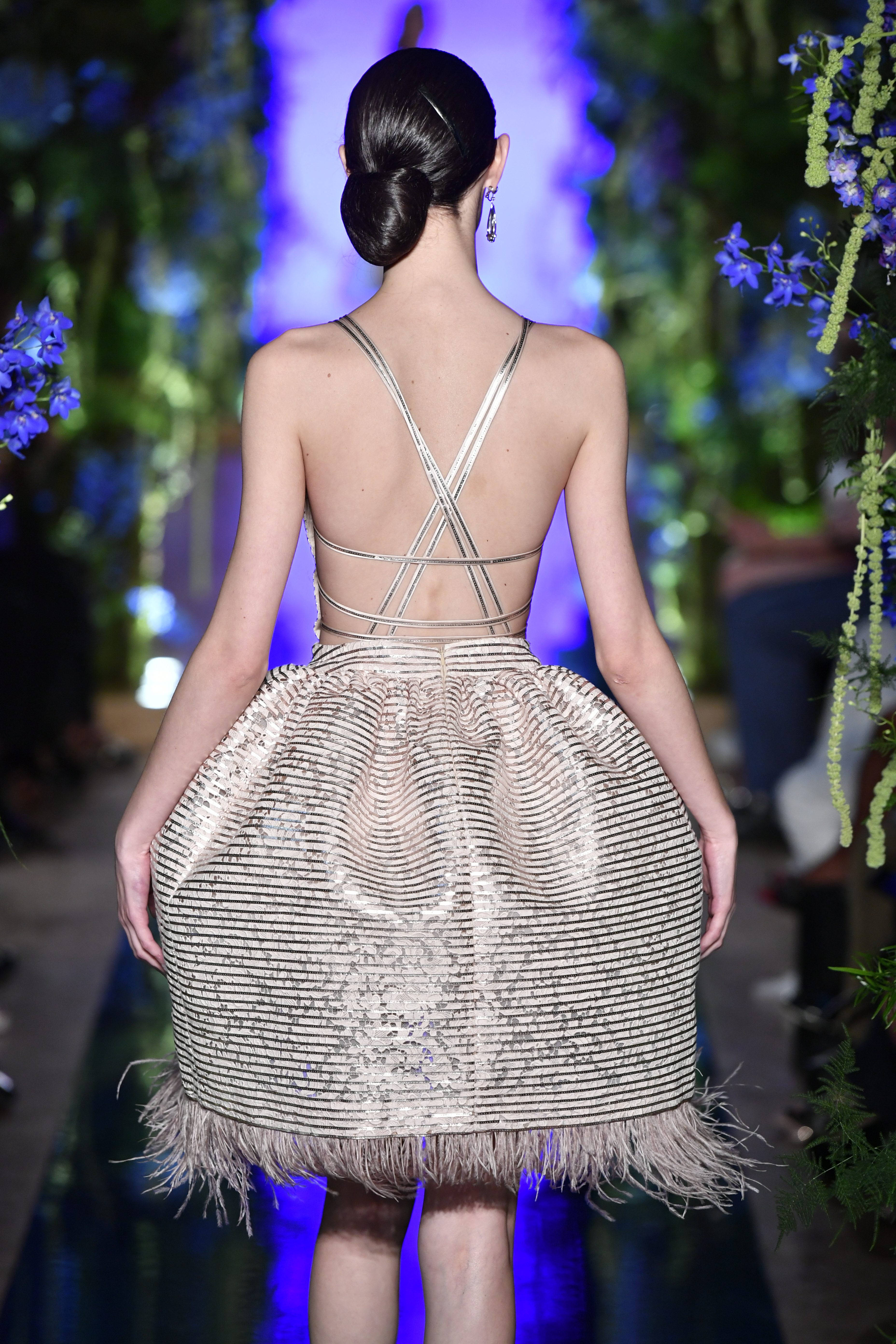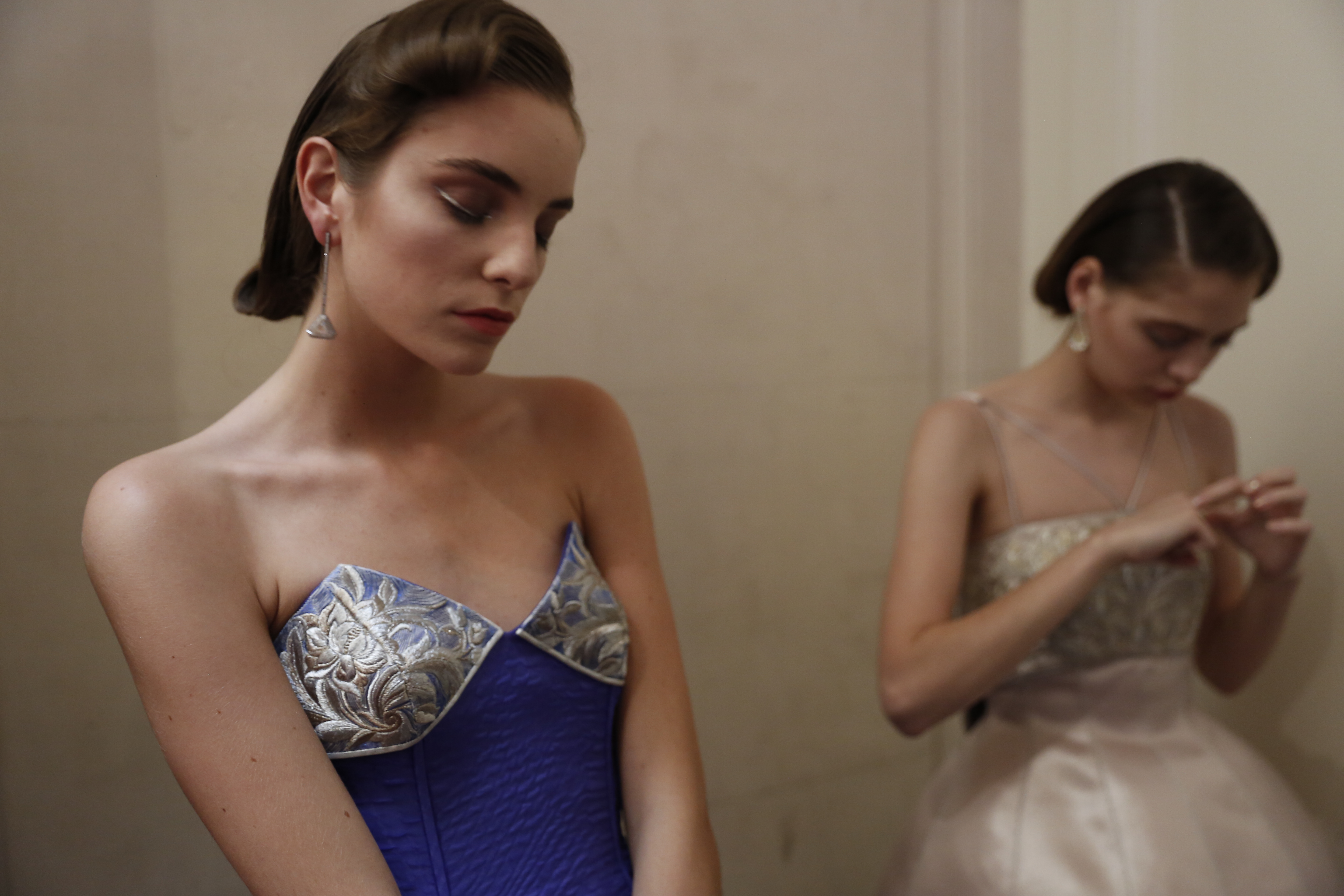 Guo Pei a sélectionné les matières les plus tendance et privilégié des lignes classiques aux tissus délicats pour sublimer la silhouette féminine. Brillance métallique texturée et couleurs moirées enrichissent l’esthétique de la collection. Cette saison, constructions complexes et superpositions donnent une impression d’illusion tout en mettant en valeur la fraîcheur des silhouettes.
