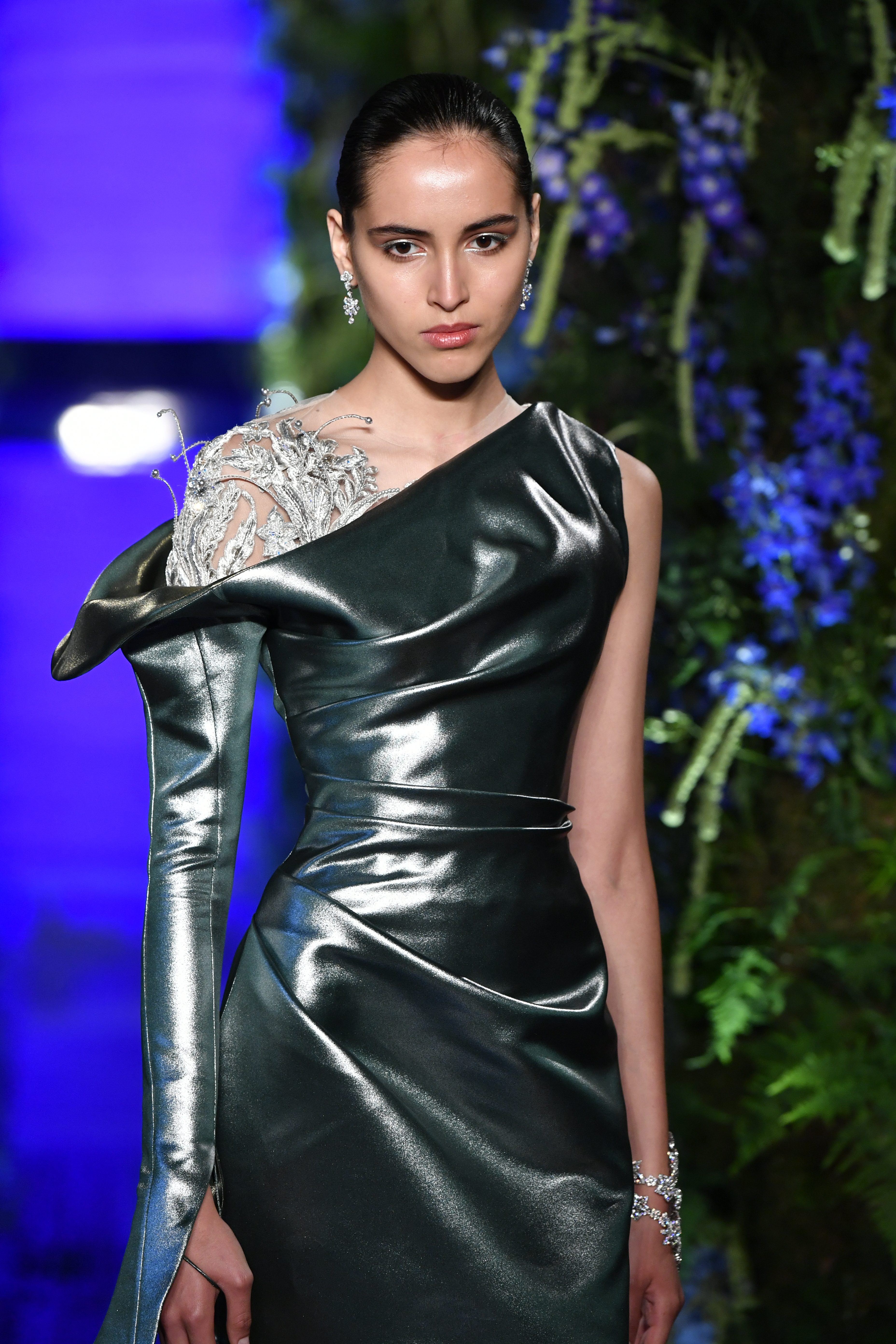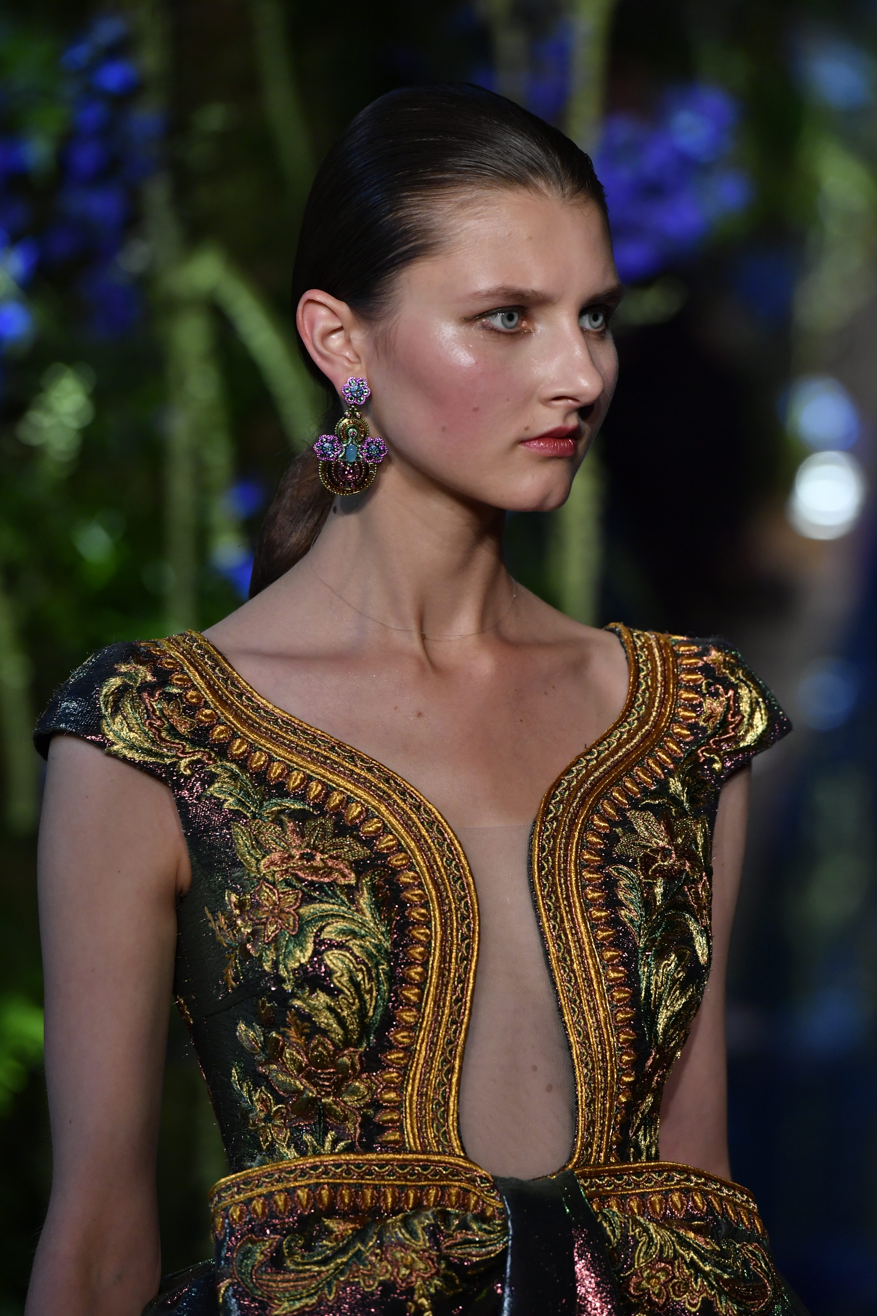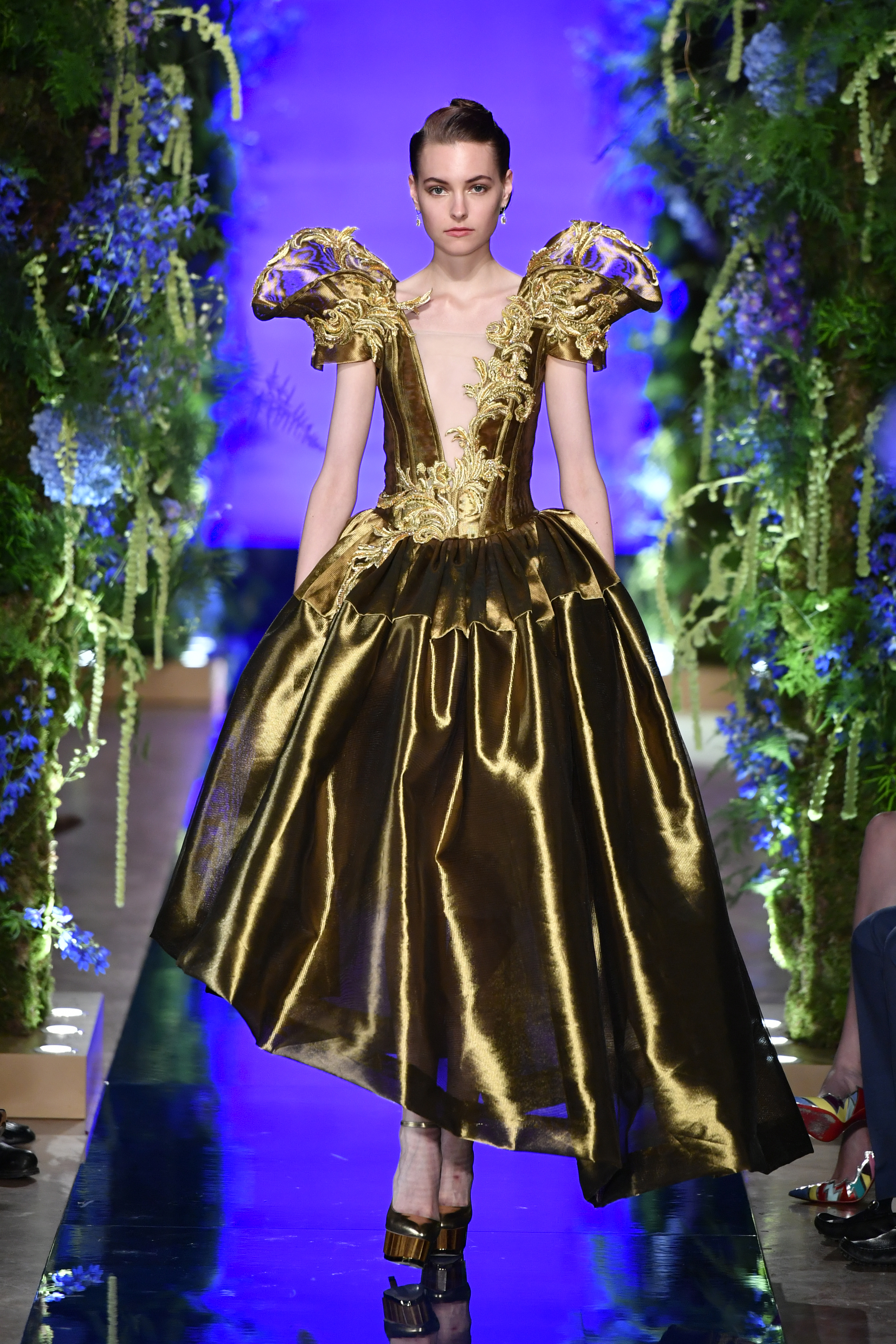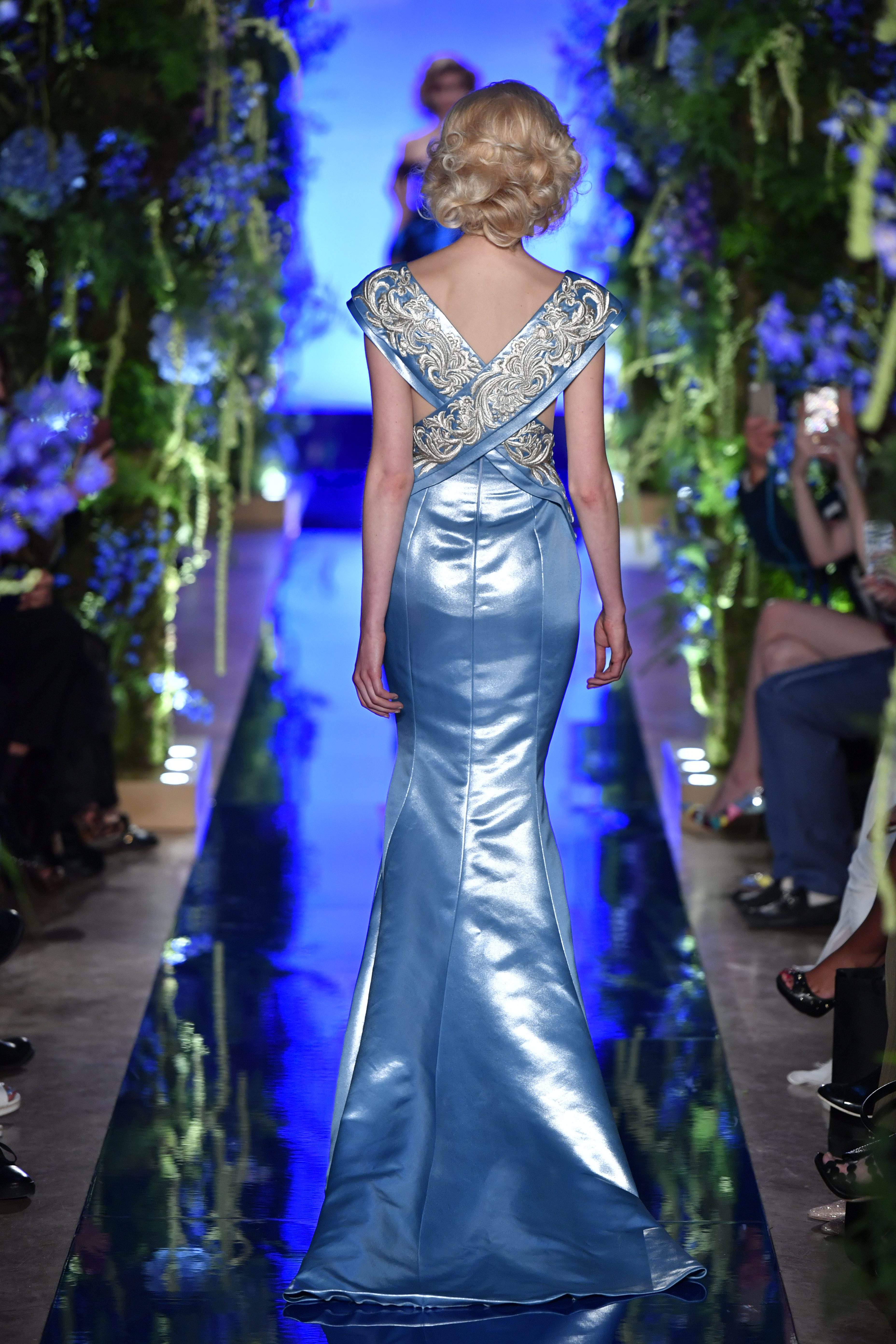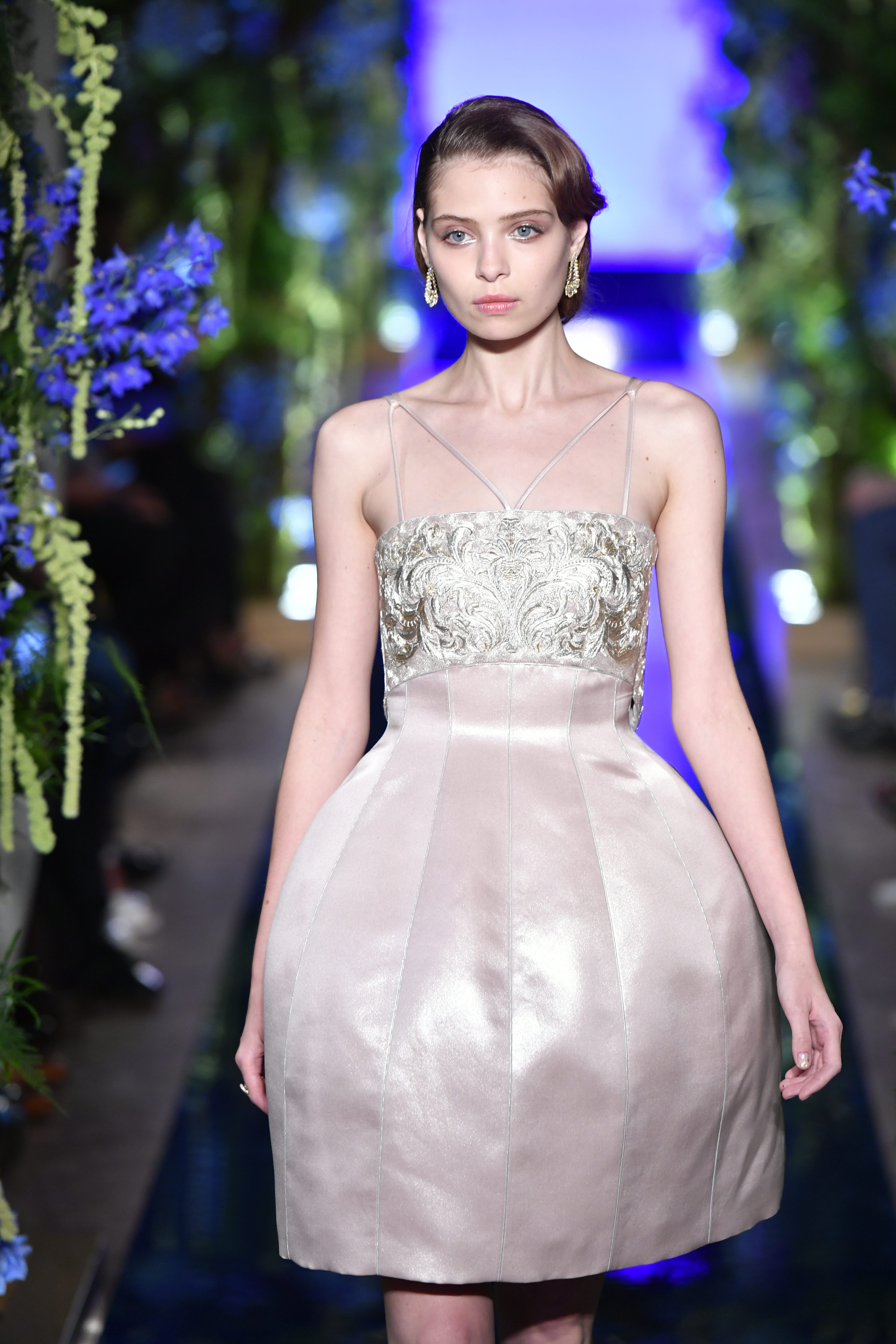Guo Pei a sélectionné les matières les plus tendance et privilégié des lignes classiques aux tissus délicats pour sublimer la silhouette féminine. Brillance métallique texturée et couleurs moirées enrichissent l’esthétique de la collection. Cette saison, constructions complexes et superpositions donnent une impression d’illusion tout en mettant en valeur la fraîcheur des silhouettes.