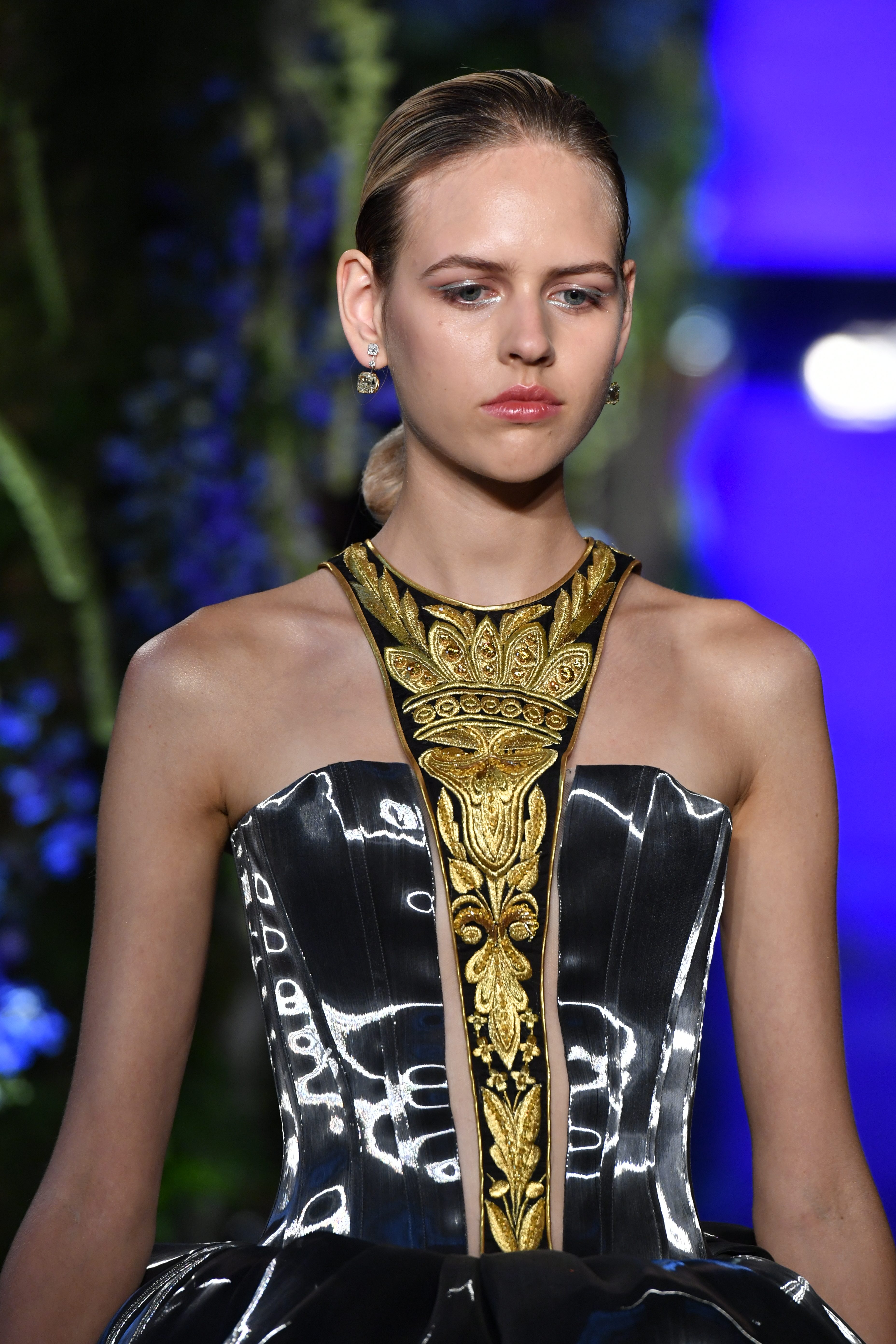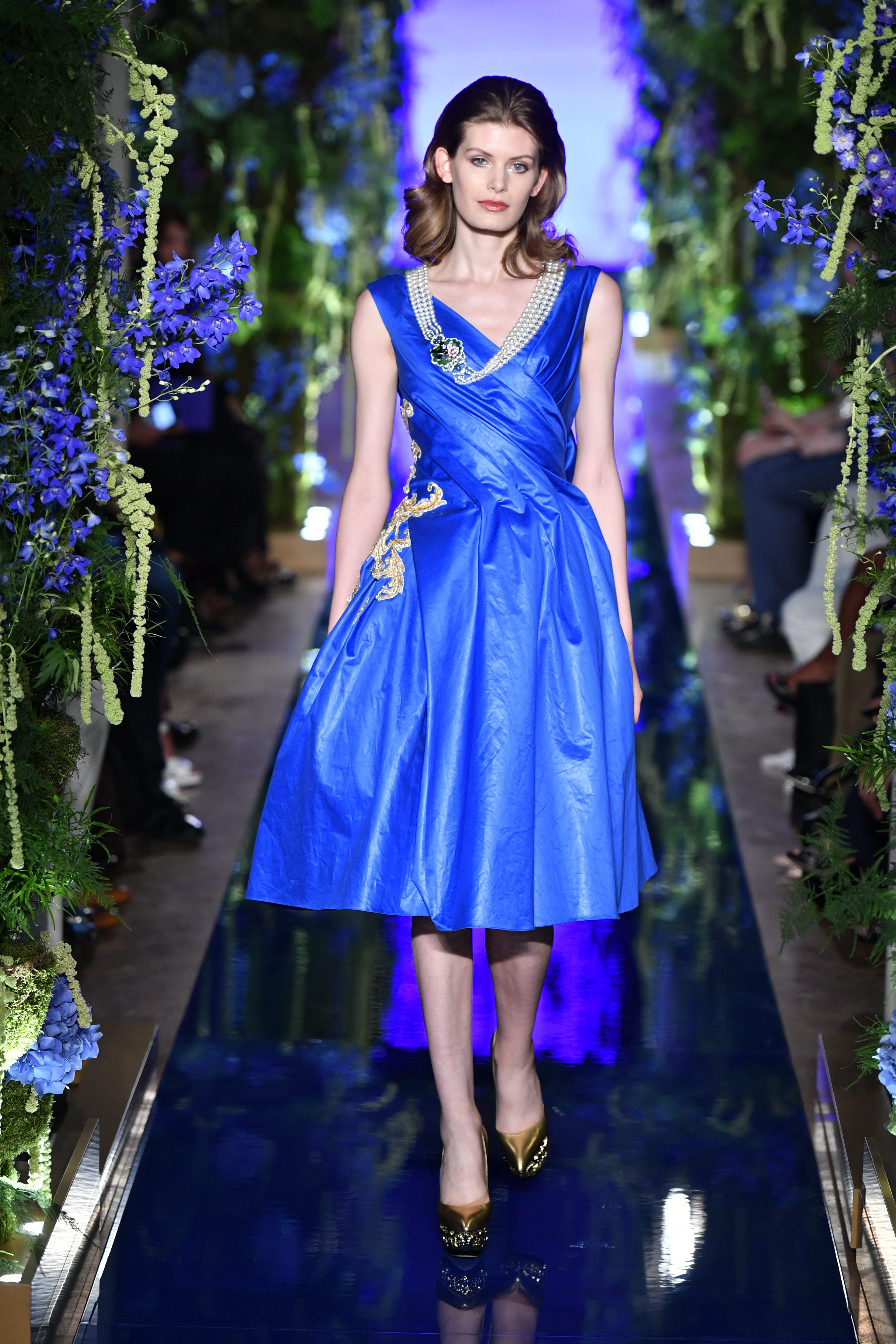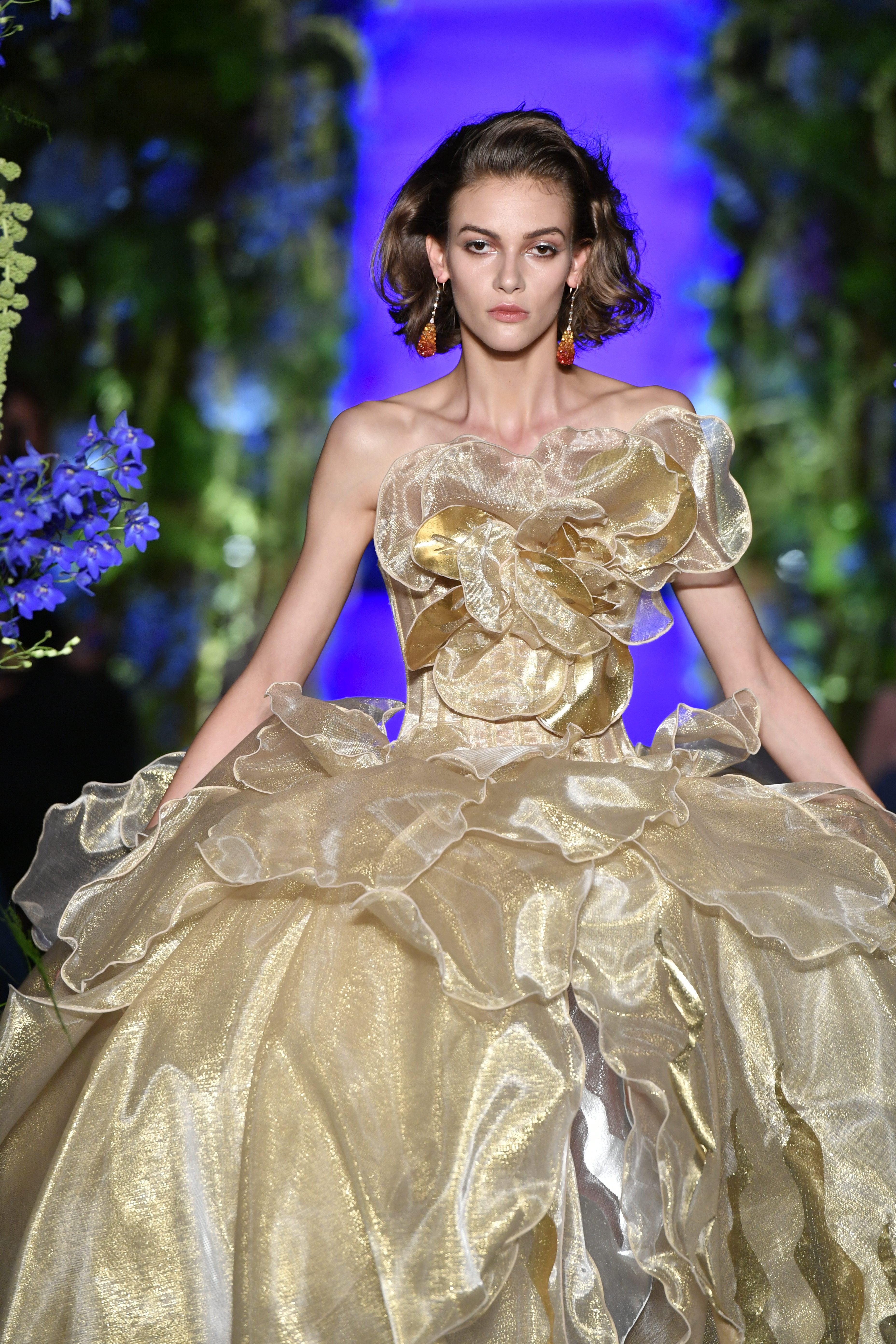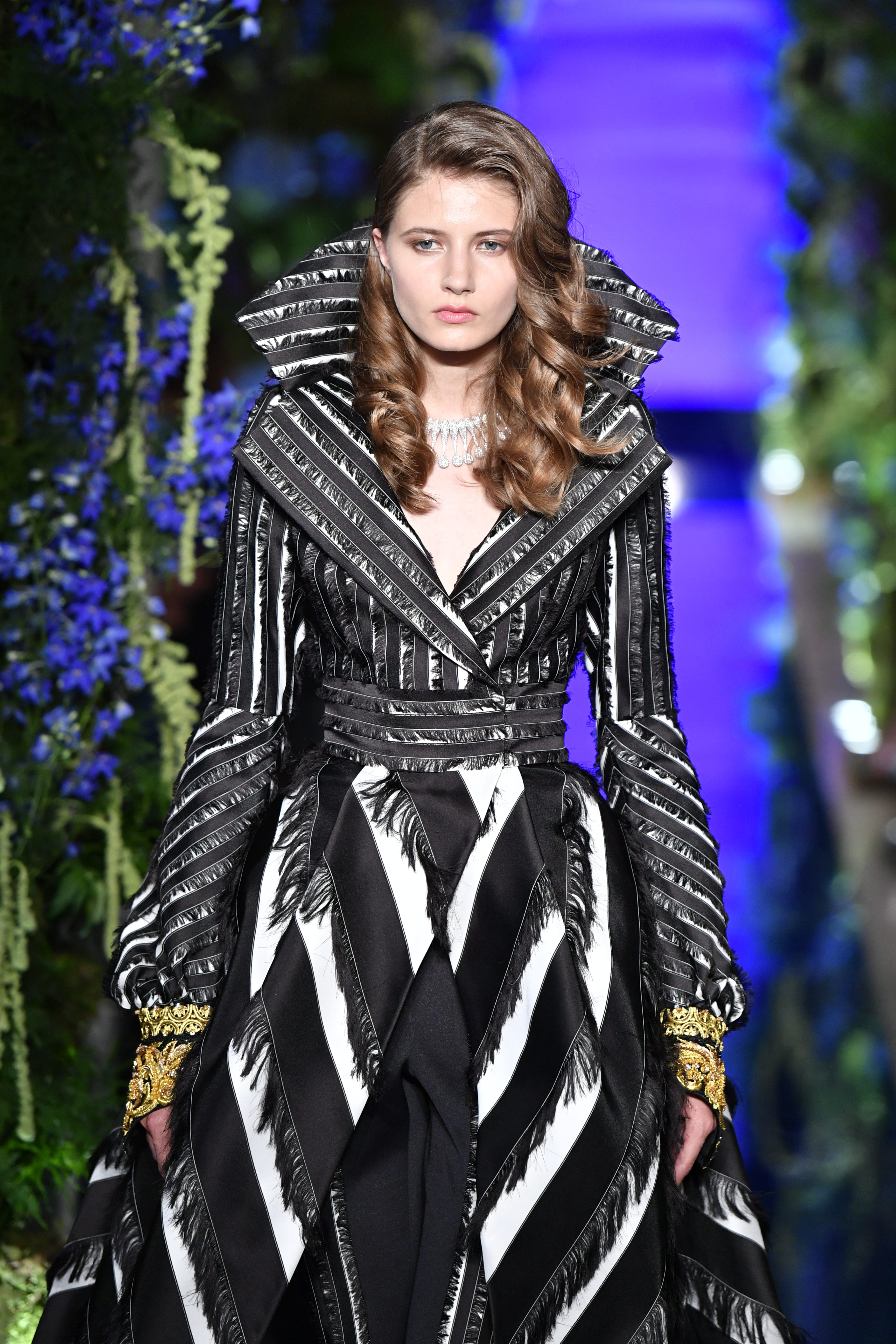 Guo Pei a sélectionné les matières les plus tendance et privilégié des lignes classiques aux tissus délicats pour sublimer la silhouette féminine. Brillance métallique texturée et couleurs moirées enrichissent l’esthétique de la collection. Cette saison, constructions complexes et superpositions donnent une impression d’illusion tout en mettant en valeur la fraîcheur des silhouettes.