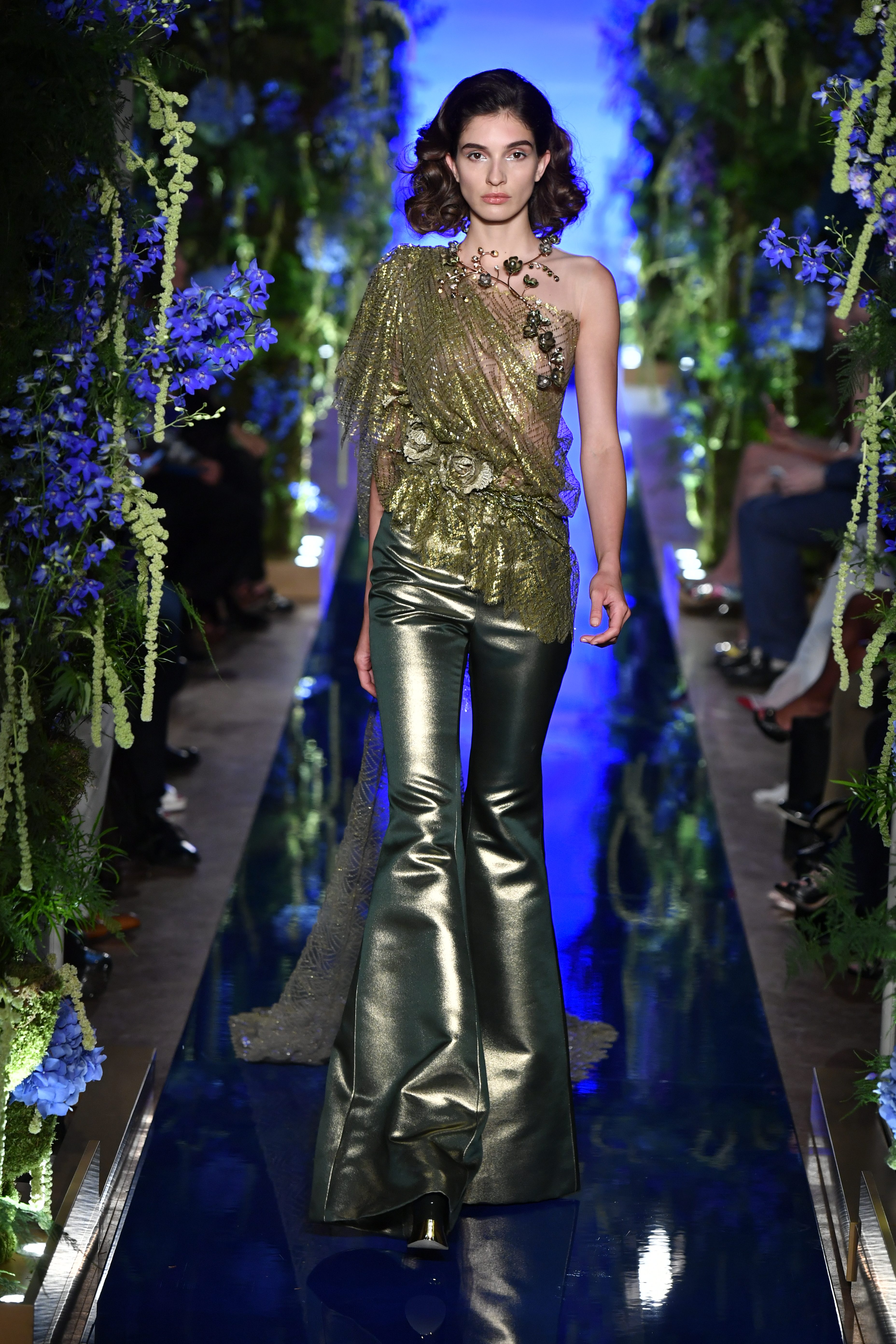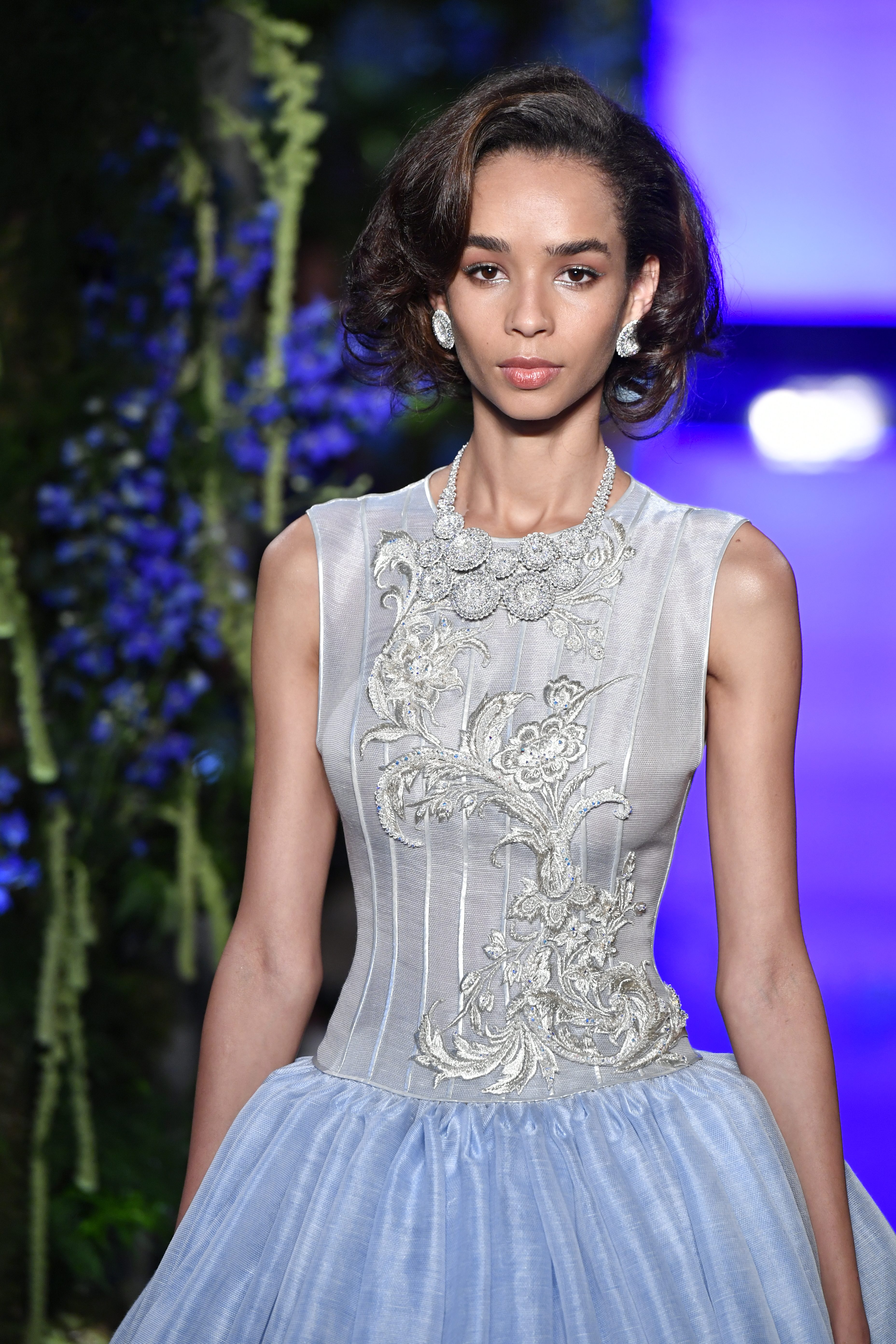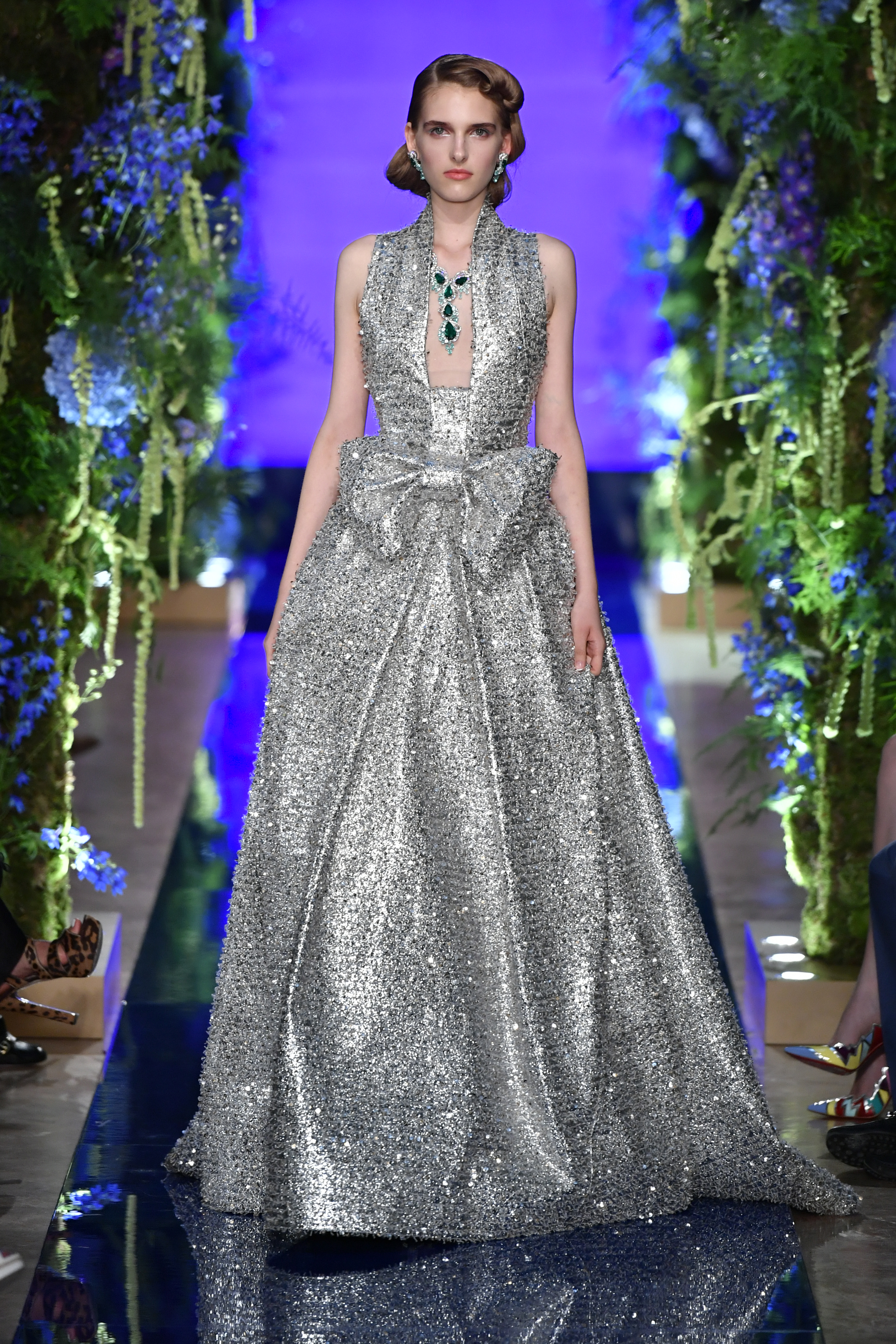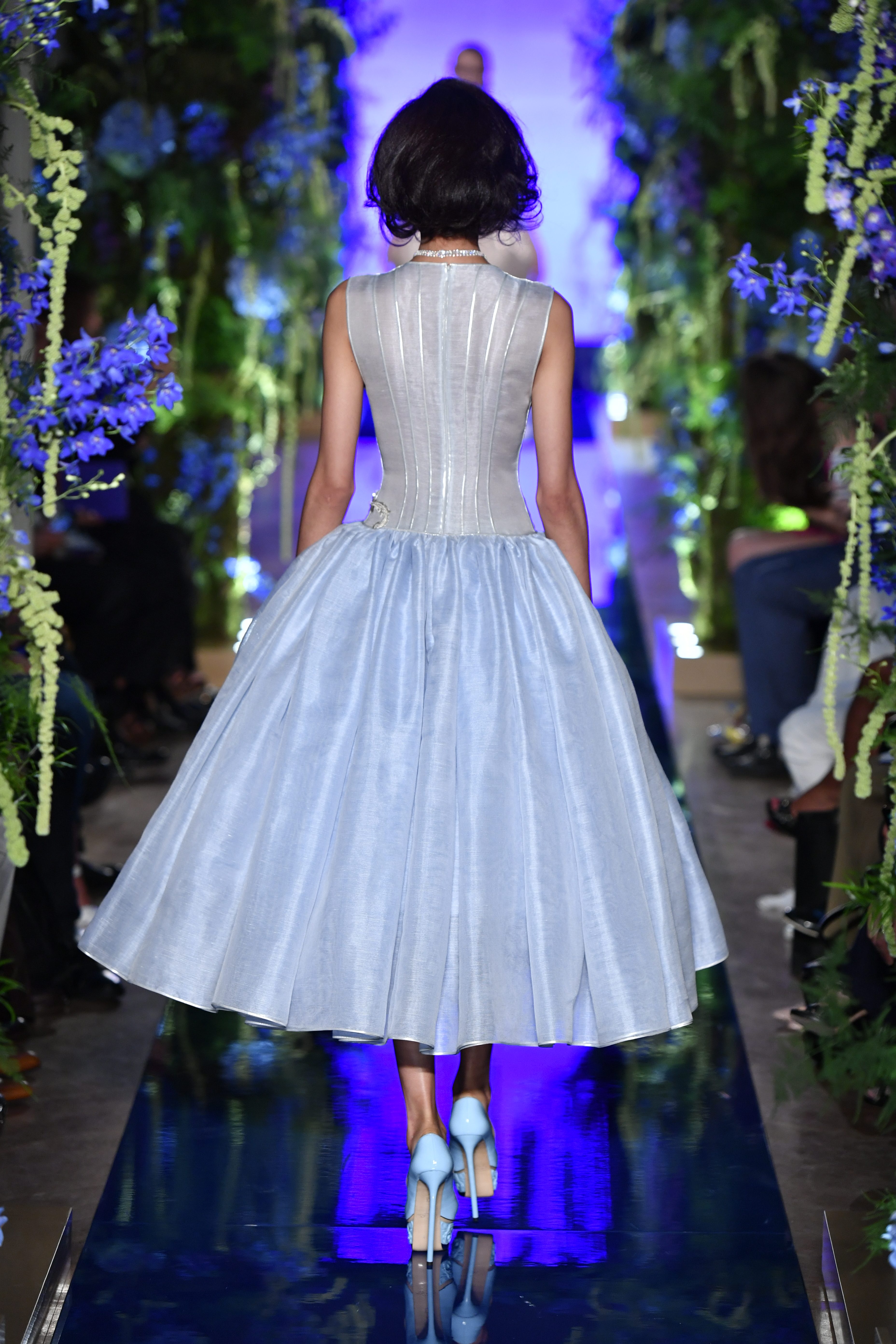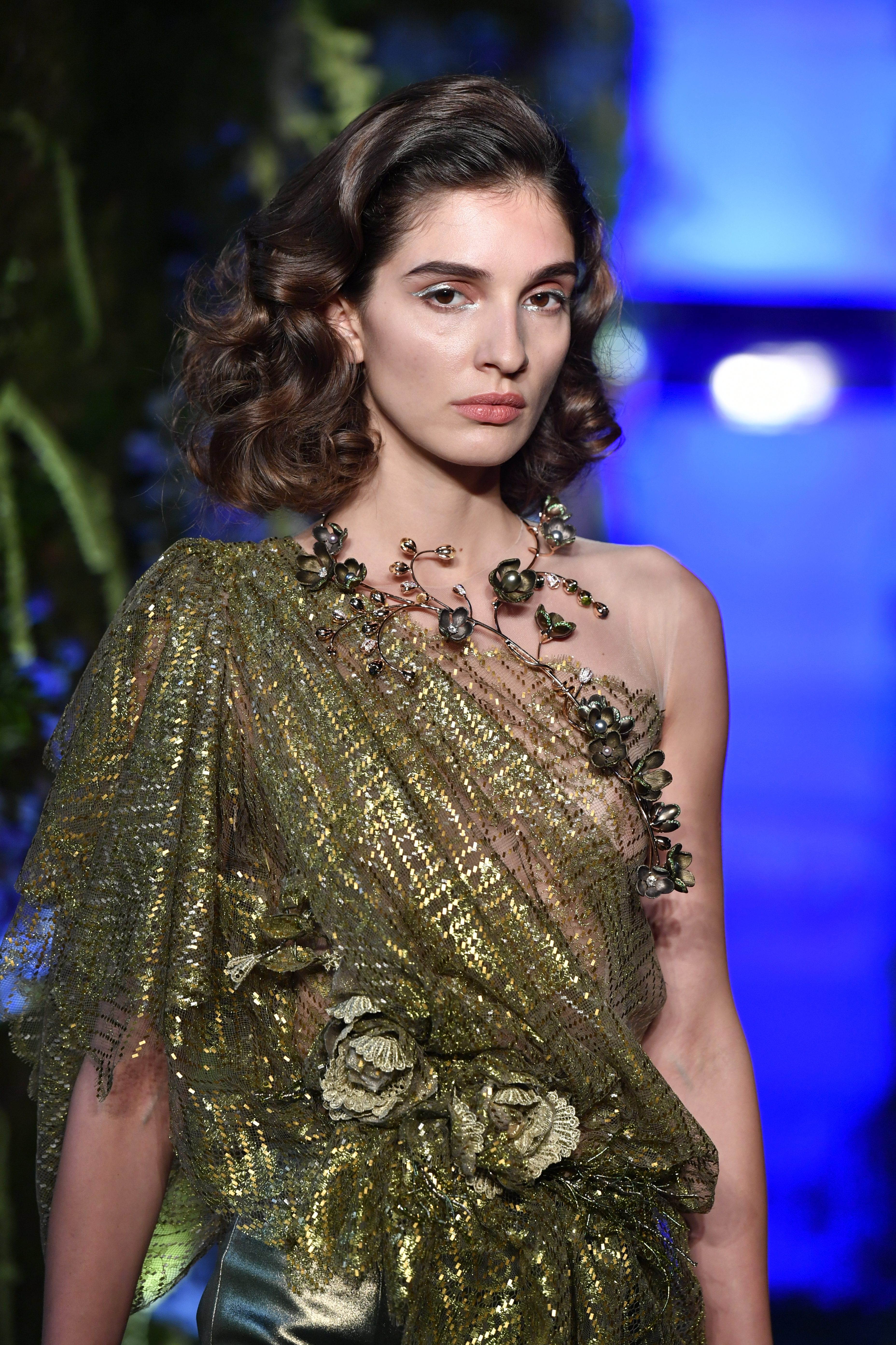 Guo Pei a sélectionné les matières les plus tendance et privilégié des lignes classiques aux tissus délicats pour sublimer la silhouette féminine. Brillance métallique texturée et couleurs moirées enrichissent l’esthétique de la collection. Cette saison, constructions complexes et superpositions donnent une impression d’illusion tout en mettant en valeur la fraîcheur des silhouettes.