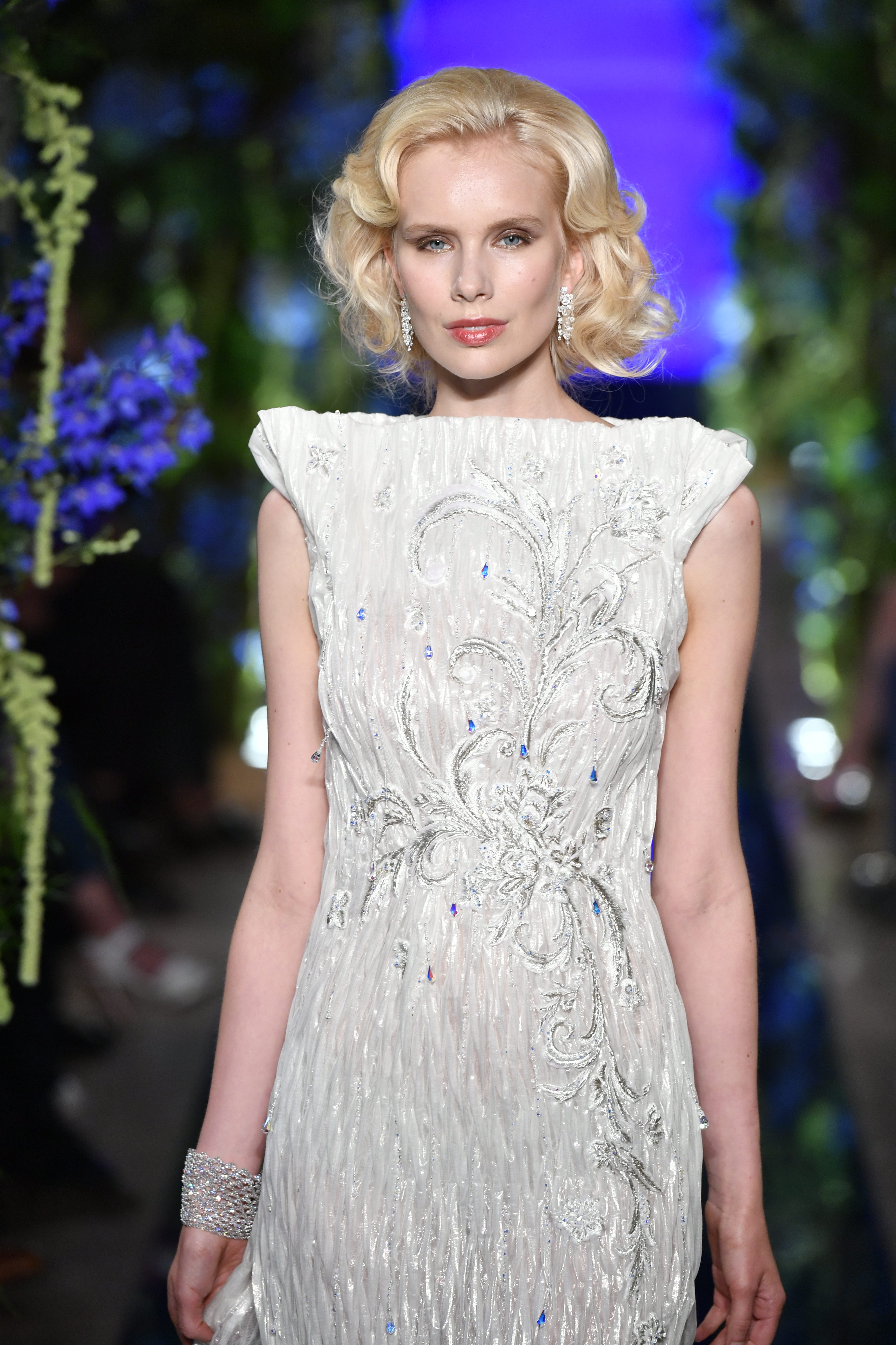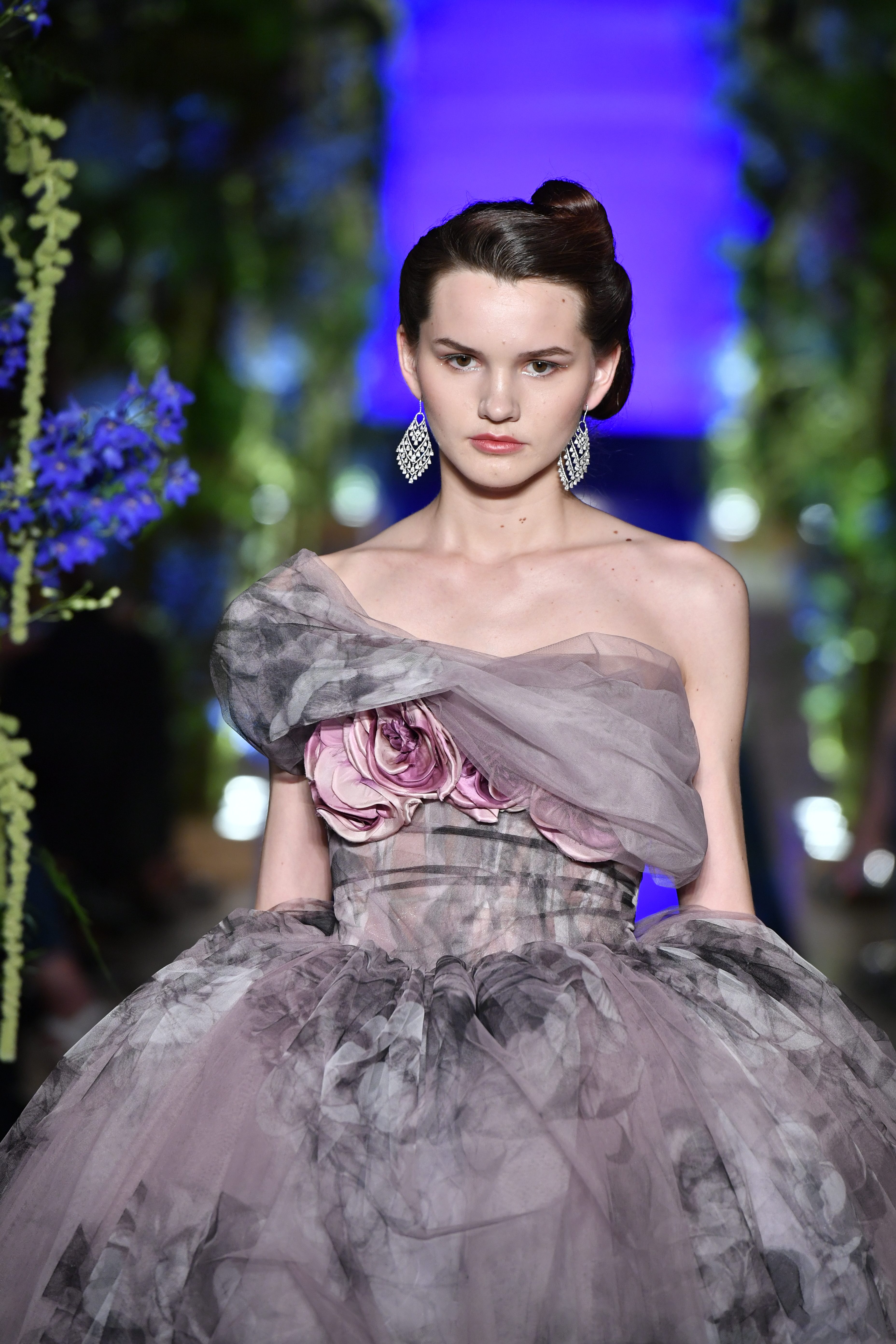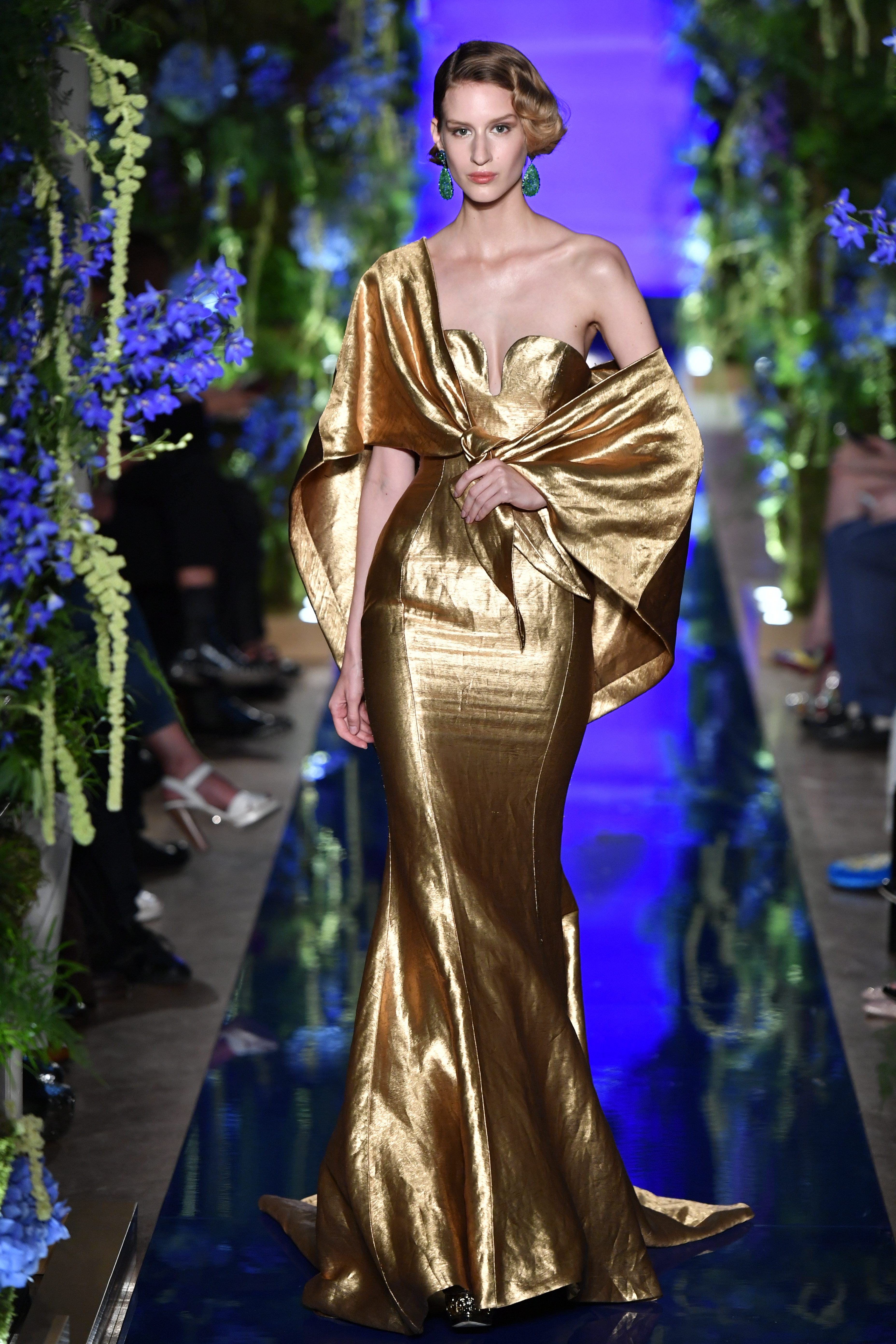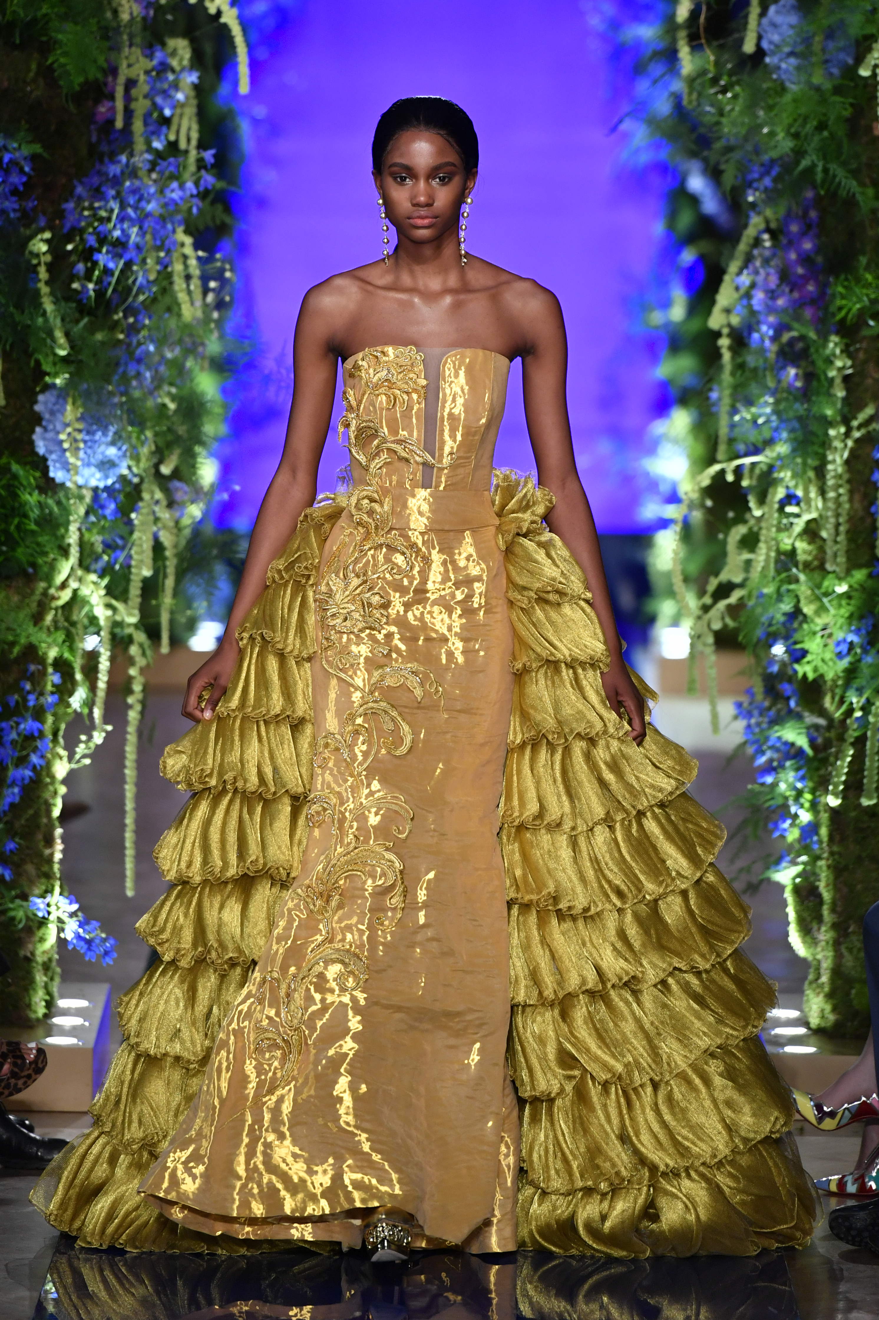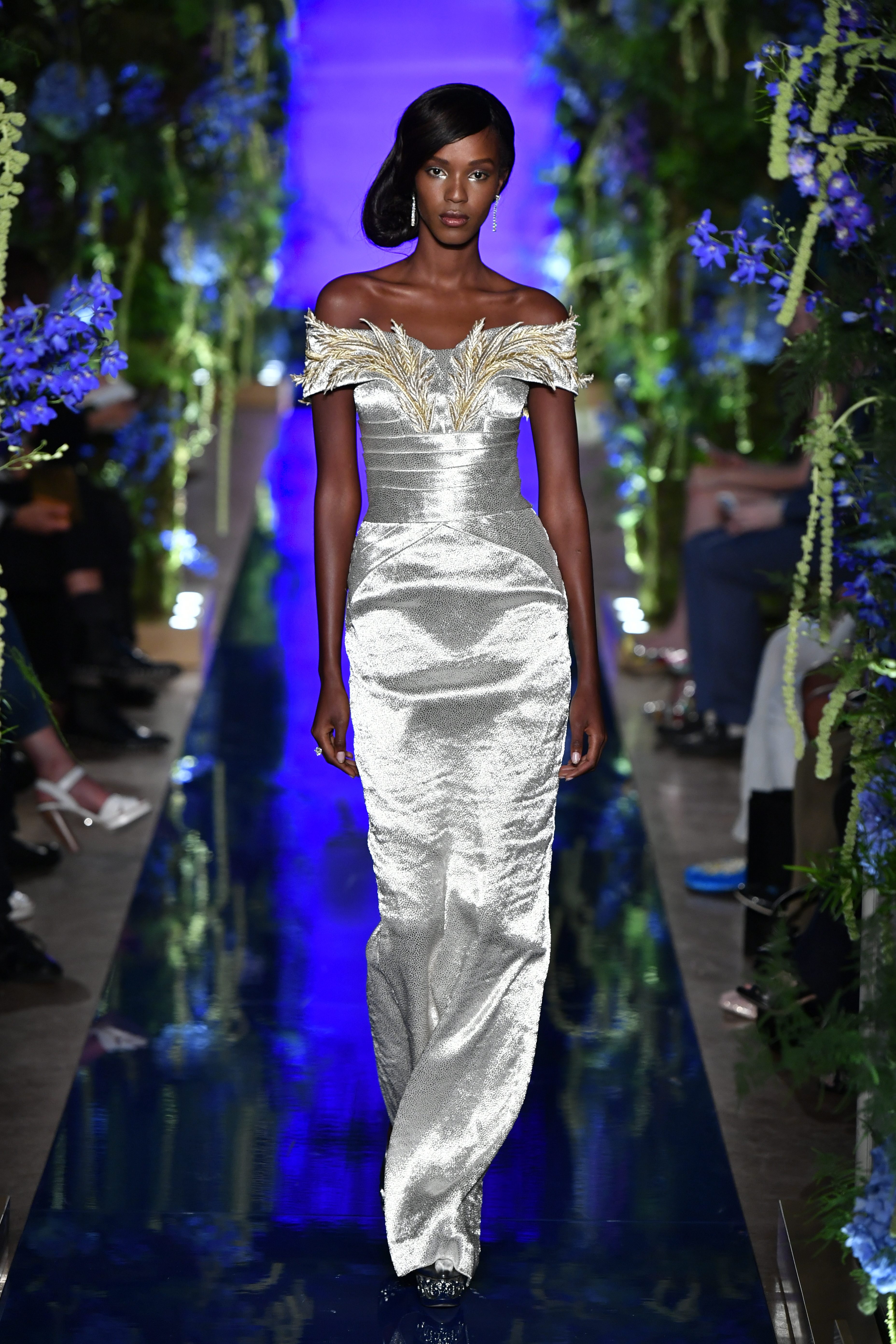 Guo Pei a sélectionné les matières les plus tendance et privilégié des lignes classiques aux tissus délicats pour sublimer la silhouette féminine. Brillance métallique texturée et couleurs moirées enrichissent l’esthétique de la collection. Cette saison, constructions complexes et superpositions donnent une impression d’illusion tout en mettant en valeur la fraîcheur des silhouettes.