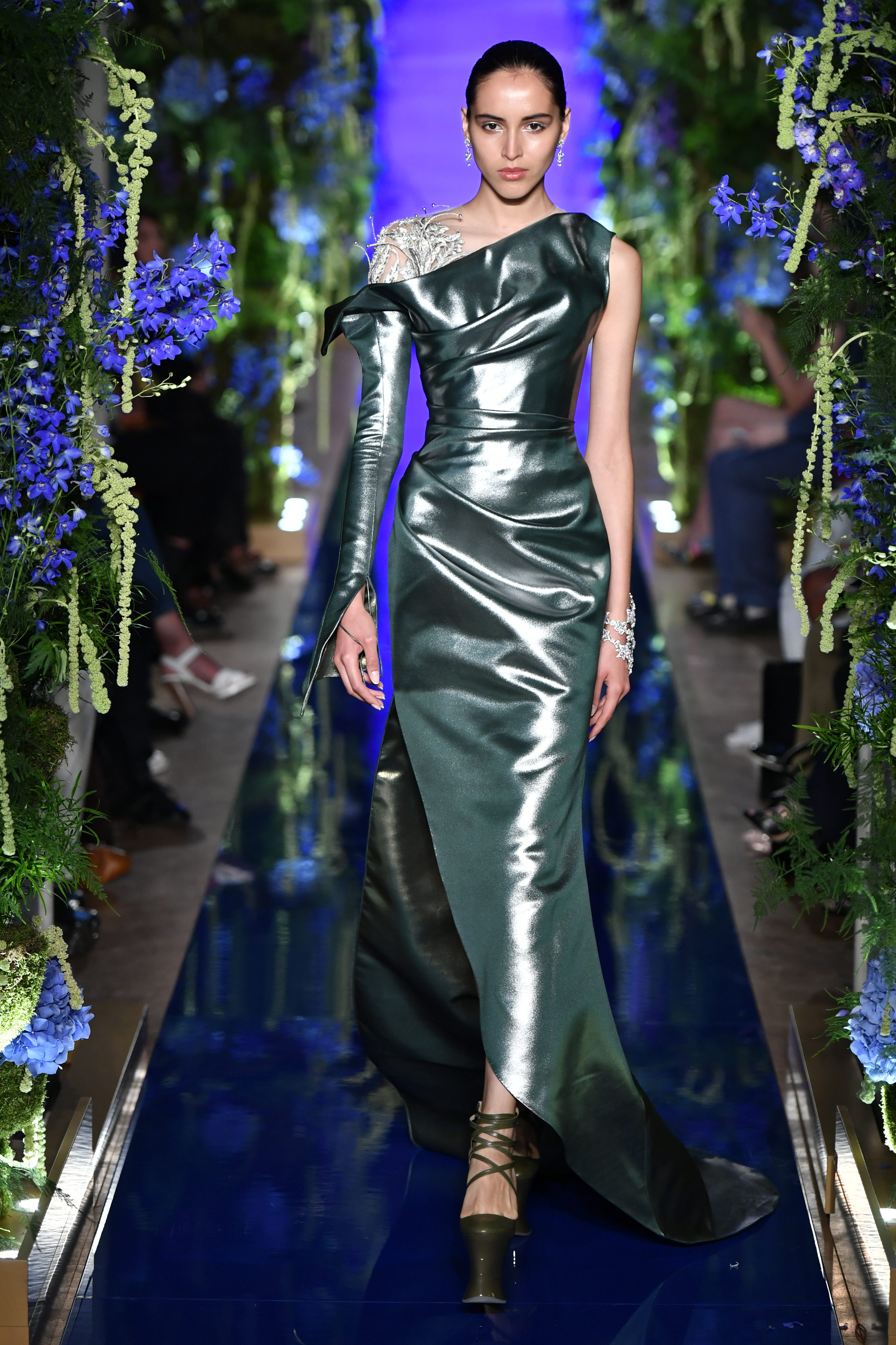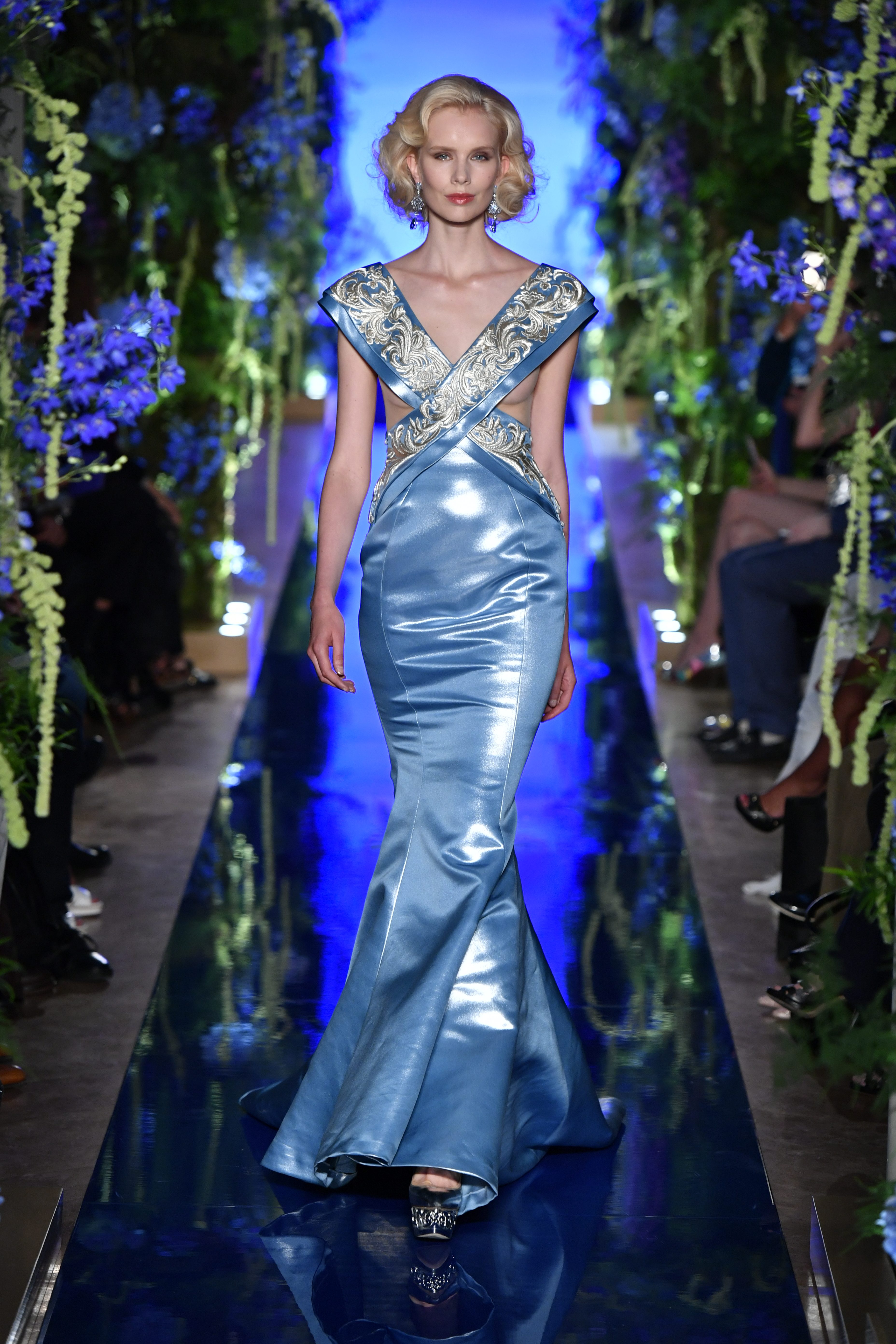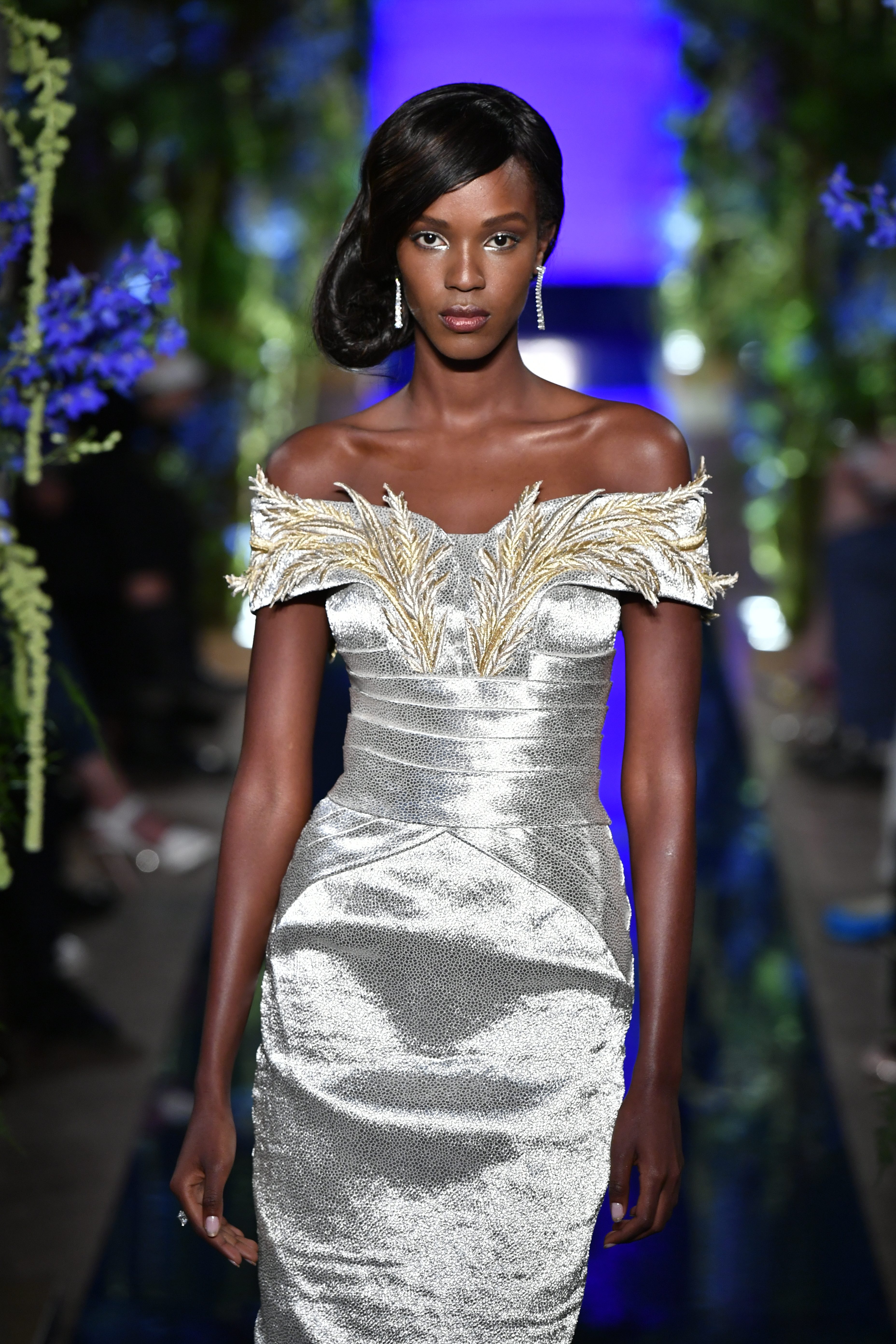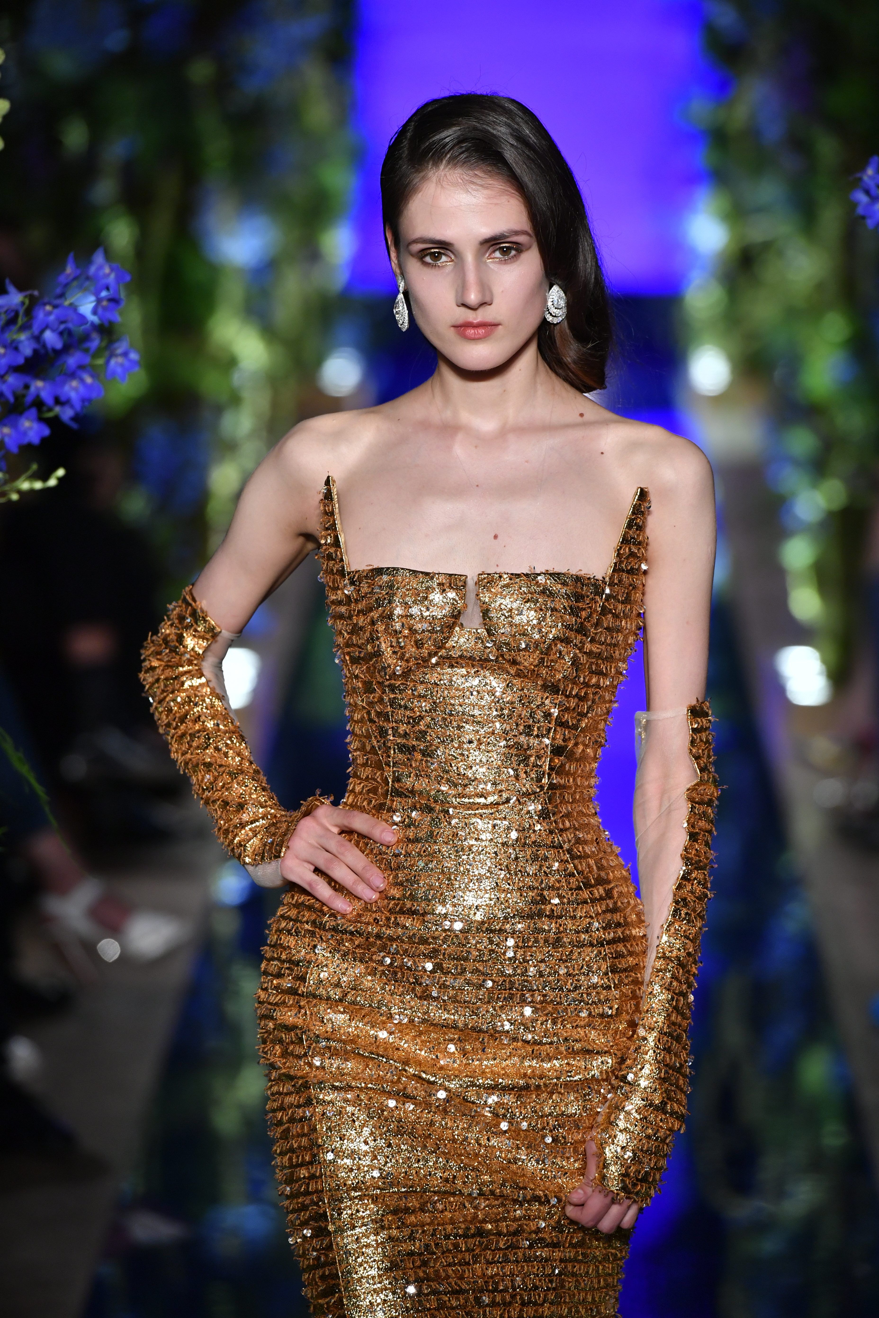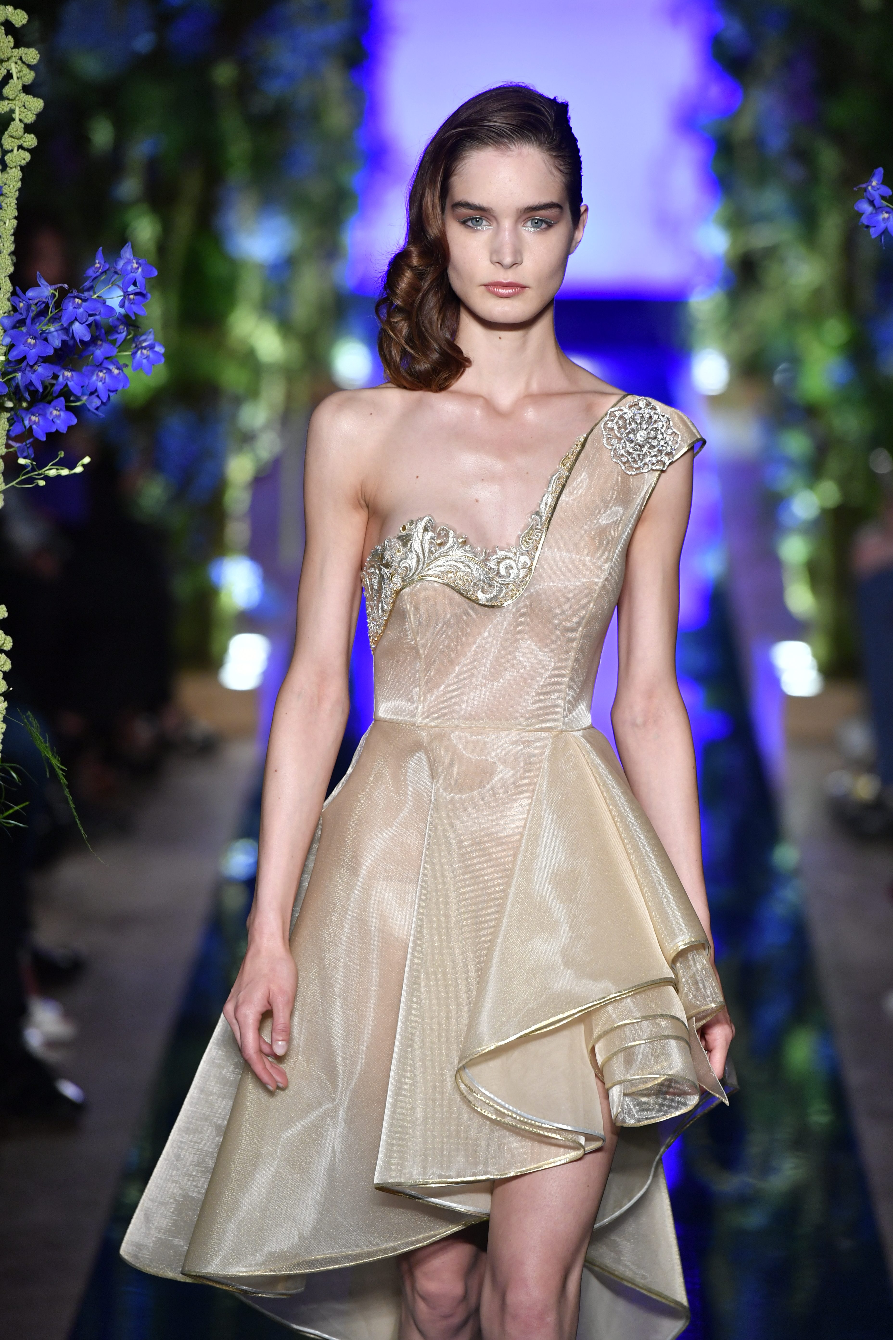 Guo Pei a sélectionné les matières les plus tendance et privilégié des lignes classiques aux tissus délicats pour sublimer la silhouette féminine. Brillance métallique texturée et couleurs moirées enrichissent l’esthétique de la collection. Cette saison, constructions complexes et superpositions donnent une impression d’illusion tout en mettant en valeur la fraîcheur des silhouettes.