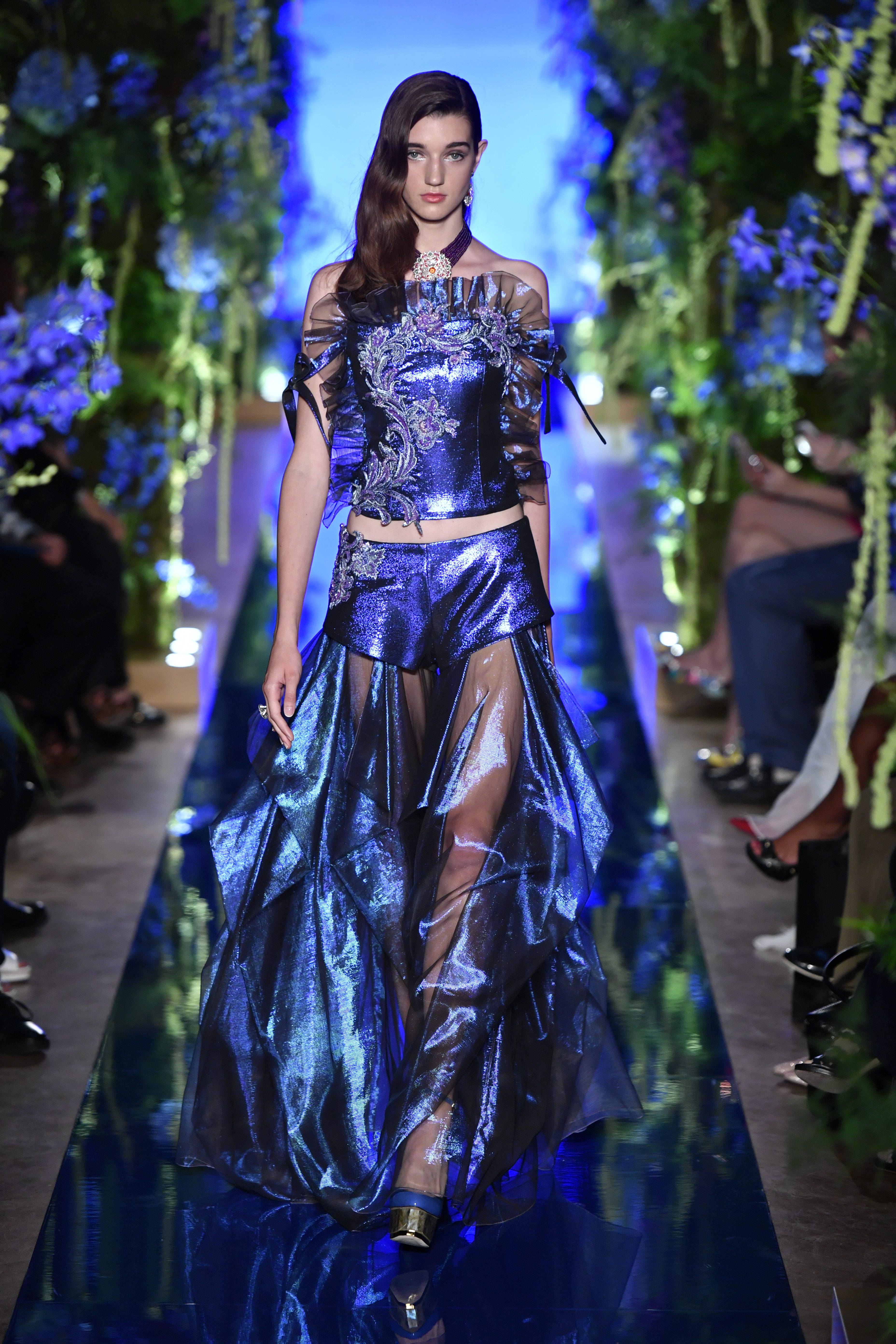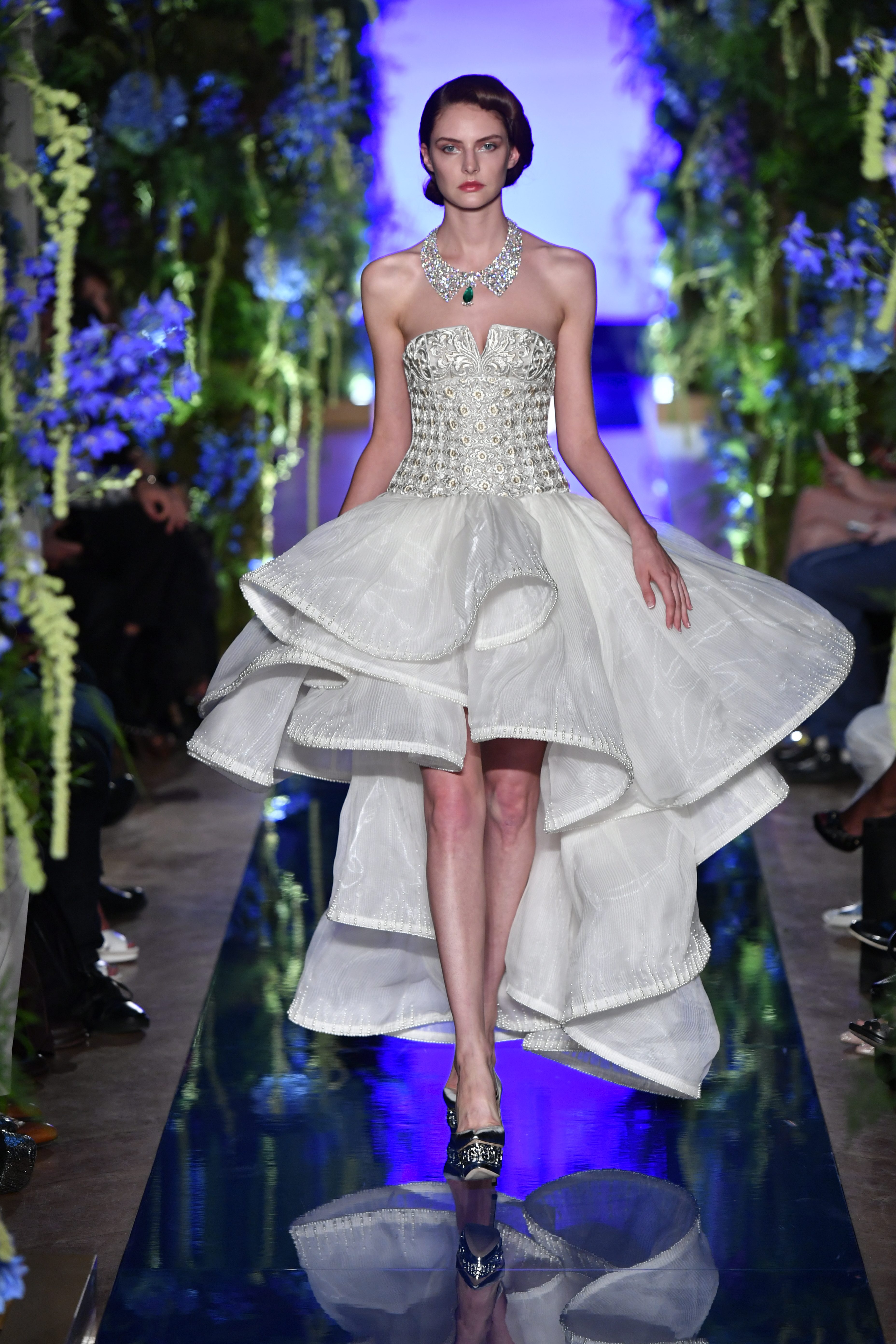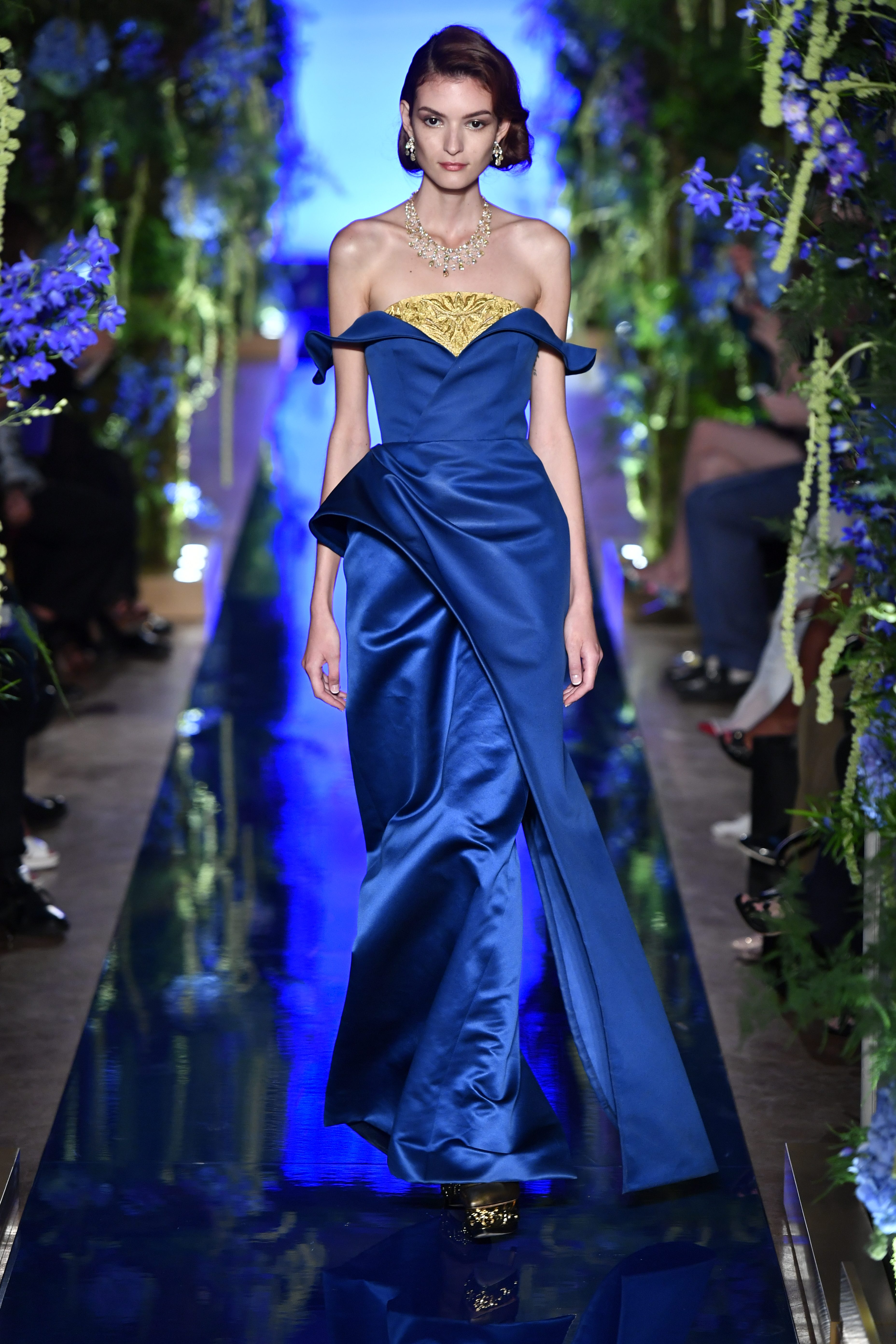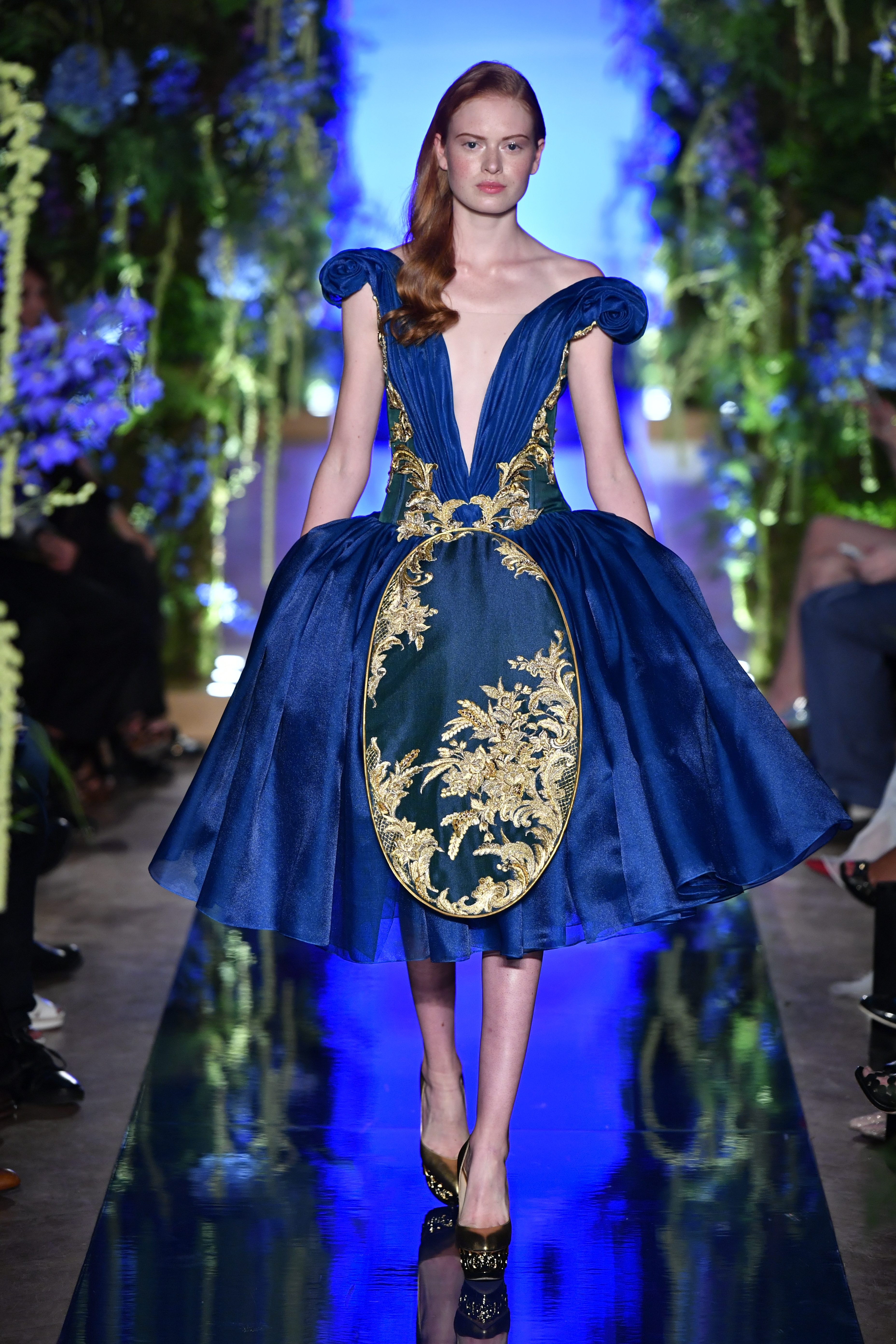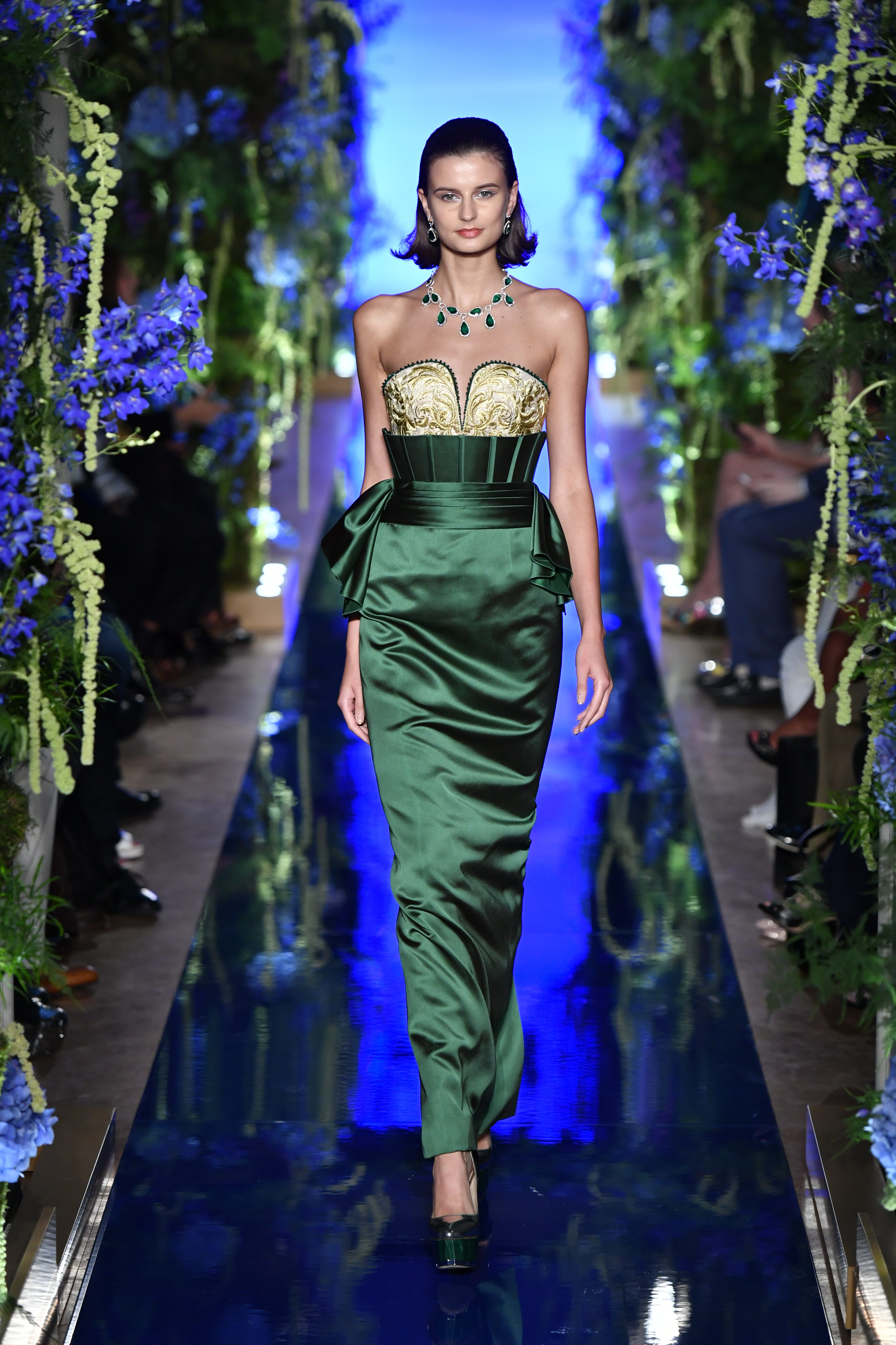 Guo Pei a sélectionné les matières les plus tendance et privilégié des lignes classiques aux tissus délicats pour sublimer la silhouette féminine. Brillance métallique texturée et couleurs moirées enrichissent l’esthétique de la collection. Cette saison, constructions complexes et superpositions donnent une impression d’illusion tout en mettant en valeur la fraîcheur des silhouettes.