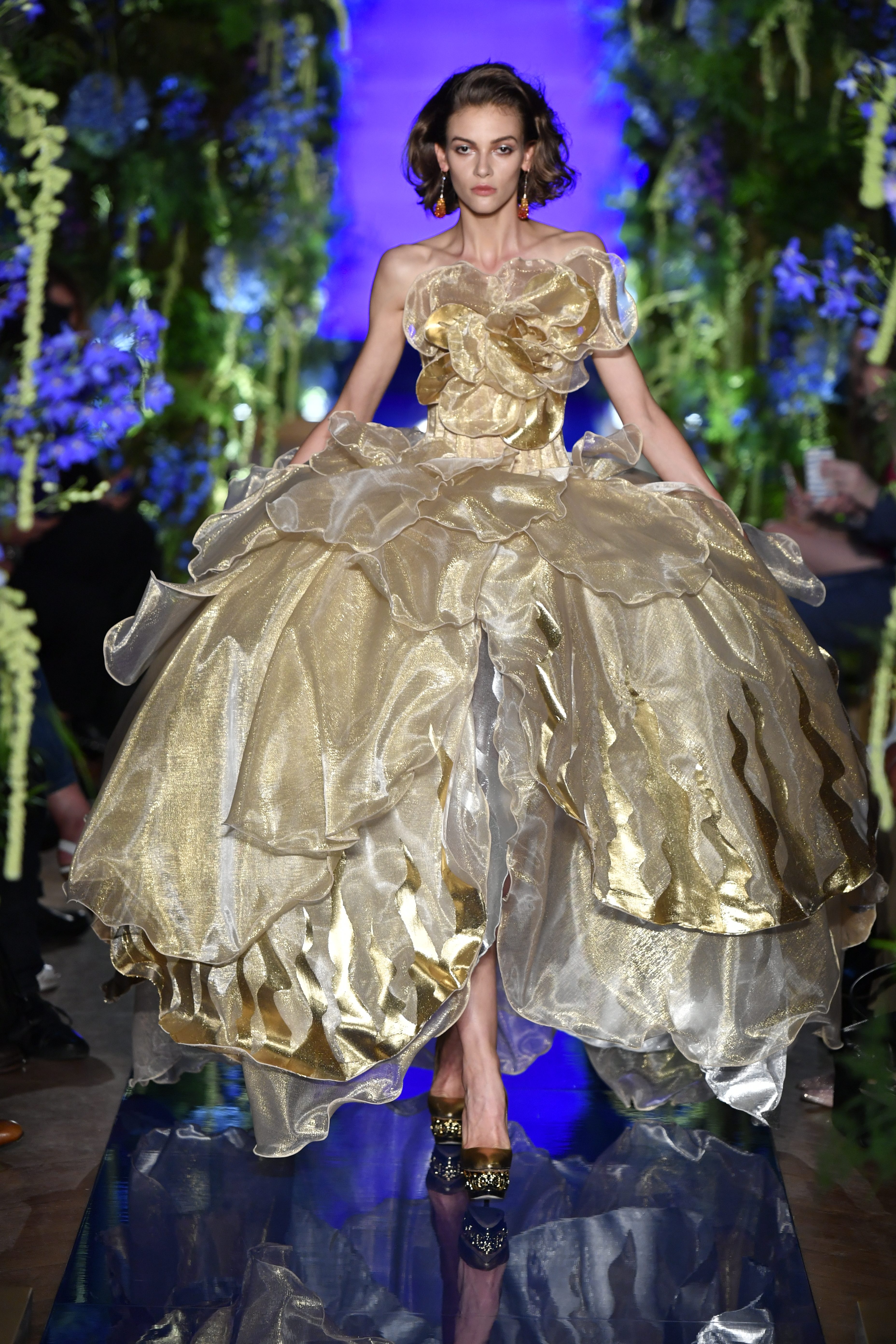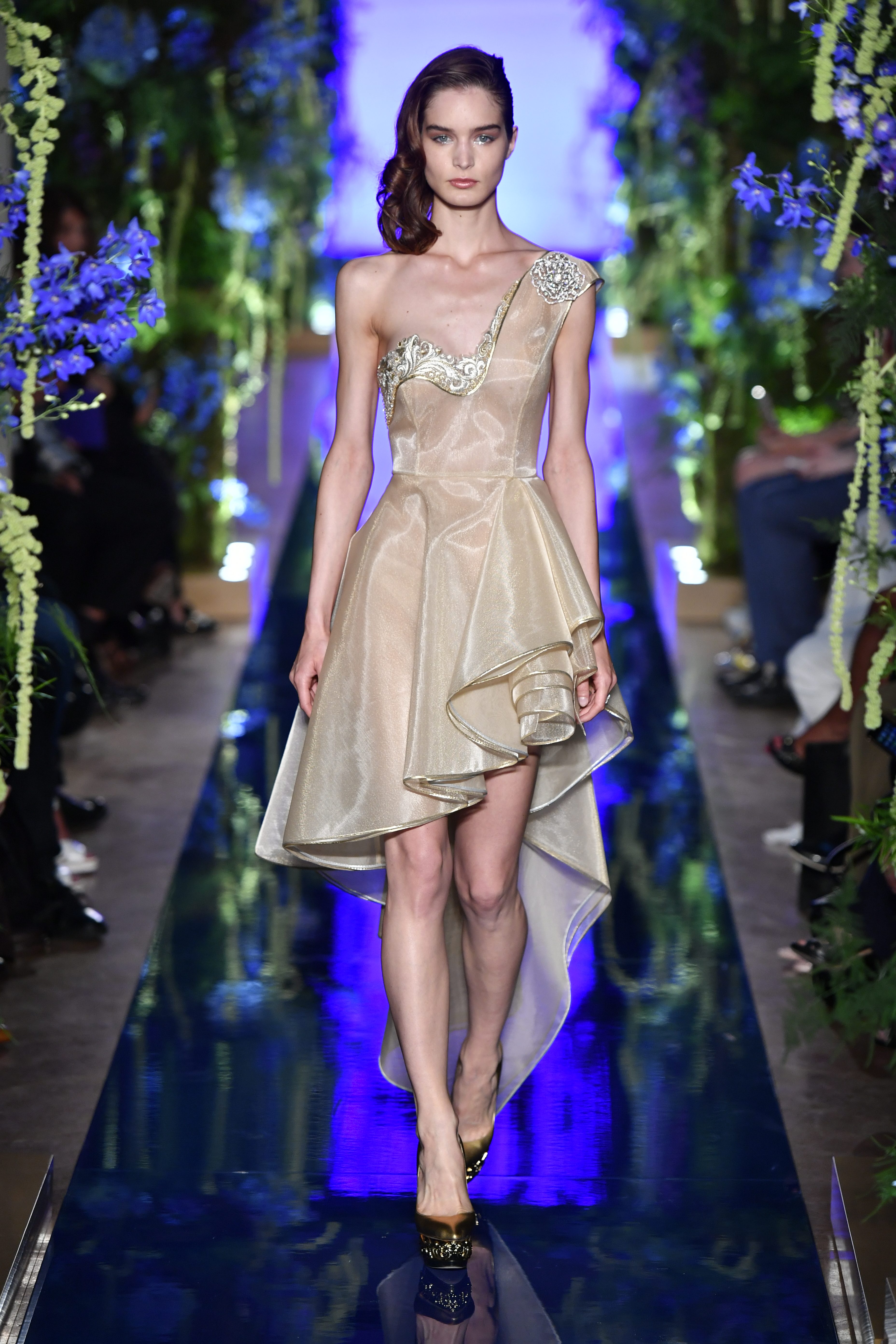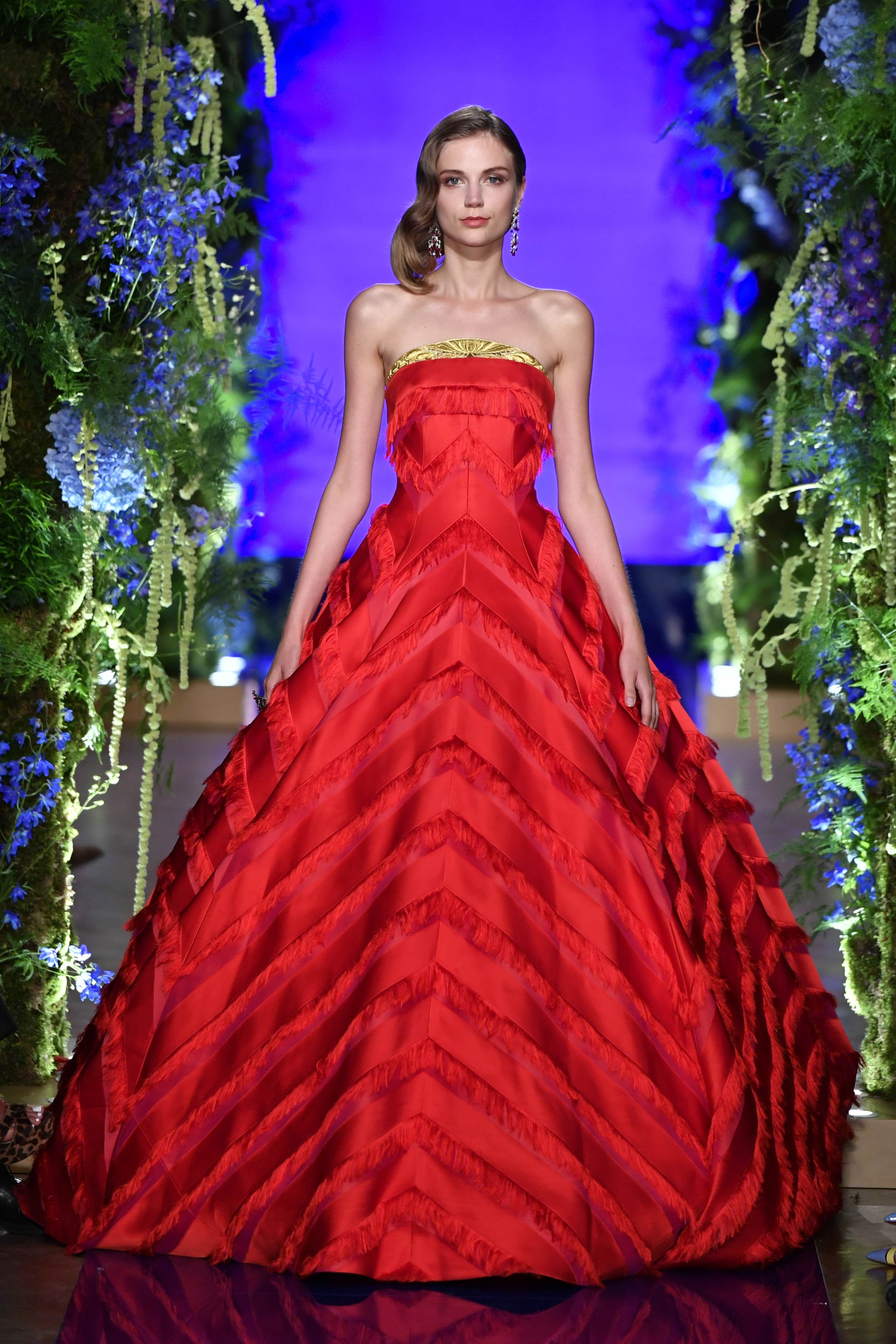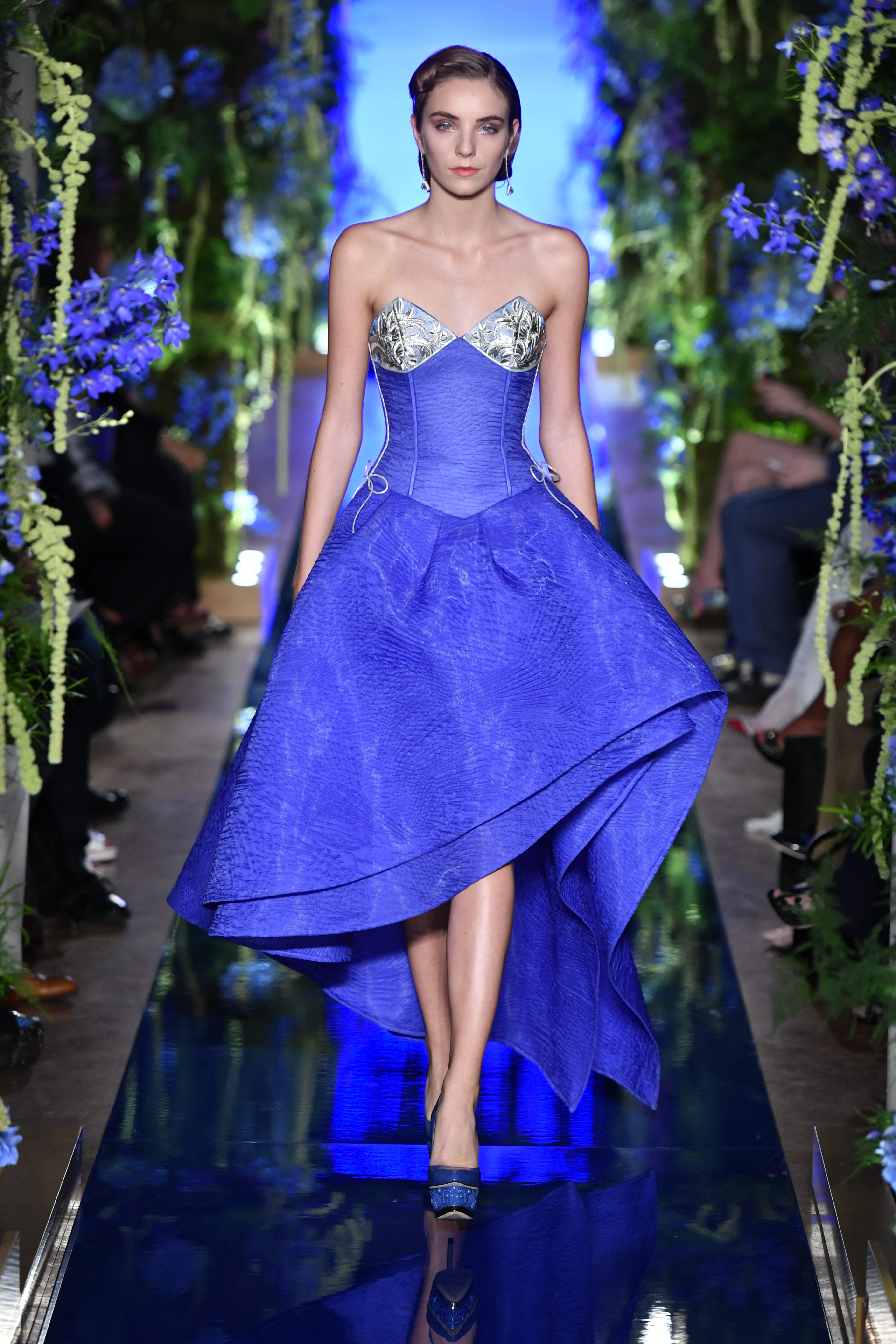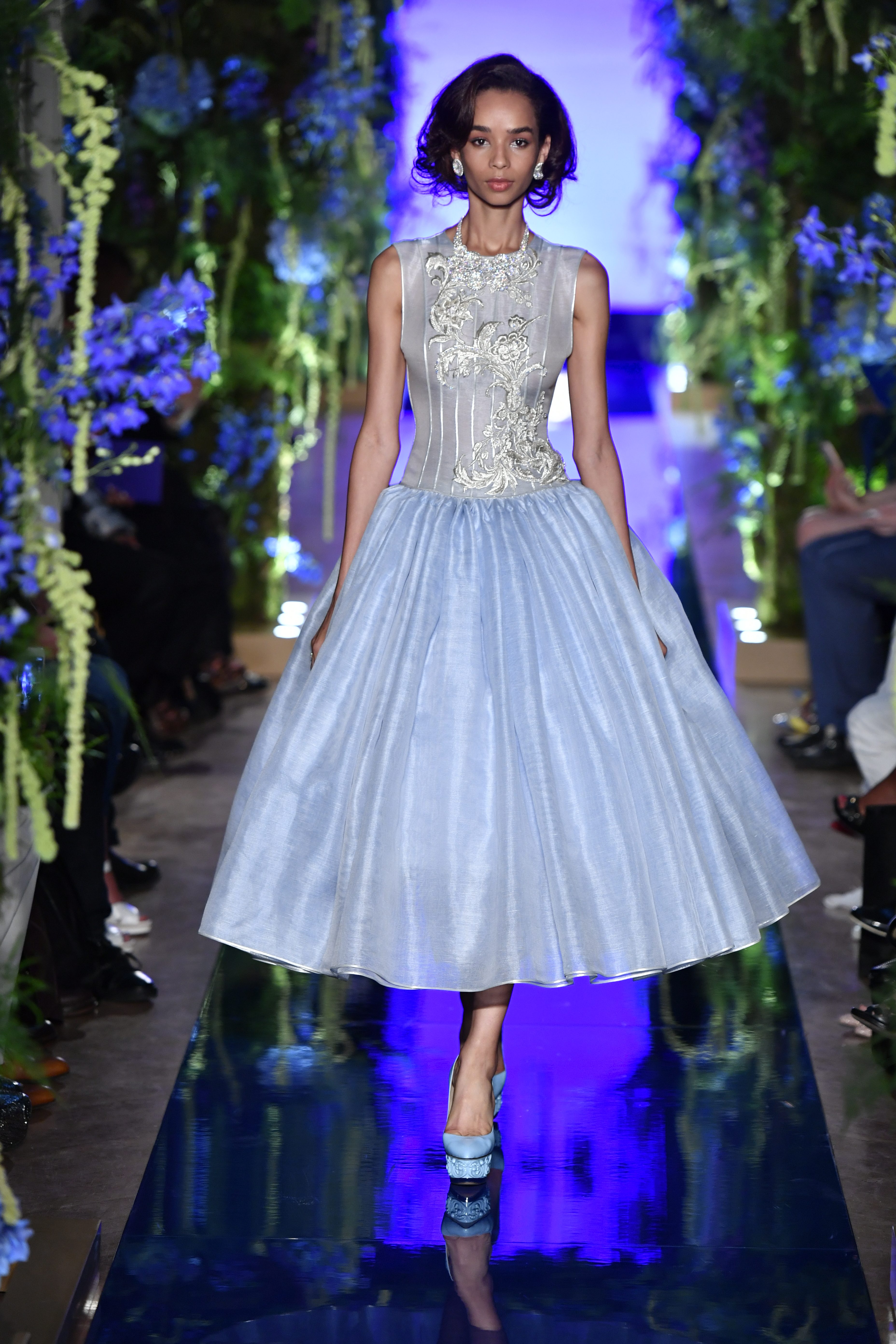 Guo Pei a sélectionné les matières les plus tendance et privilégié des lignes classiques aux tissus délicats pour sublimer la silhouette féminine. Brillance métallique texturée et couleurs moirées enrichissent l’esthétique de la collection. Cette saison, constructions complexes et superpositions donnent une impression d’illusion tout en mettant en valeur la fraîcheur des silhouettes.