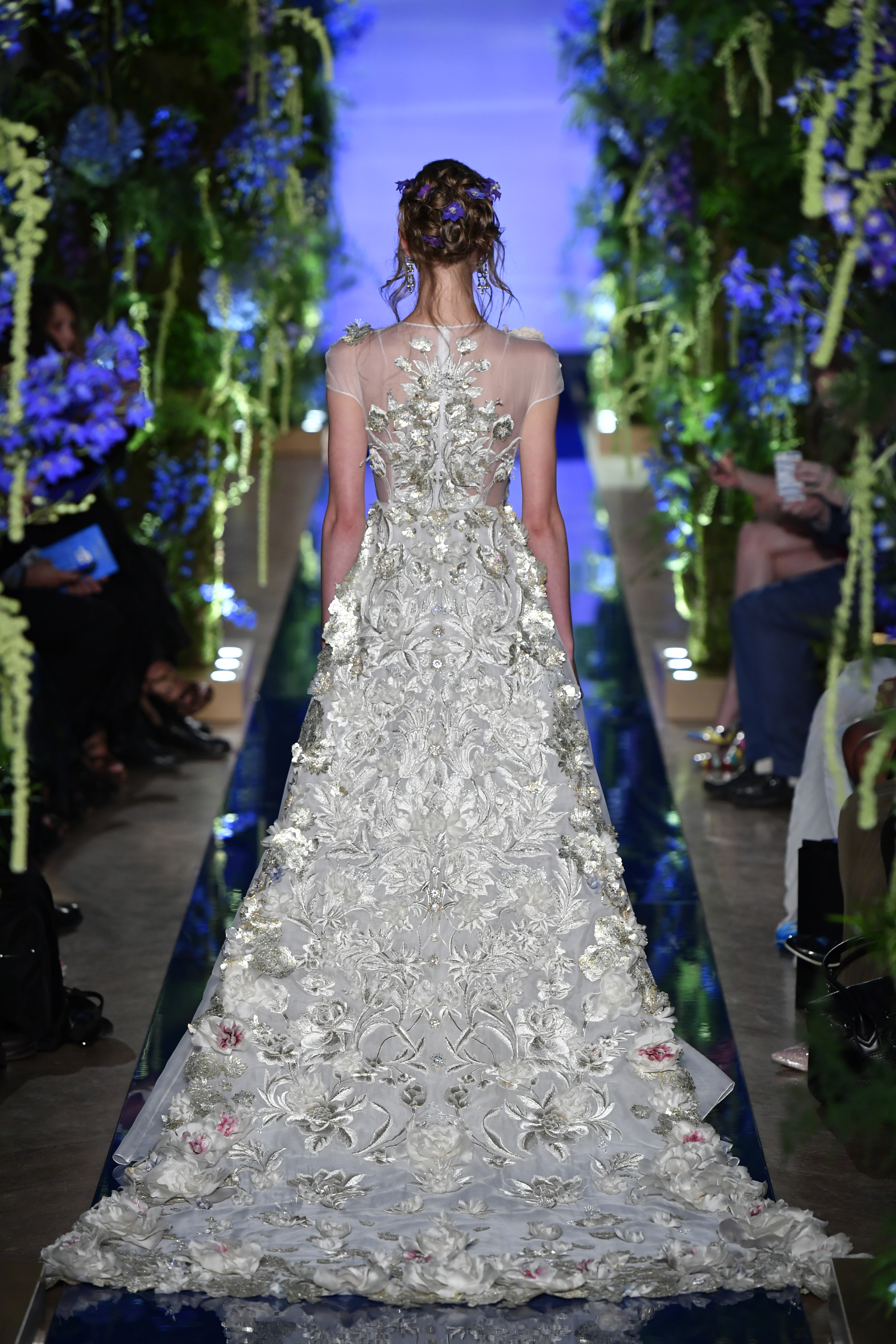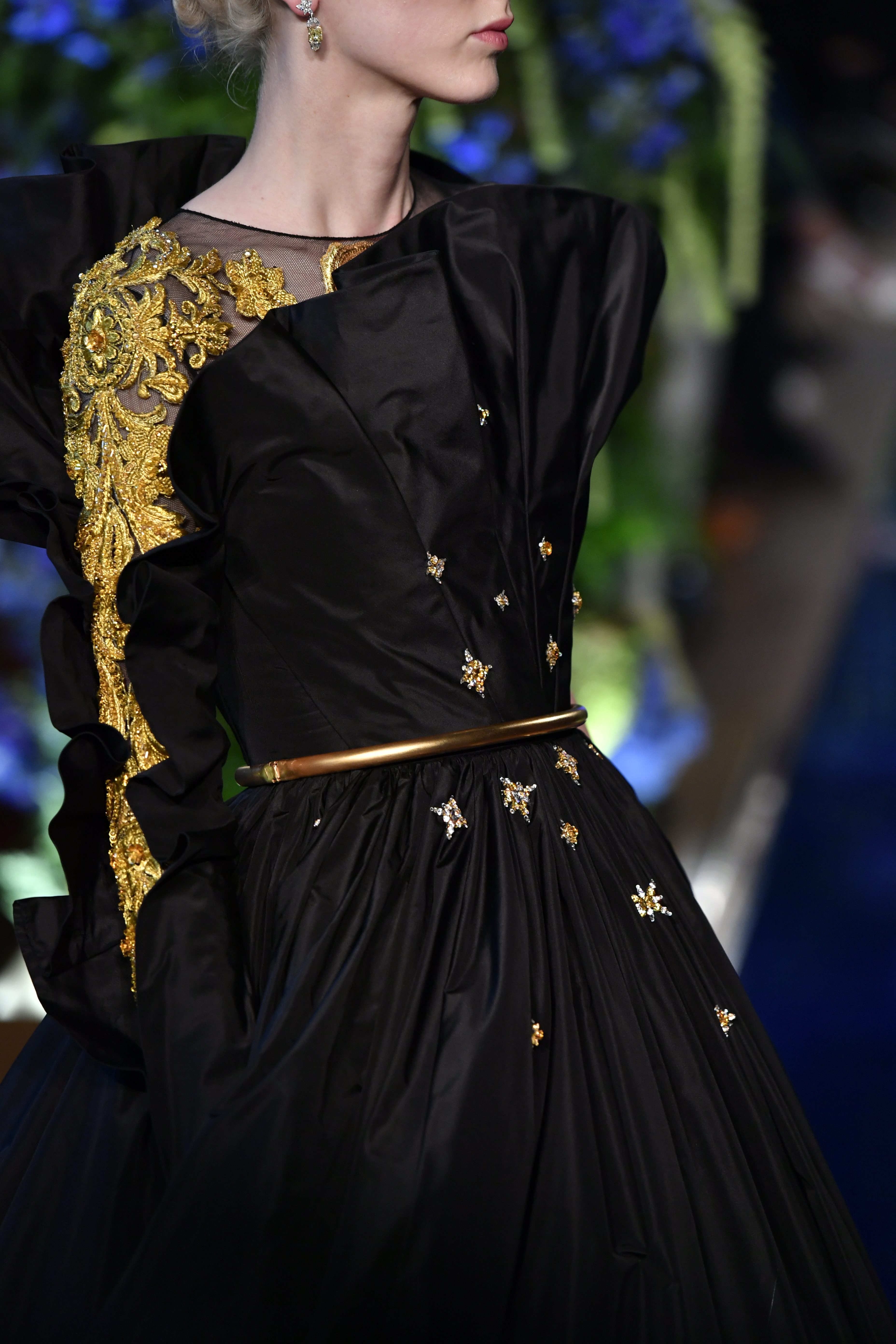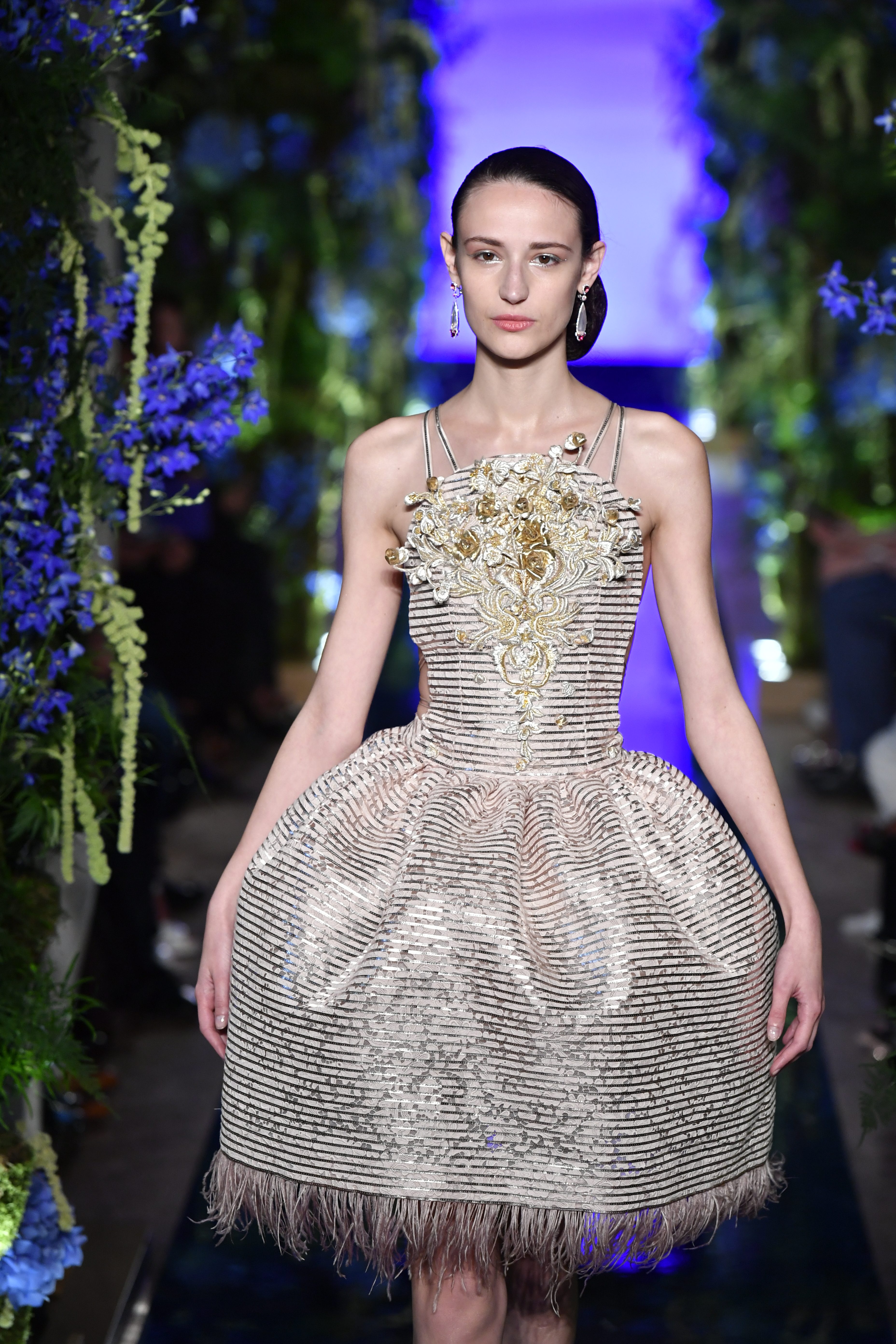 Broderies, perles et savoir-faire artisanal forment la signature de Guo Pei. Ses broderies en relief associées à des ornements délicats subliment l’aspect rythmé de la collection et lui donnent un charme féminin très vivant.