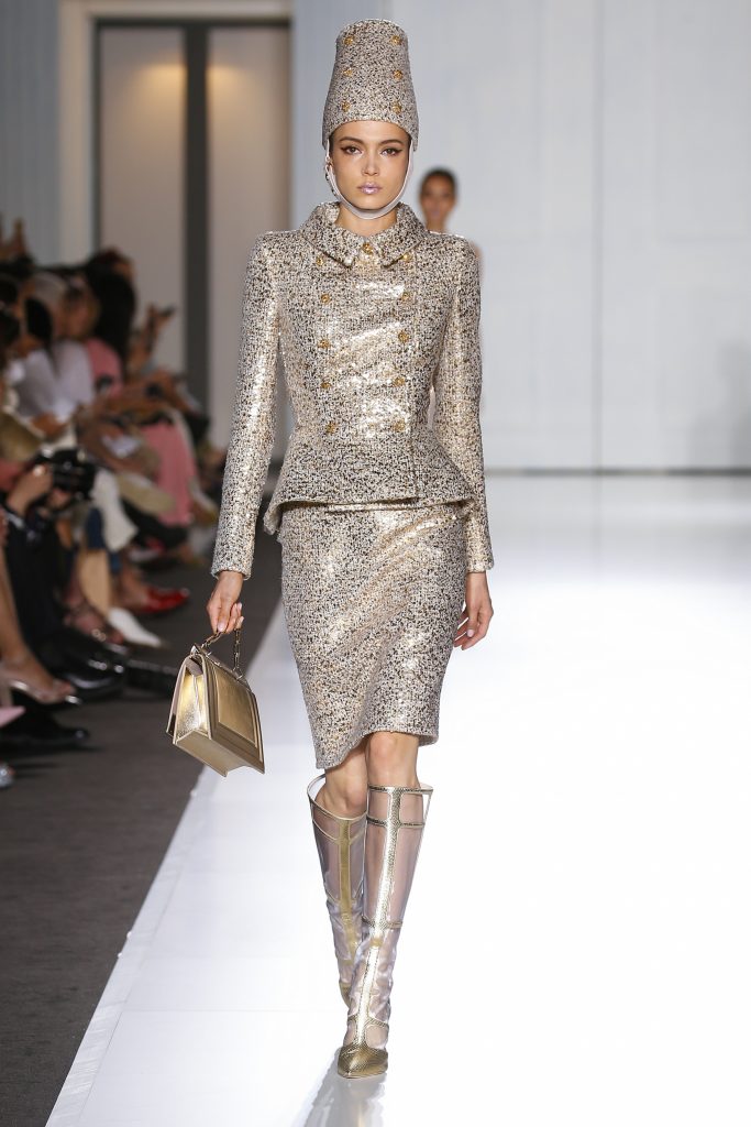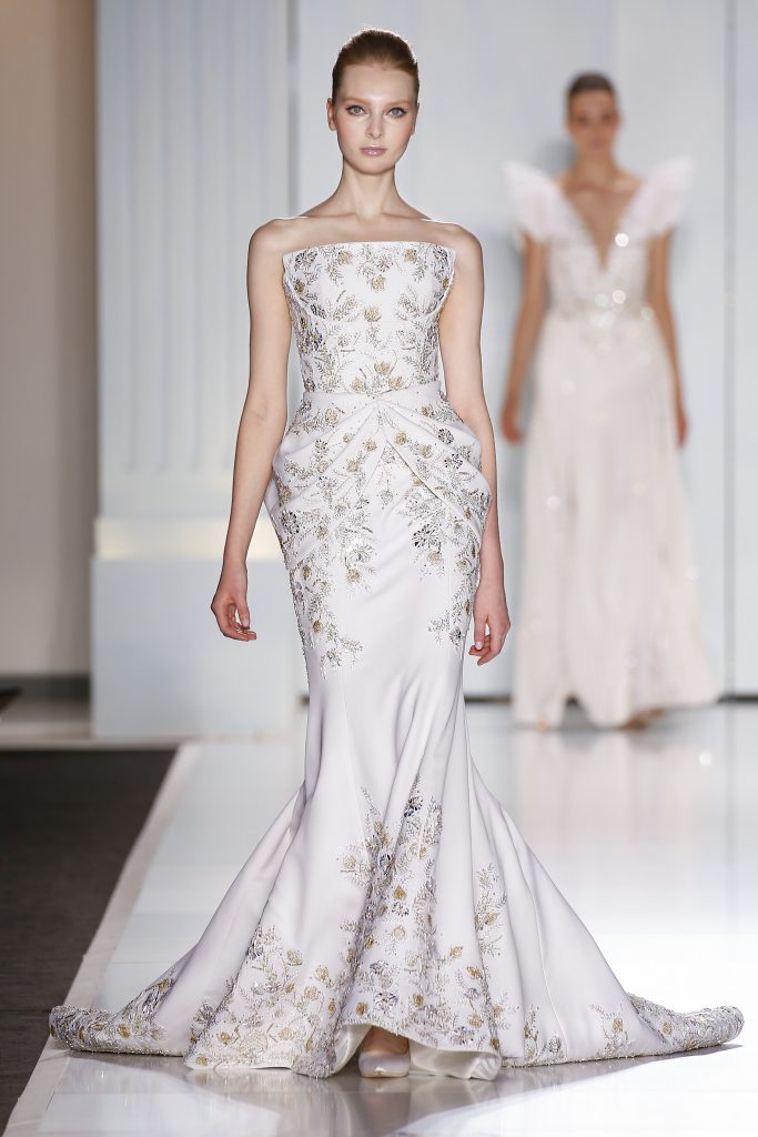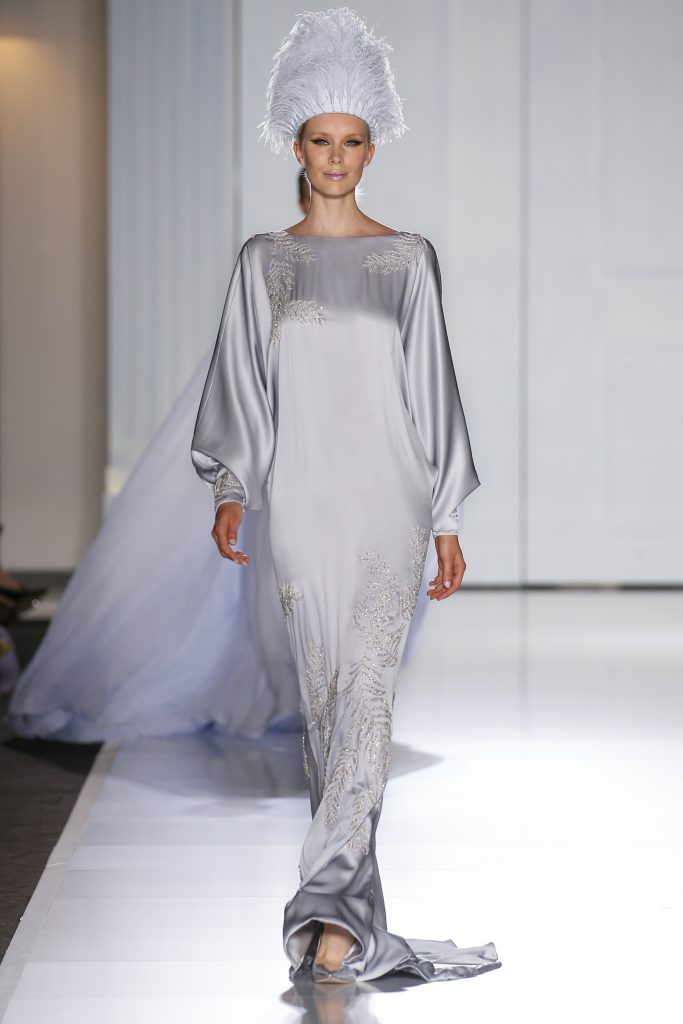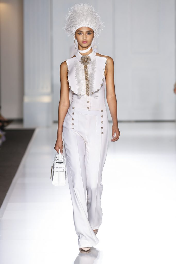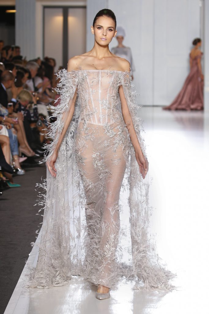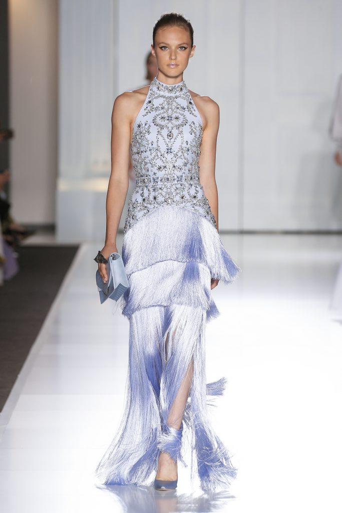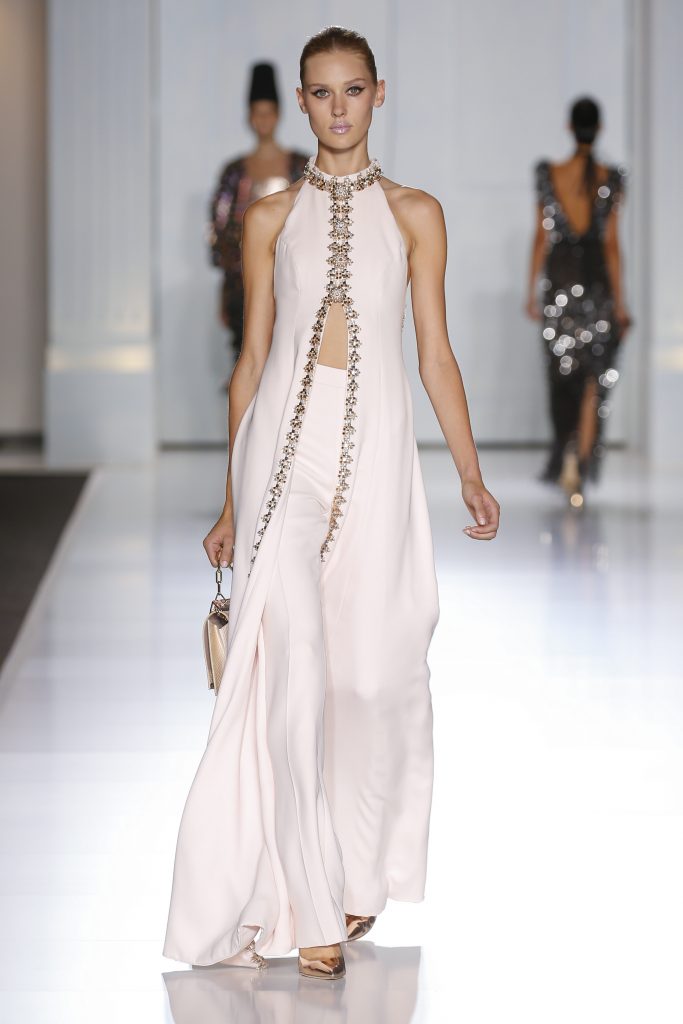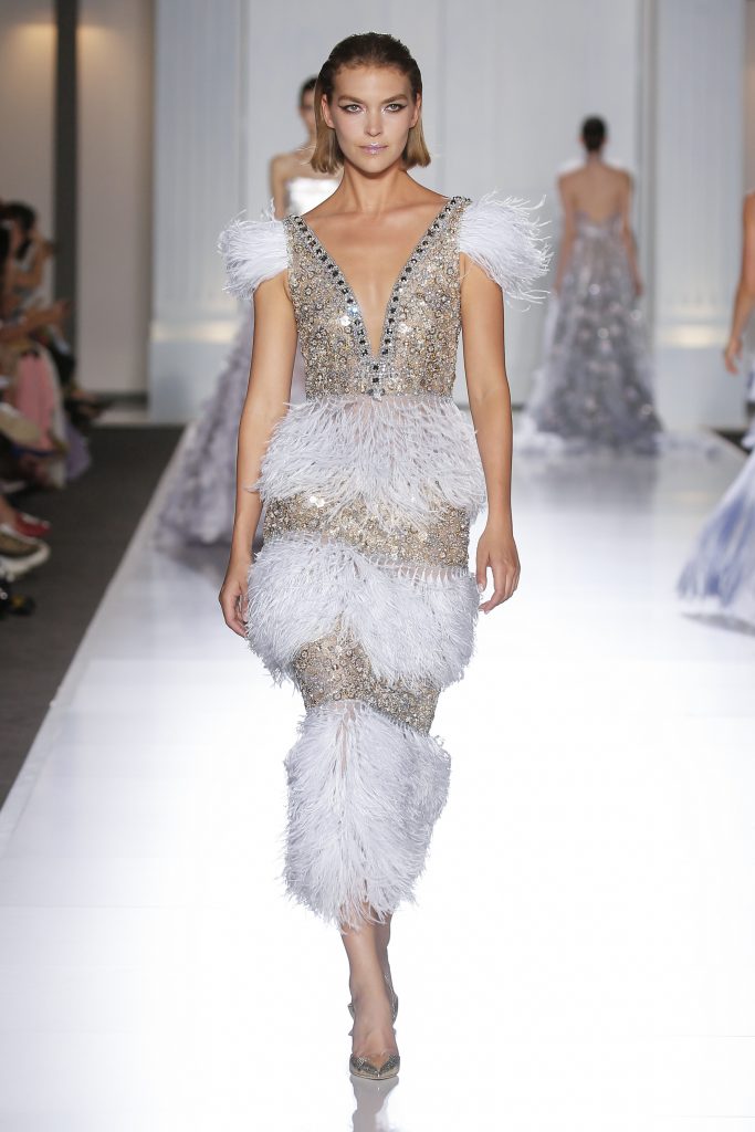 La broderie est cristallisée comme une photographie dans le temps, alors que le geste est capturé à travers le mouvement des plumes blanches tailladées, du drapage fluide, des traînes balayant le sol et des rubans de cote de mailles métalliques, ainsi que des complets aux pantalons à coupe évasée.