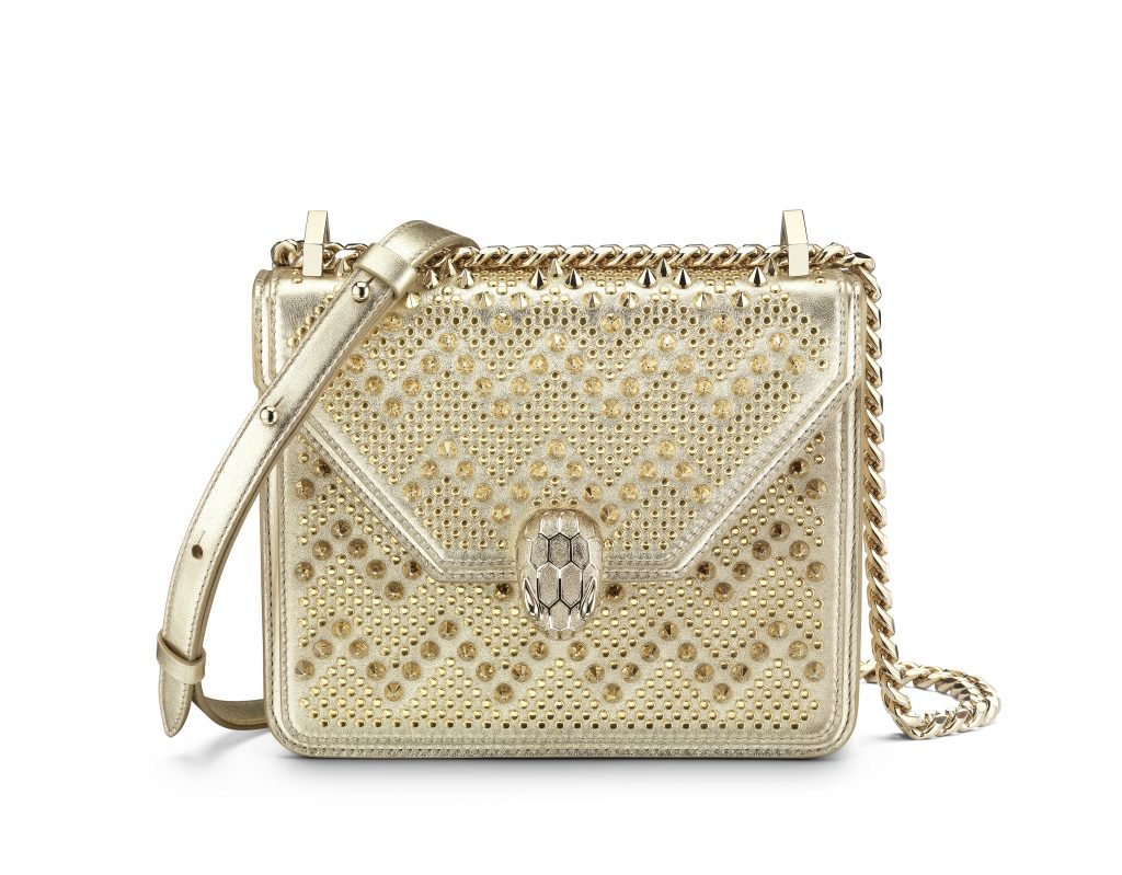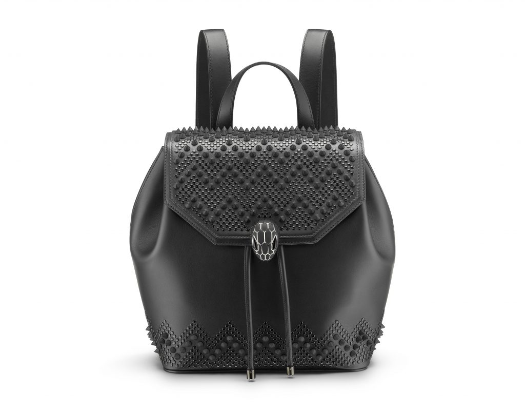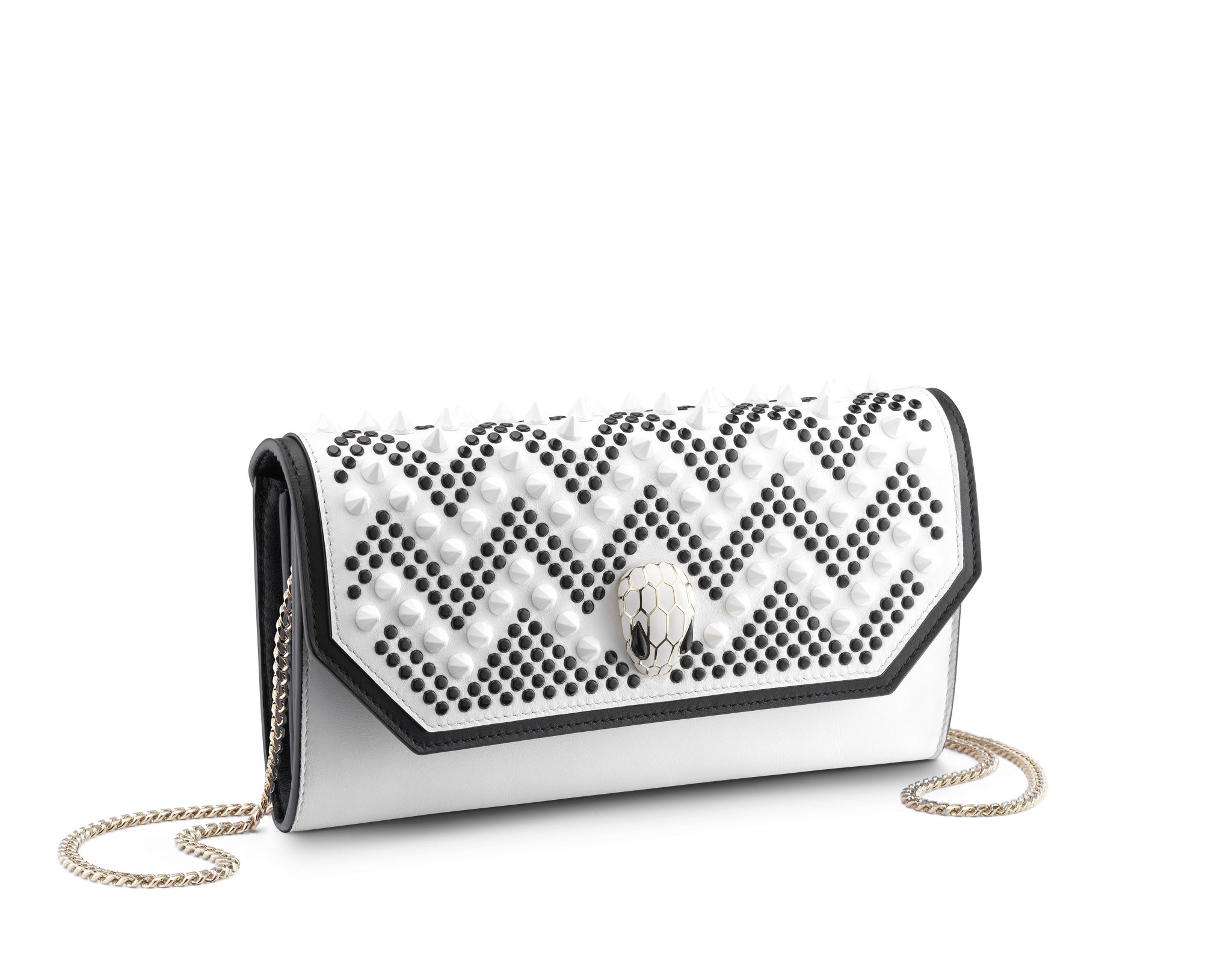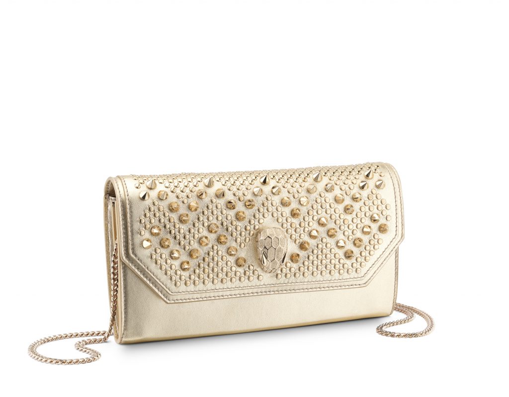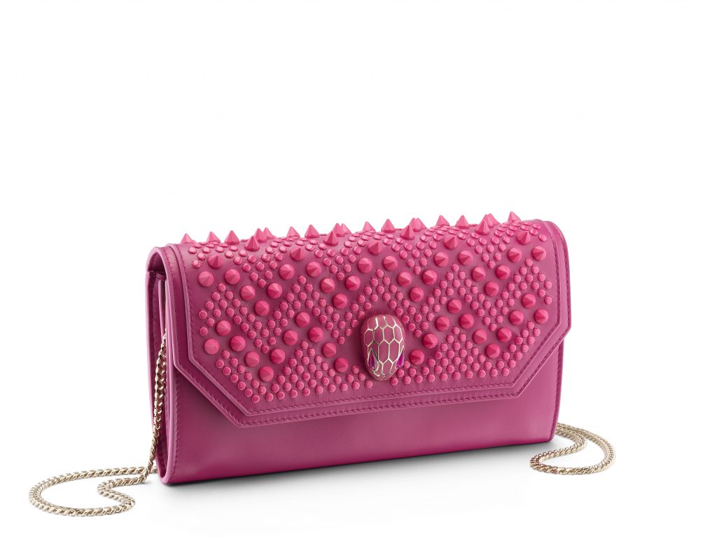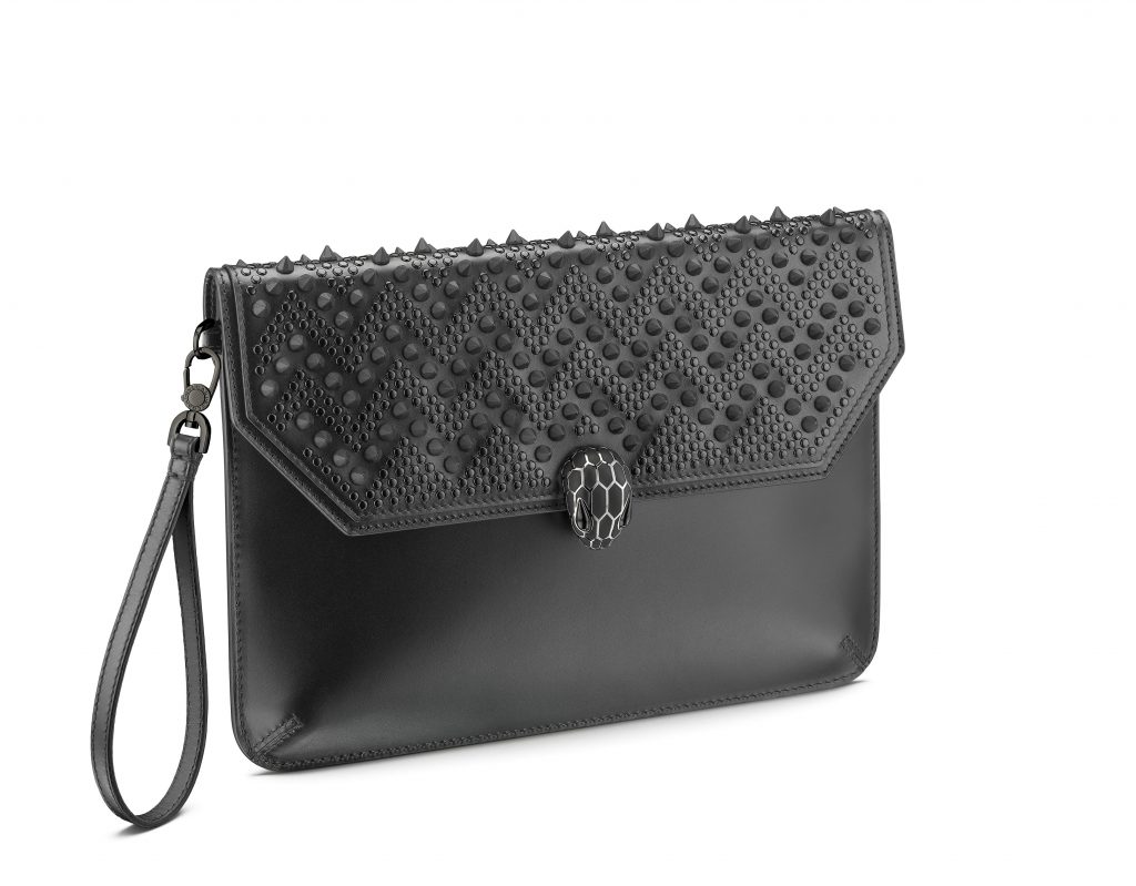 Le résultat est une collection capsule qui hypnotise par son très distinctif motif à chevrons cloutés. Des zigzags sinueux découpent le précieux cuir, évoquant les écailles graphiques et les mouvements souples du serpent, une icône Bulgari de longue date.