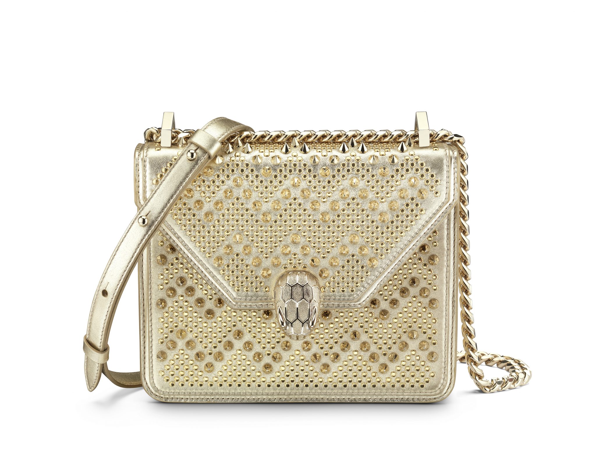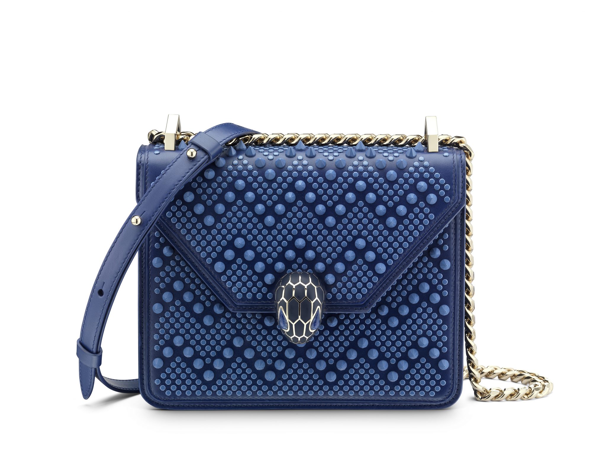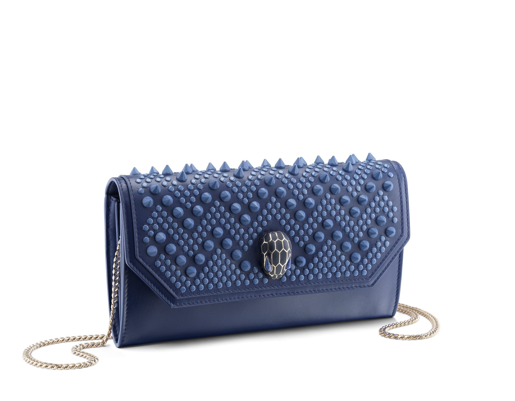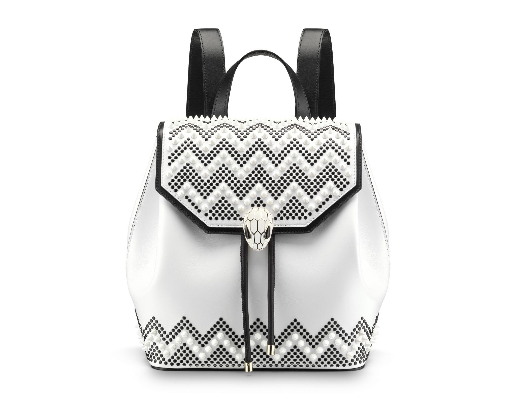 Le résultat est une collection capsule qui hypnotise par son très distinctif motif à chevrons cloutés. Des zigzags sinueux découpent le précieux cuir, évoquant les écailles graphiques et les mouvements souples du serpent, une icône Bulgari de longue date.