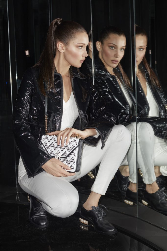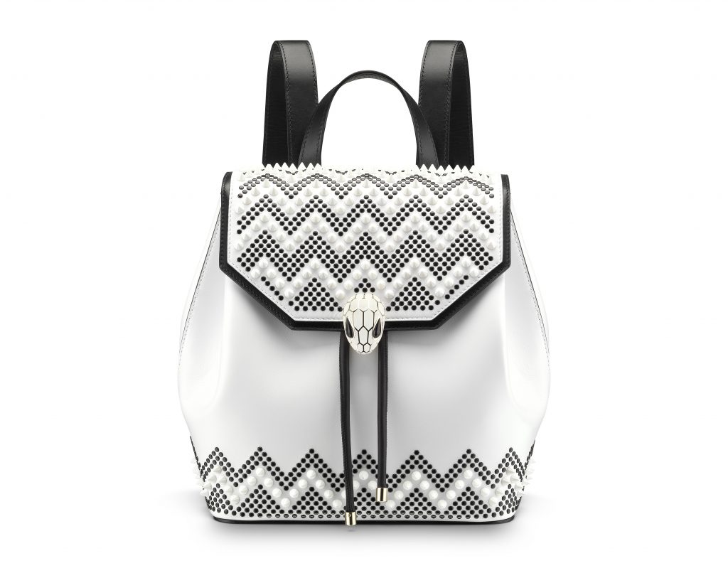 L’interprétation de Nicholas Kirkwood se retrouve sous la forme d’un motif à chevrons richement texturé, décrit par un mélange de clous vernis tantôt sous forme de boutons plats et ronds, tantôt dessinant des pyramides mattes. Donnant une nouvelle impulsion au fermoir à la tête de Serpent émaillé, avec une forme plus élégante et moderne, le motif de cette collaboration orne les sacs à dos et les sacs à main, qu’ils soient carrés ou rectangulaires. La palette de couleurs inspirée de pierres précieuses qui mélange noir et blanc, spinelle rose, saphir royal ou encore or souligne l’allure captivante et l’impression de trois dimensions de cette collection.