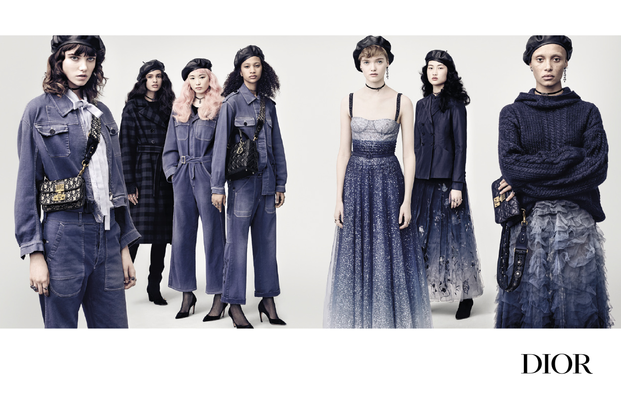 POUR PHOTOGRAPHIER CETTE COLLECTION TOUT EN NUANCES DE BLEU, LA DIRECTRICE ARTISTIQUE MARIA GRAZIA CHIURI A, UNE NOUVELLE FOIS, FAIT APPEL À LA FRANÇAISE BRIGITTE LACOMBE.LE REGARD DÉTERMINÉ, LES BRAS CROISÉS OU LES MAINS DANS LES POCHES, LES NEUF MANNEQUINS N’ONT RIEN PERDU DE LEUR ATTITUDE ASSURÉE DEPUIS LE DÉFILÉ PRÊT-À-PORTER AUTOMNE-HIVER 2017-2018. PARMI ELLES : RUTH BELL, DÉJÀ CHOISIE PAR MARIA GRAZIA CHIURI POUR INCARNER LES CRÉATIONS DE SA PREMIÈRE COLLECTION POUR DIOR, FERNANDA LY ET SA CHEVELURE ROSE, OU ENCORE ADWOA ABOAH, UNE FÉMINISTE ENGAGÉE COMME AIME LES METTRE EN AVANT LA DIRECTRICE ARTISTIQUE. DEVANT L’OBJECTIF DE BRIGITTE LACOMBE, ELLES COMPOSENT DES BANDES DE FILLES AU STYLE AFFIRMÉ. TOUTES SONT DOTÉES D’UN CARACTÈRE UNIQUE ET DESSINENT ENSEMBLE UNE FEMME DIOR AUDACIEUSE. À LA FOIS UNIES ET PLURIELLES, ELLES INCARNENT IDÉALEMENT LE BLEU DES CRÉATIONS, UNE COULEUR RICHE EN SYMBOLES ET SIGNIFICATIONS, QUI JOUE LES CONTRASTES ENTRE L’ESPRIT WORKWEAR DES TOILES EN DENIM ET LA NOBLESSE DU VELOURS BLEU ROI.
