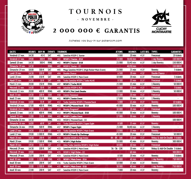 Du jamais vu à Paris : 2 000 000 € garantis, repartis sur 24 jours de tournois ! Un programme d’une densité et d’une diversité jamais vus : 2017 sera à marquer d’une pierre blanche dans les annales du poker français !