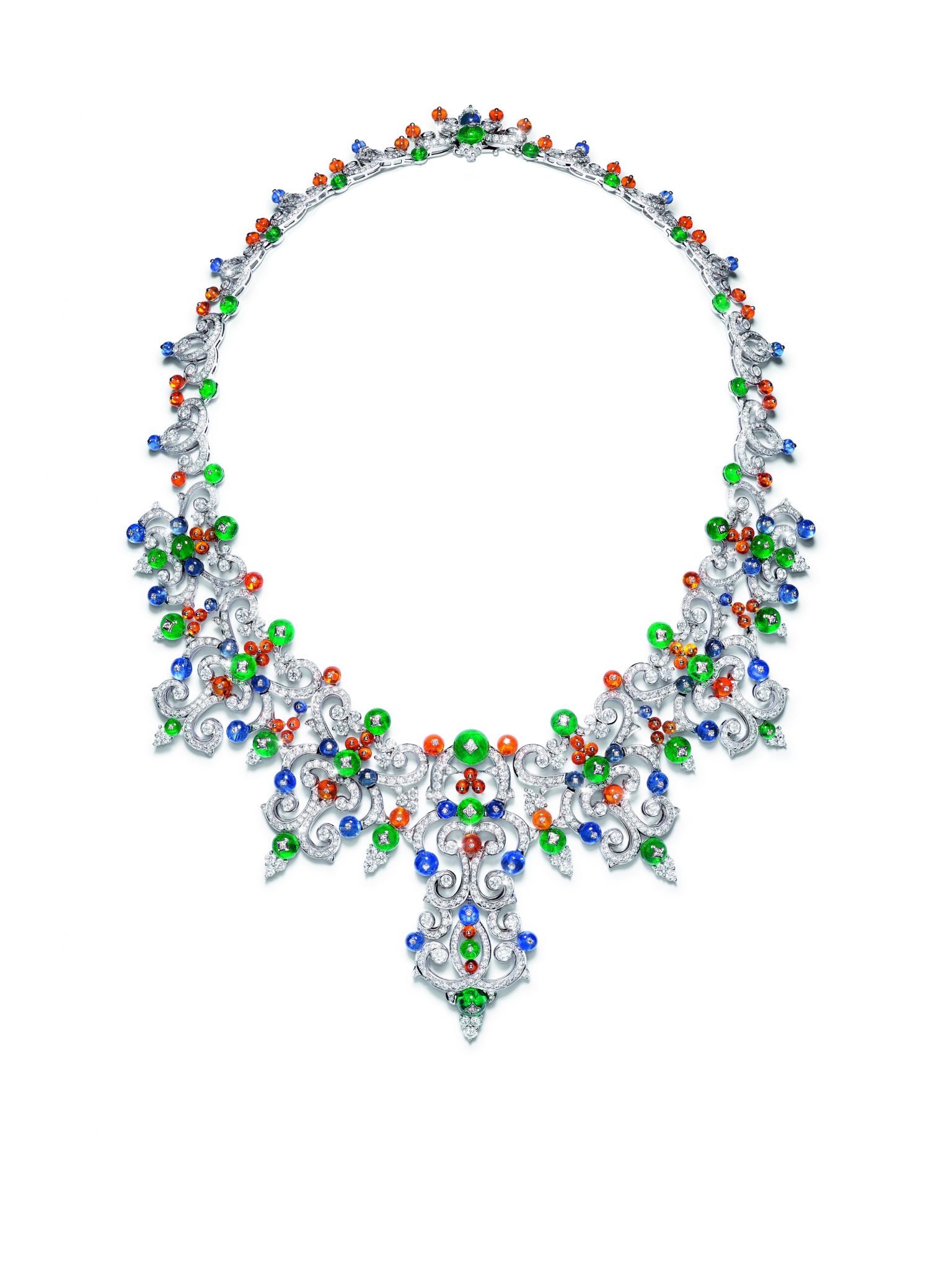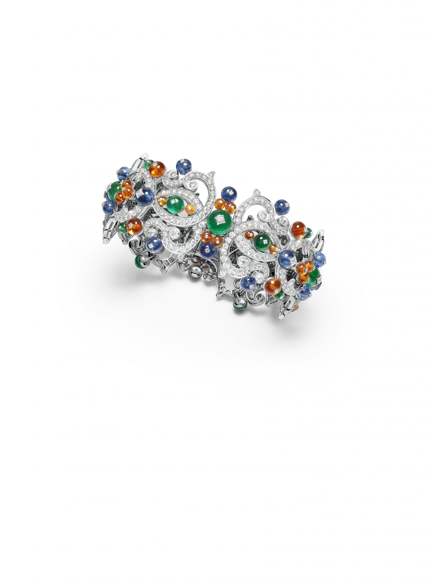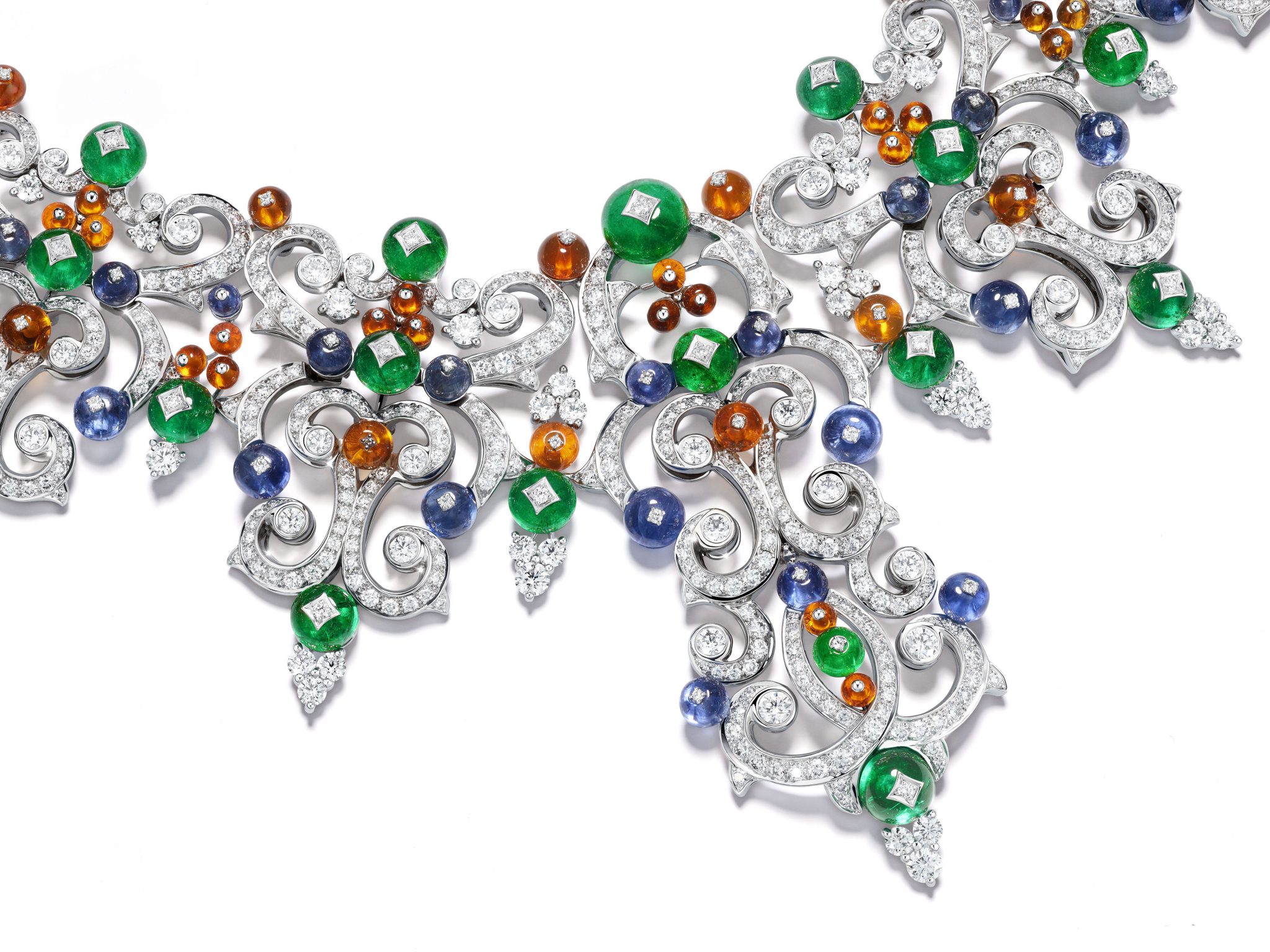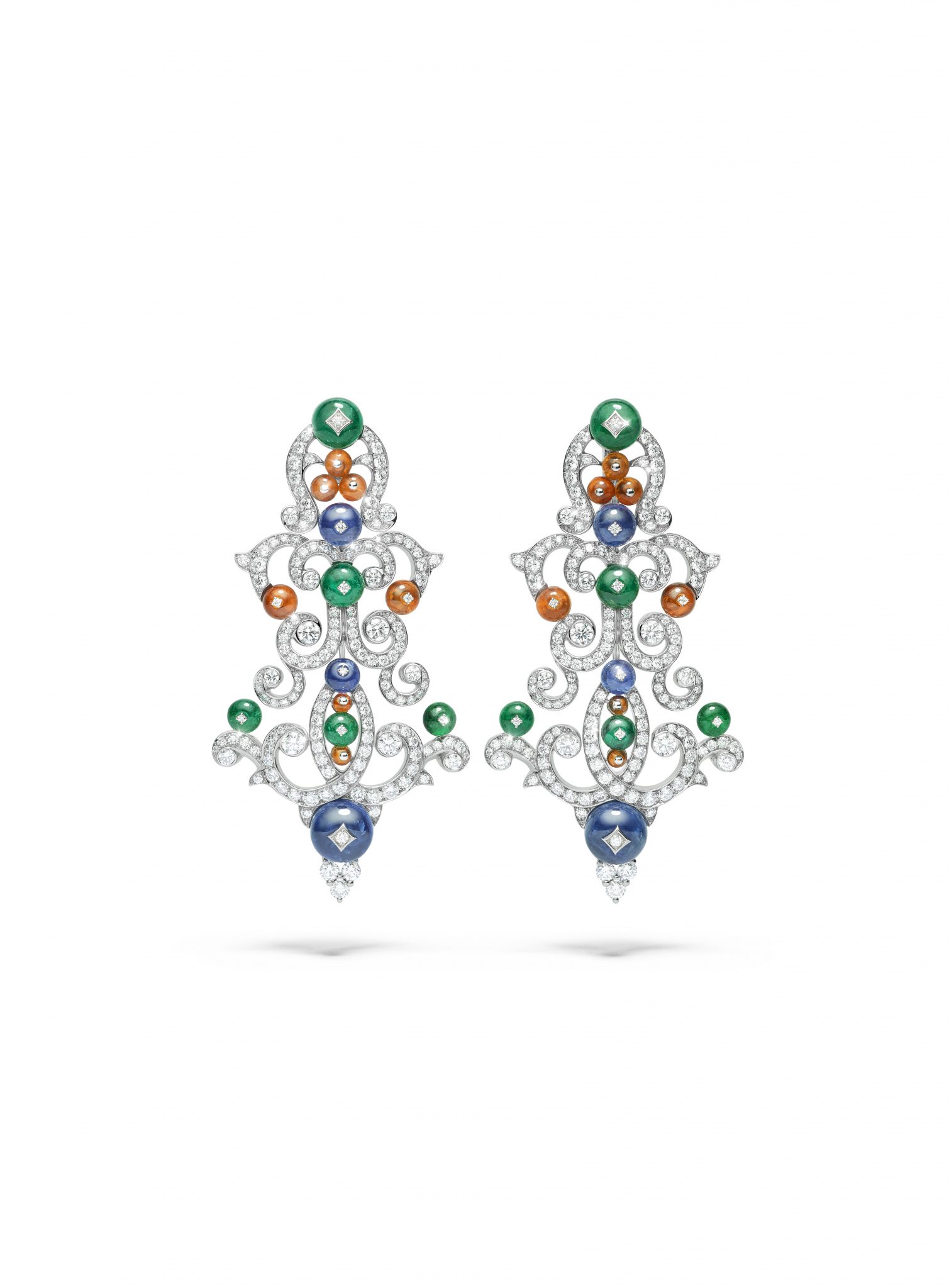 Associées à l’orange vif de l’opale de feu, les perles de saphirs et d’émeraudes forment des motifs floraux qui exaltent les tons vert et bleu intense des pierres précieuses.