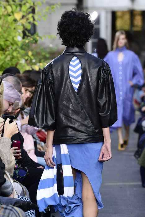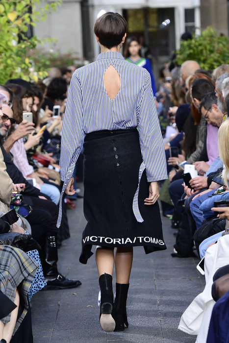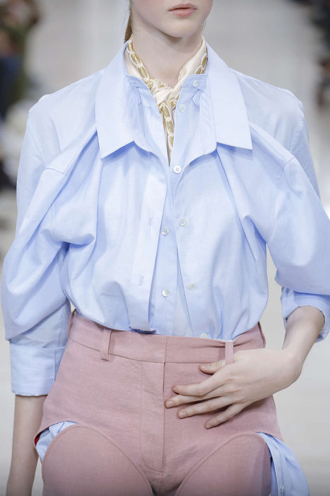 Des découpes pleine de vigueur et de rigueur : l’amour se joue recto/ verso. D’un côté Victoria et de l’autre Tomas : ce défilés c’est un peu leur propre histoire. Une histoire d’amour connu de tous : celle de la belle et du bad boy. Des Bonnie And Clyde des temps modernes, qui dérobe à la mode ses pièces les plus classiques (comme le trench et la chemises) et ses imprimés de bases ( rayures bleu) pour les décliner selon leur propre chanson. Premier défilé  remarqué pour le jeune duo