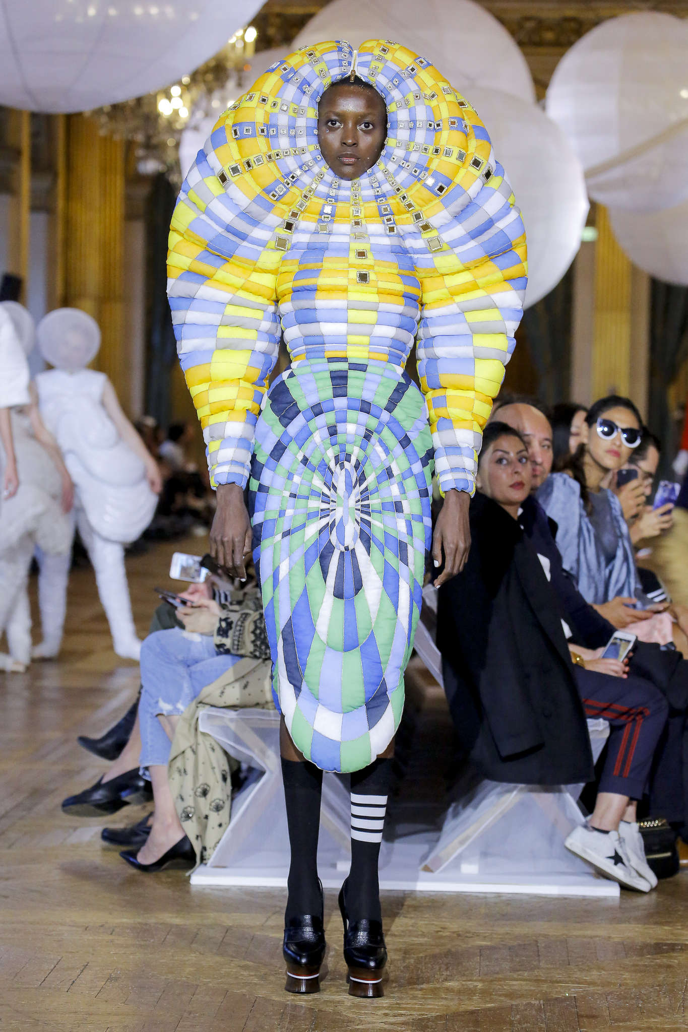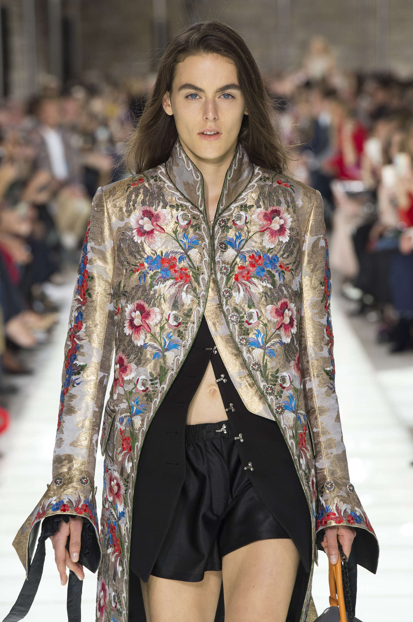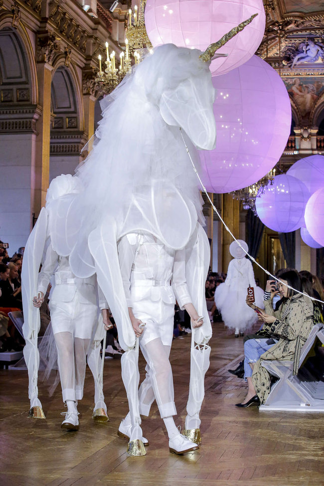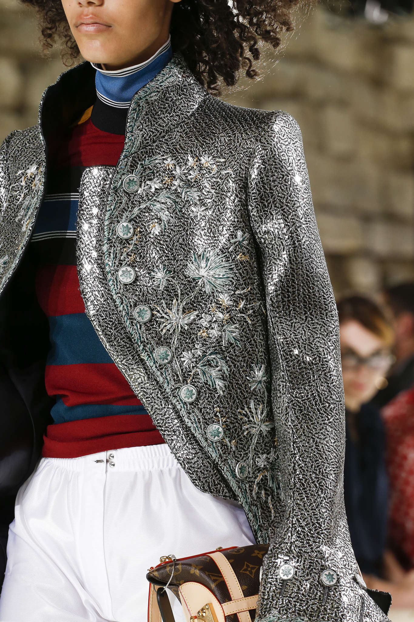Opulence extravagance et surenchère dans l’art de la mise en scène : un Grand Palais transformé en Gorge du Verdon, des licornes géantes dans l’Hôtel de Ville, des vestes Rococo dans le Pavillon de l’horloge du Louvre, ou des Rollers Girls et Mannequins félins qui font leurs toilettes. La mise en scène prend le pas sur le vêtement pour cette dernière journée. Éblouit, il est facile d’aveugler, surtout après 8 jours, plus de 50 défilés, 120 posts Instagram et 2300 gorgés de champagnes. Les critiques, acheteurs et visiteurs sont égarés comme un spectateur après son premier Fellini. Renouer avec les signes de la richesse : les accessoires ne sont pas ostentatoires mais nécessaires. Perles et broderies girly chez Miu Miu et bracelets oversizes chez Chanel. Multiplication des broderies et paillettes sur les redingotes du défilé Louis Vuitton. Portées avec des shorts de joggings, c’est un peu la rencontre entre le vestiaire du roi Soleil et celui de Sarkozy. Méga-roi, et Méga-président :  tout le monde note l’absence de Mme Macron. Pas très Sportwear XVIII ? Voyage dans le temps mais également dans les cultures avec Miu Miu et Agnès B.