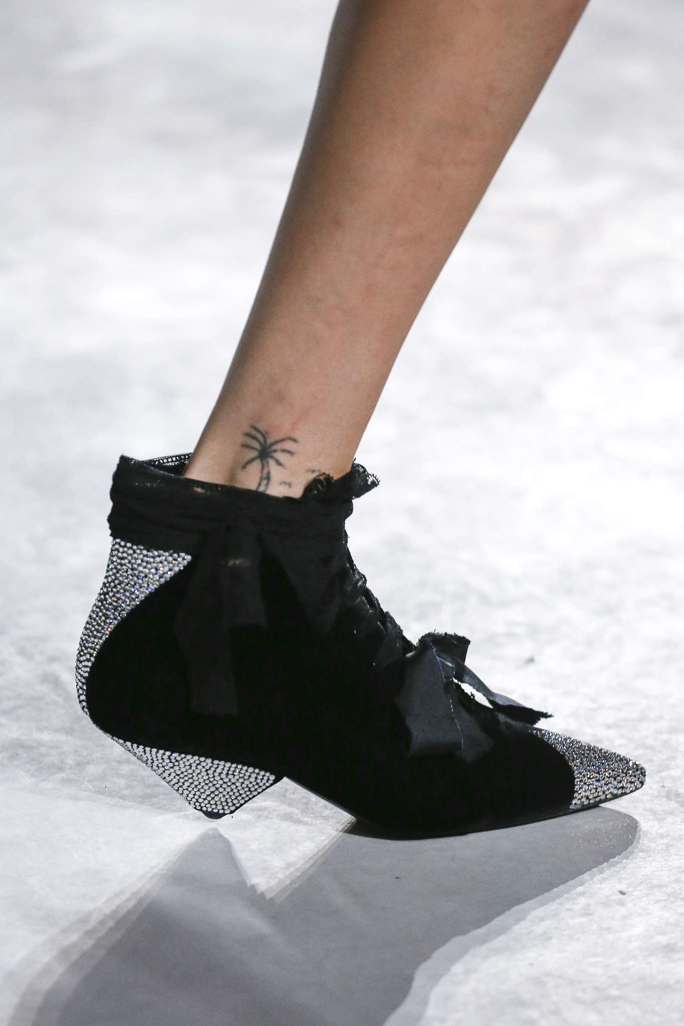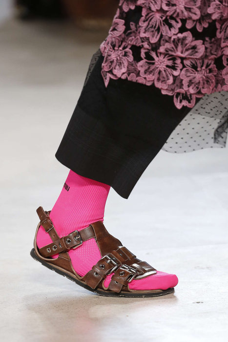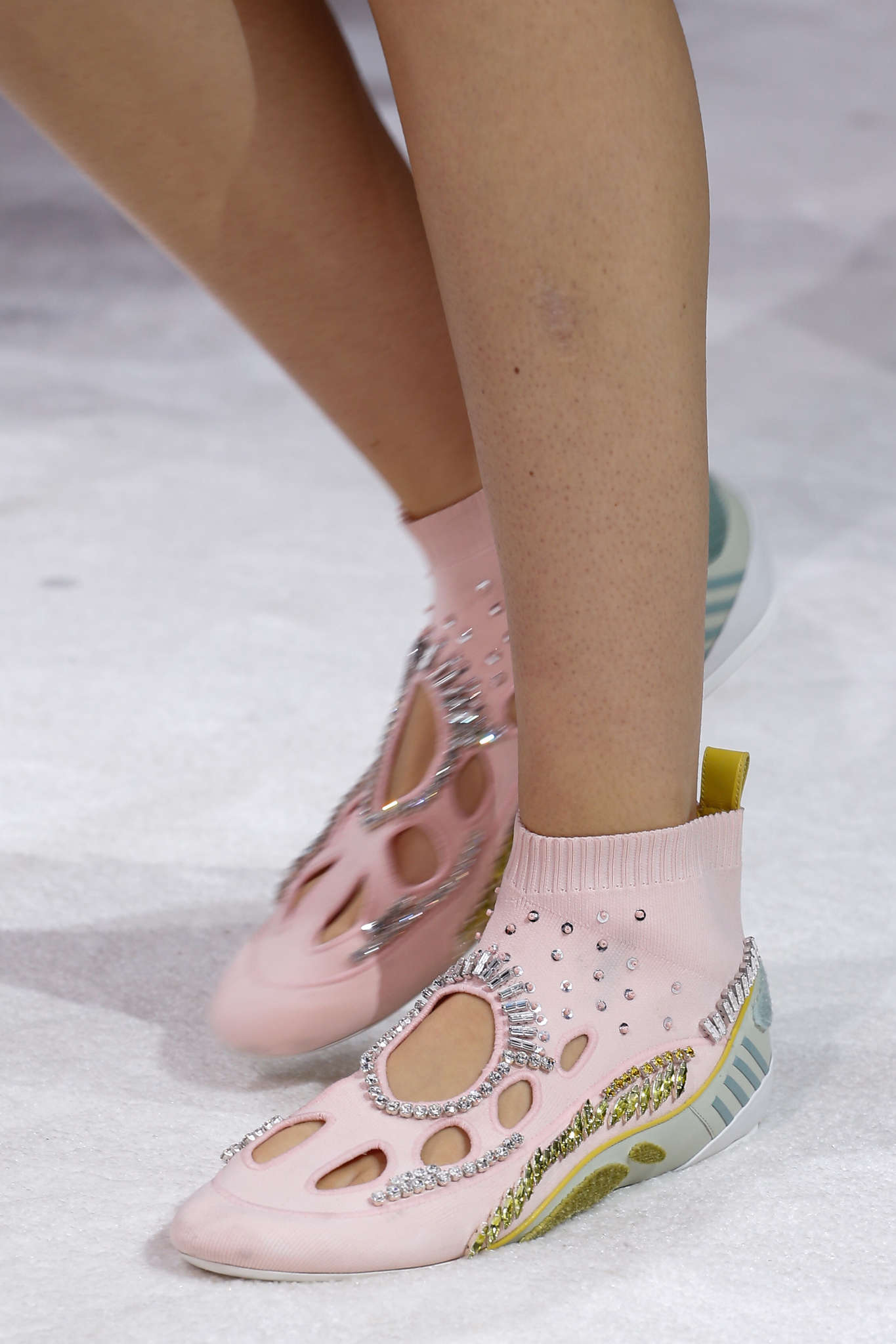 Strass, satin et noeud: des modèles forgés pour rêver. Portés avec des chaussettes de sport chez Miu Miu : une combinaison pleine d’audace et d’humour.