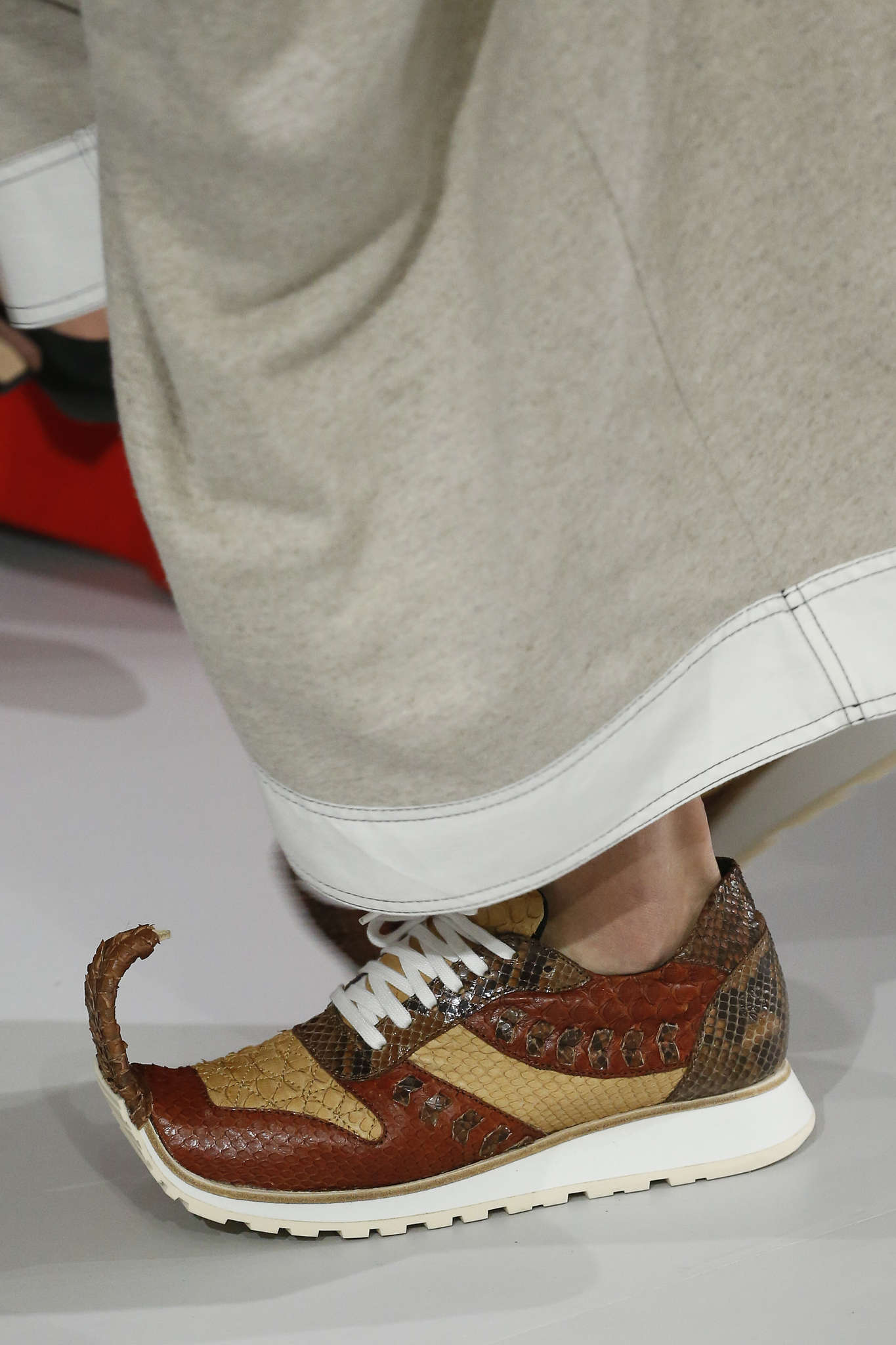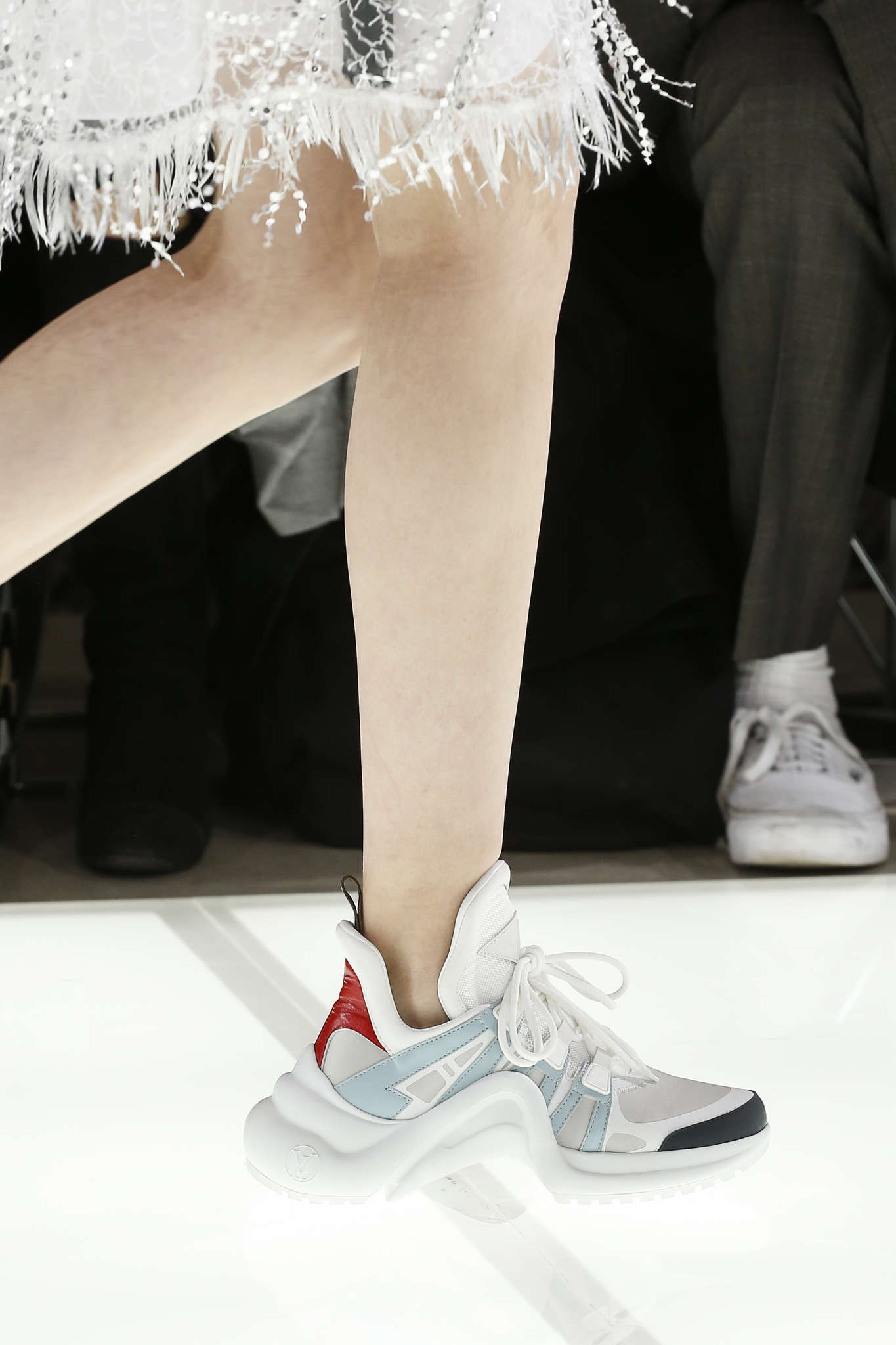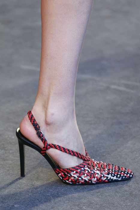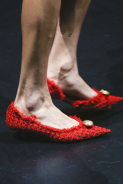 Quelques pointes de bleu Klein ( Yves, pas Calvin), les chaussures sont plates ou dotées d’un kitty heels.Pointues de préférence. Hauteur des bottes : mi-mollet, transparentes ou pleines de franches. Il faudra nouer : cordages, rubans, ou lacets. Oui la sneakers est toujours d’actualité. Elle se porte avec des robes du soirs chez Valentino et des redingotes chez Louis Vuitton : les millénialles se sont fait dérober par la bourgeoisie leurs joujoux.