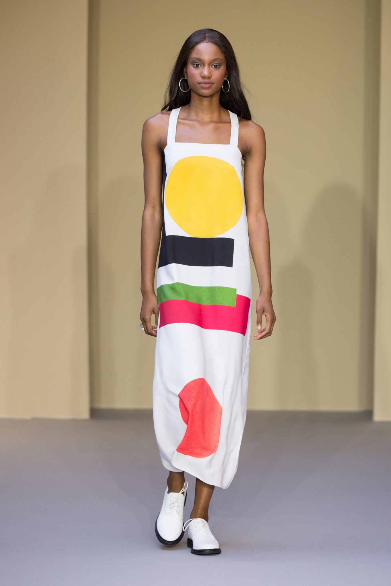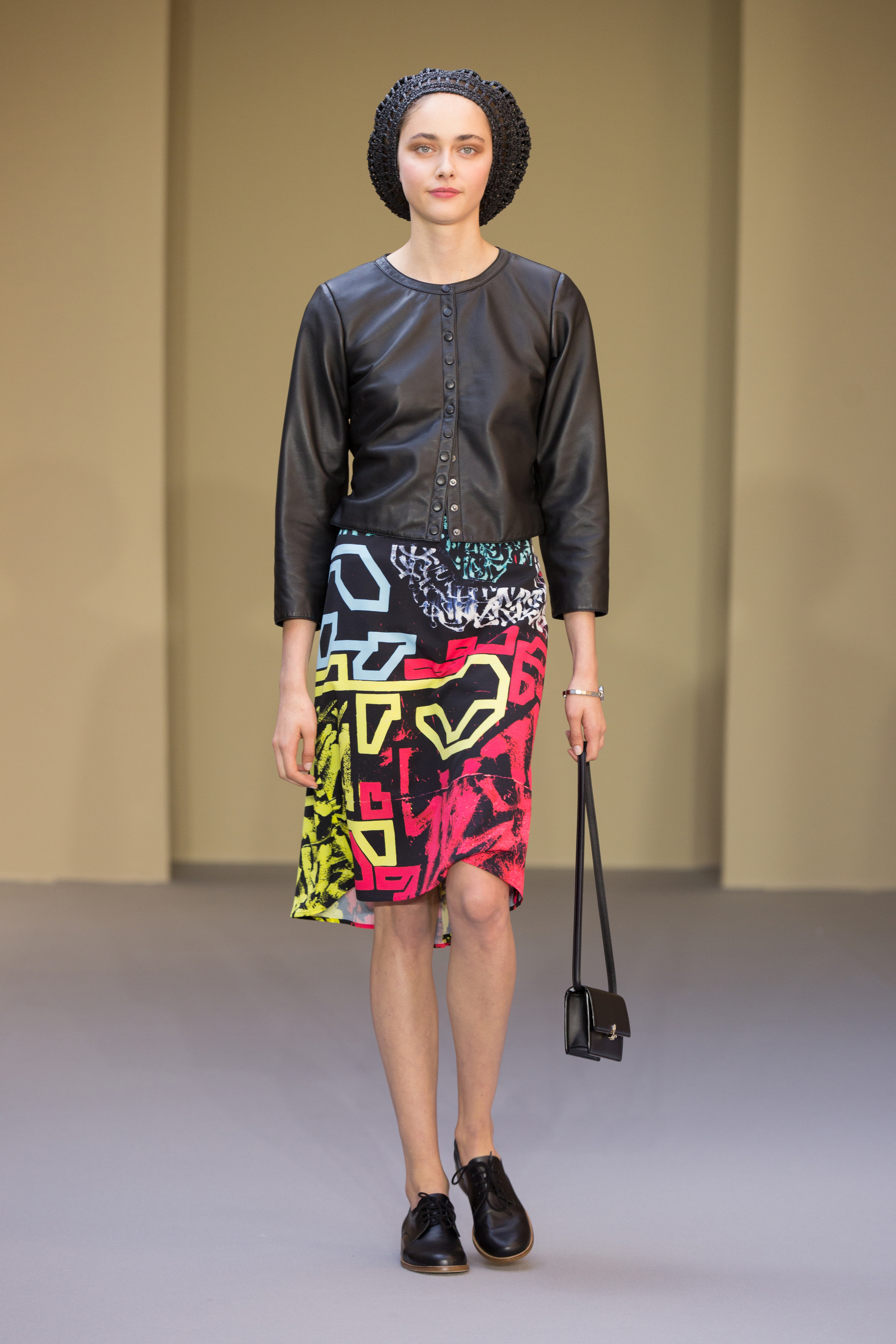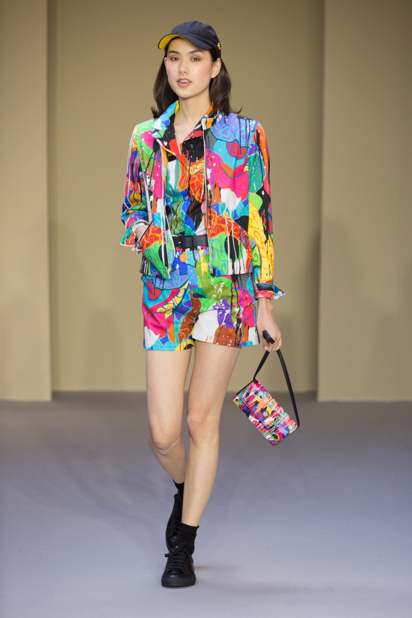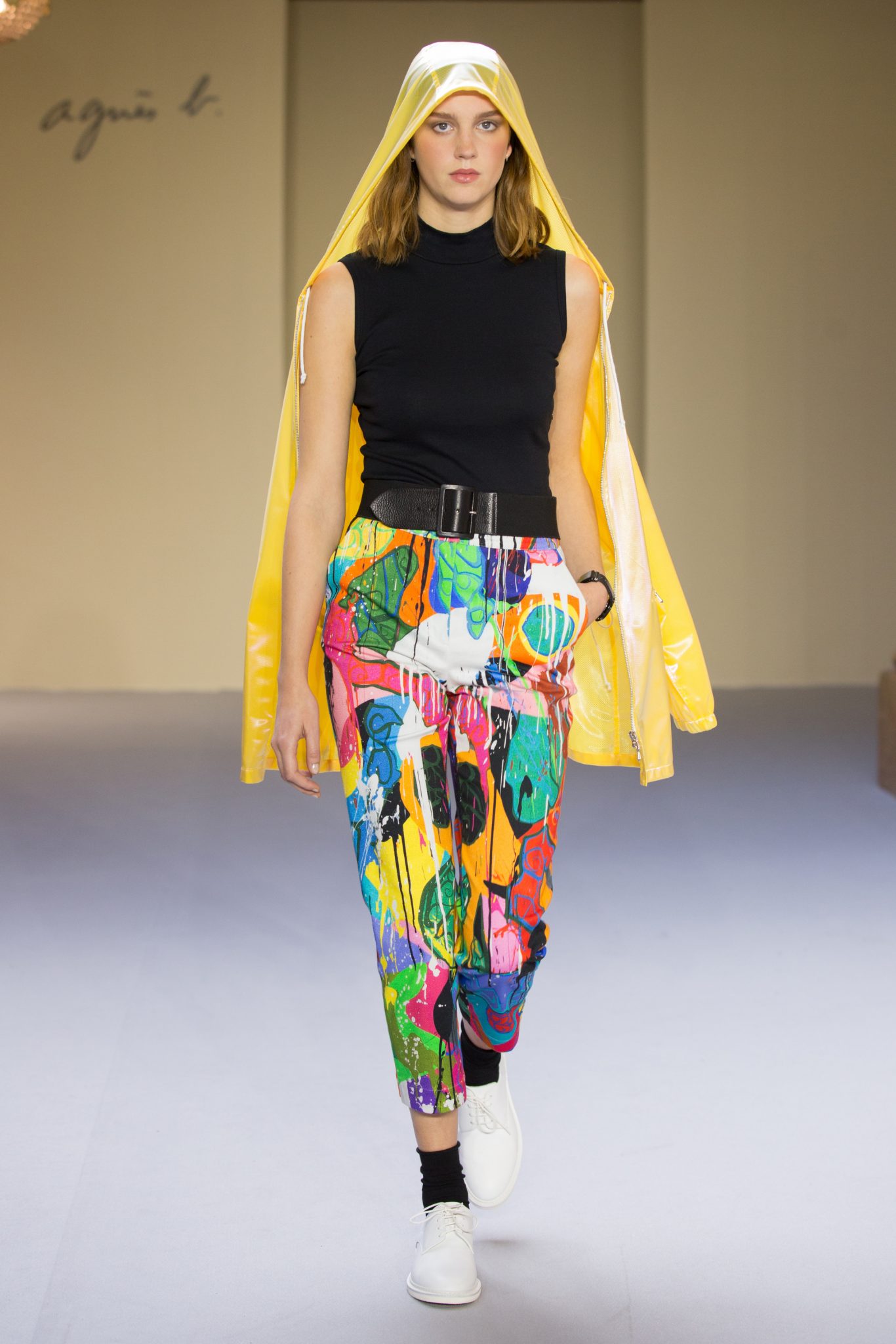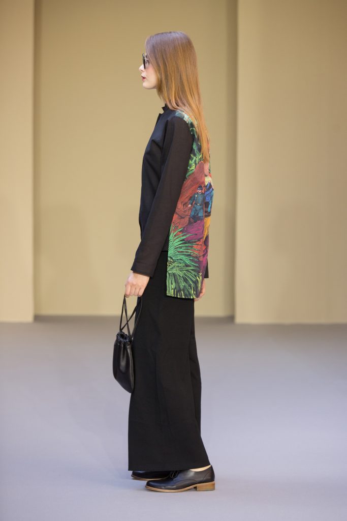 les créations graphiques de Bertrand Loubé s’exposent sur des robes : noir et blanc réchauffées par un cardigan pression en agneau rouge mais aussi en all-over et en couleurs vives. Un imper résille jaune se marie avec les créations colorées de Jonone tandis que le cardigan pression en cuir noir accompagne la jupe imprimée Lek & Sowat. Le dessin fantasmagorique d’Elzo Durt surprend, dans le dos d’une chemise longue en crêpe noir tandis que le dessin tye and dye d’Icon s’imprime en all over sur une robe bustier en jersey.