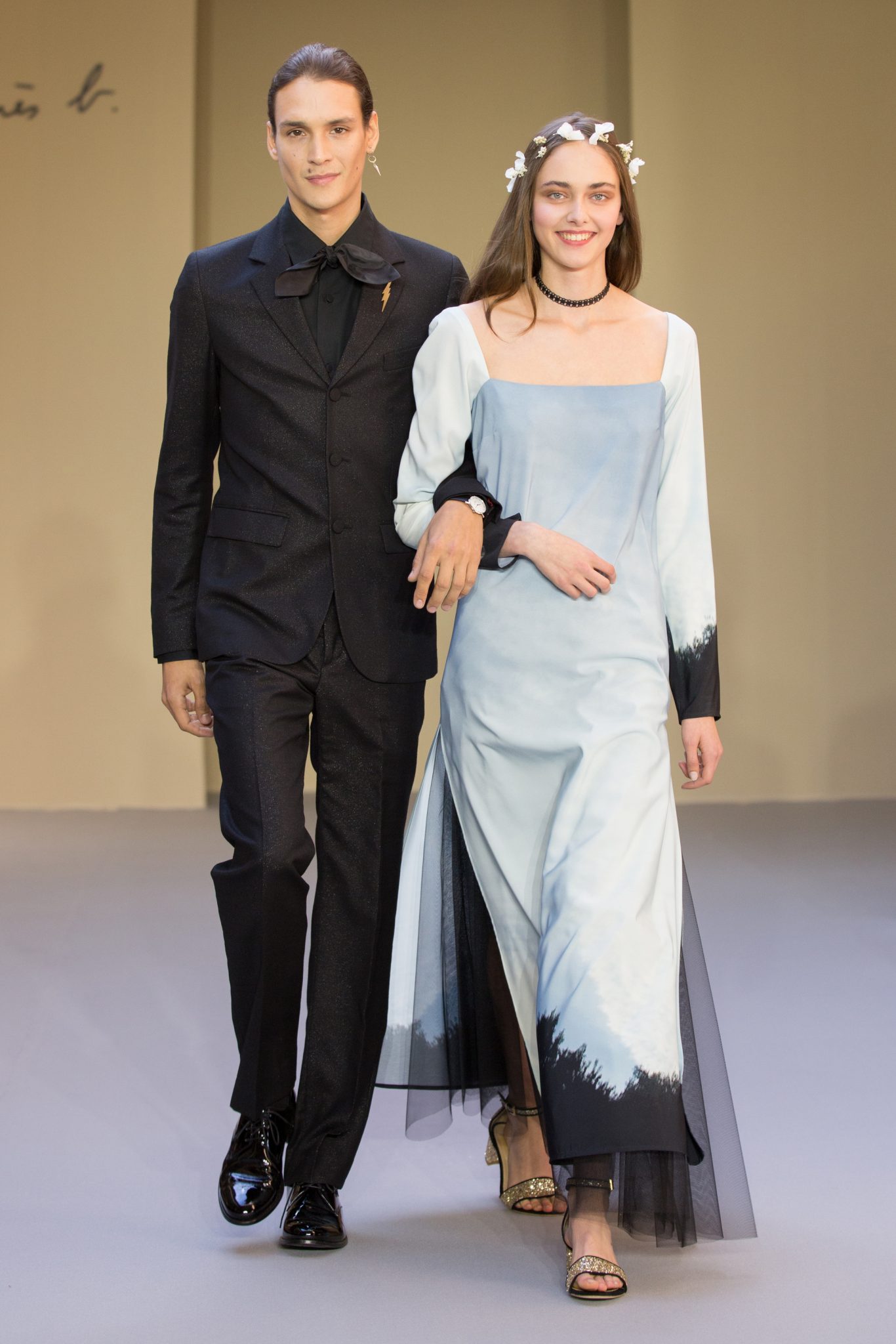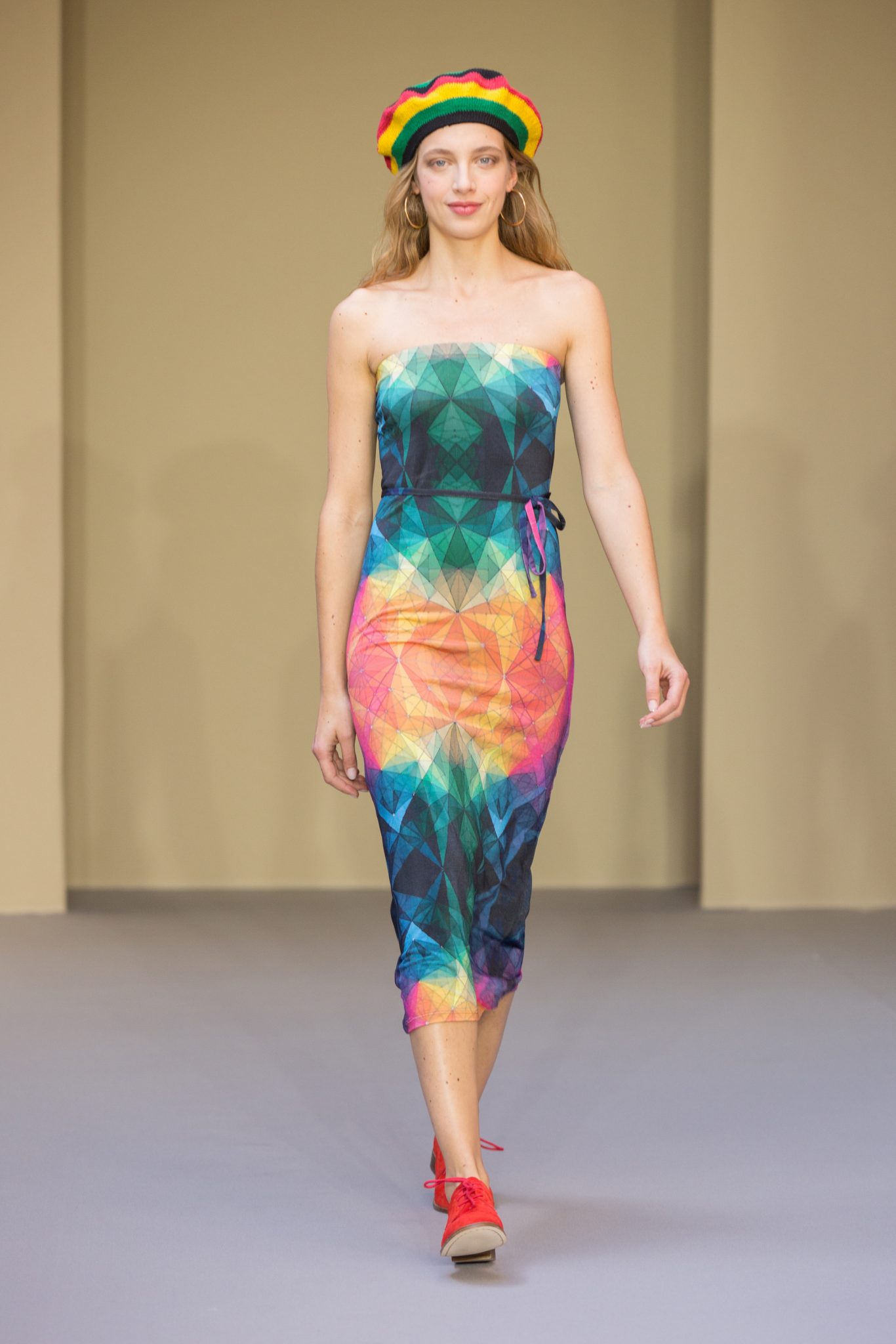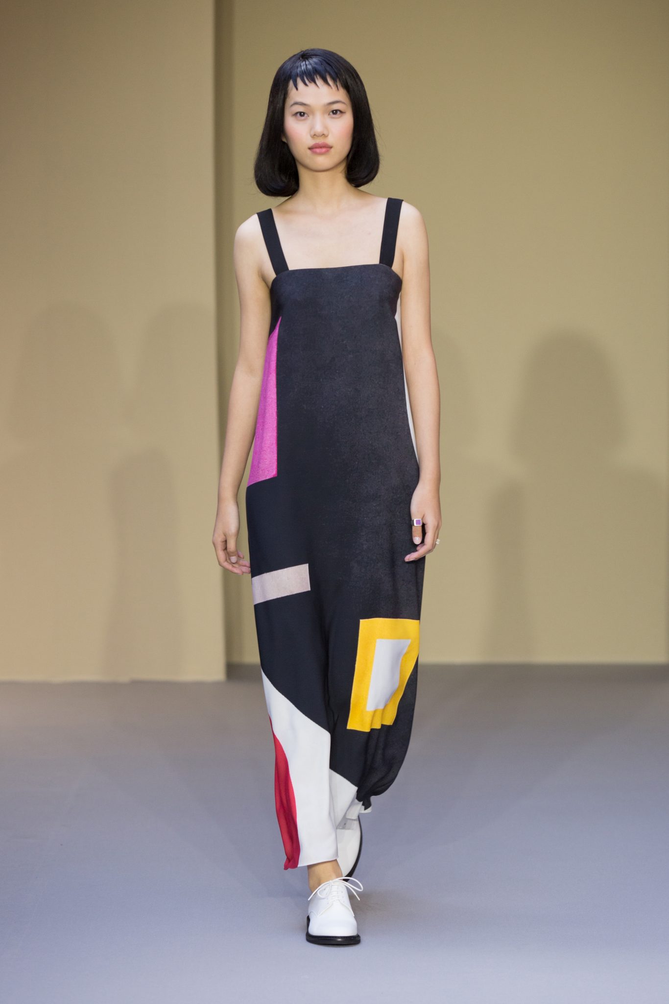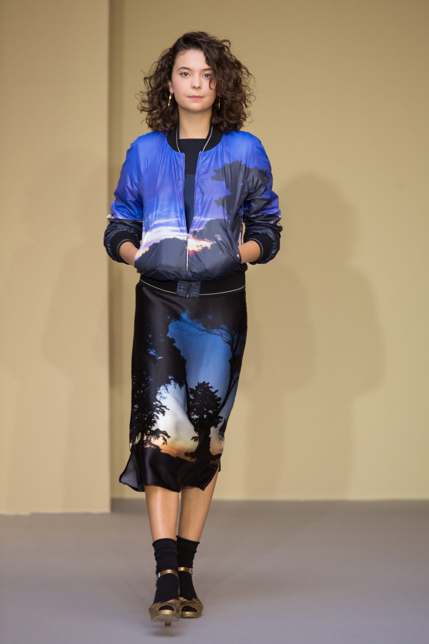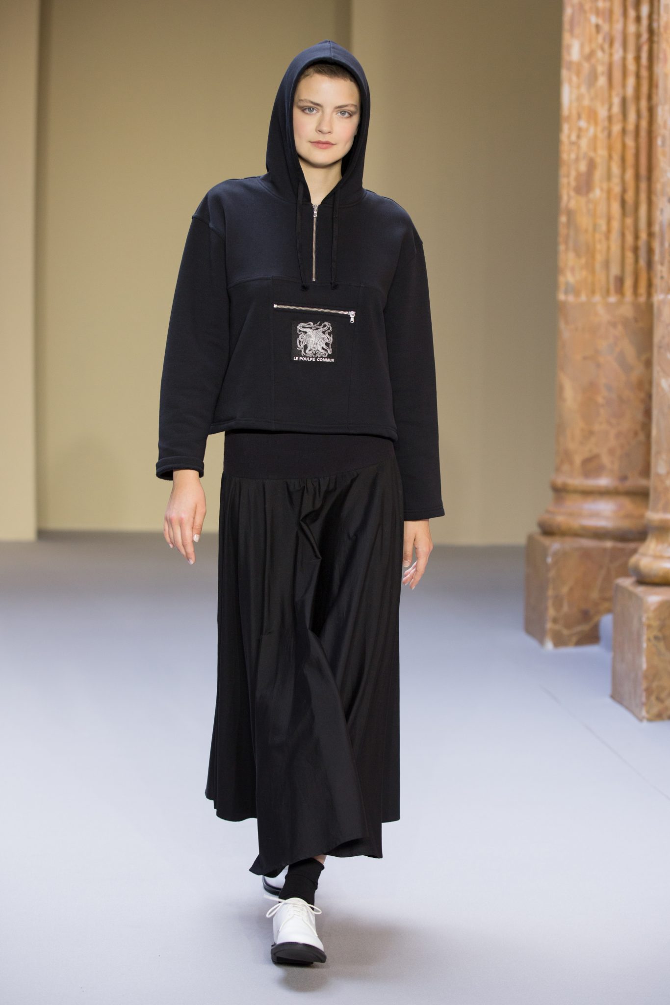 les créations graphiques de Bertrand Loubé s’exposent sur des robes : noir et blanc réchauffées par un cardigan pression en agneau rouge mais aussi en all-over et en couleurs vives. Un imper résille jaune se marie avec les créations colorées de Jonone tandis que le cardigan pression en cuir noir accompagne la jupe imprimée Lek & Sowat. Le dessin fantasmagorique d’Elzo Durt surprend, dans le dos d’une chemise longue en crêpe noir tandis que le dessin tye and dye d’Icon s’imprime en all over sur une robe bustier en jersey.
