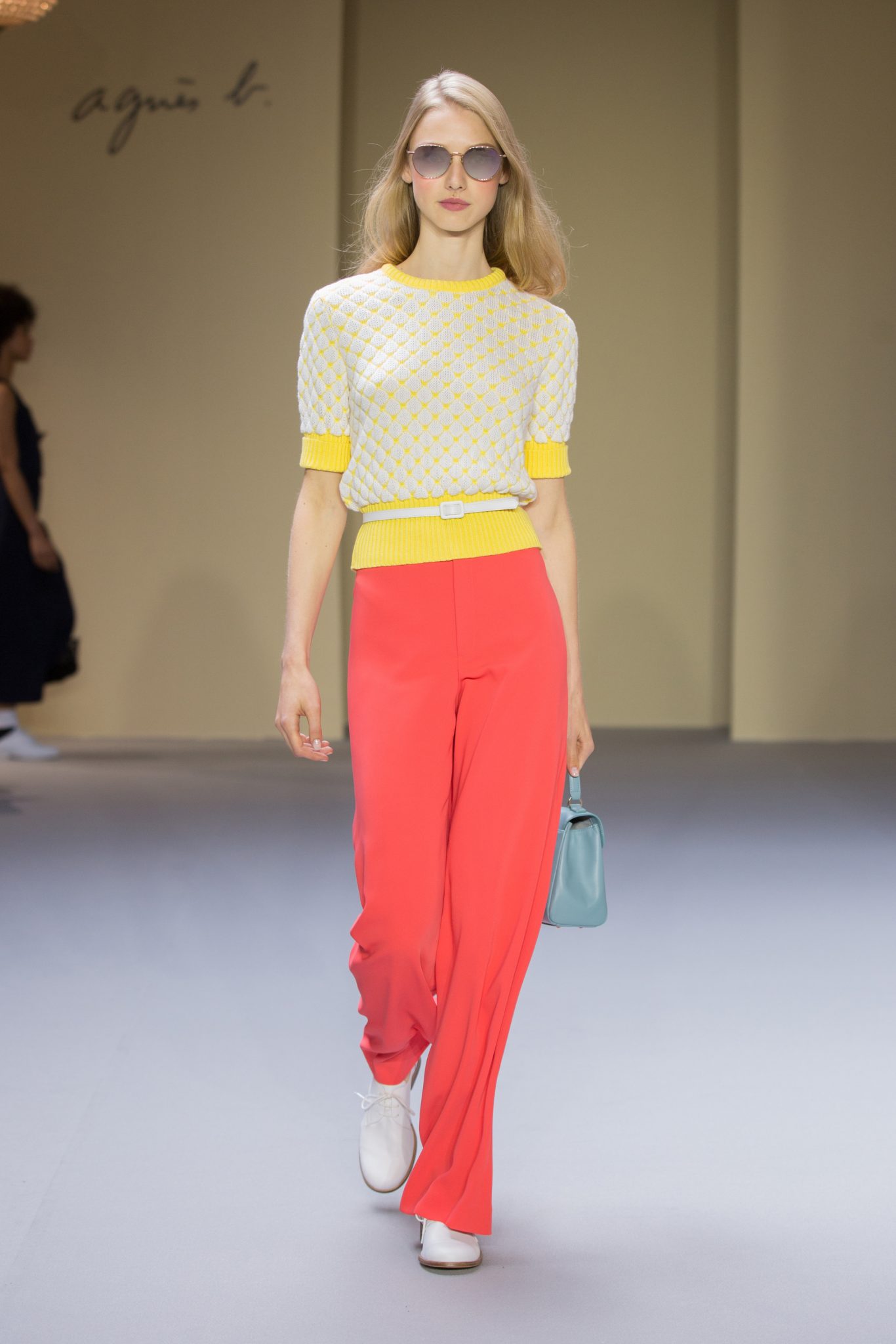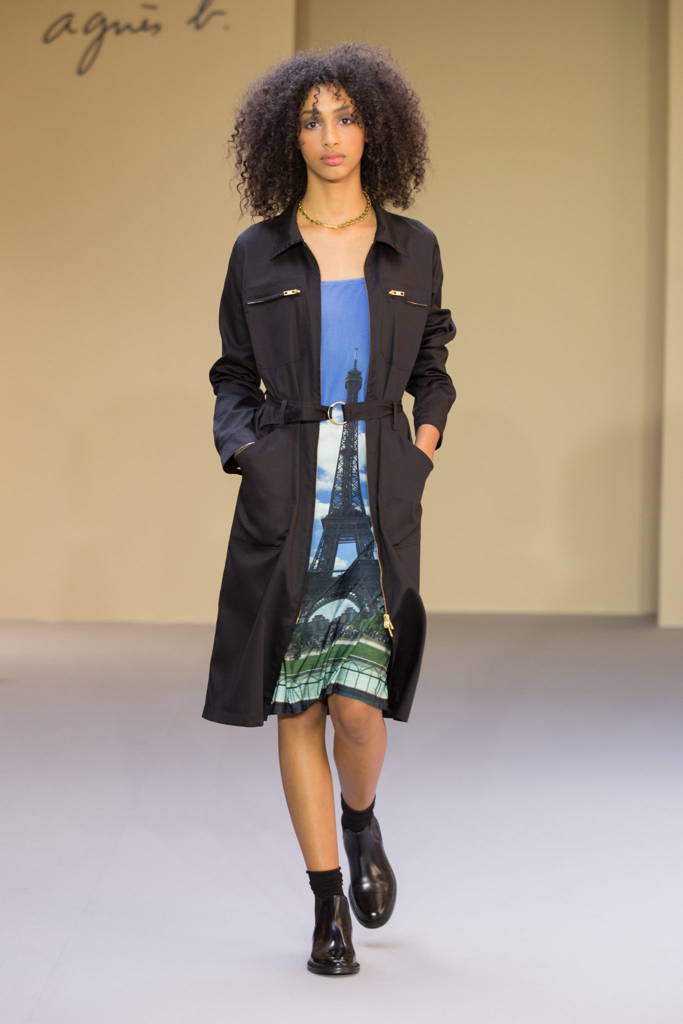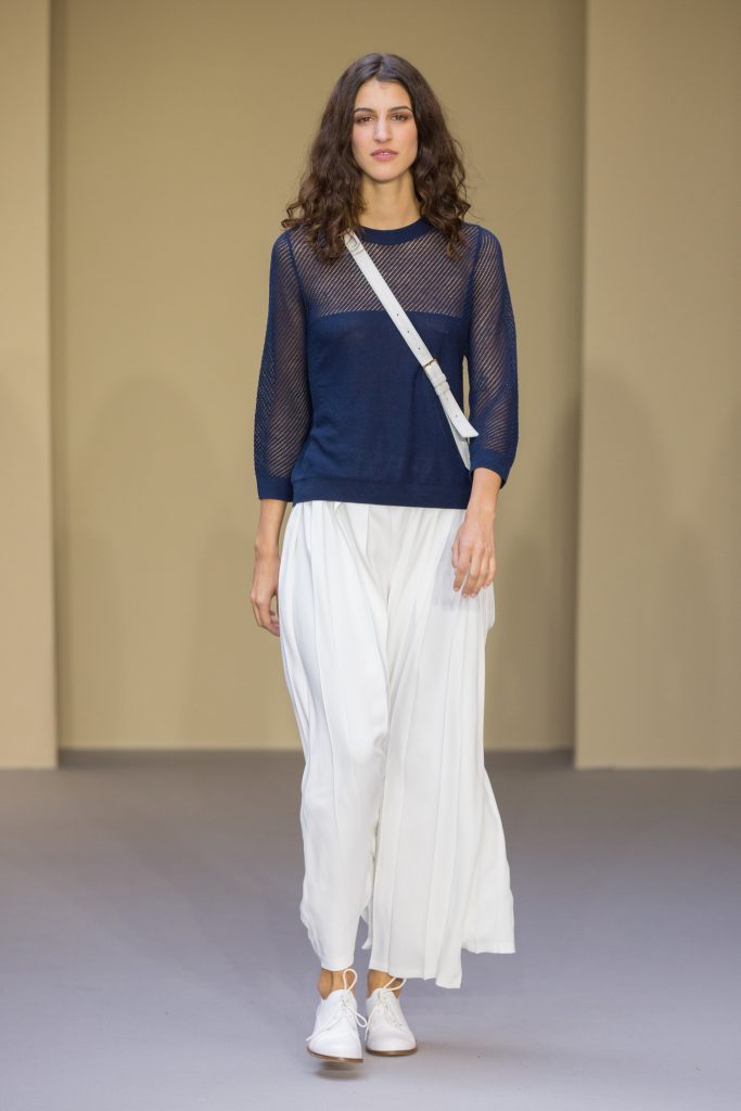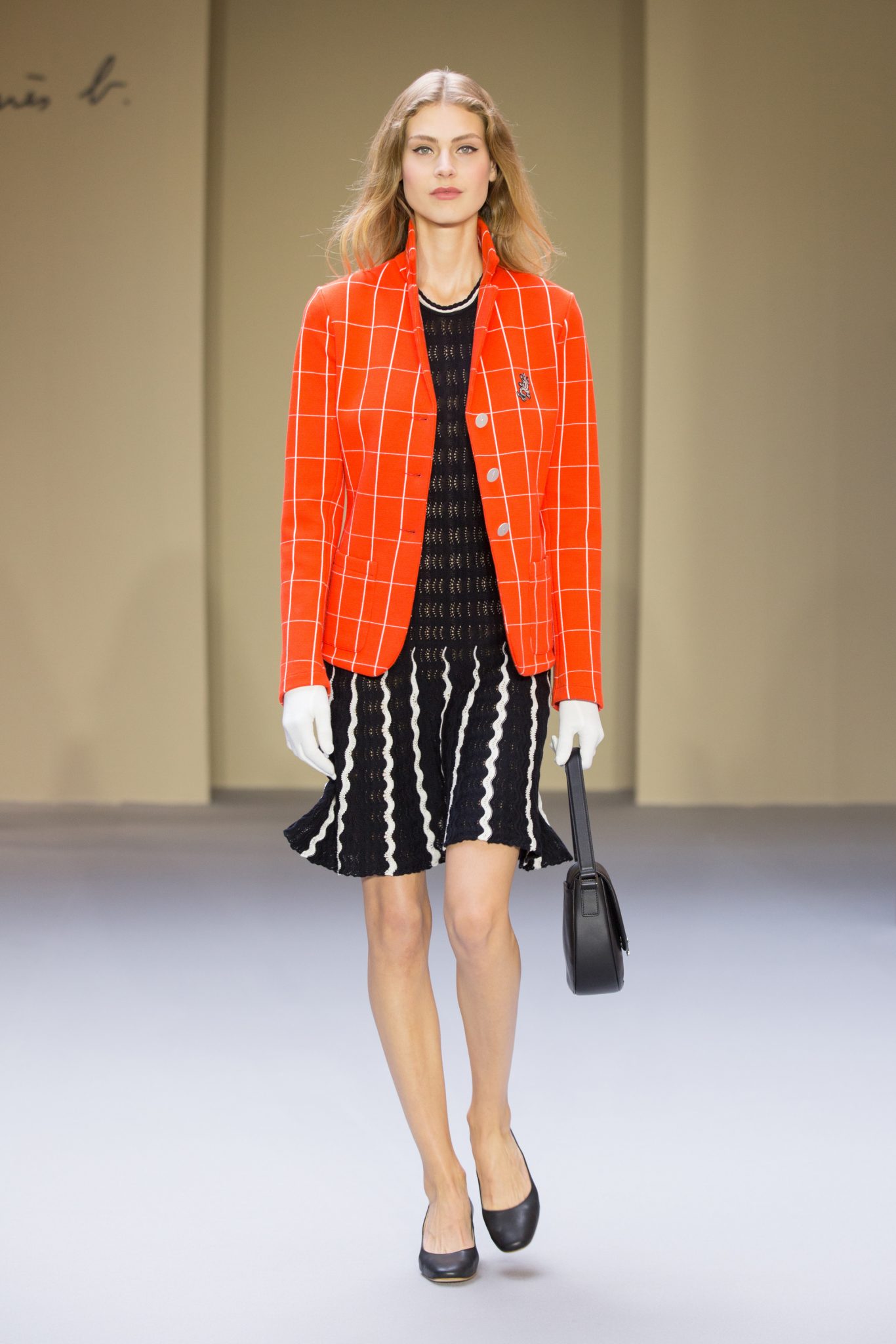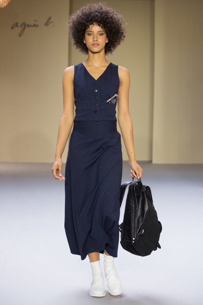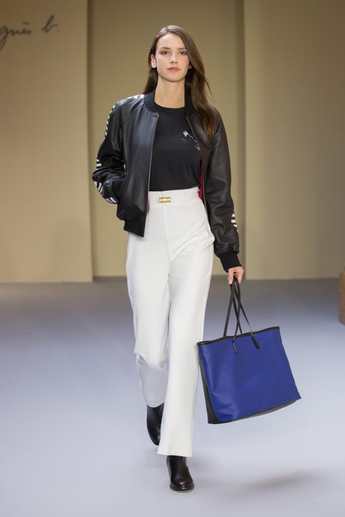 Du cuir, des encolures carrées bicolore noir et blanc devant et dos, un ensemble bermuda noir à grands carreaux blancs, des jupes plissées mais aussi des imprimés numériques créés avec les photos prises par agnès b. de Paris… Tour Eiffel, Seine… et des champs … « la France vue d’un hublot » ! Des sacs à main en cuir et anse interchangeable viennent compléter ces looks chics et intemporels.
