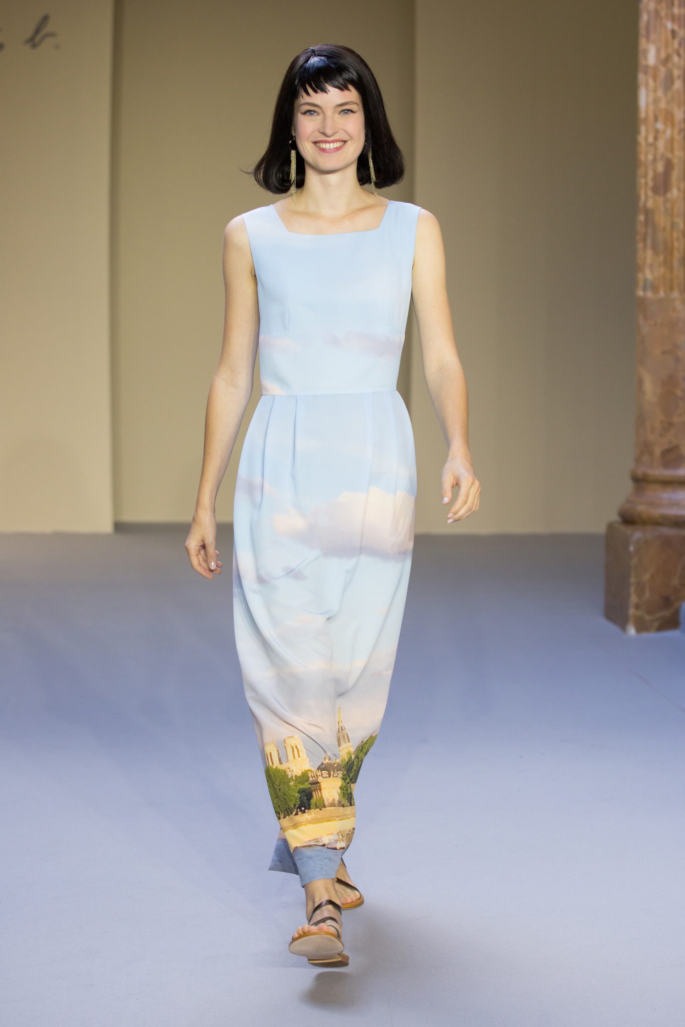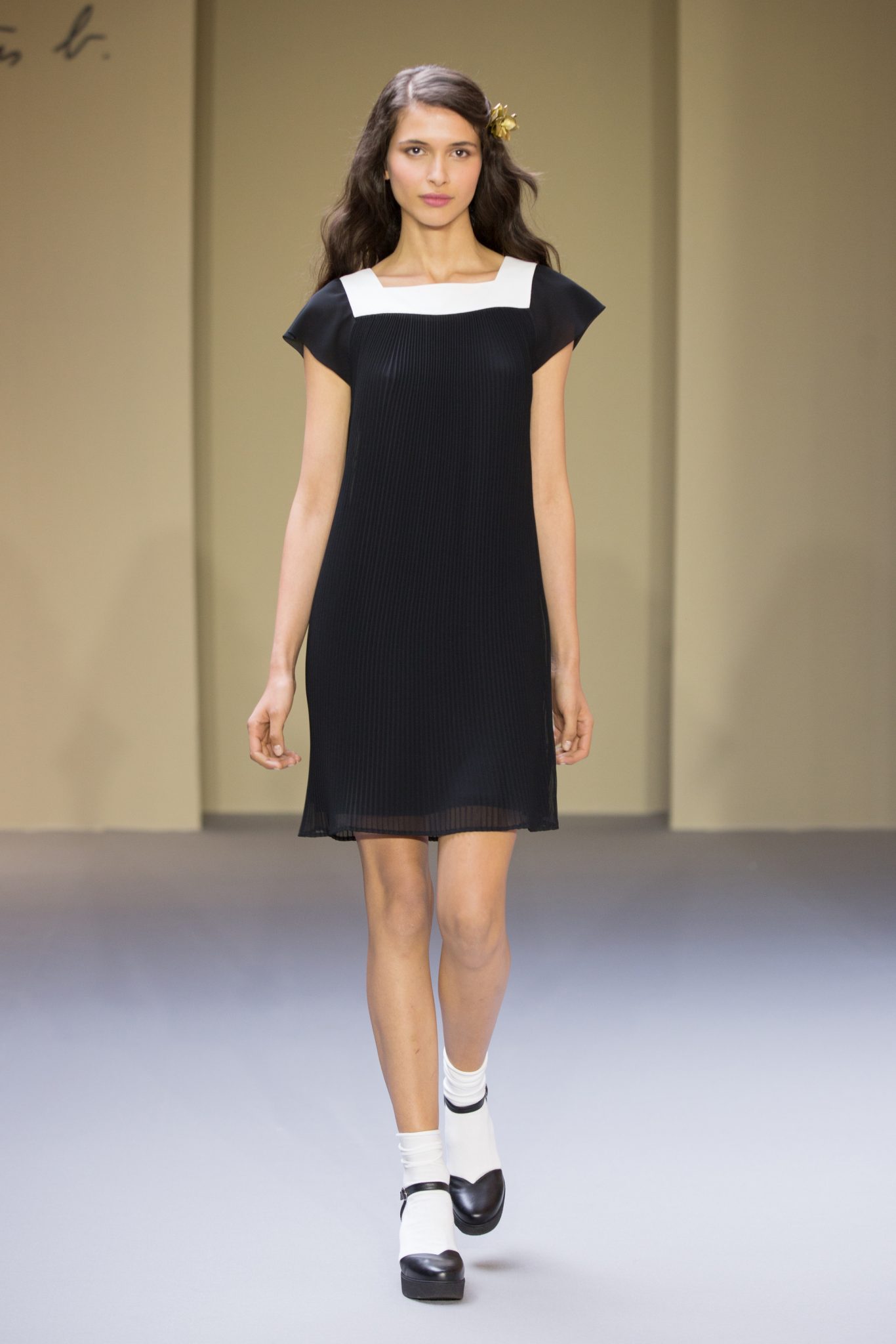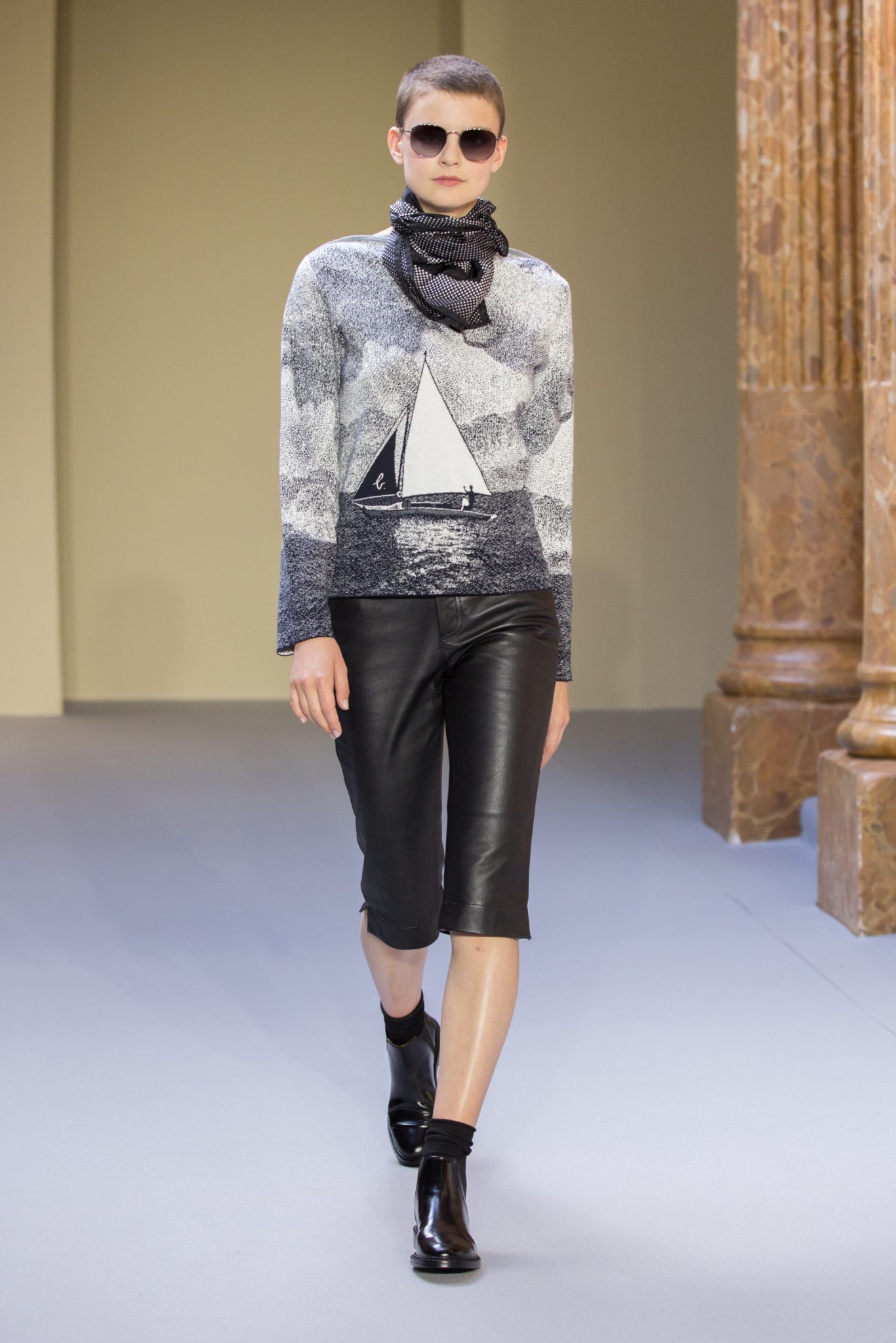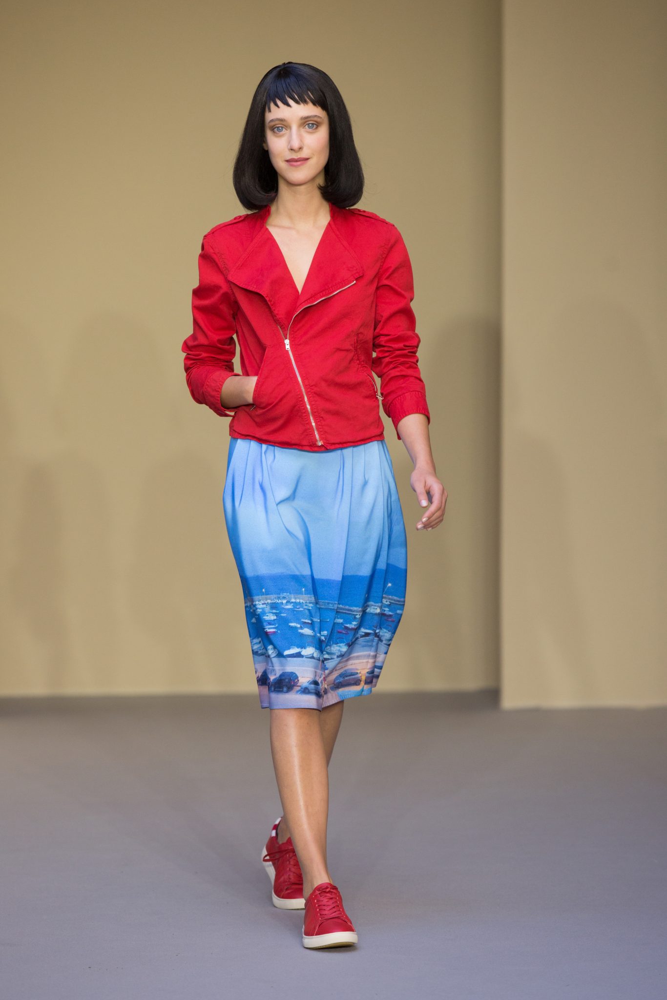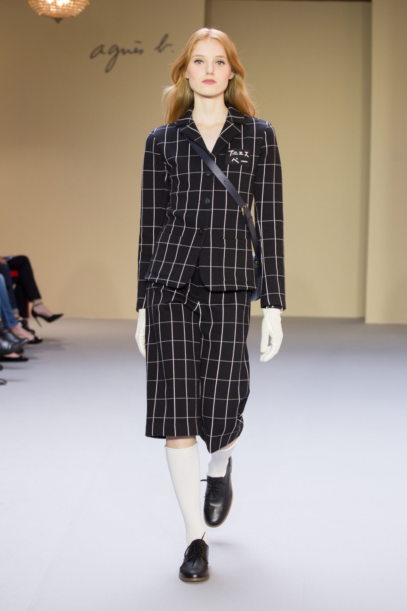 Du cuir, des encolures carrées bicolore noir et blanc devant et dos, un ensemble bermuda noir à grands carreaux blancs, des jupes plissées mais aussi des imprimés numériques créés avec les photos prises par agnès b. de Paris… Tour Eiffel, Seine… et des champs … « la France vue d’un hublot » ! Des sacs à main en cuir et anse interchangeable viennent compléter ces looks chics et intemporels.