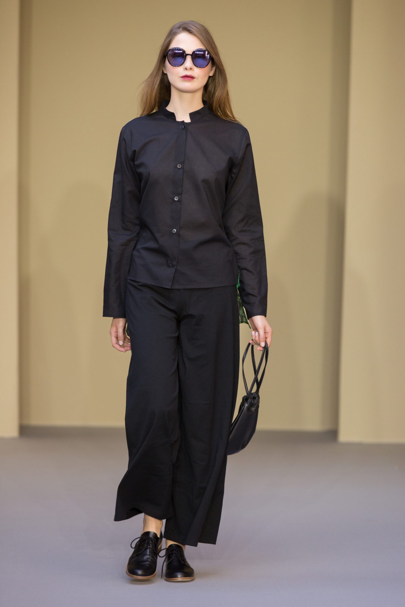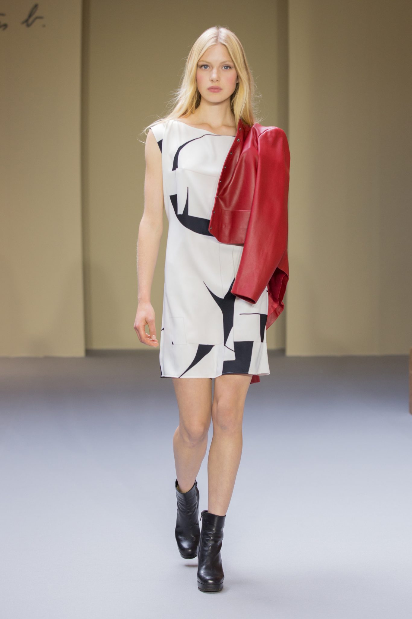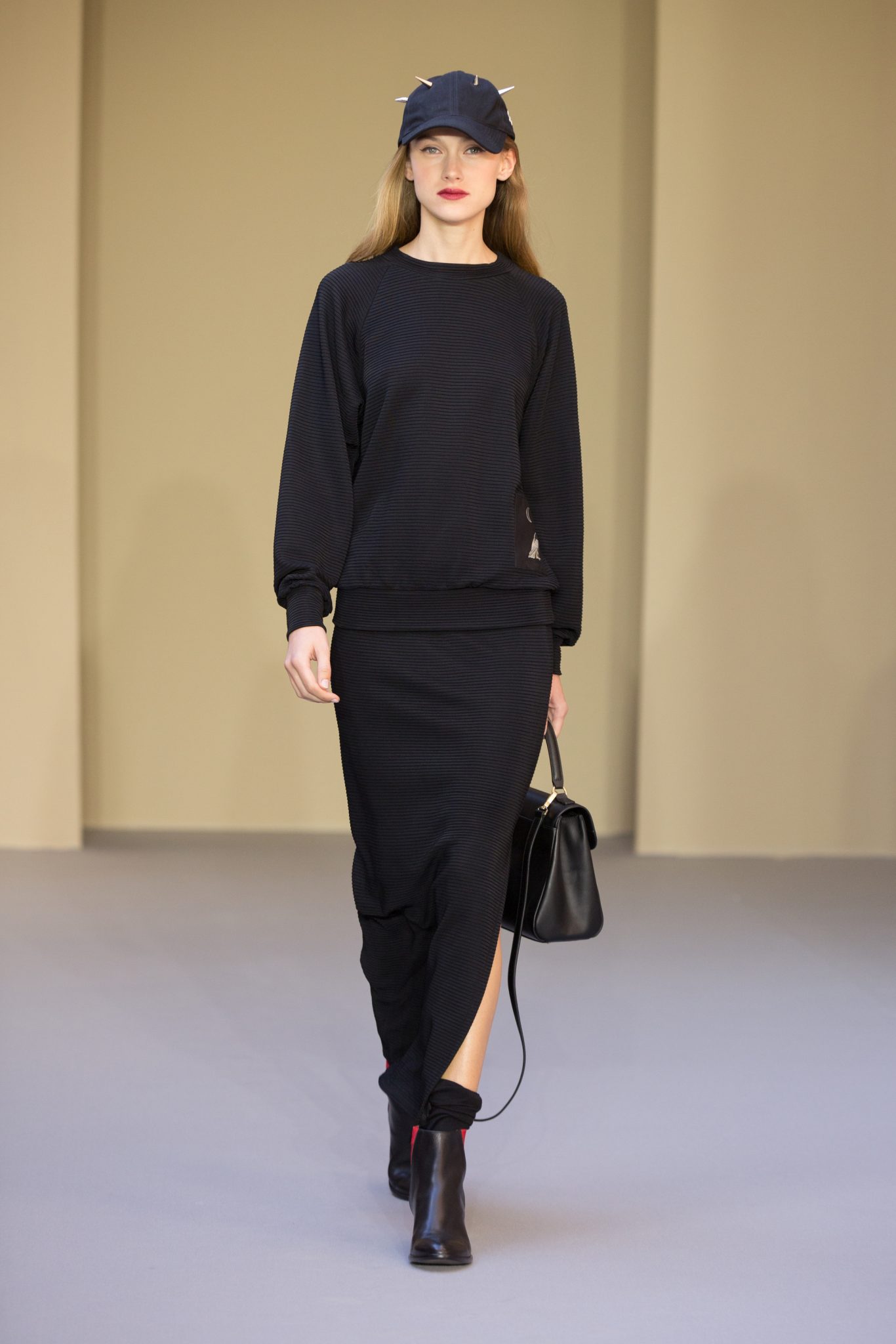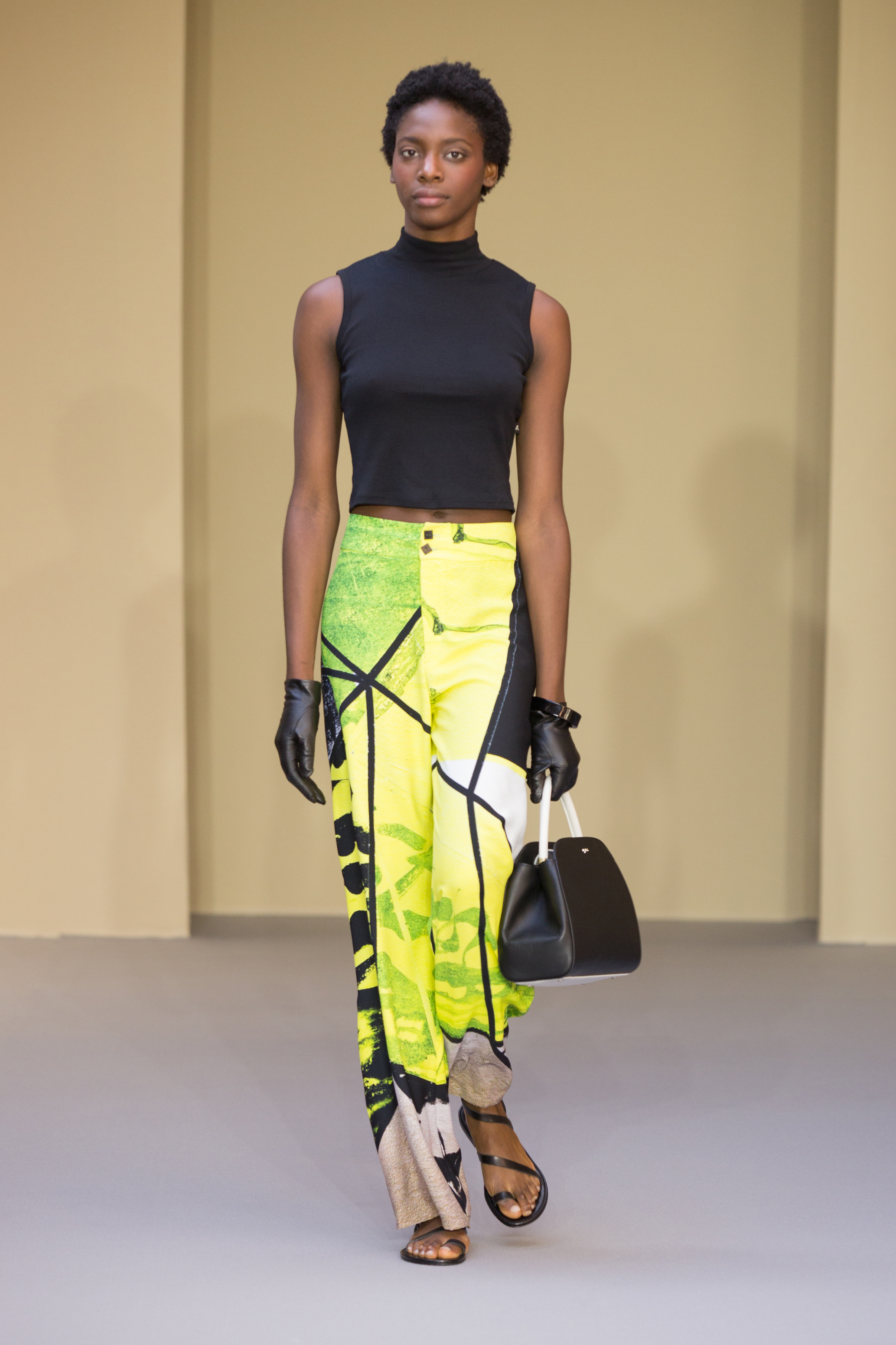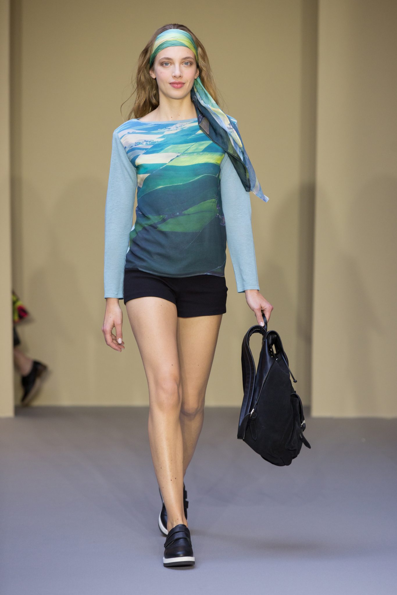 Du cuir, des encolures carrées bicolore noir et blanc devant et dos, un ensemble bermuda noir à grands carreaux blancs, des jupes plissées mais aussi des imprimés numériques créés avec les photos prises par agnès b. de Paris… Tour Eiffel, Seine… et des champs … « la France vue d’un hublot » ! Des sacs à main en cuir et anse interchangeable viennent compléter ces looks chics et intemporels.