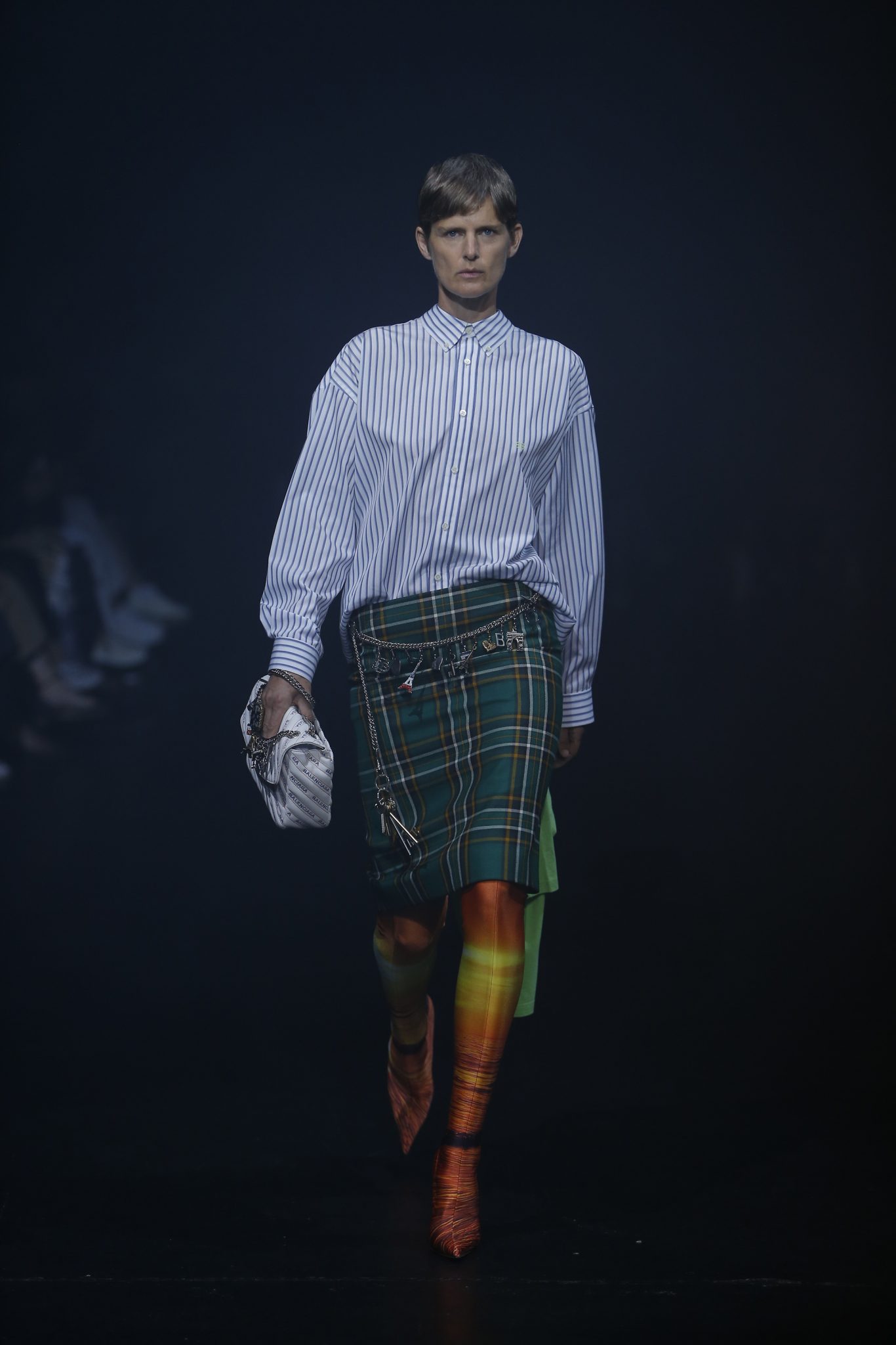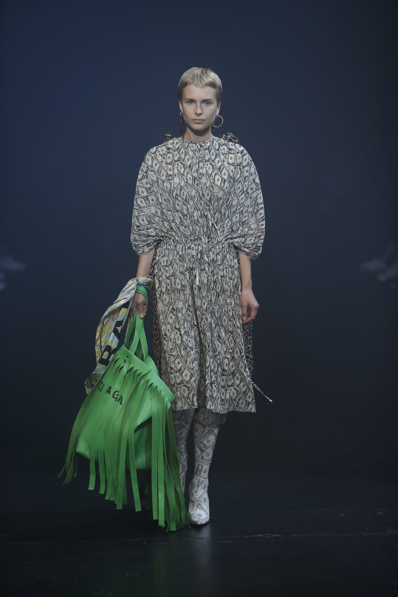 D’autres transferts d’éléments culturels populaires se retrouvent dans la collection : un store de boutique devient un pantalon, un parasol converti en jupe, des imprimés inspirés d’écrans de veille, des pages de journaux, des scans de billets de banque, des sacs « top-case » faisant écho aux sacs rétroviseurs de la collection Automne Hiver 17, ainsi que des anses en chaîne et bijoux suggérant les modèles issus de magasins duty-free et boutiques de souvenirs.