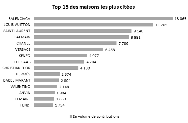 Avec près de 8 900 contributions, la maison Balmain arrive en 4e position des maisons les plus citées. La présence de Neymar au défilé qui s’est tenu le 29 septembre dernier explique certainement cet engouement sur le Web et les réseaux sociaux avec près de 400 contributions citant le joueur du PSG dans le cadre du défilé Balmain.