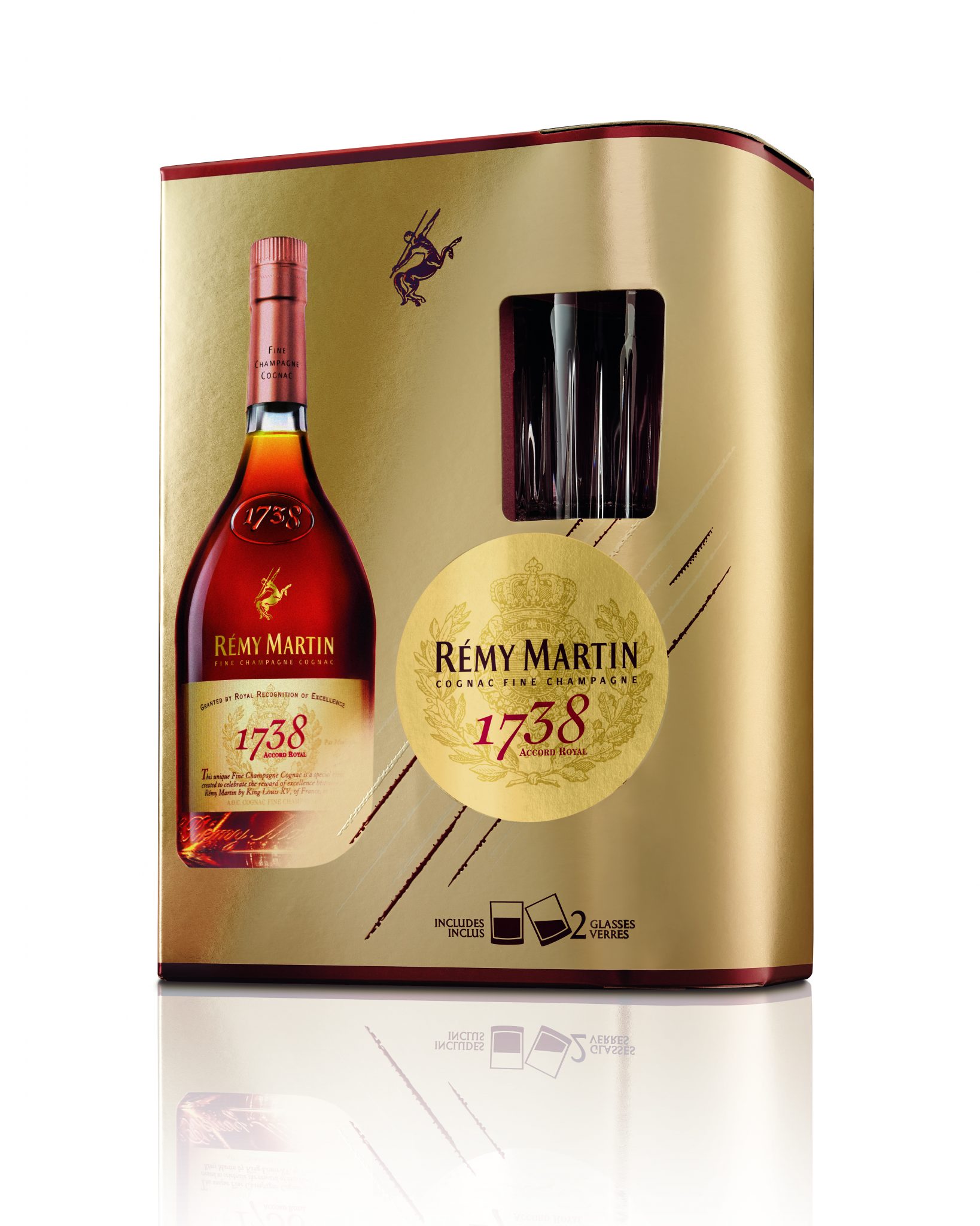 Un coffret en or irisé et griffé qui renferme une bouteille de 1738 Accord Royal et deux verres de dégustation