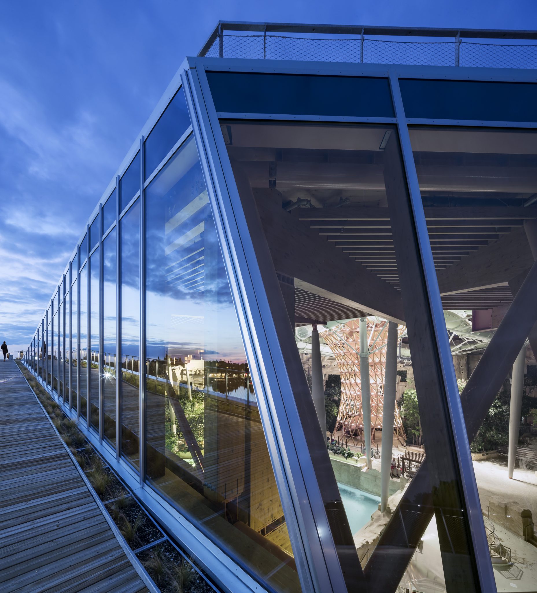 • L’Aqualagon, conçu par l’architecte Jacques Ferrier, est emblématique de la destination. Formé d’un lagon à ciel ouvert de 2500 m2 baignable toute l’année avec une eau chauffée à 30°C attenant à l’un des plus grands espaces aquatiques couverts d’Europe de 9000 m2, doté de 7 toboggans géants. L’édifice de forme pyramidale est accessible par un chemin de ronde menant jusqu’à son sommet, offrant une vue panoramique sur Villages Nature Paris et ses environs.