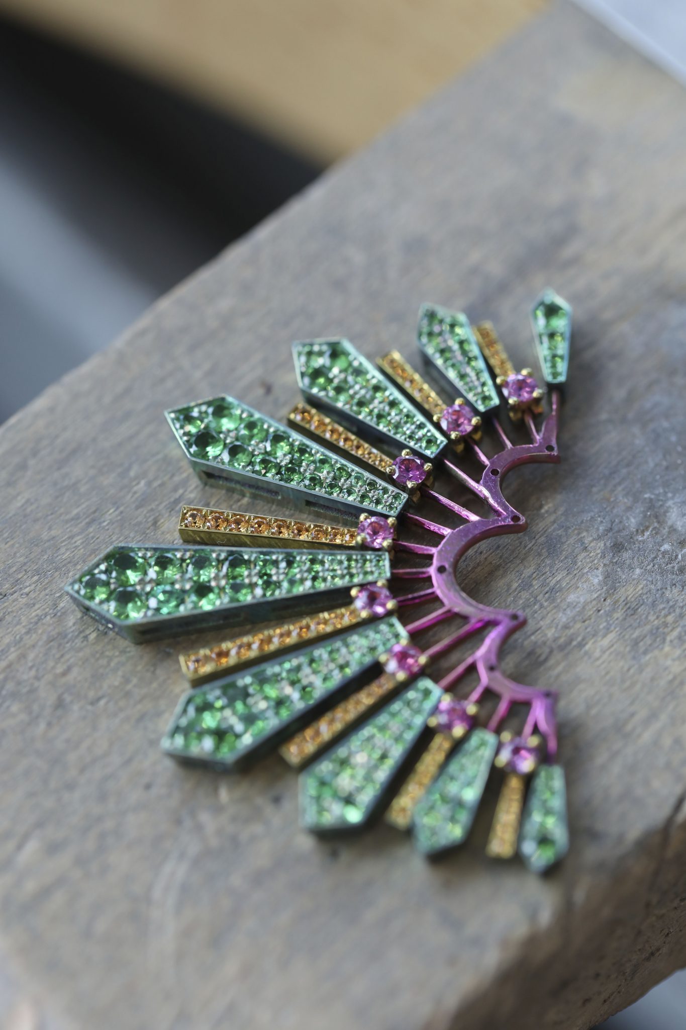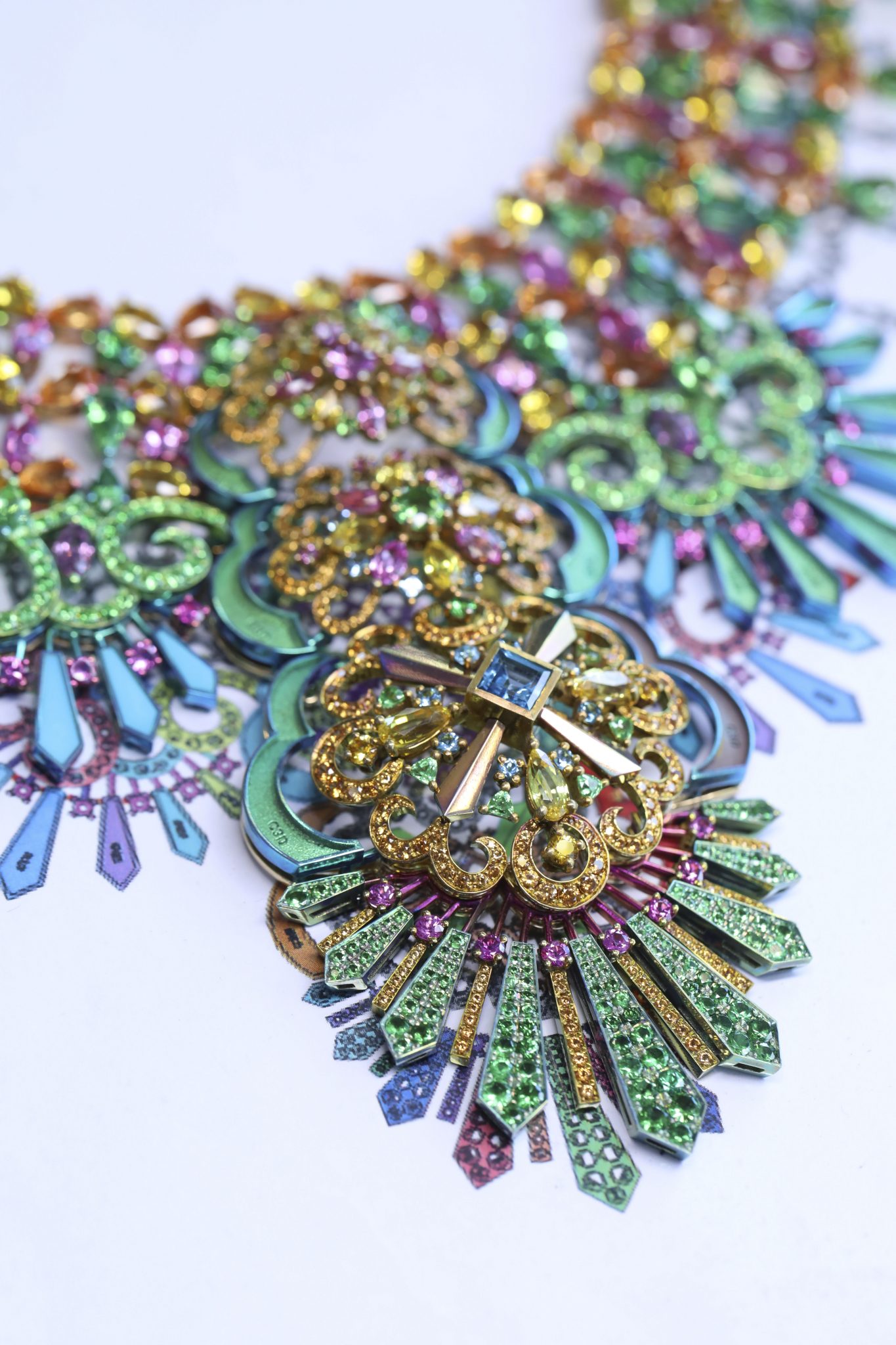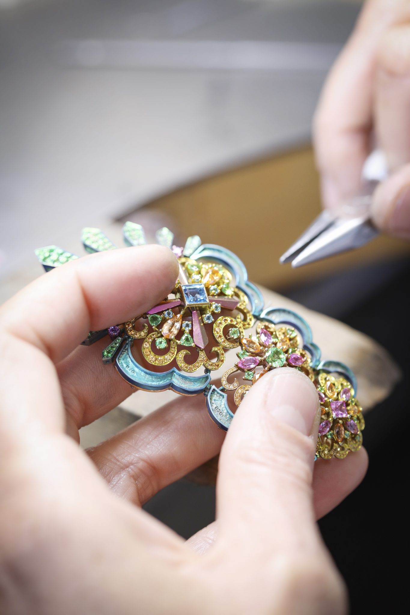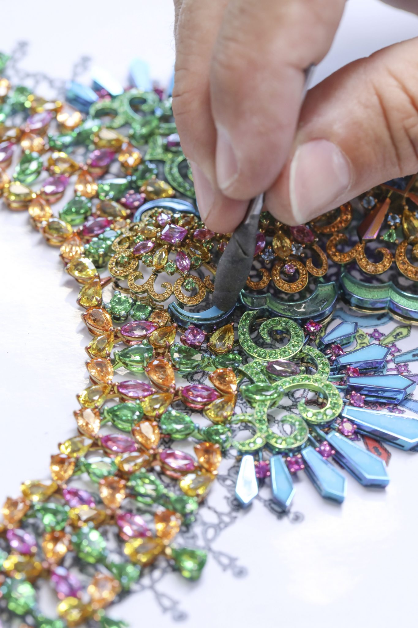 L’incroyable collection de Haute Joaillerie s’enrichit de deux nouvelles créations chatoyantes. Un bracelet manchette et une paire de boucles d’oreilles composés de plumes de paon en titane chamarré et serti de topazes, tourmalines, tsavorites et émeraudes échappées des jardins luxuriants de la Barbade viennent compléter l’écrin précieux confectionné par les ateliers de la Maison genevoise. A la créativité vibrante de la chanteuse internationale, Chopard a ajouté son savoir-faire au service d’un rêve fantastique : faire flamboyer la roue de cet élégant animal de l’éclat des gemmes les plus étourdissantes.