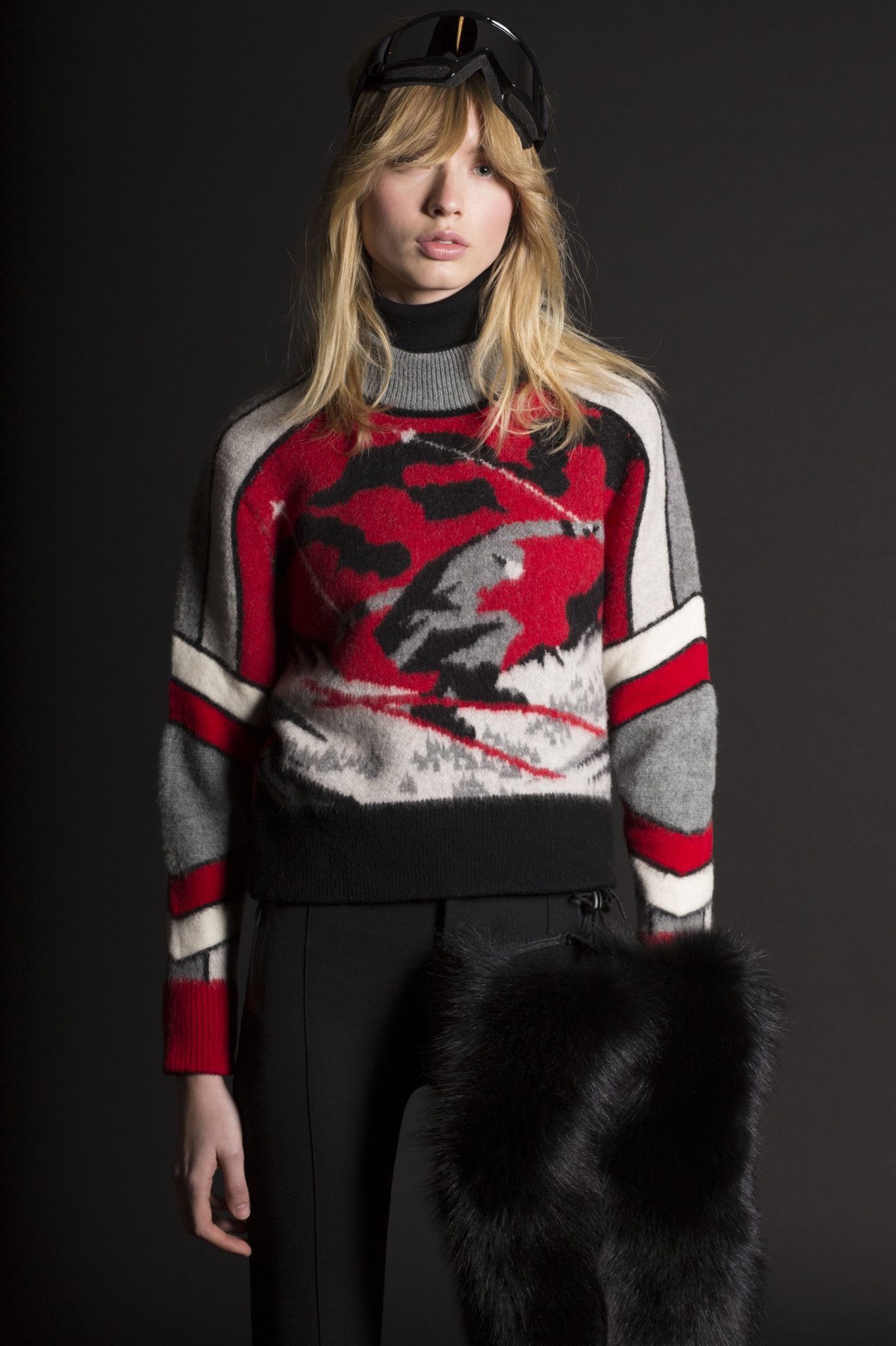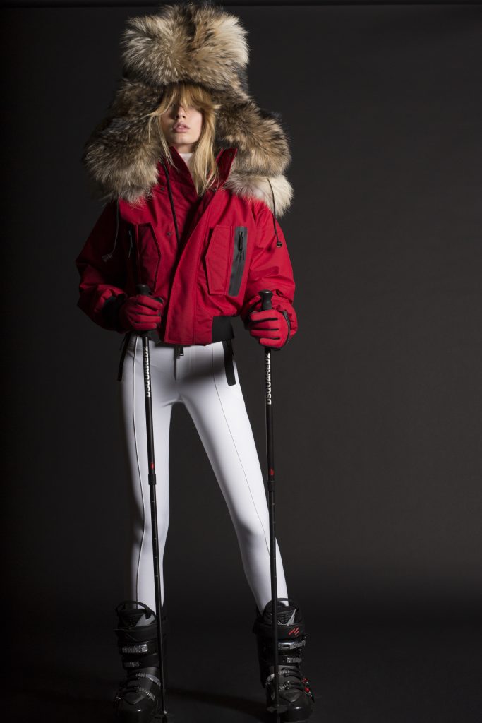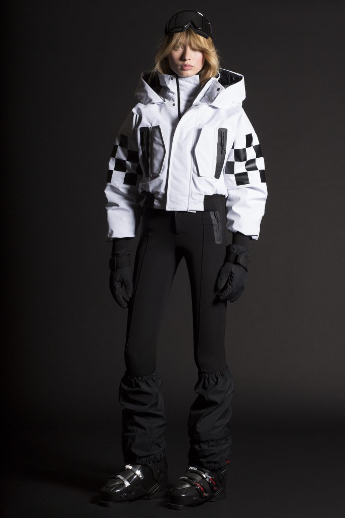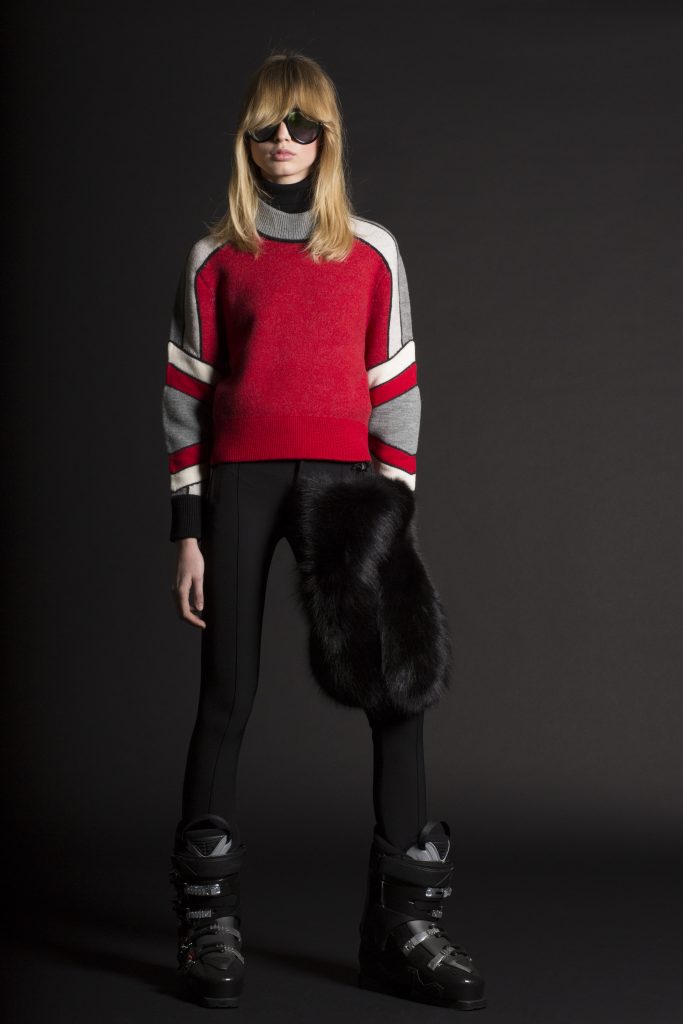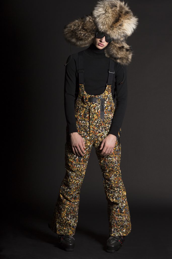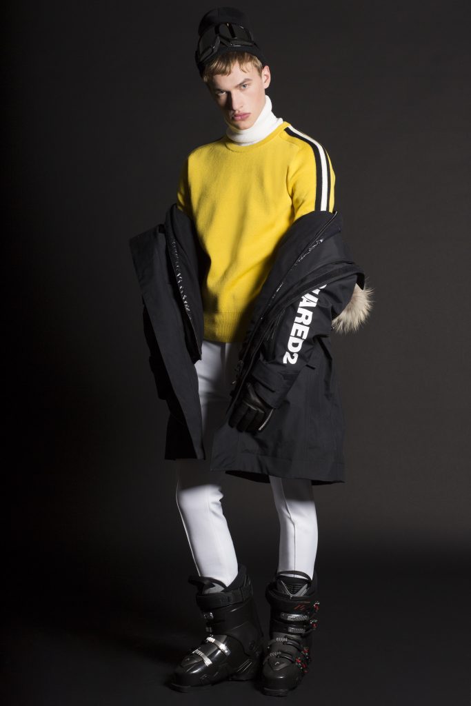Les couleurs de gris, bleu, jaune et rouge font référence à la Royal Canadian Mountain Police avec des pulls, à la fois pour les hommes et les femmes, présentant des motifs graphiques à rayures. Les pièces de ski de style vintage illustrées de motifs jacquard sont courts ou à col haut. Les looks ski sont influencés par le streetwear pour l’homme, avec une veste en maille fine et des shorts à rayures profilées. Les vestes en néoprène avec des motifs graphiques blancs sont prévues pour être portées sous un manteau de ski dans les montagnes la journée, pour pouvoir se transformer en tenue sportive pour le soir.