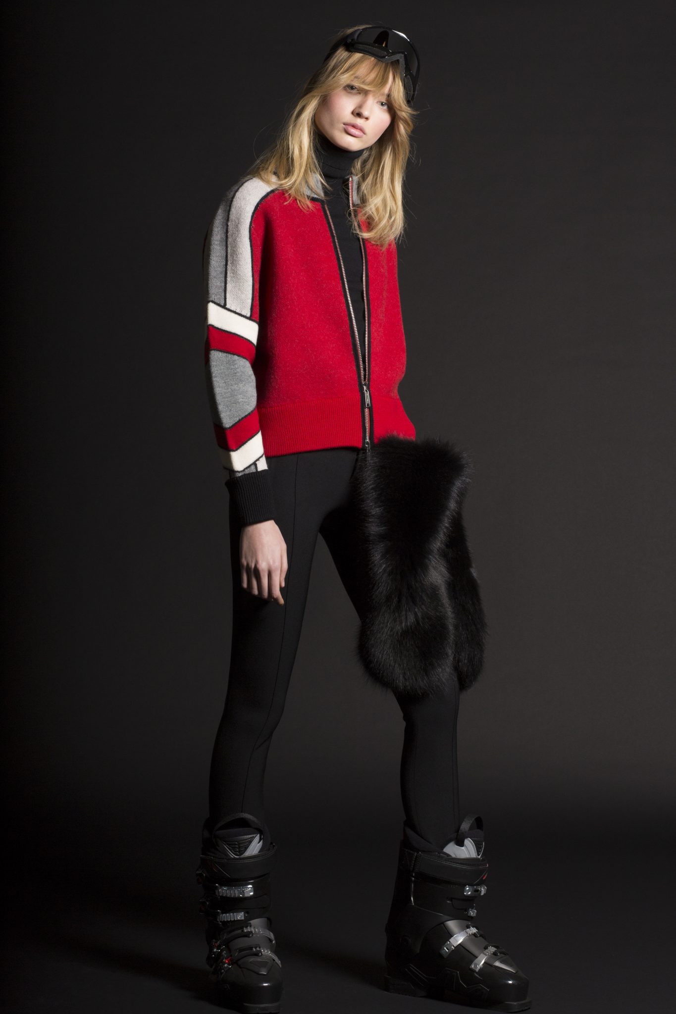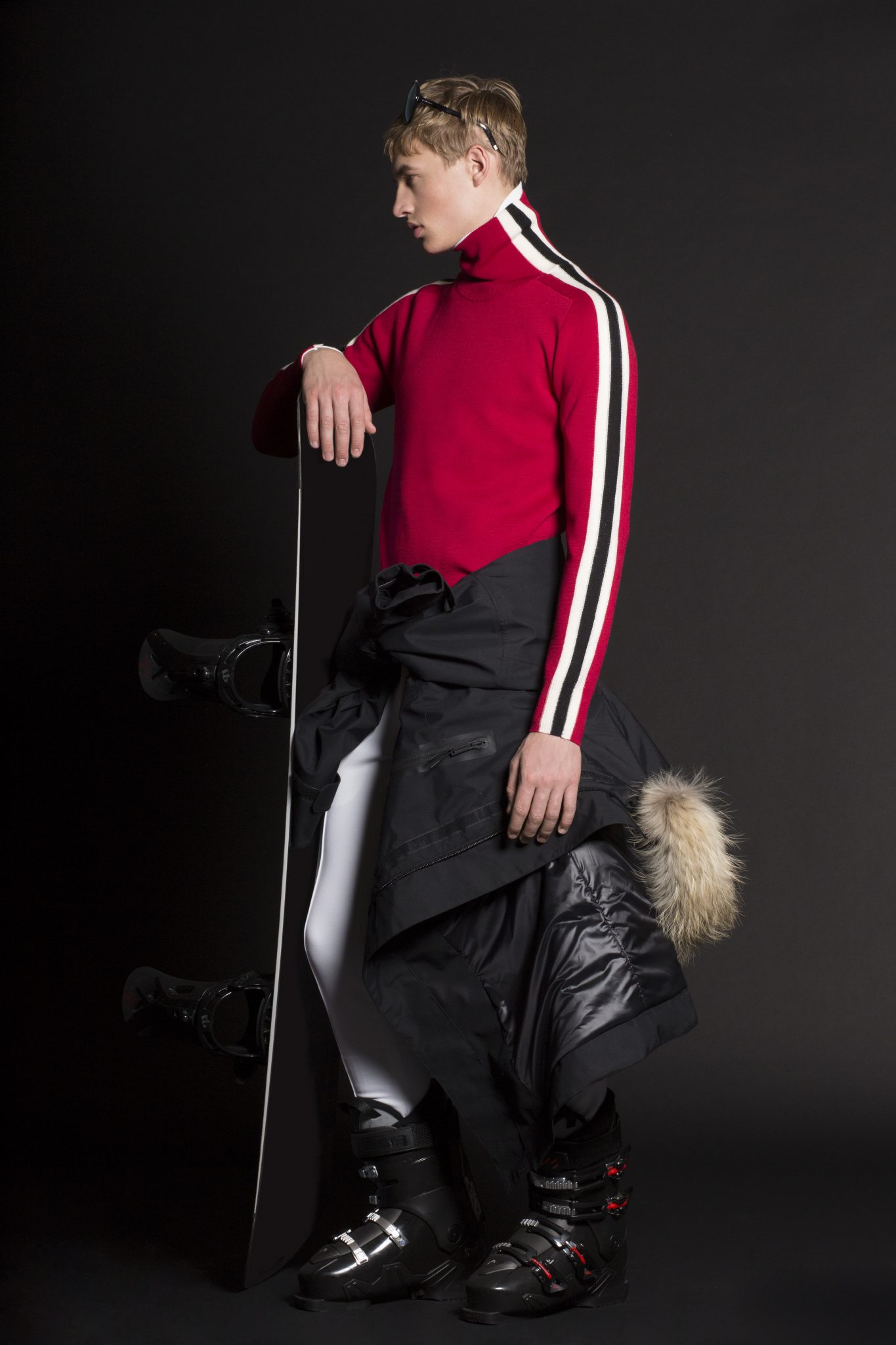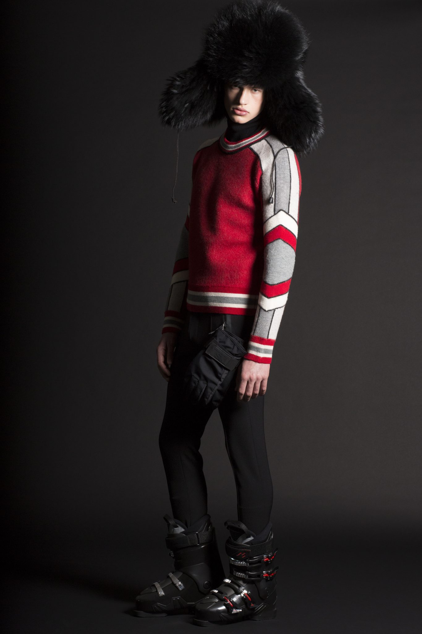 Les couleurs de gris, bleu, jaune et rouge font référence à la Royal Canadian Mountain Police avec des pulls, à la fois pour les hommes et les femmes, présentant des motifs graphiques à rayures. Les pièces de ski de style vintage illustrées de motifs jacquard sont courts ou à col haut. Les looks ski sont influencés par le streetwear pour l’homme, avec une veste en maille fine et des shorts à rayures profilées. Les vestes en néoprène avec des motifs graphiques blancs sont prévues pour être portées sous un manteau de ski dans les montagnes la journée, pour pouvoir se transformer en tenue sportive pour le soir.