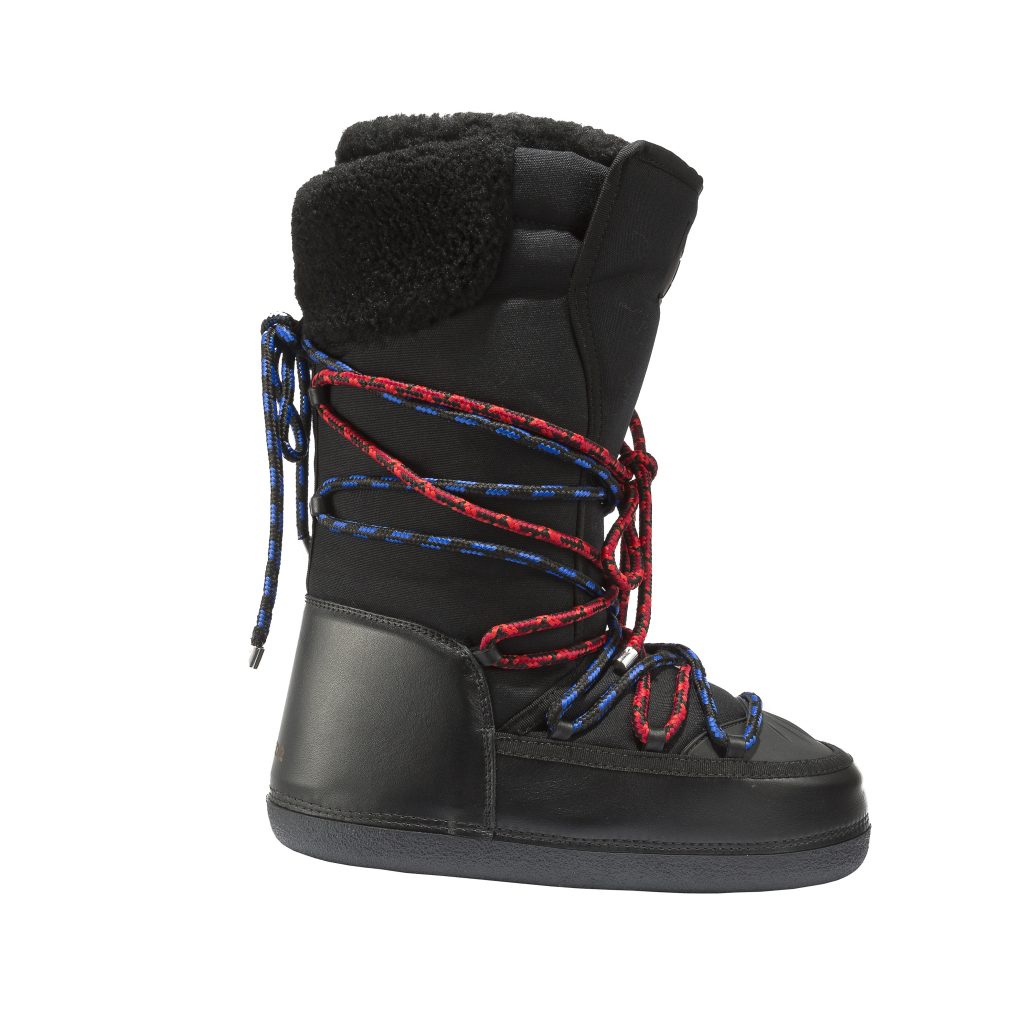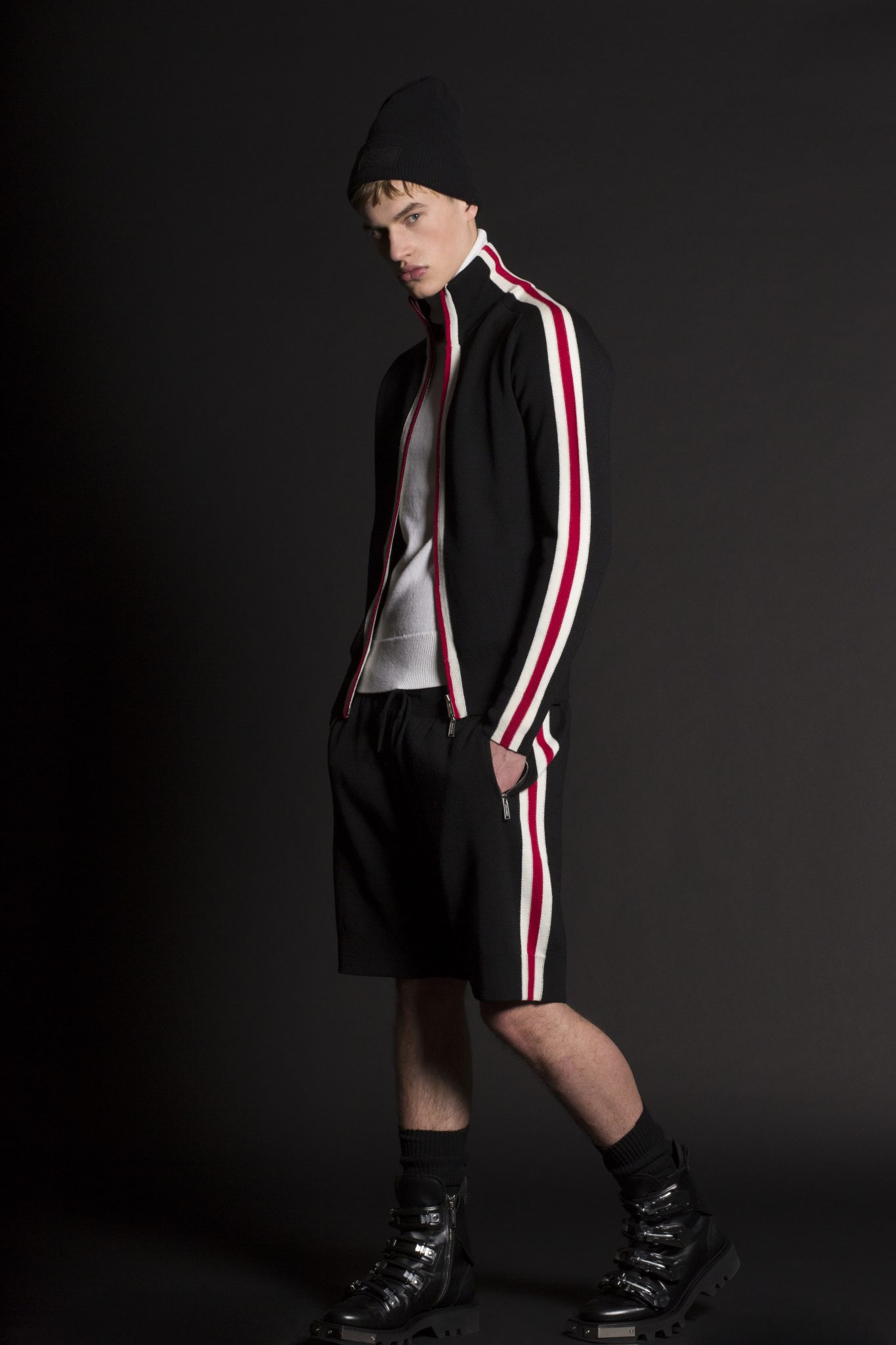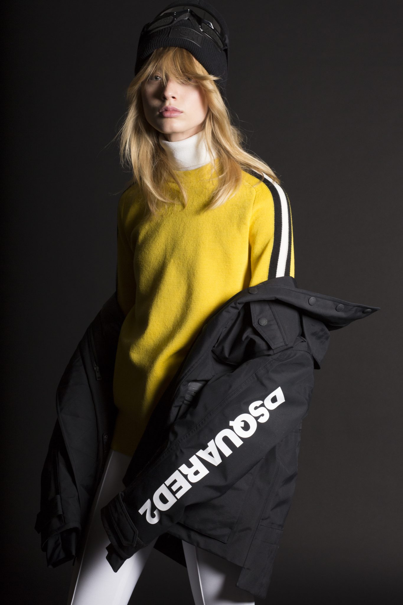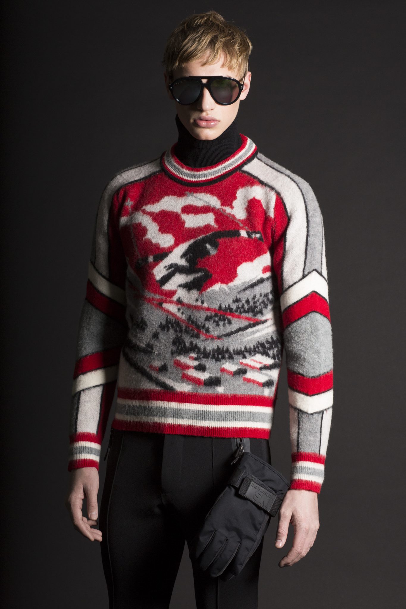 Les couleurs de gris, bleu, jaune et rouge font référence à la Royal Canadian Mountain Police avec des pulls, à la fois pour les hommes et les femmes, présentant des motifs graphiques à rayures. Les pièces de ski de style vintage illustrées de motifs jacquard sont courts ou à col haut. Les looks ski sont influencés par le streetwear pour l’homme, avec une veste en maille fine et des shorts à rayures profilées. Les vestes en néoprène avec des motifs graphiques blancs sont prévues pour être portées sous un manteau de ski dans les montagnes la journée, pour pouvoir se transformer en tenue sportive pour le soir.
