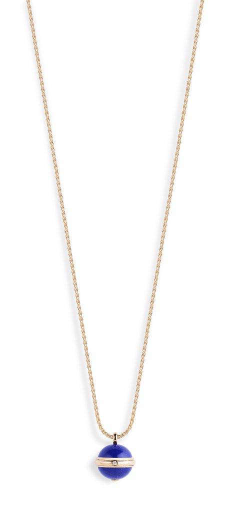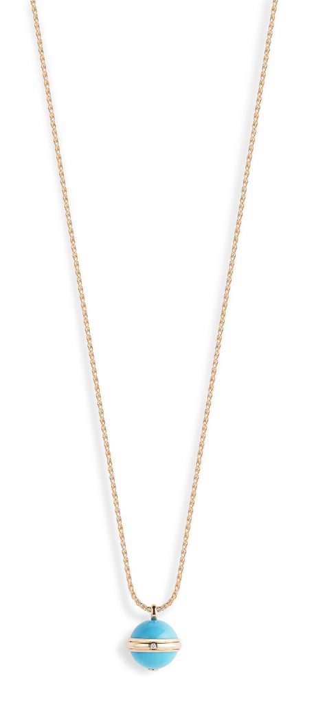 Pour les fêtes, Piaget pare la collection emblématique Possession d’une touche festive rouge vif. Un long pendentif en or s’habille d’un cabochon en cornaline rouge entouré de l’anneau tournant signature de la collection Possession. Il est assorti à un bracelet en or et diamant dont les deux extrémités sont ornées de cabochons en pierre rouge. Troisième élément de ce trio, une montre Possession en or rose sertie de diamants taille brillant. Pour une explosion d’étincelles festives.