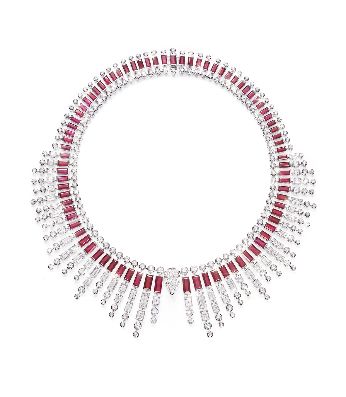 À l’instar du soleil rouge qui darde un univers hivernal féérique de ses derniers rayons, cette création étincelante sertie de diamants et de rubis taille baguette capte la beauté ardente du soleil et la restitue très tard dans la soirée. Résolument charismatique, l’explosion de rubis est une ode aux fêtes les plus glamours de cette fin d’année.