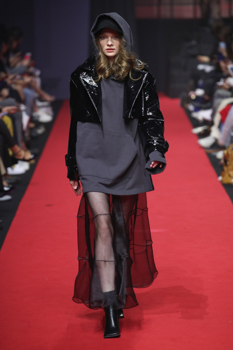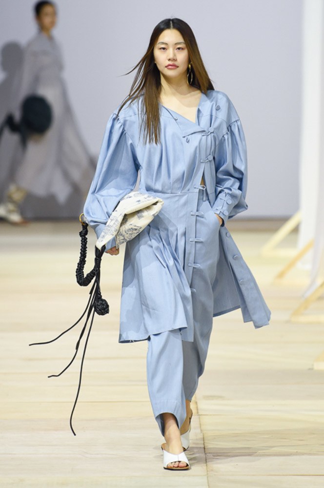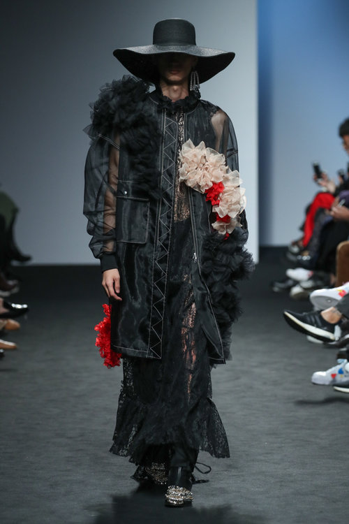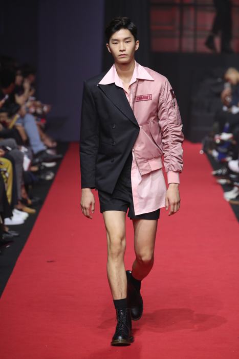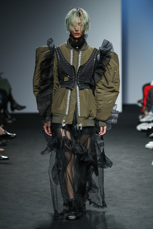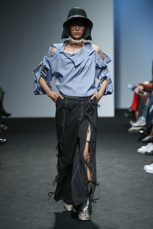 Rompre avec les cadres de l’ancienne société: difficile quand la menace de la Corée du Nord rode et oblige les jeunes garçons à un entrainement militaire de trois ans minimum. Pour Shin Kyu Youg ( Blindness) il faut compter jusqu’a sept. En réponse à ces années : des silhouettes androgynes et urbaines. La peur fait partie de la vie des Coréens mais ne la dirige pas. Les anciennes bases militaires américaines se sont truffés de Drag Queen et bar Gay. Un Zeitgeist qui évoque le Berlin de Cabaret. Le dynamisme de la jeune génération pousse la Corée. Si l’esthétique est parfois abrupte, les collections nous font réfléchir sur la relative stagnation de certains designers européens contemporains.