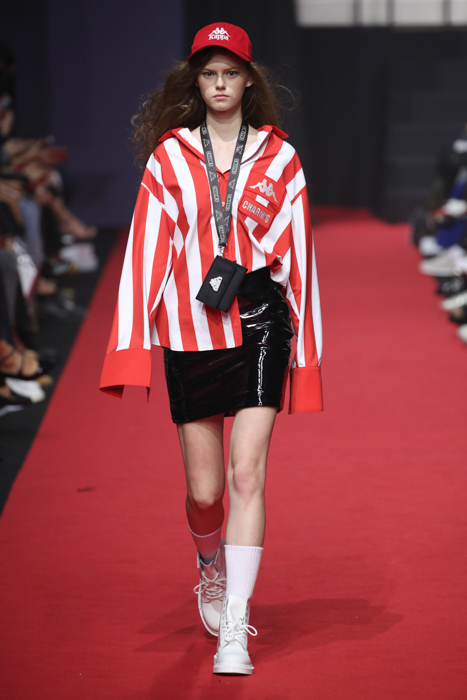 Jupe crayon hybridée par la collaboration avec Kappa. Le sportwear : phénomène global rejoué sur des airs K-PoP.