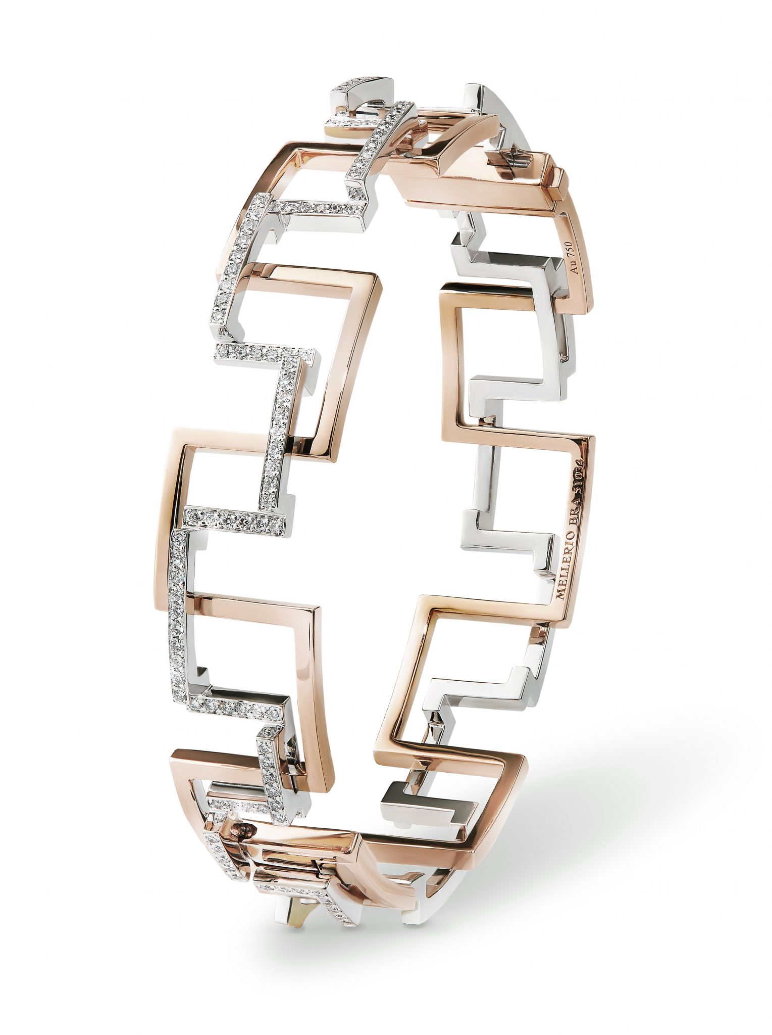 Si la Maison Mellerio est connue pour ses motifs naturalistes, courbes et entrelacés, elle a aussi dans son répertoire de nombreuses créations plus graphiques et architecturées. En témoigne ce dessin d’une maille imaginée pour un bracelet dans les années 1960, qui a inspiré Alexandre Vauthier lors de la création de sa collection de joaillerie pour Mellerio en 2015.