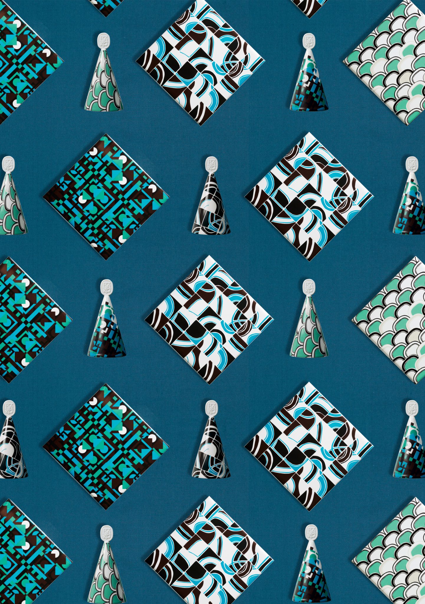 Fabriqués au Portugal dans une manufacture experte en céramique, ces socles à bougies et éteignoirs imprimés déclinent des motifs colorés dans une palette de bleu, vert, noir, blanc et gris.