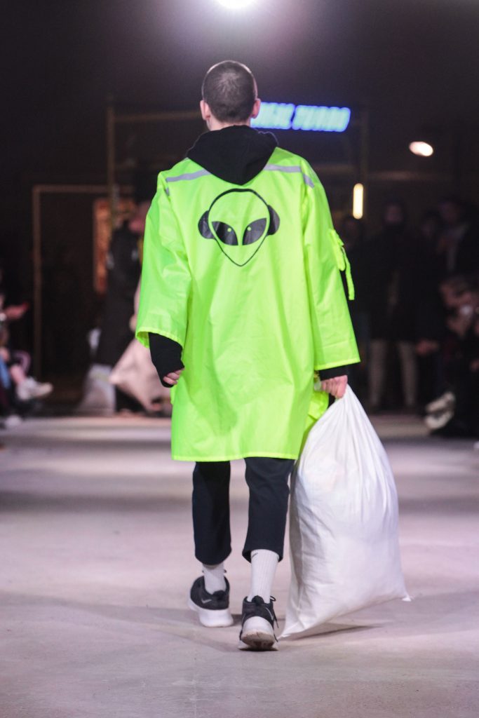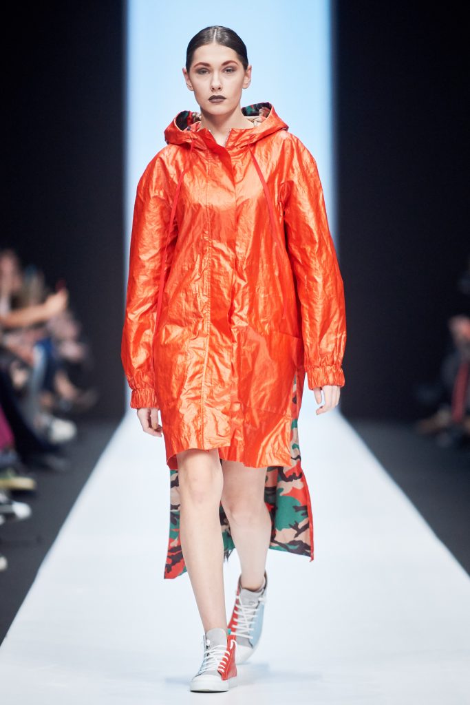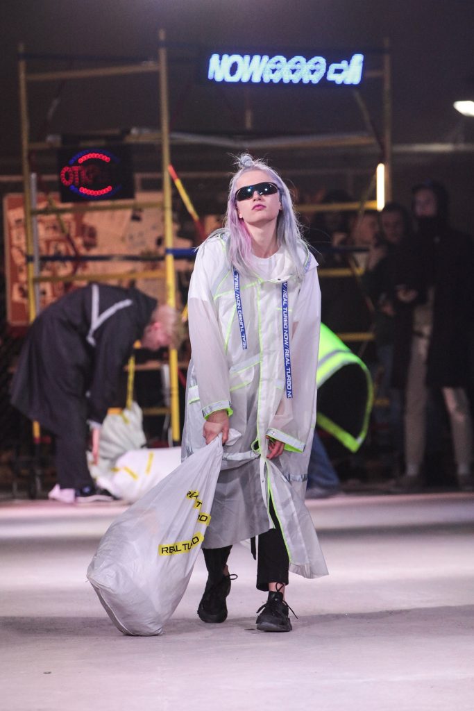 Dénoncer l’opulence des robes de soirées des classses fortunées à coups de manteaux aux bandes-réfléchissantes. Sur le podium Mercedes-Benz, de nouvelles manières de dire la mode Russe ont pu s’exprimer.