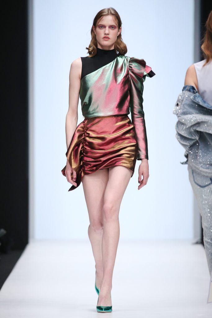 Les jeunes designers proposent un entre deux. Les robes sont souvent rebrodées de sequins comme une satire à l’opulence. Les imprimés militaires et les symboles révolutionnaires viennent dire de nouveaux combats comme chez Turbo Yulia, Alisa kuzembaeva, Alexandr Rogov ou Mach&Mach.
