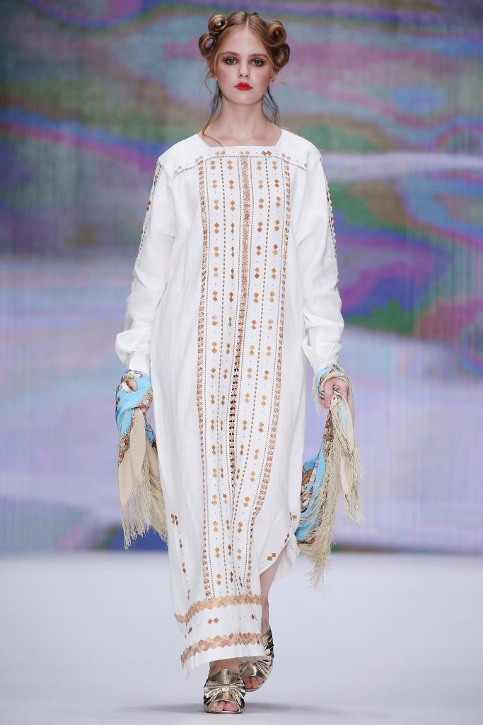 MOSCOW, RUSSIA – OCTOBER 21: A model walks the runway at the Collection of traditional Russian artistic crafts ‘Flax and Lace’ supported by Ministry of Industry and Trade of Russian Federation fashion show during day one of Mercedes Benz Fashion Week Russia S/S 2018 at Manege on October 21, 2017 in Moscow, Russia. (Photo by Oleg Nikishin/Artefact)